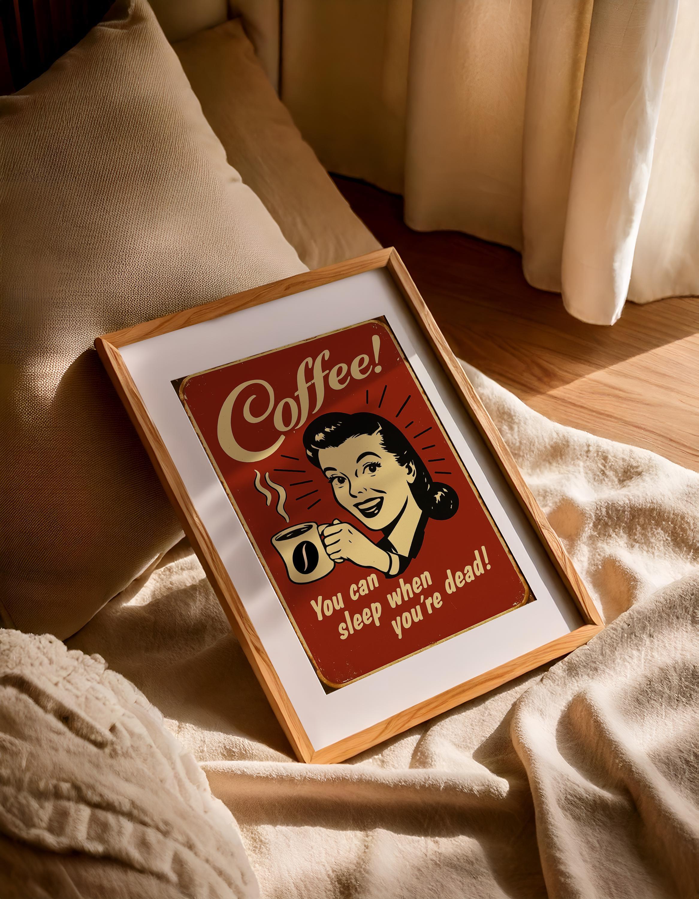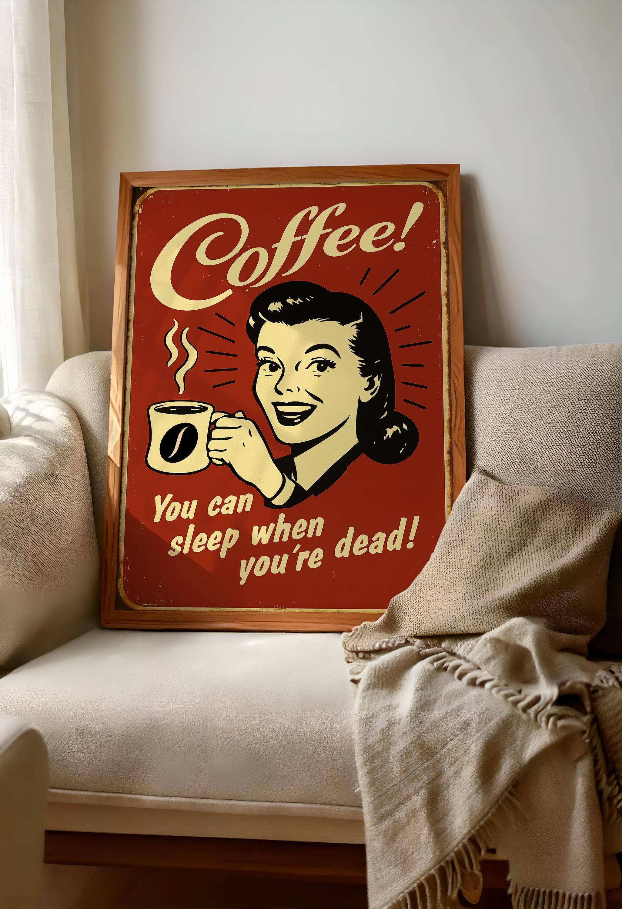 “Sleep when you’re dead” – a mantra for coffee lovers everywhere. This funny vintage coffee poster adds a bold, rebellious touch to your coffee station, office, or kitchen.