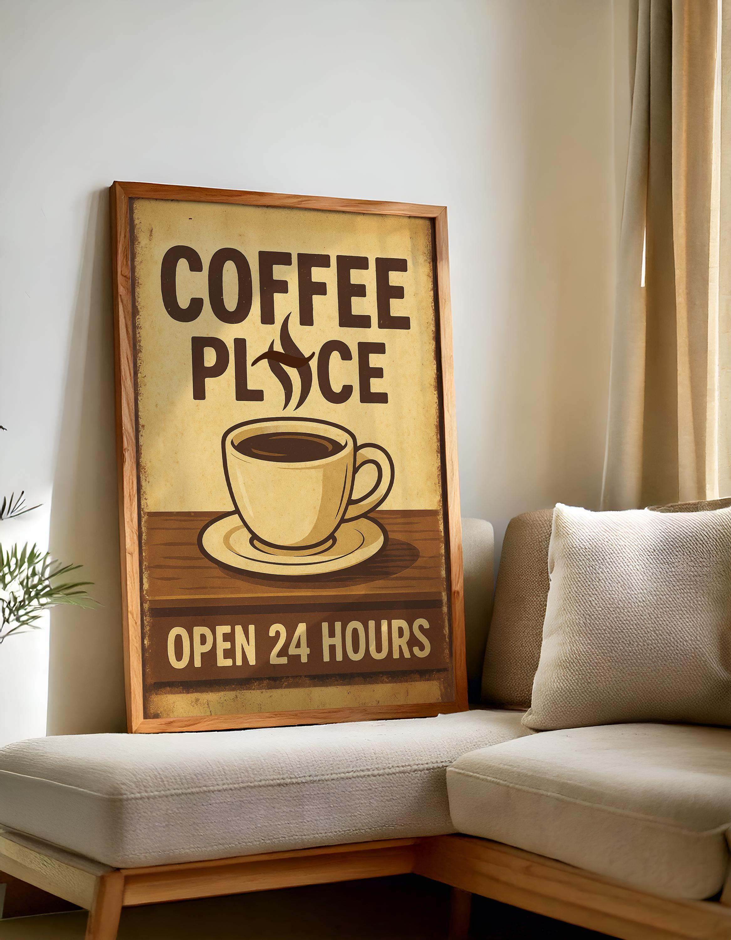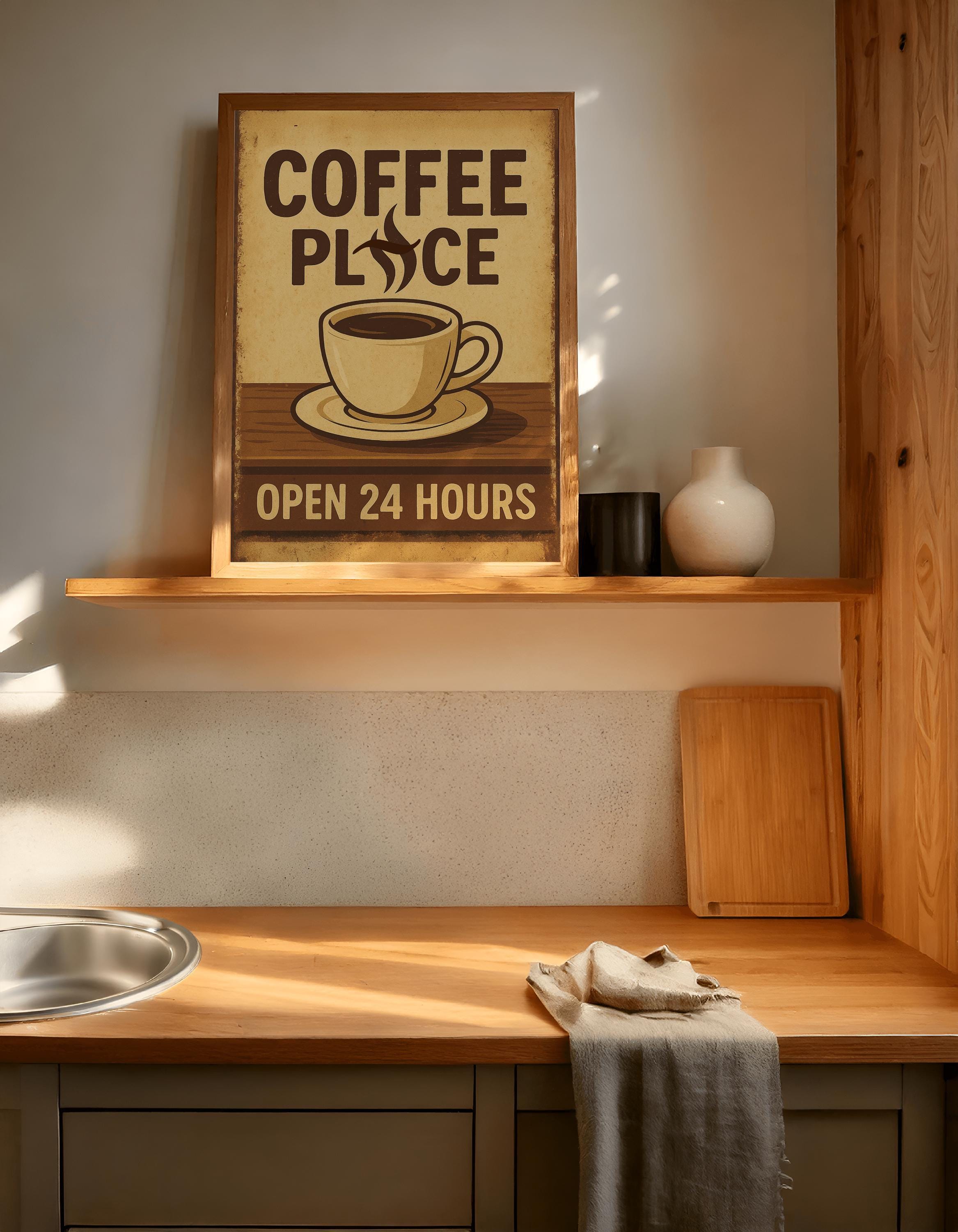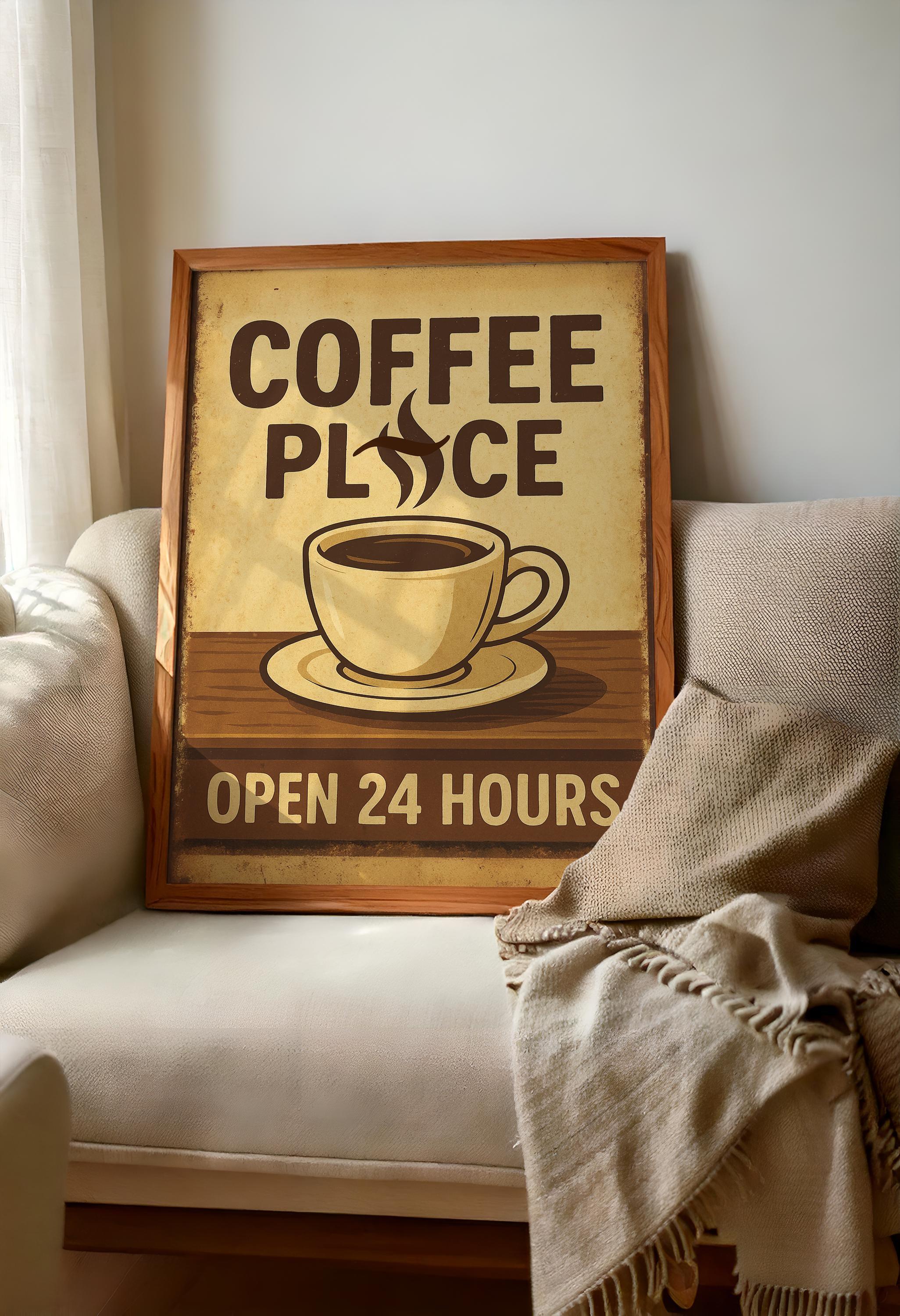 Capture the timeless vibe of an all-night diner with this Open 24 Hours Coffee Place vintage poster. A nostalgic design for night owls, baristas, or anyone whose coffee schedule has no limits.