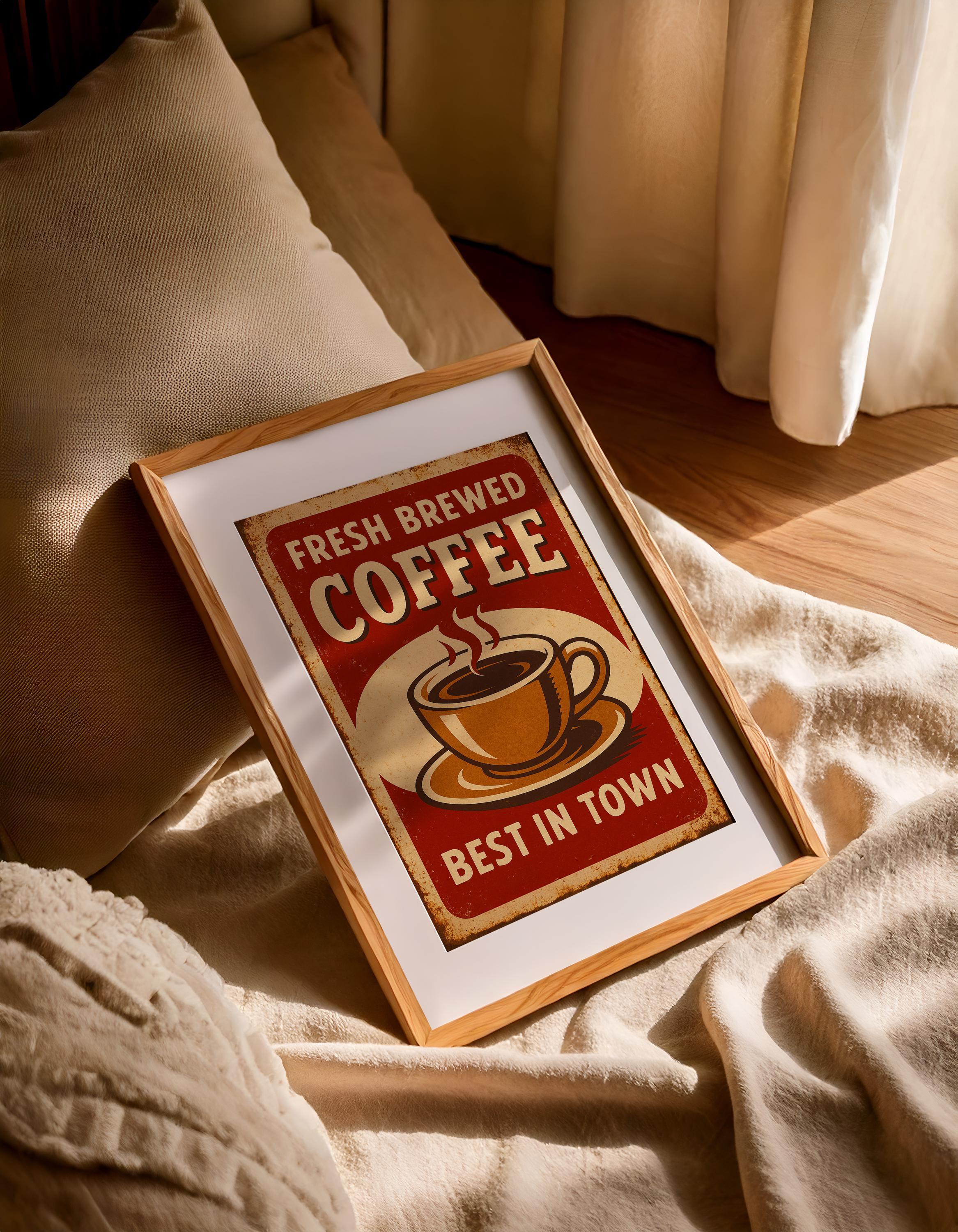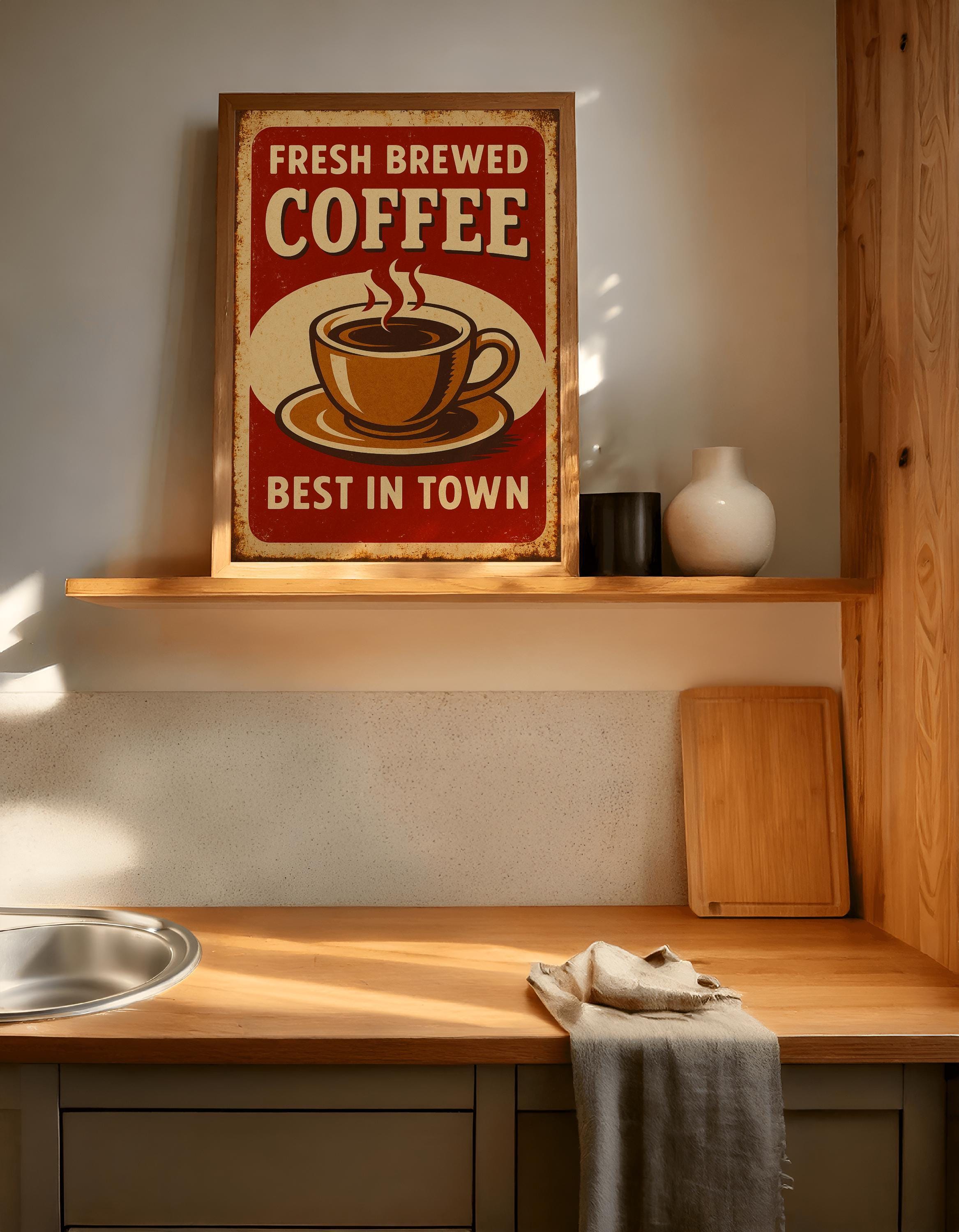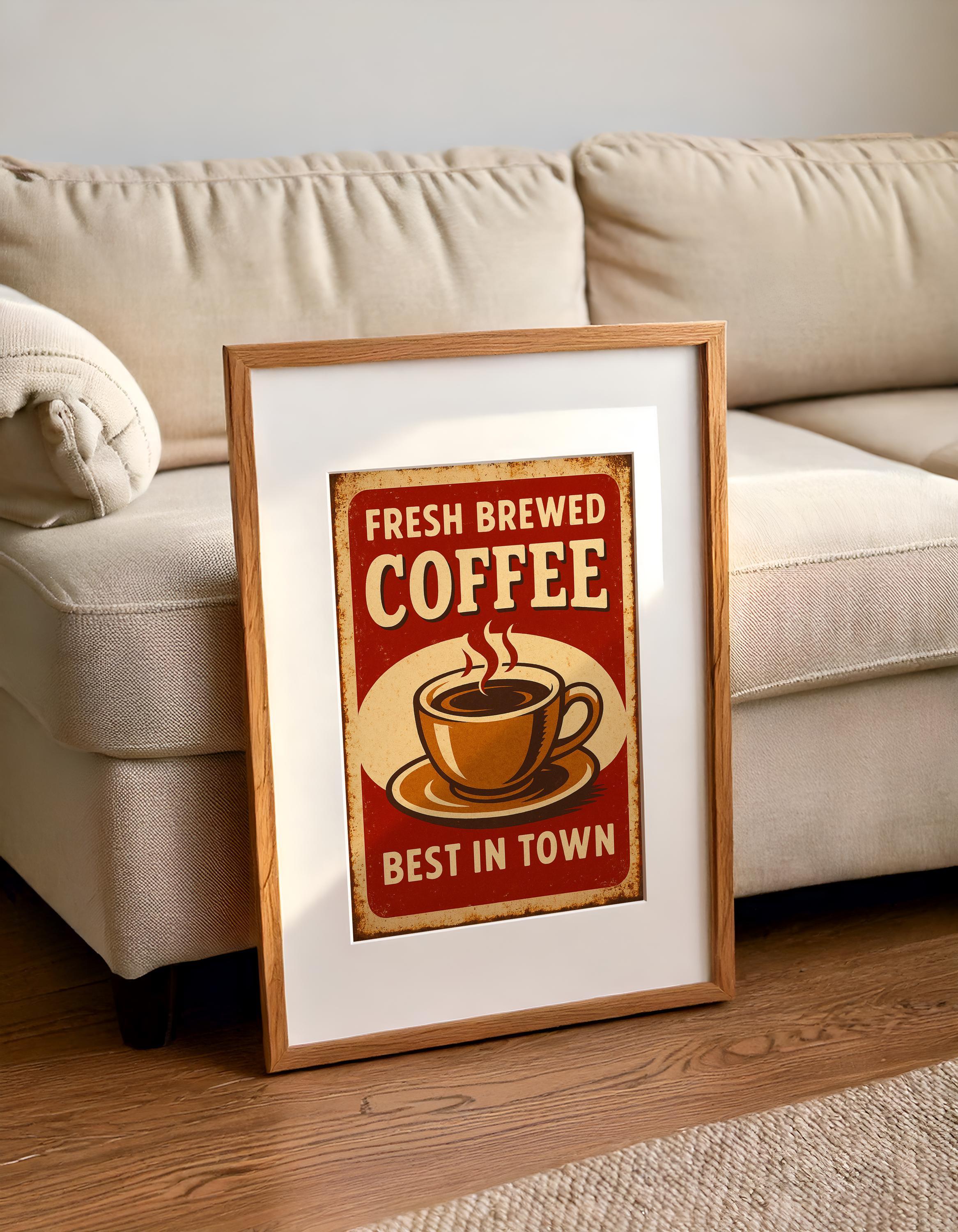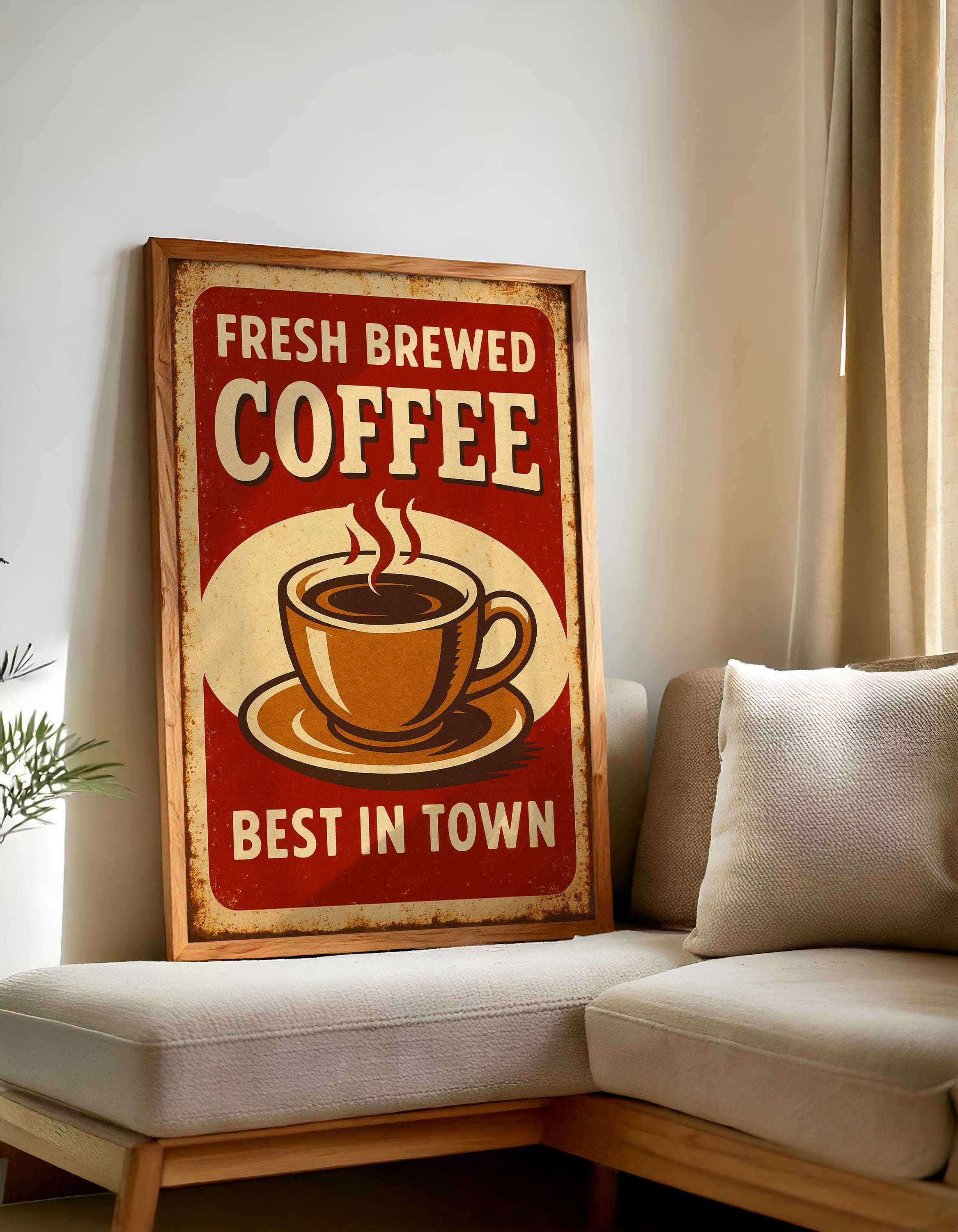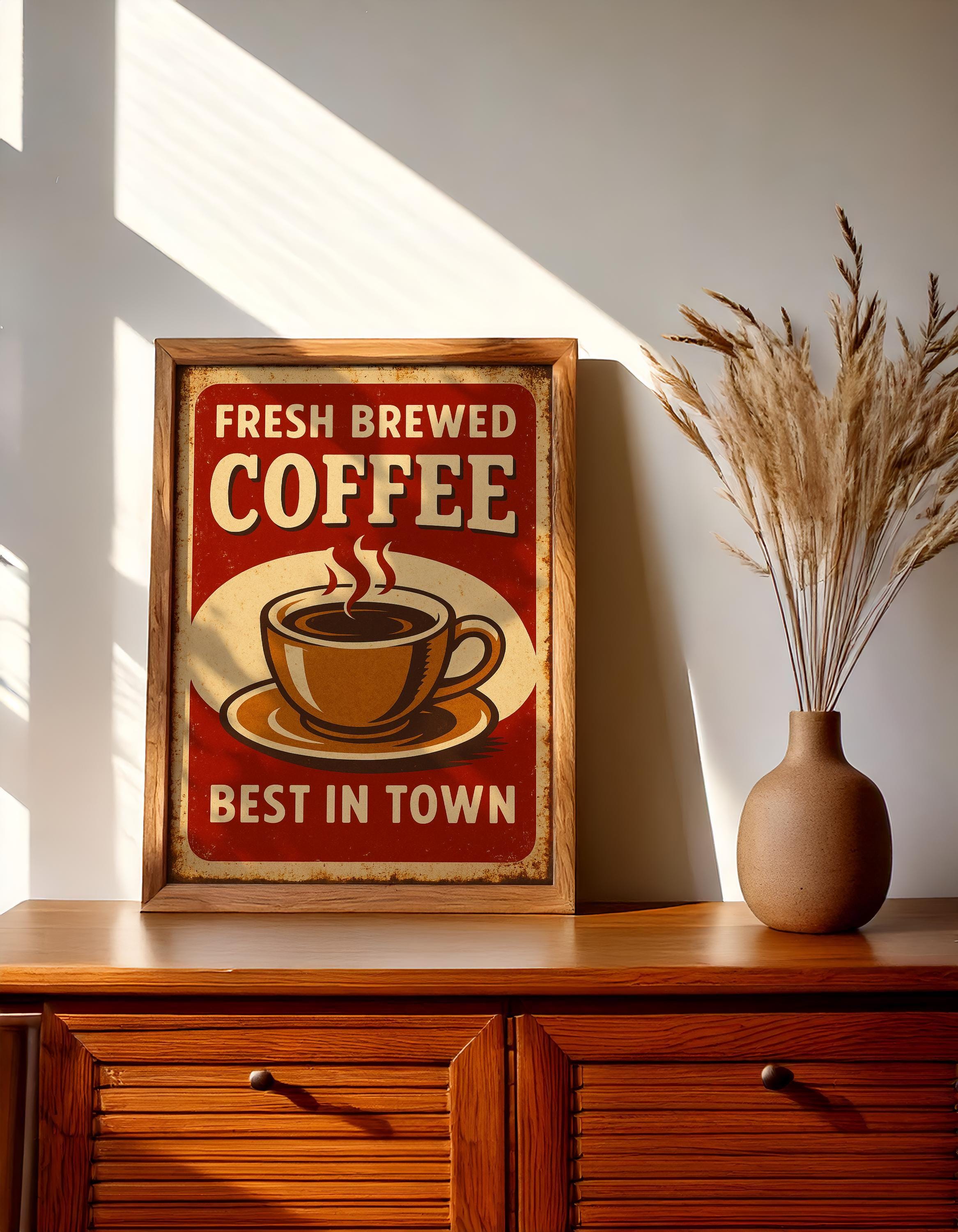 Celebrate the rich aroma of fresh brewed coffee with this vintage-style poster. Featuring bold text and a retro shop-sign feel, this print adds charm to kitchens, coffee corners, and cafés alike.