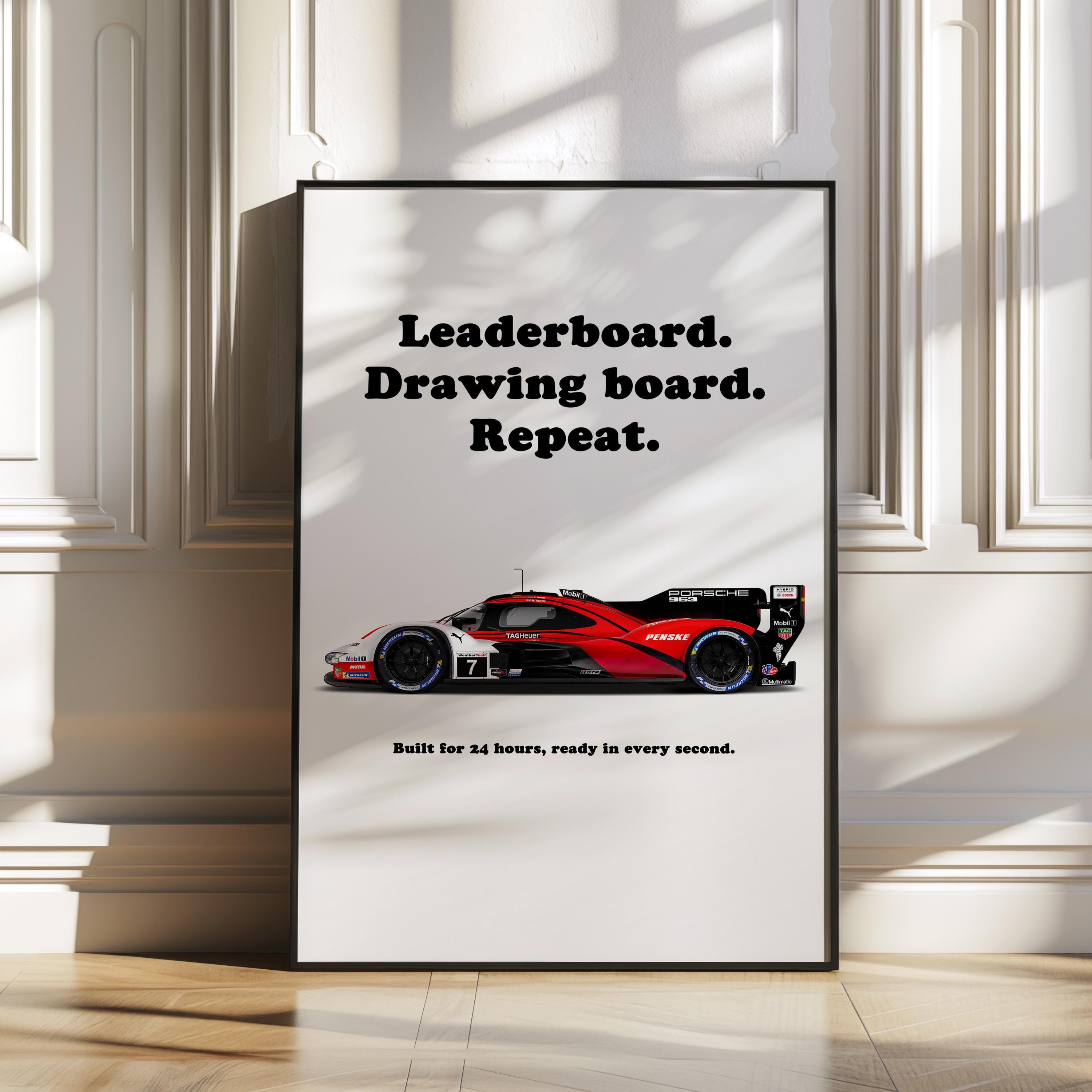 This Porsche 963 poster captures the spirit of Le Mans racing, blending race car wall art with motorsport wall decor. Built for endurance and speed, the 963 continues Porsche’s legendary racing legacy. Perfect for enthusiasts or as a gift for car lover, this print adds adrenaline to any man cave, office, or garage.