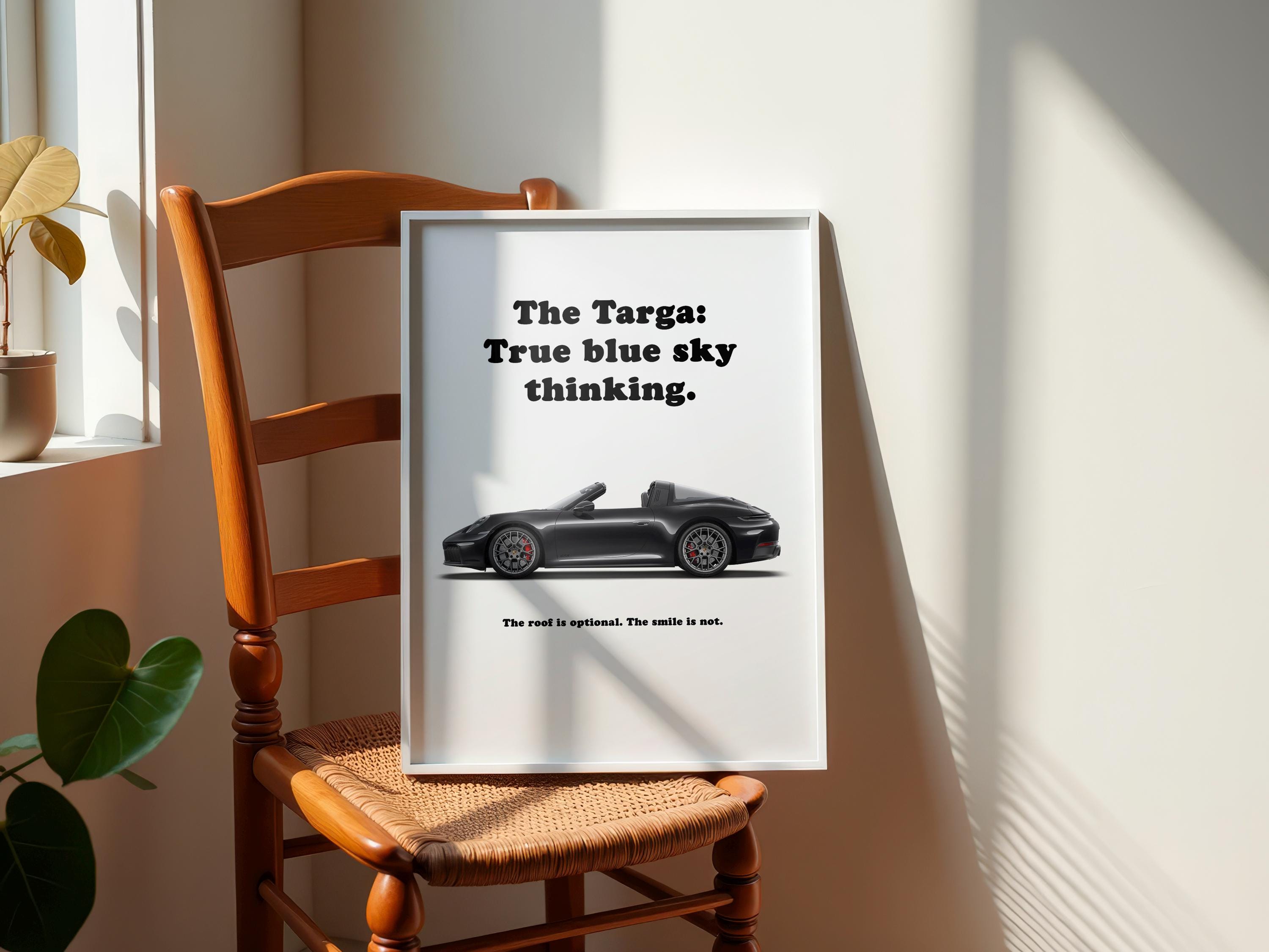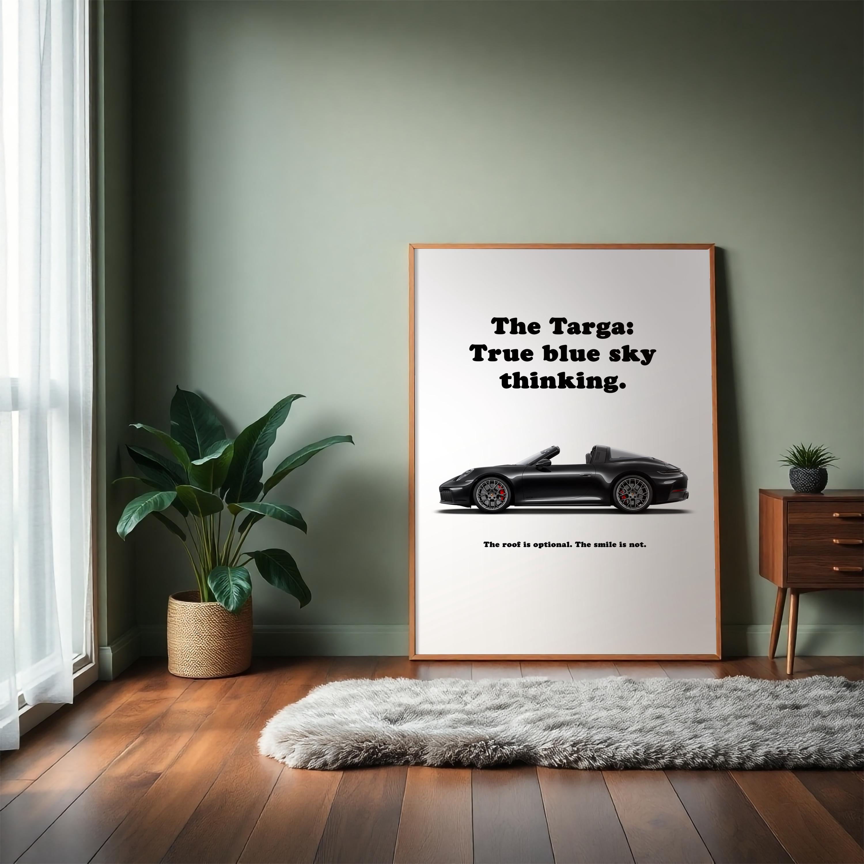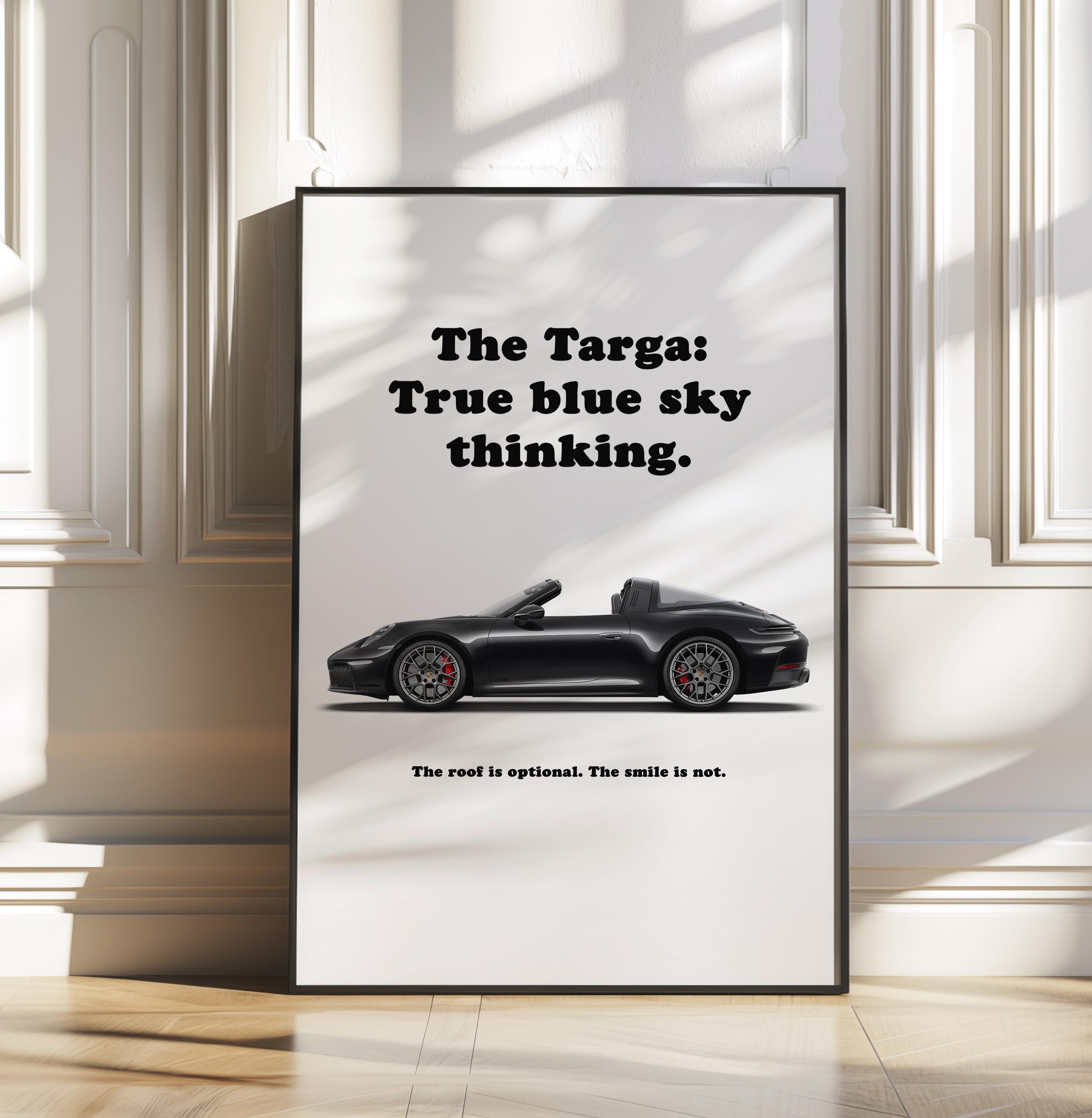 This Porsche 911 poster presents the Porsche 911 992 Targa 4 GTS, blending sports car wall art with automotive wall decor. Combining open-top driving with GTS performance, it’s perfect for style and thrill seekers alike. Ideal for collectors or as a gift for car lover, this Porsche print enhances any man cave, office, or garage.