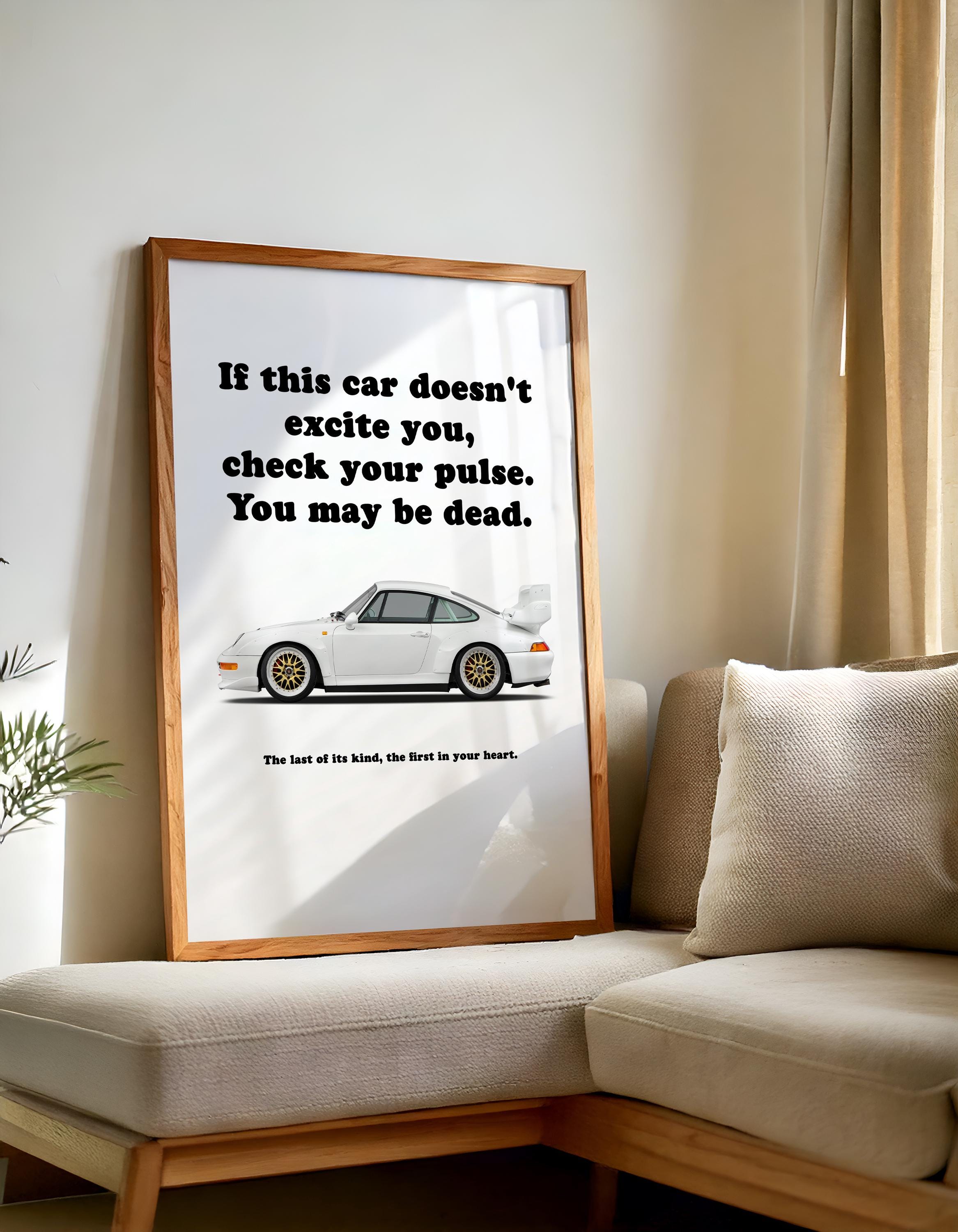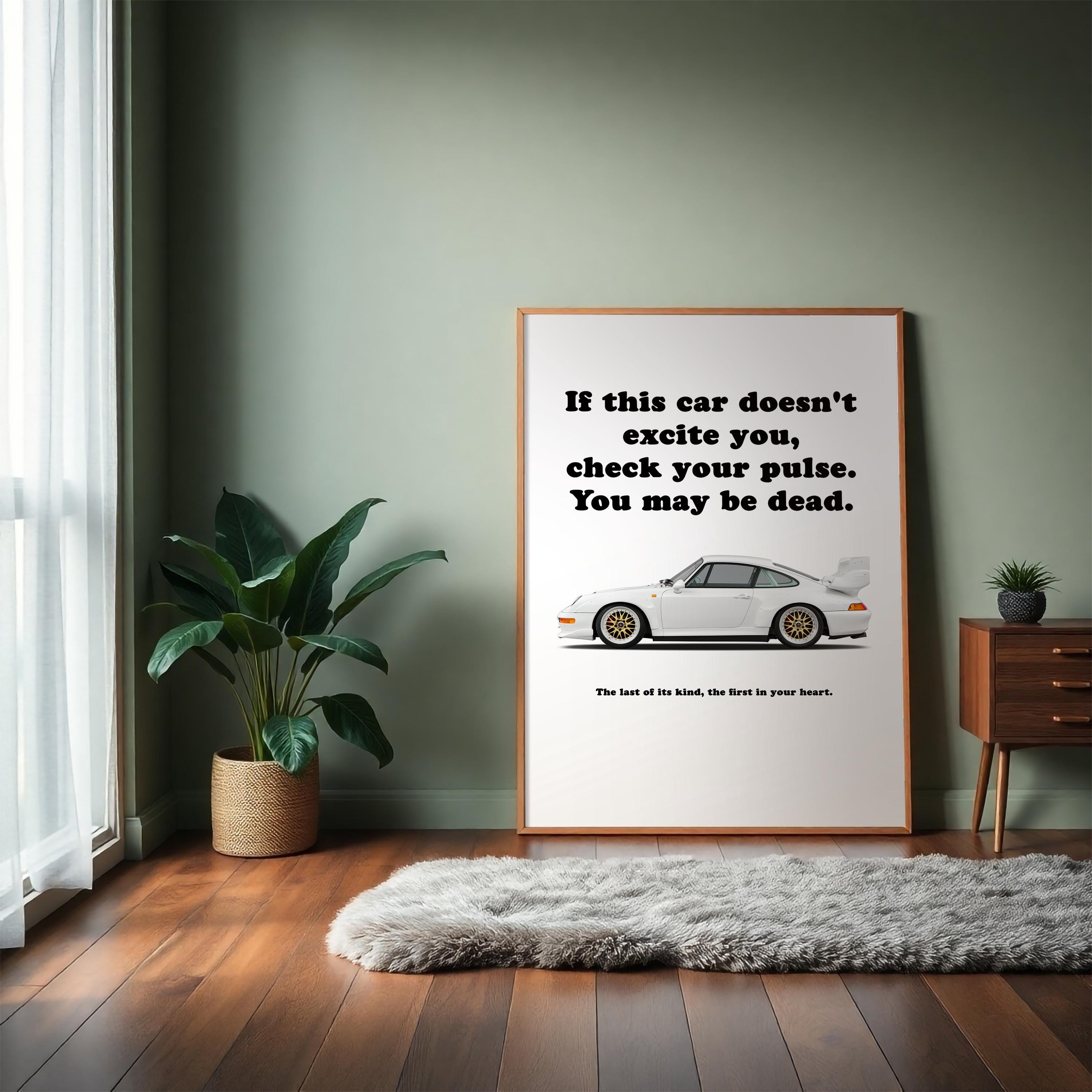 This Porsche 911 poster features the rare Porsche 911 993 GT2 R, merging vintage Porsche art with sports car wall decor and classic car art. Built for the track and legendary among collectors, it’s the ultimate in Porsche motorsport heritage. Perfect for enthusiasts or as a gift for car lover, this print brings style and history into any man cave, office, or garage.