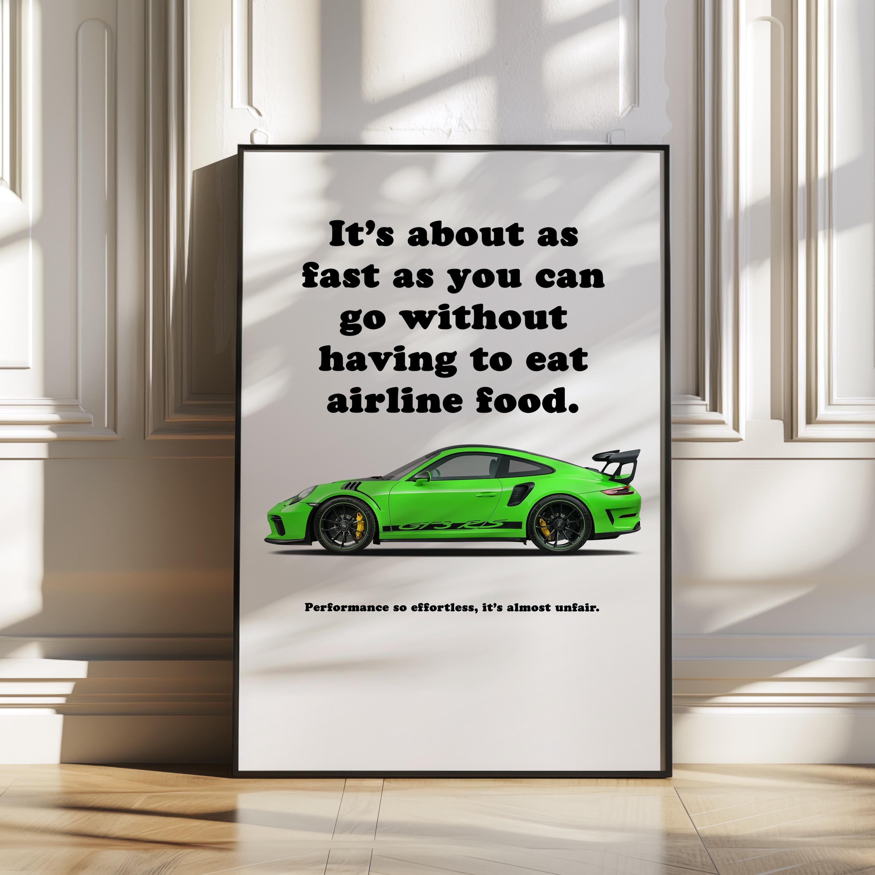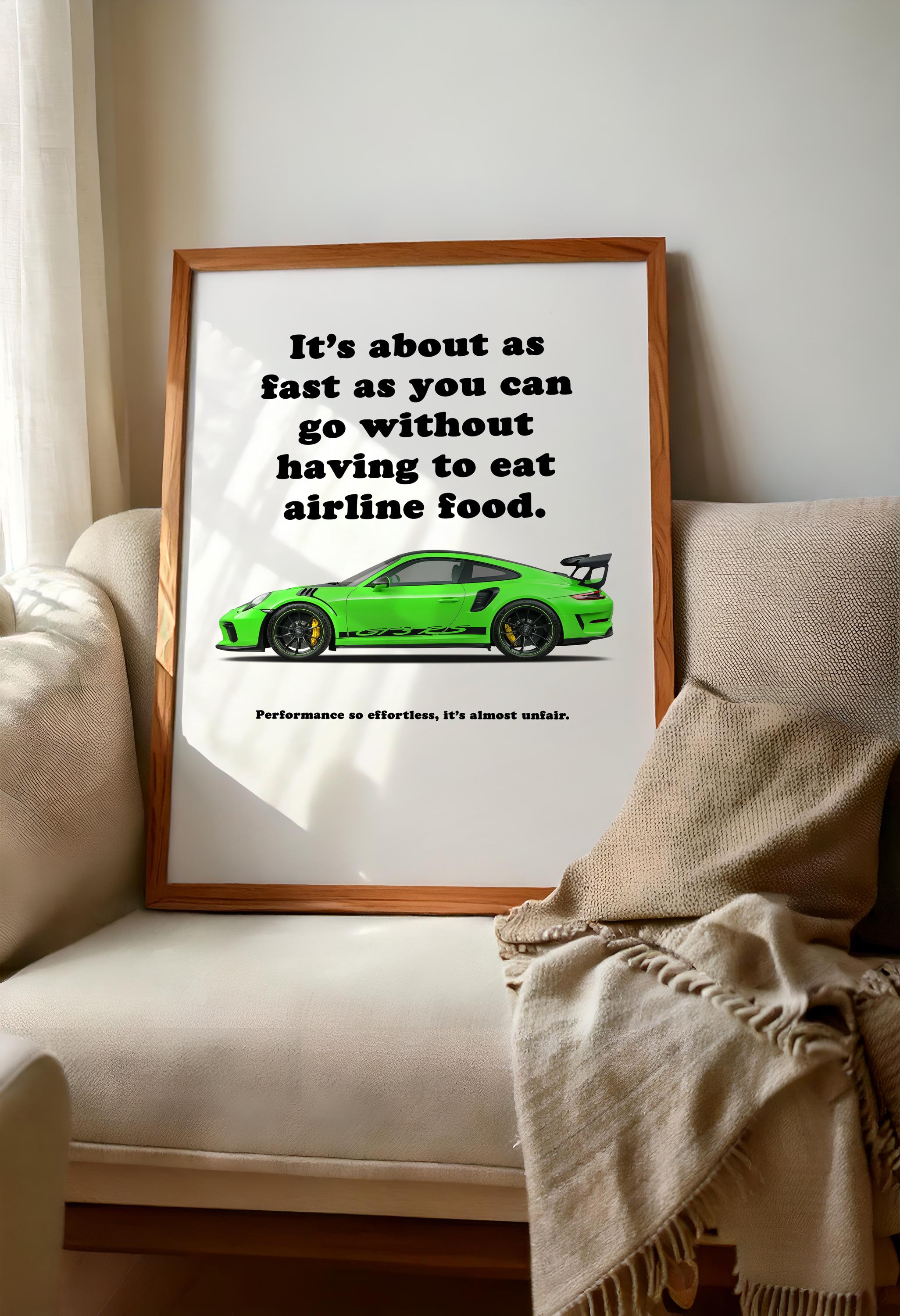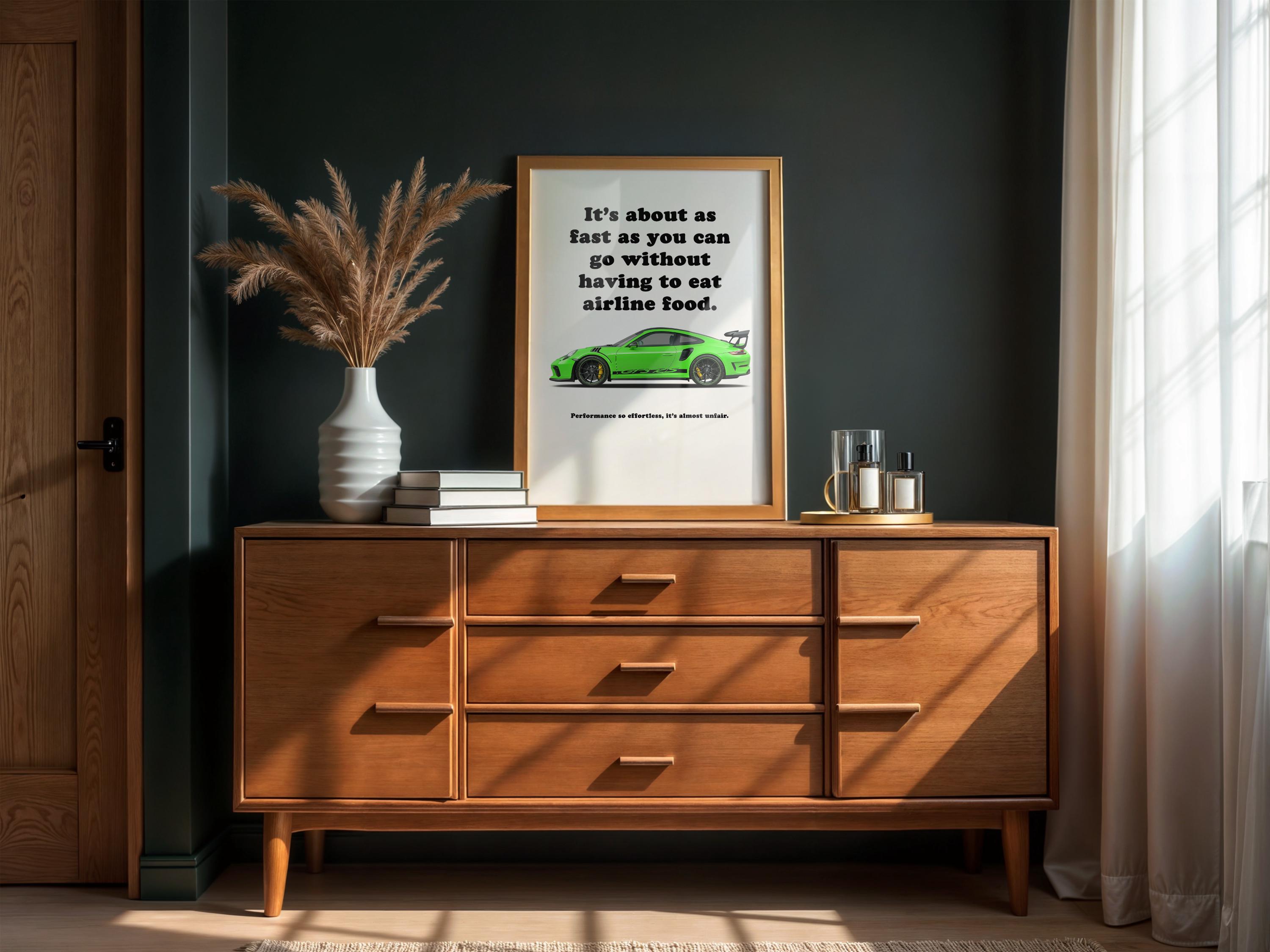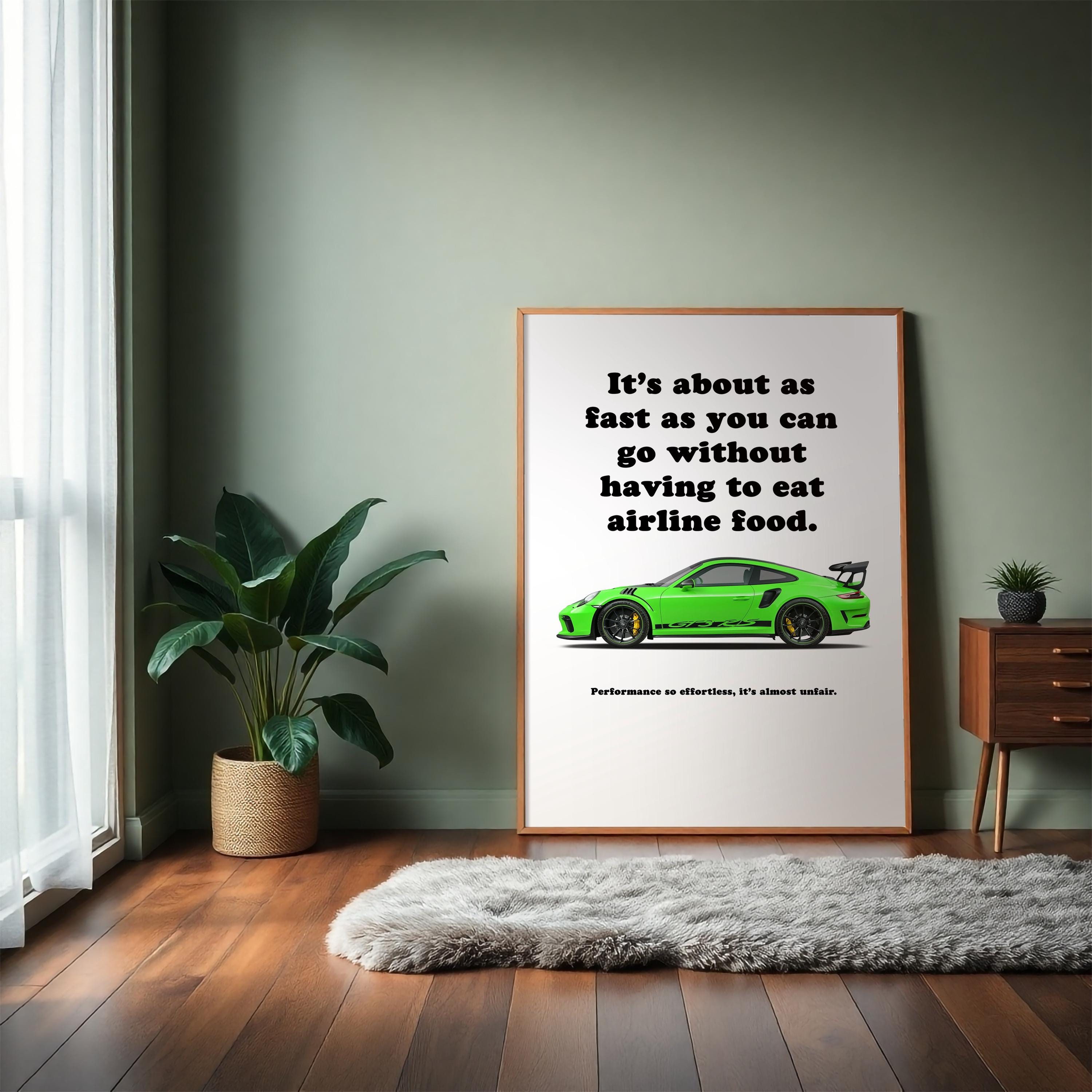 This Porsche 911 poster showcases the Porsche 911 991 GT3 RS, blending sports car wall art with automotive wall decor. Built for the track with aggressive aerodynamics, the GT3 RS is a motorsport icon. Perfect for collectors or as a gift for car lover, this Porsche print adds performance and style to a man cave, office, or garage.