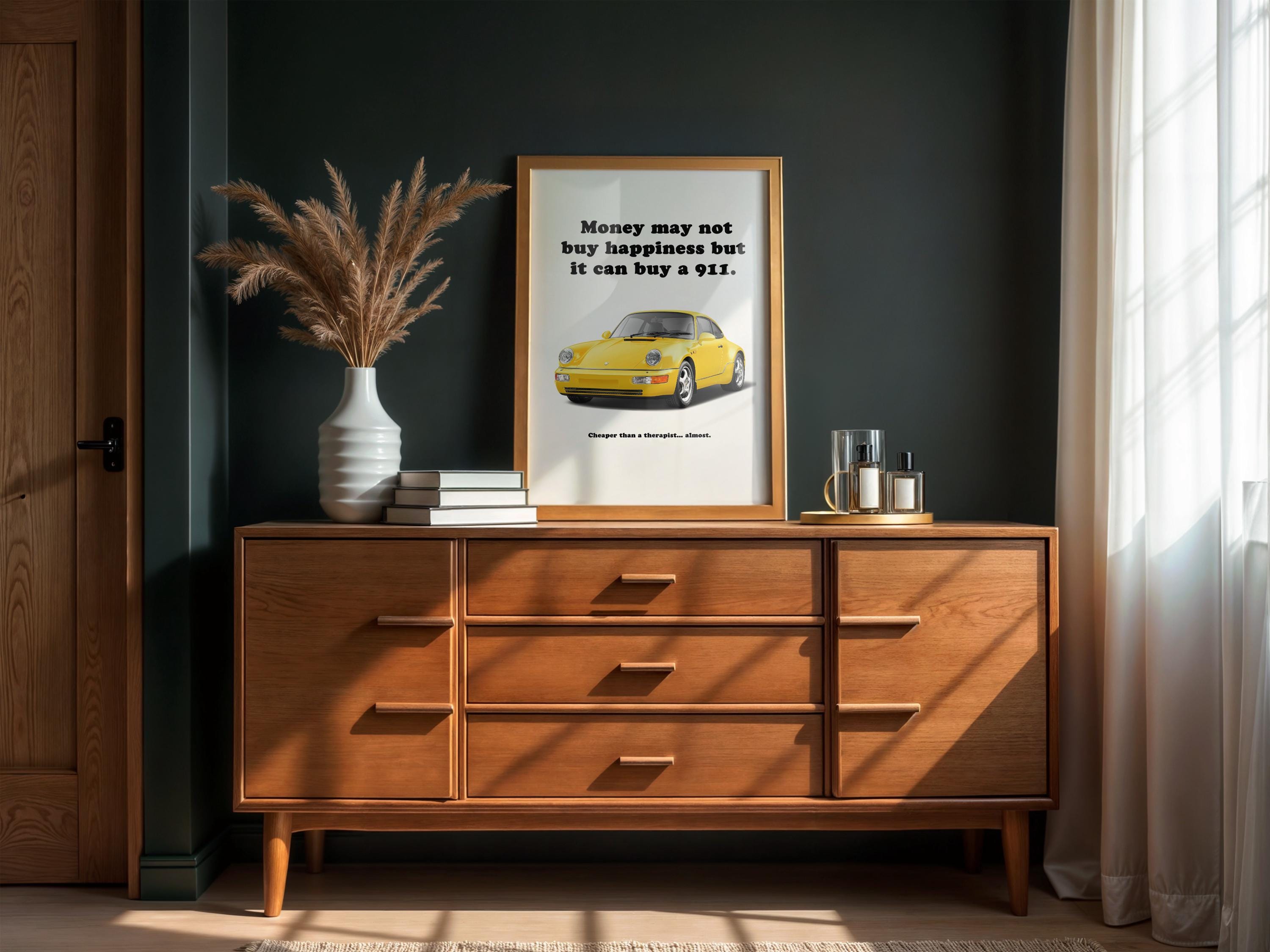 This Porsche 911 poster captures the essence of the Porsche 911 964 Carrera, blending vintage Porsche art with sports car wall decor. Revered for its lightweight build and motorsport pedigree, this classic Porsche print is perfect for collectors or as a gift for car lover. Bring racing heritage and style into your man cave, office, or living room.