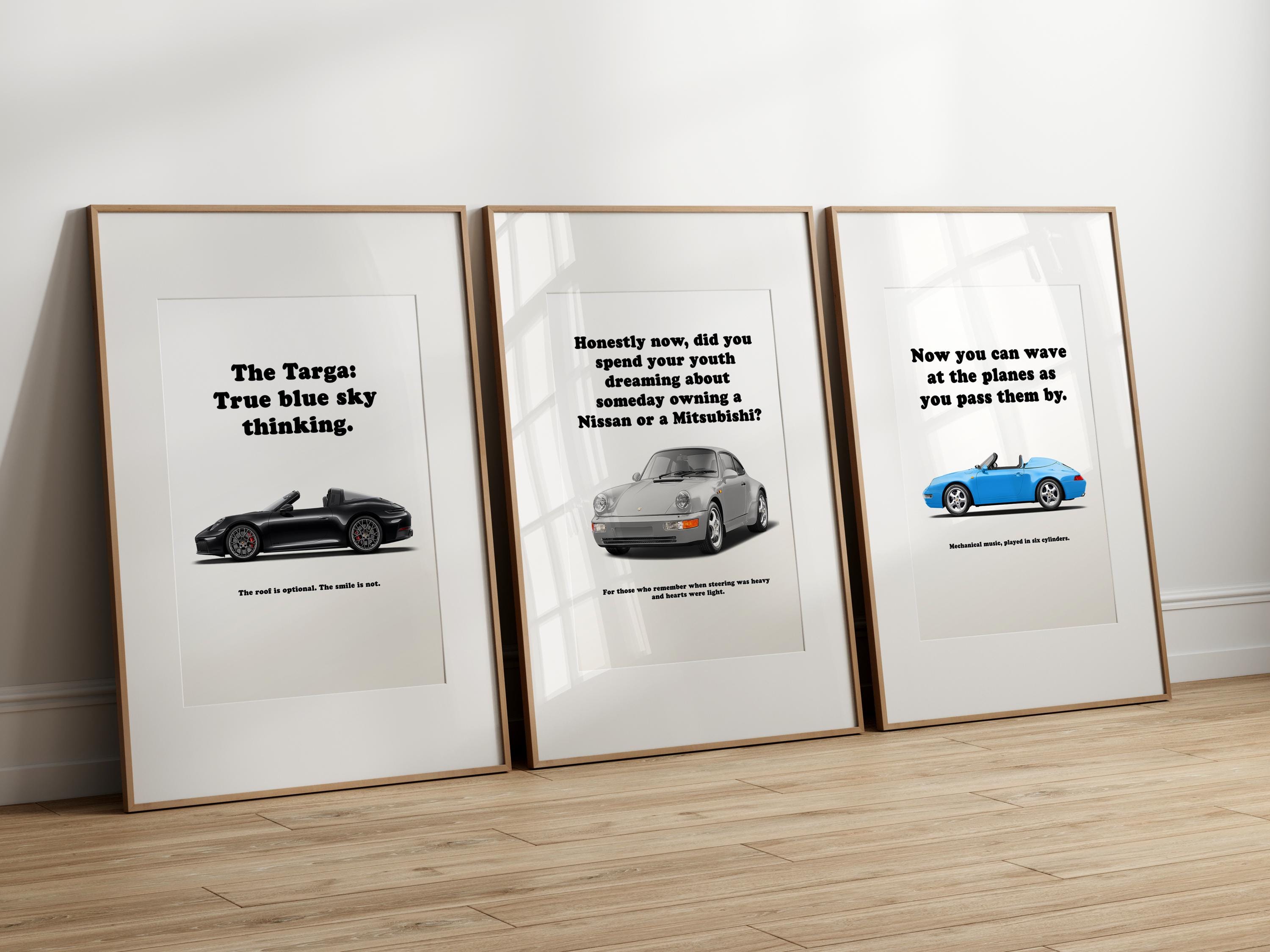 Celebrate Porsche elegance and performance with this premium Porsche poster bundle – featuring the rare 911 993 Carrera 3.6 Speedster, the classic 911 964 Carrera, and the modern 911 992 Targa 4 GTS. Perfect car poster set for any Porsche fan, blending vintage style with contemporary design. Ideal sports car wall art for a man cave, office, or luxury home decor. Includes high-resolution automotive prints in five aspect ratios, each in its own folder with all 3 posters, ready for instant download and printing.