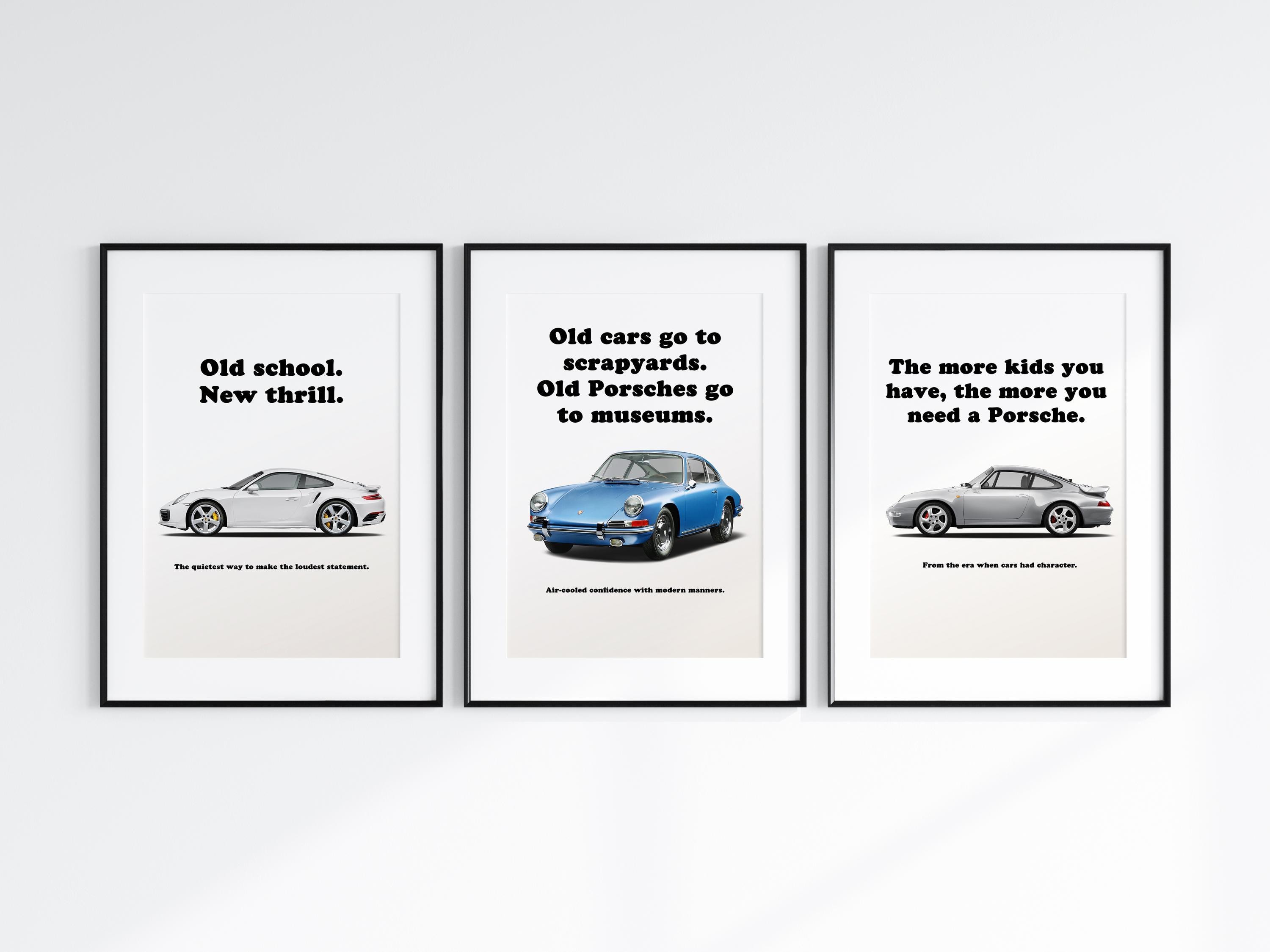 Celebrate Porsche’s timeless evolution with this exclusive Porsche poster bundle – featuring the legendary Original Porsche 911, the air-cooled 911 993 Turbo, and the modern 911 991 Turbo S. This car poster set combines heritage, performance, and style, making it perfect sports car wall art for a man cave, office, or luxury home decor. Includes high-resolution automotive prints in five aspect ratios, each in its own folder with all 3 posters, ready for instant download and printing.