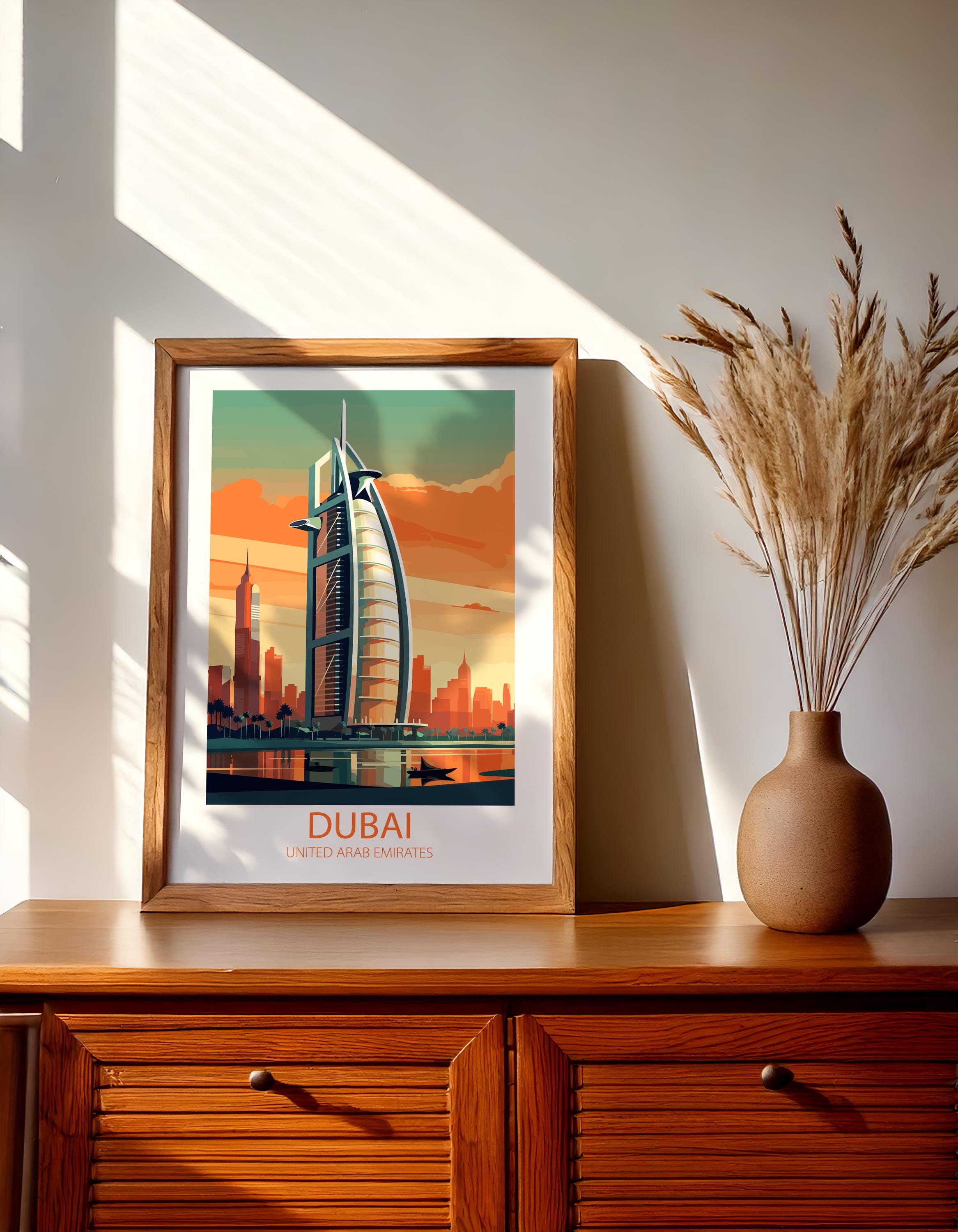 Dubai comes to life in this beautifully designed vintage travel poster, created in a timeless retro style. Featuring iconic skyscrapers and desert skyline, this travel print brings modern charm and wanderlust spirit into your home.