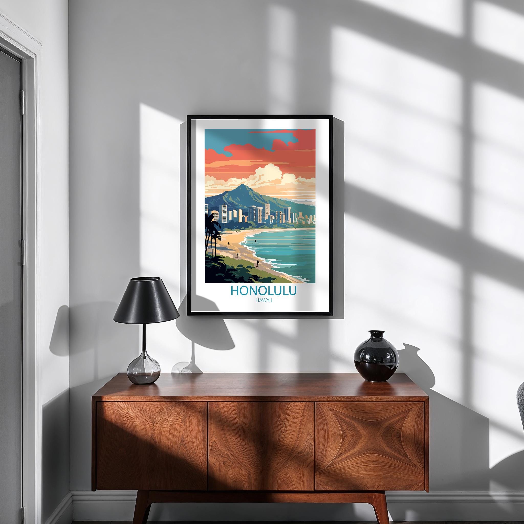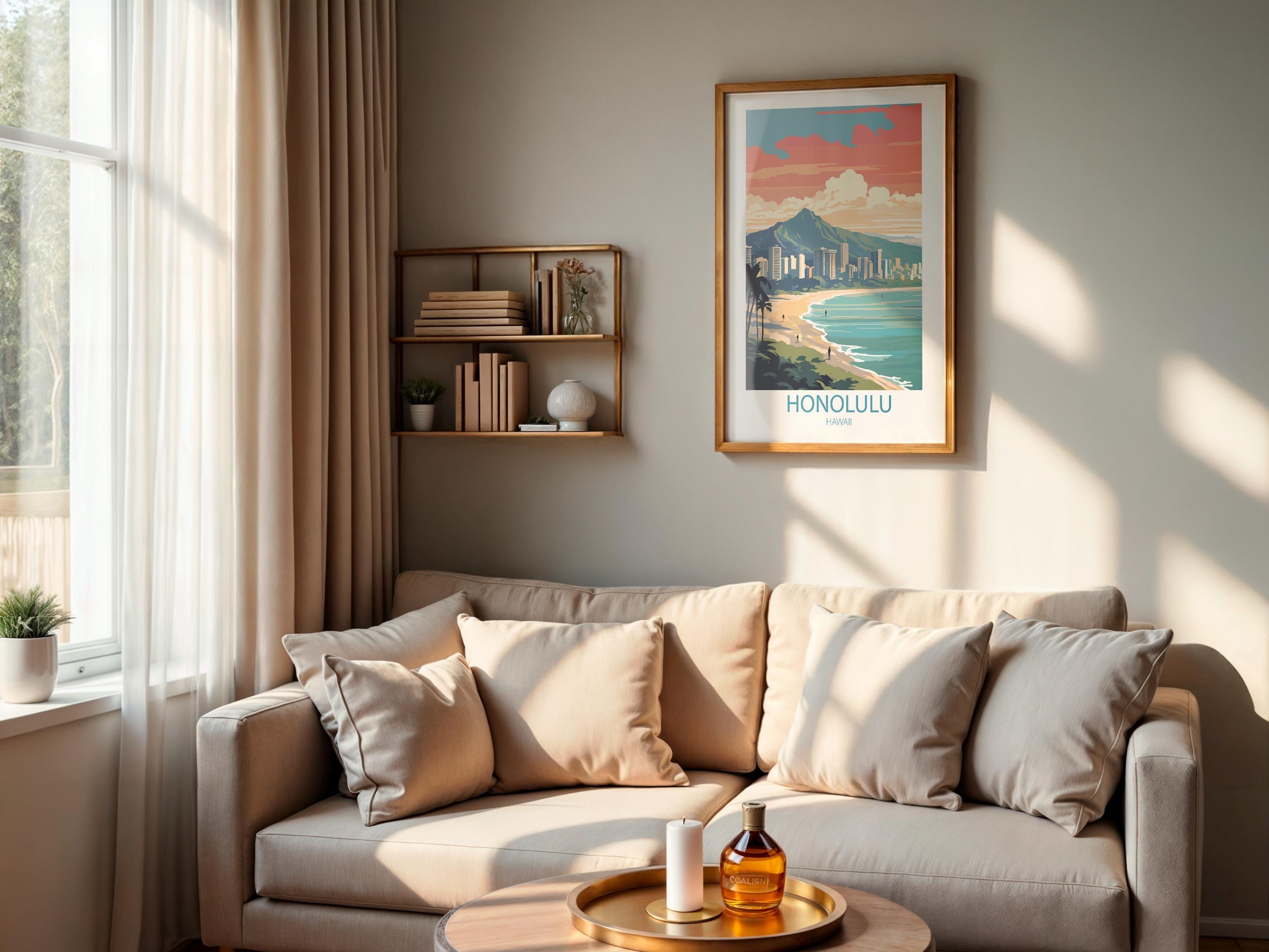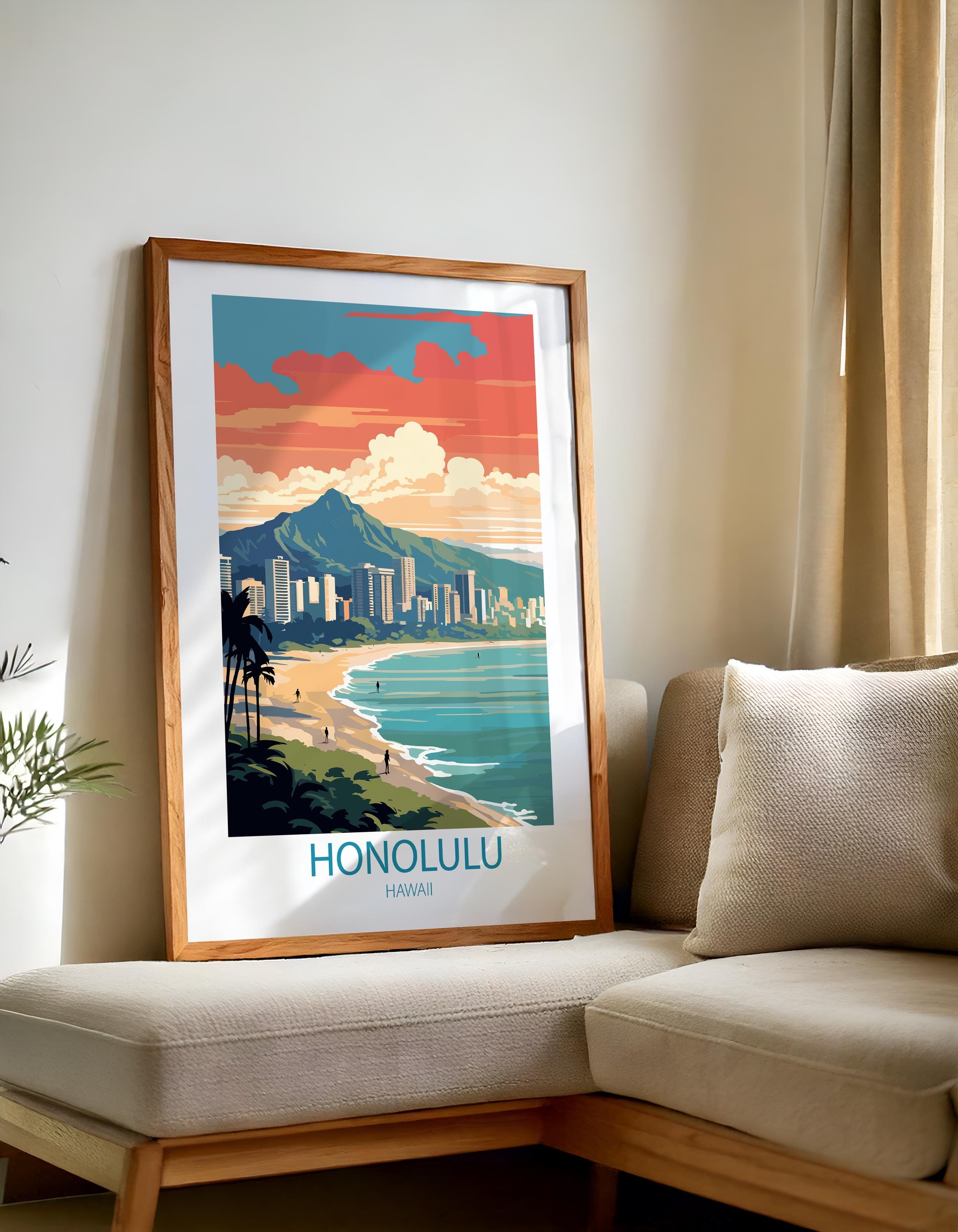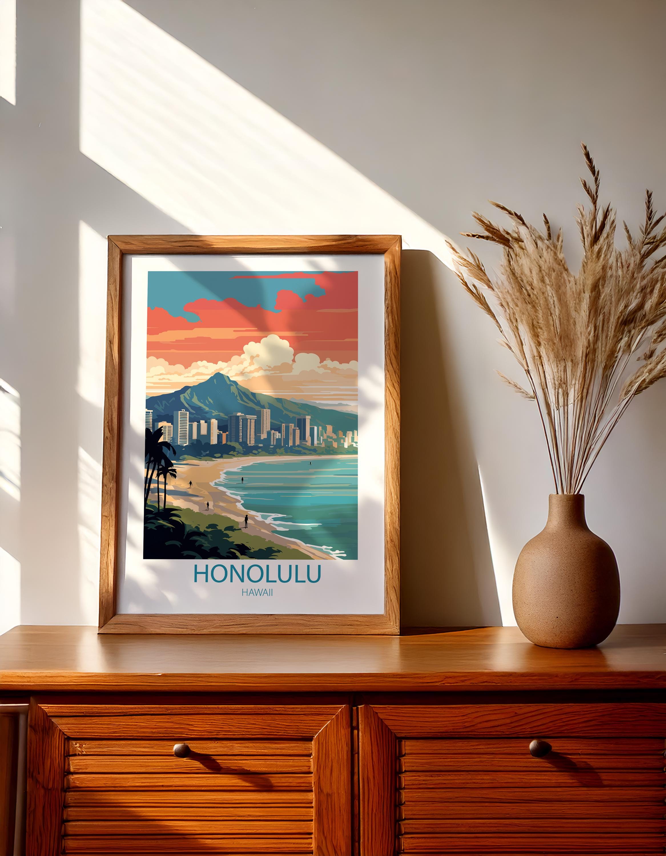 Honolulu Hawaii comes to life in this beautifully designed vintage travel poster, created in a timeless retro style. Featuring tropical beaches and palm-lined shores, this travel print brings island charm into your home.