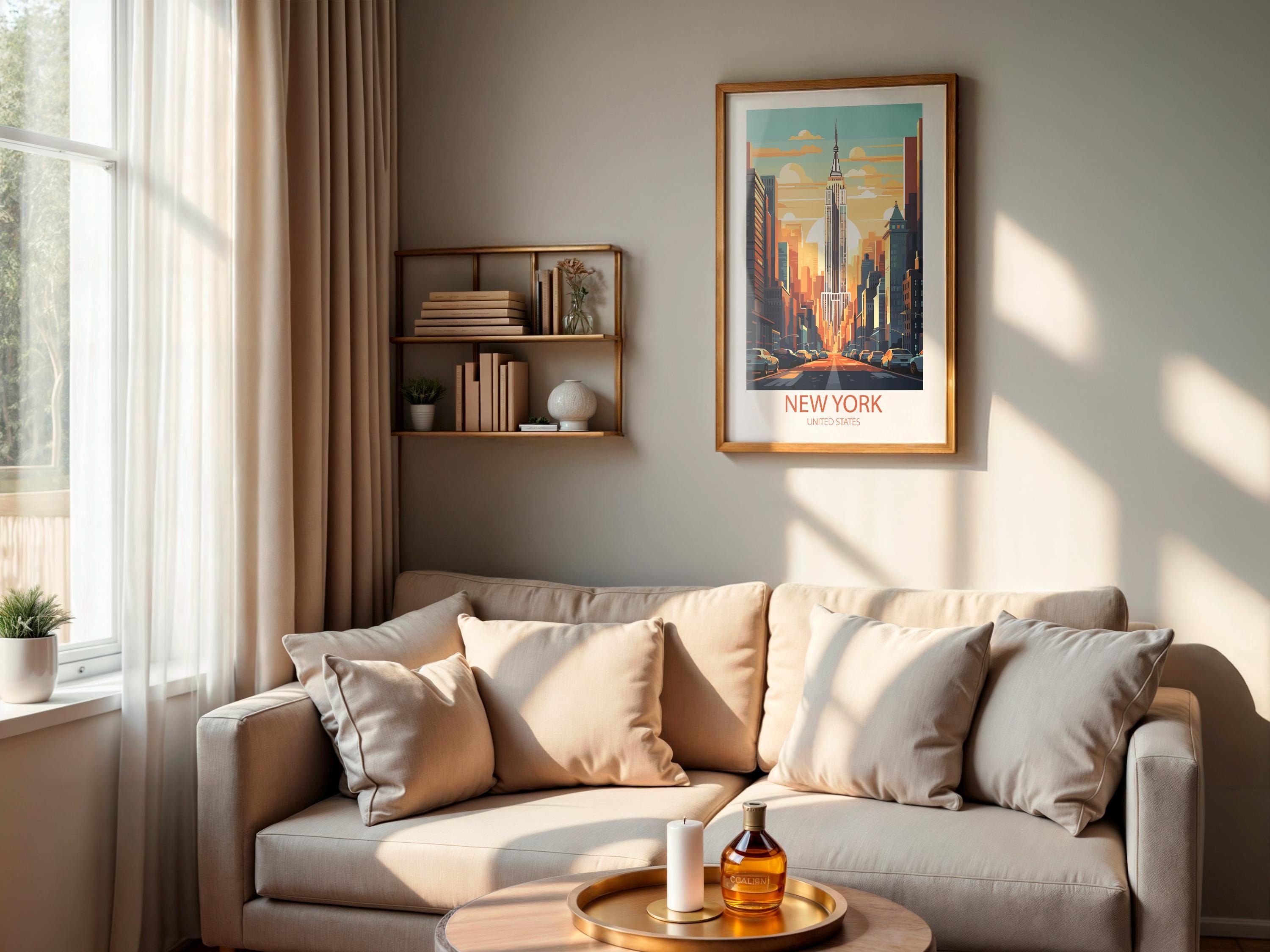 New York City comes to life in this beautifully designed vintage travel poster, created in a timeless retro style. Featuring the Statue of Liberty and skyline views, this travel print brings metropolitan charm into your home.