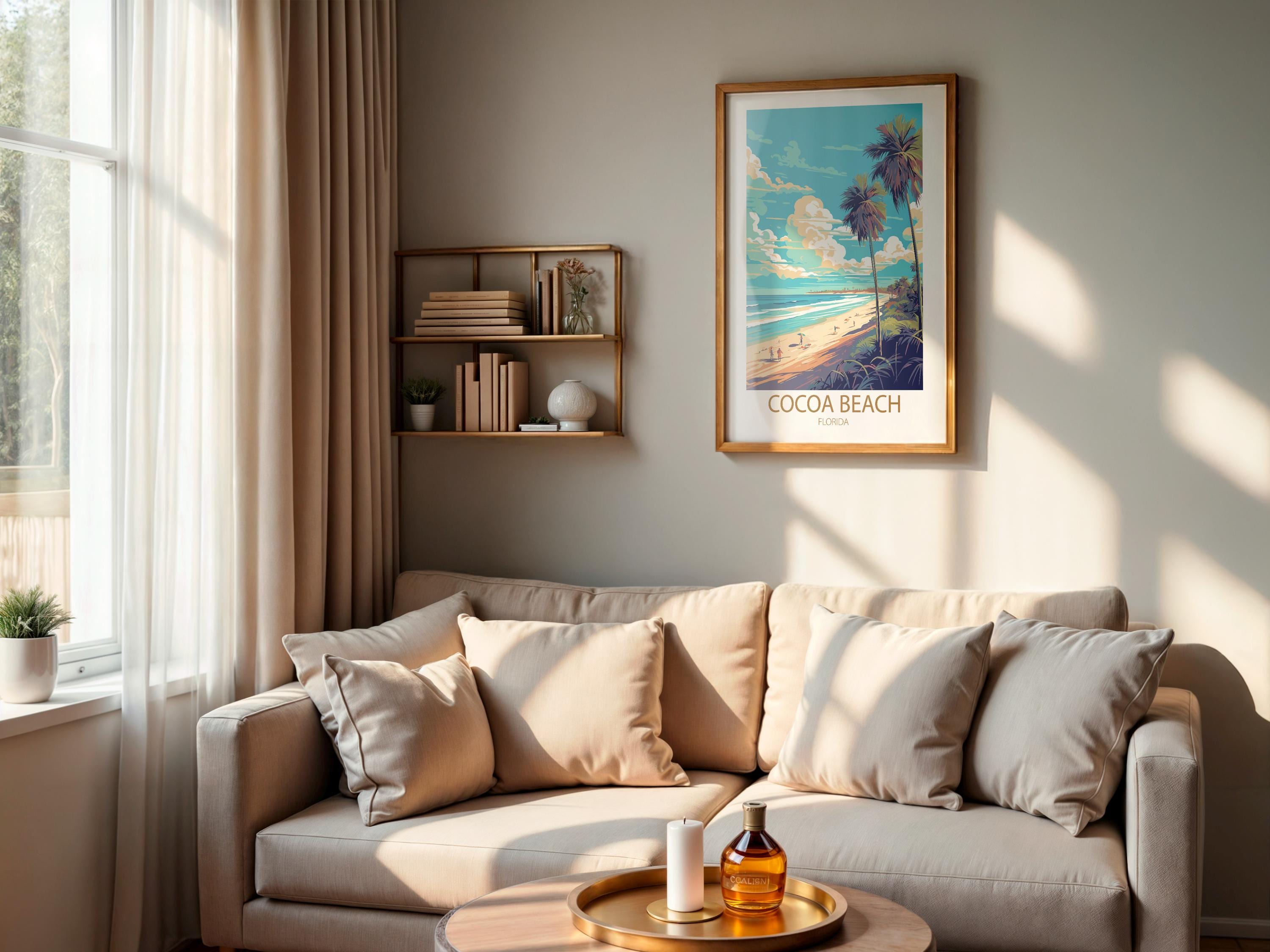 Cocoa Beach Florida comes to life in this beautifully designed vintage travel poster, created in a timeless retro style. Featuring sandy shores and surf culture, this travel print brings coastal wanderlust into your home.