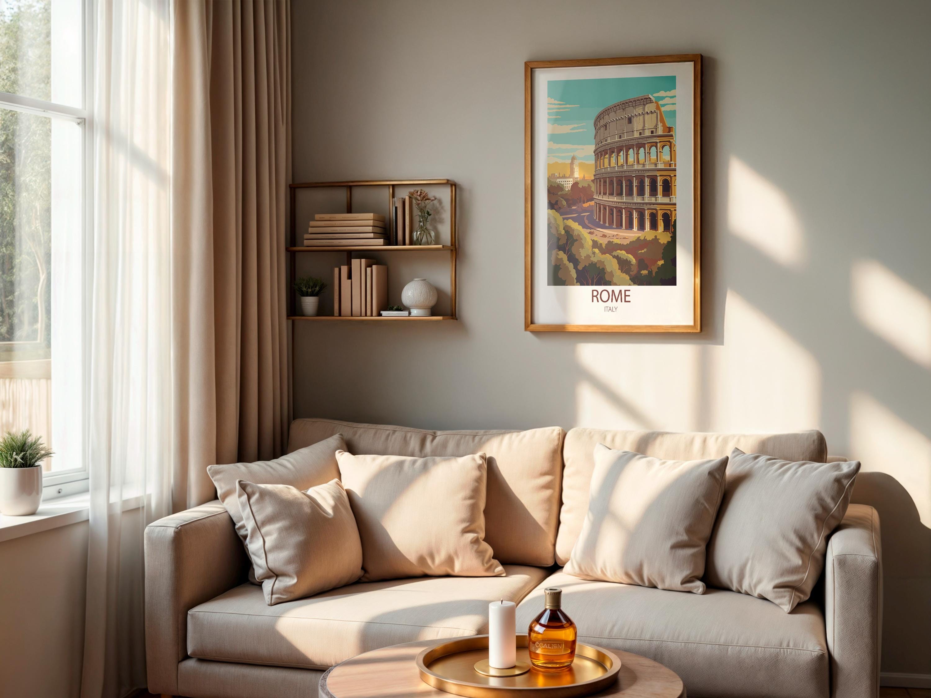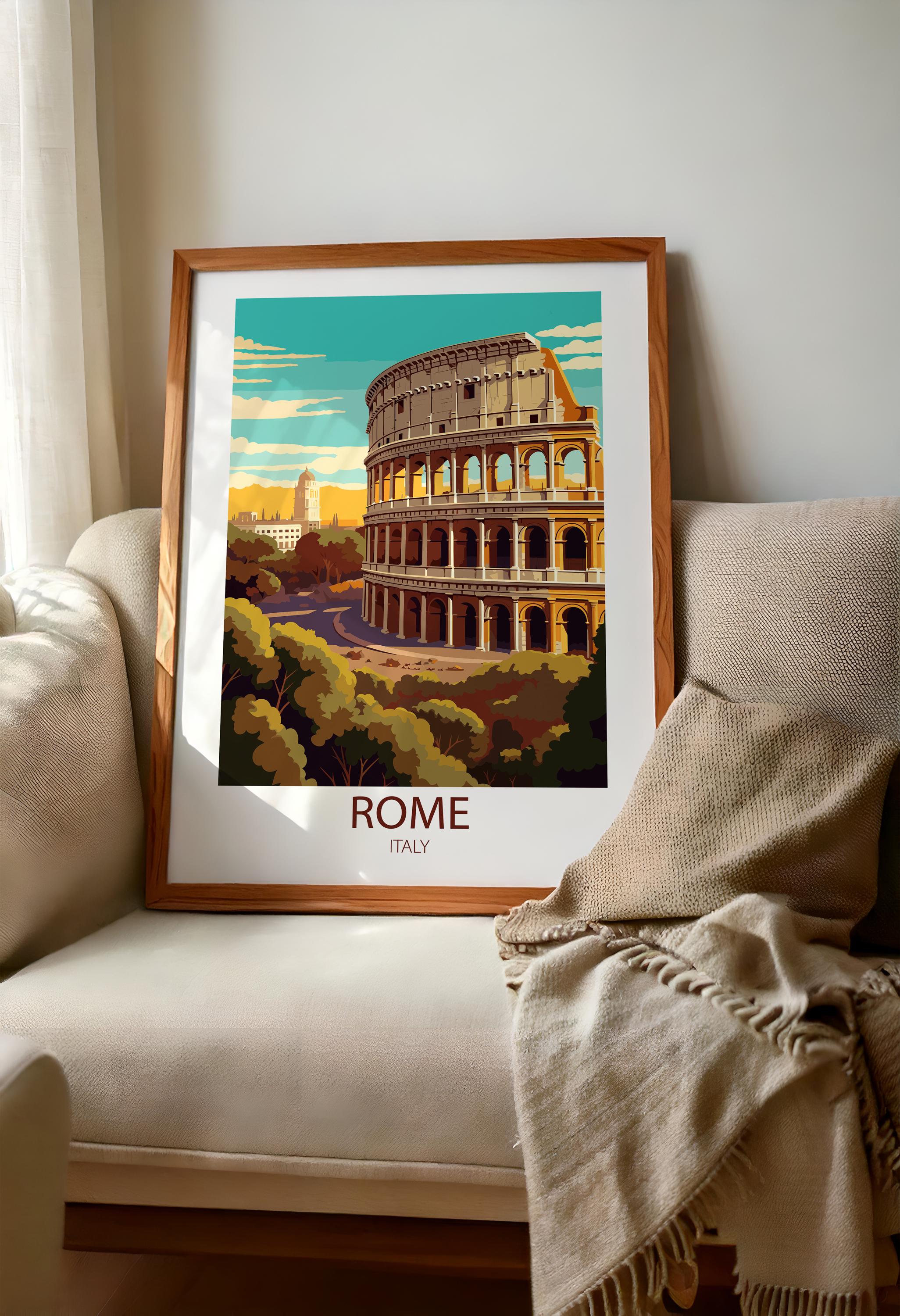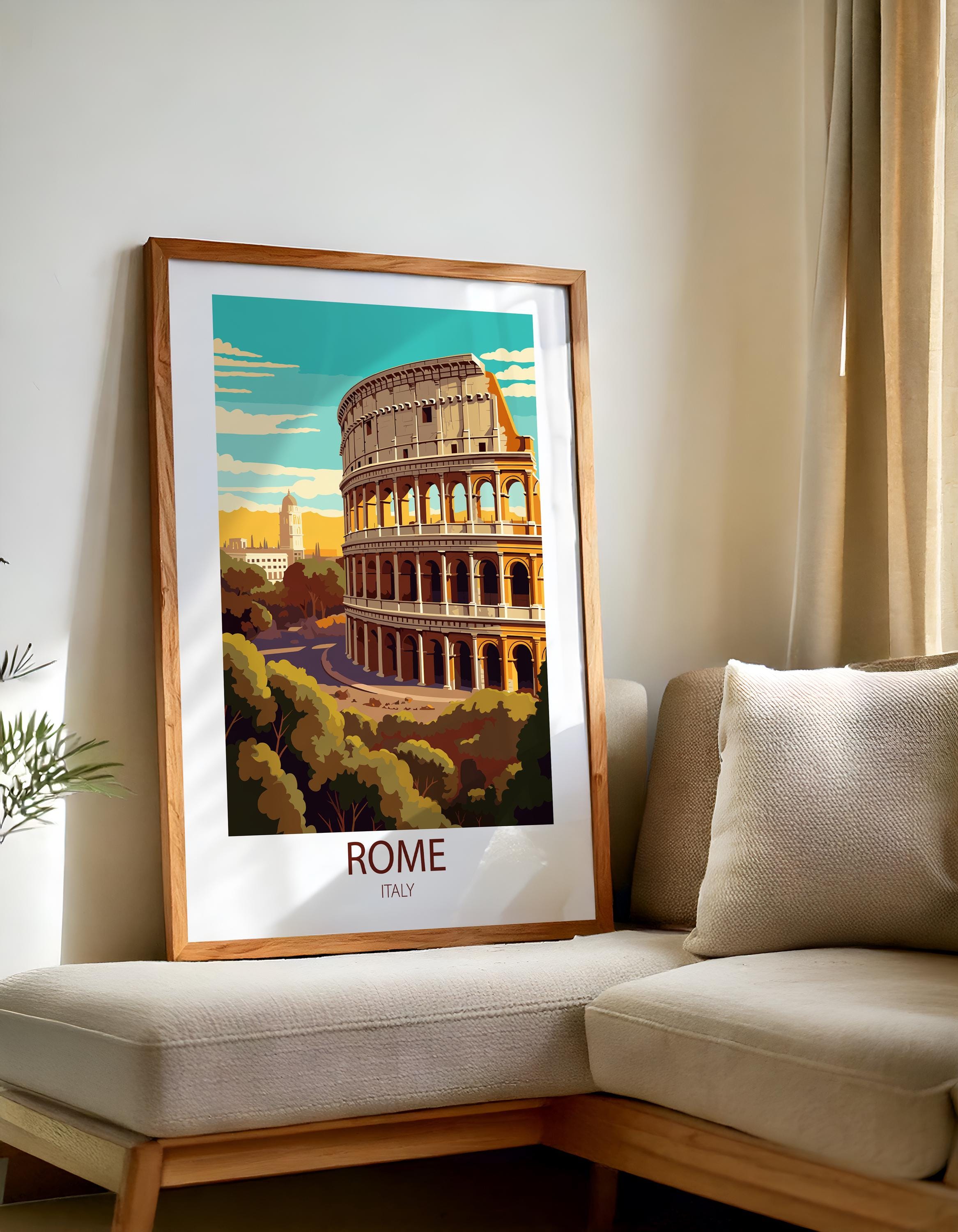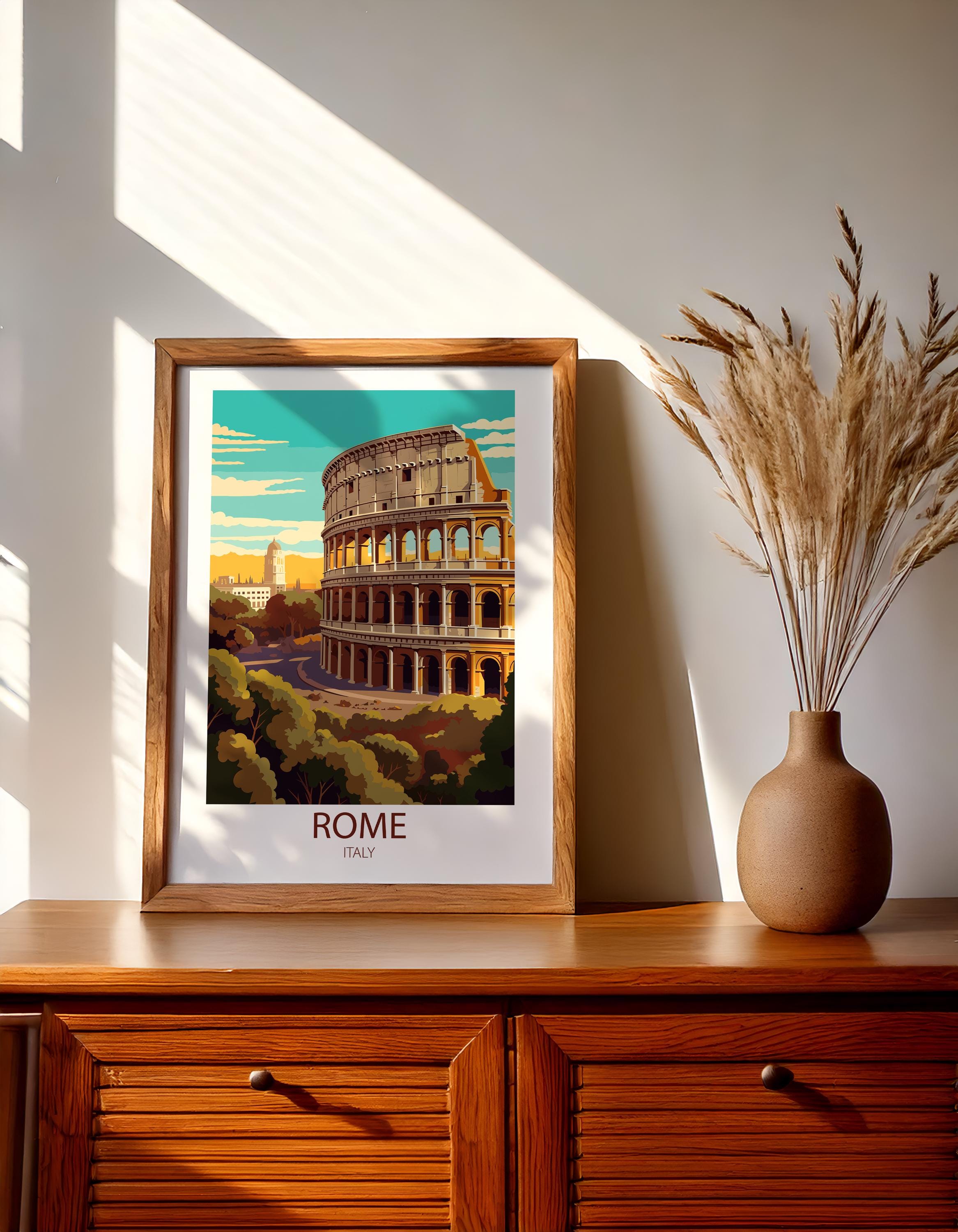 Rome Italy comes to life in this beautifully designed vintage travel poster, created in a timeless retro style. Featuring the Colosseum and ancient landmarks, this travel print brings Italian history and wanderlust into your home.