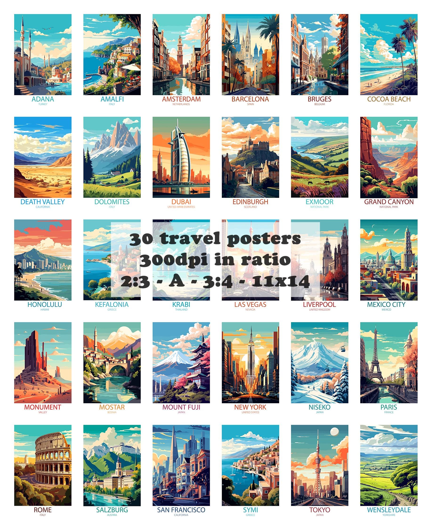 Bring wanderlust into your space with our Vintage Travel Poster Bundle—30 high-resolution retro printable wall art prints, perfect for city lovers and landscape connoisseurs alike. This digital download set includes iconic destinations—from Paris and New York to Tokyo, Krabi, and Mostar—styled in a timeless, mid-century travel aesthetic.