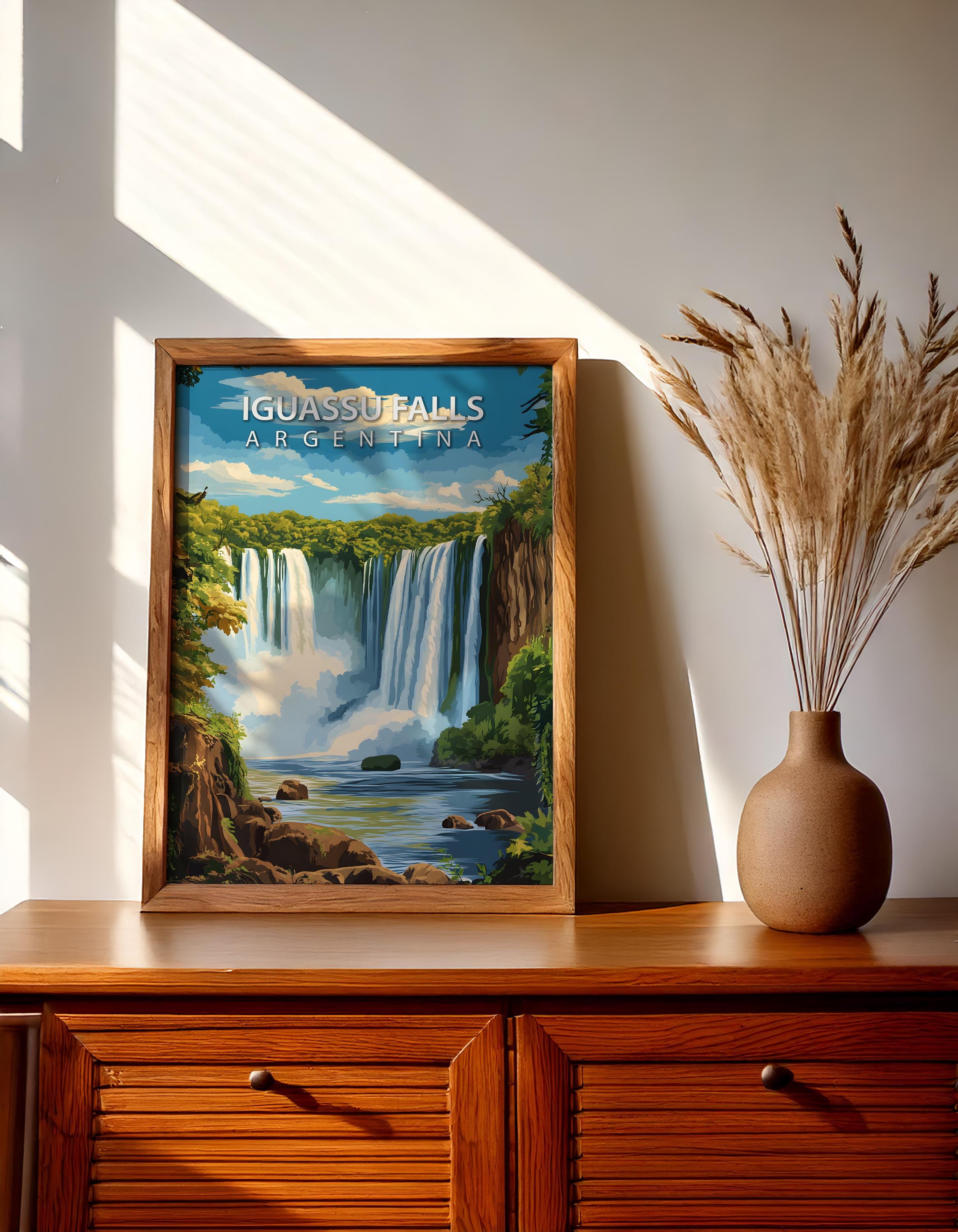 Iguassu Falls travel poster in a retro vintage style, showcasing the breathtaking cascades on the border of Argentina and Brazil. Perfect as waterfall wall art and South American nature decor for homes, offices, or gallery walls. A wanderlust gift for travel and adventure lovers.