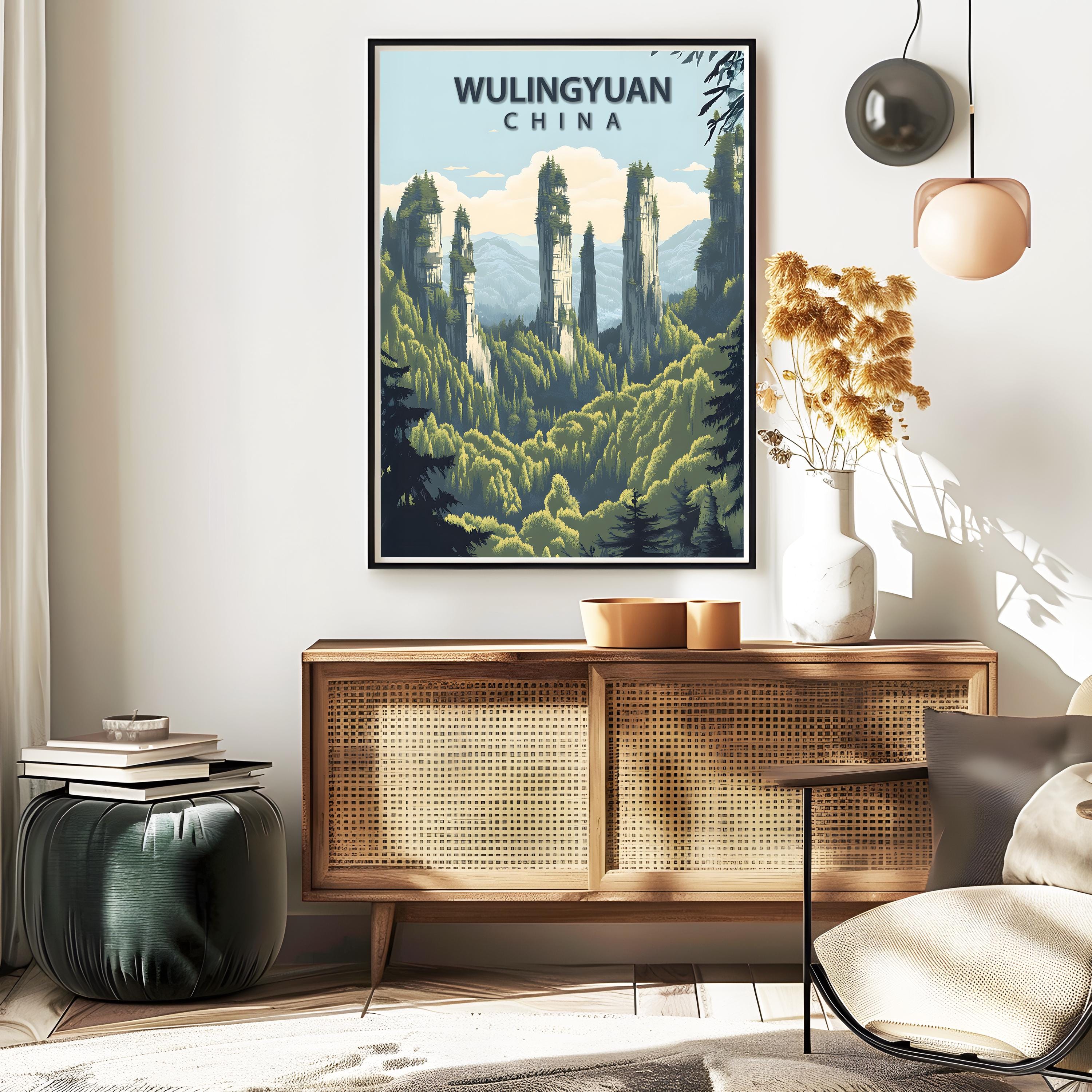 Wulingyuan travel poster in a retro vintage style, capturing China’s dramatic sandstone pillars and lush landscapes. Perfect as mountain wall art and scenic decor for homes, offices, or gallery walls. A wanderlust gift for travelers and nature lovers.
