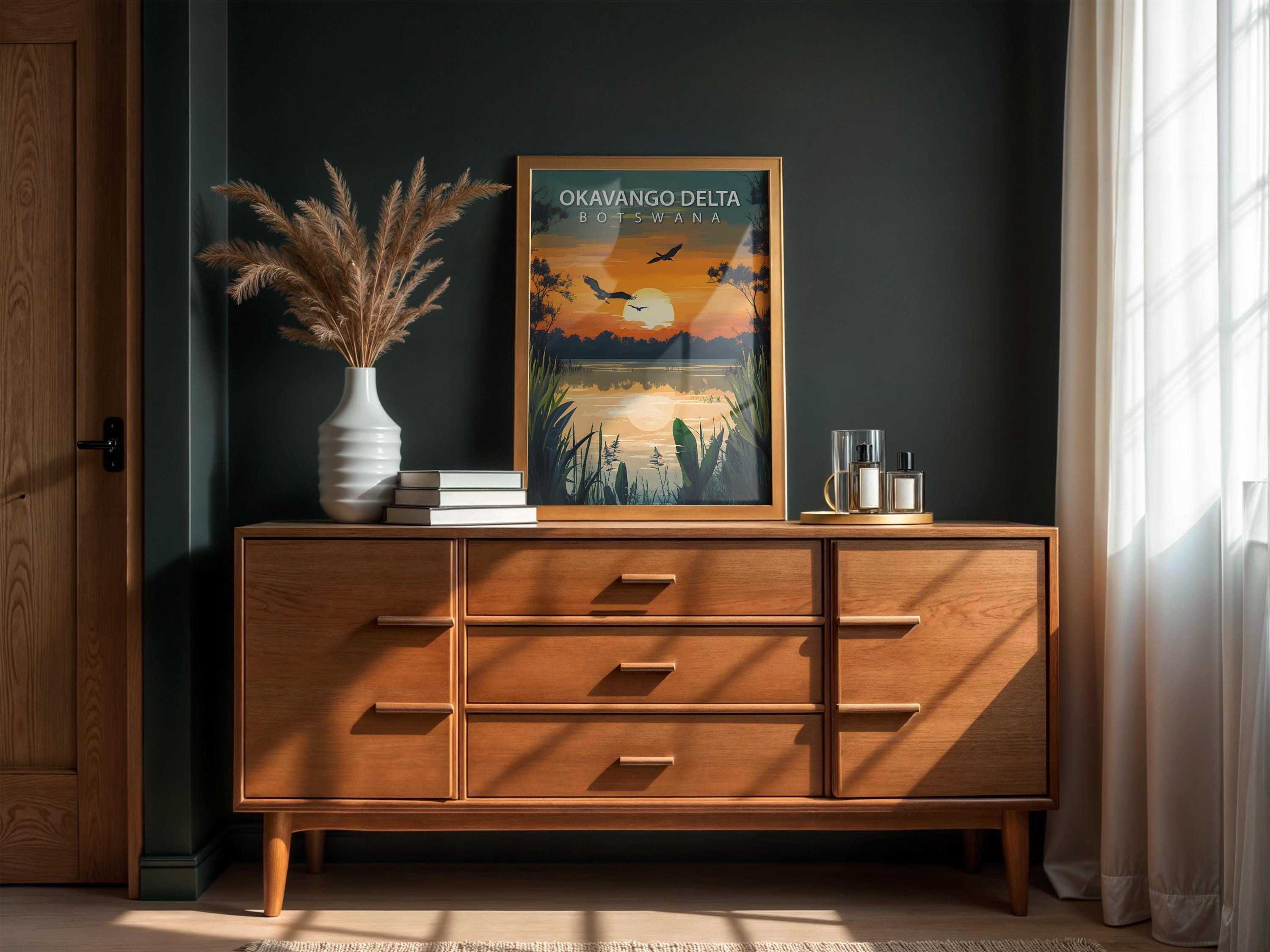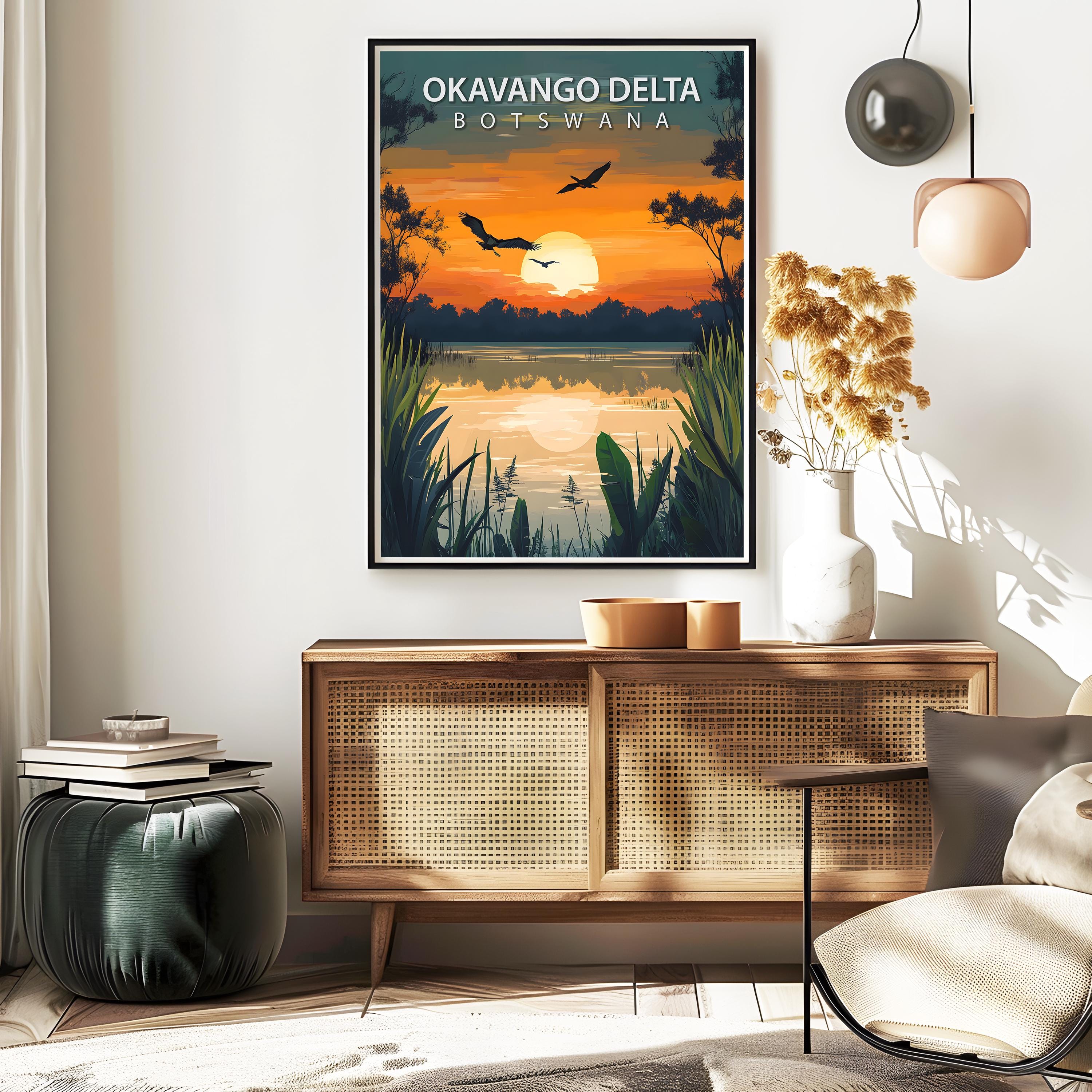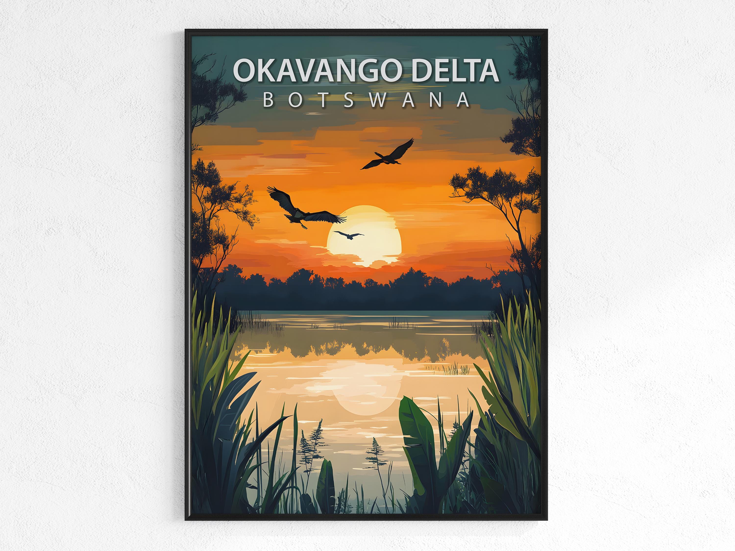 Okavango Delta travel poster in a retro vintage style, perfect as safari wall art and African wildlife decor. This poster highlights Botswana’s unique delta landscape, bringing adventure and wanderlust charm to your home.