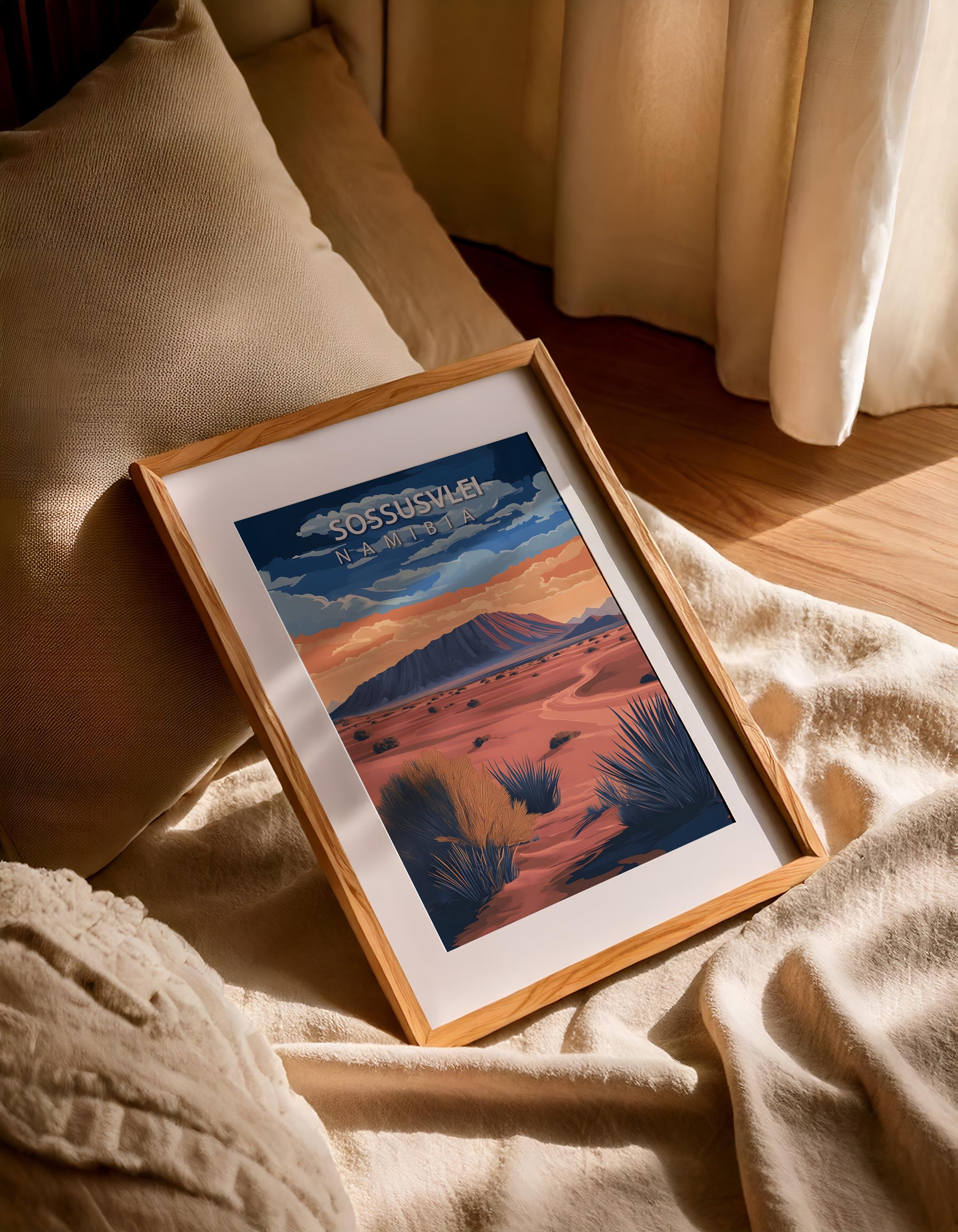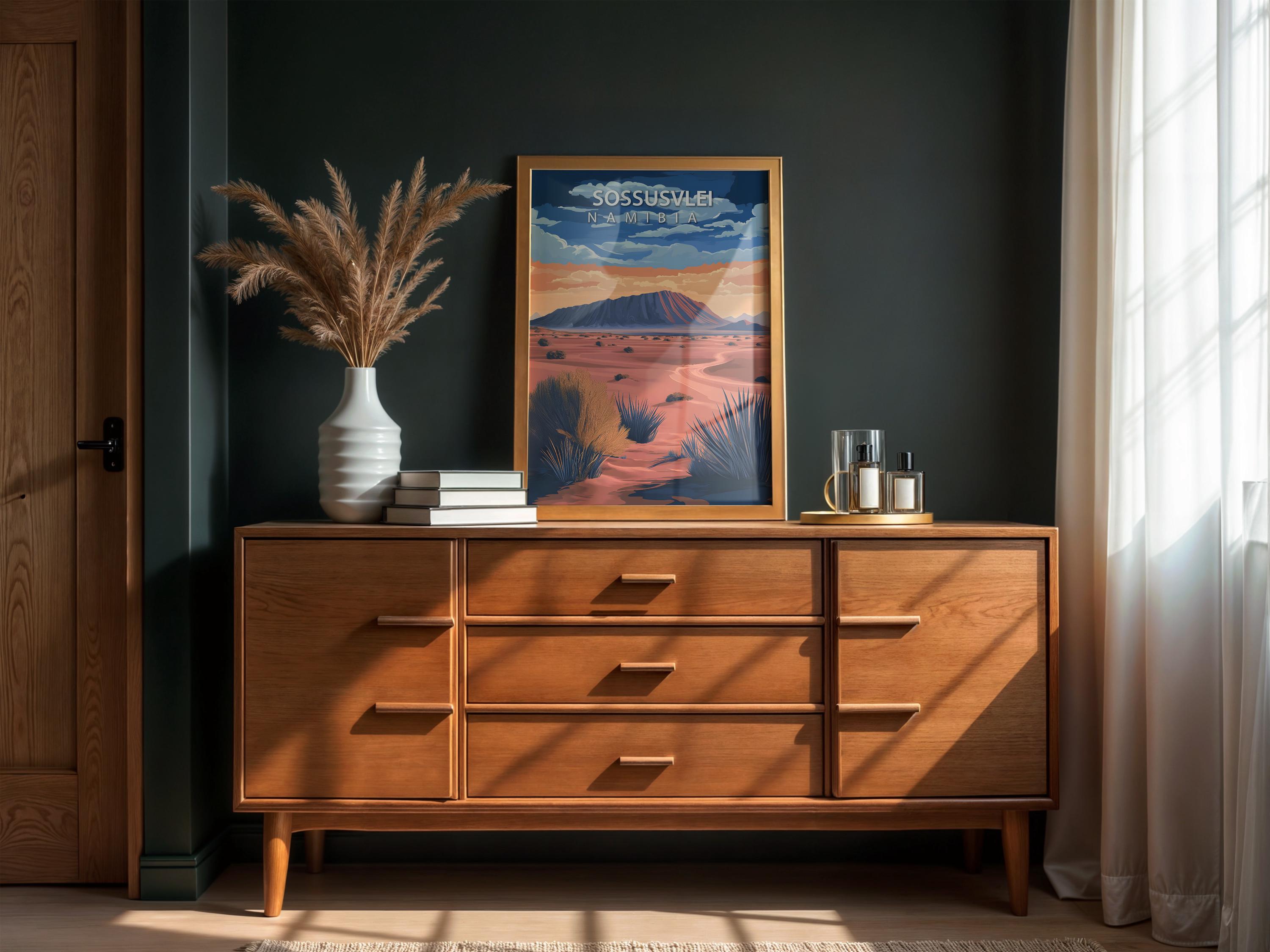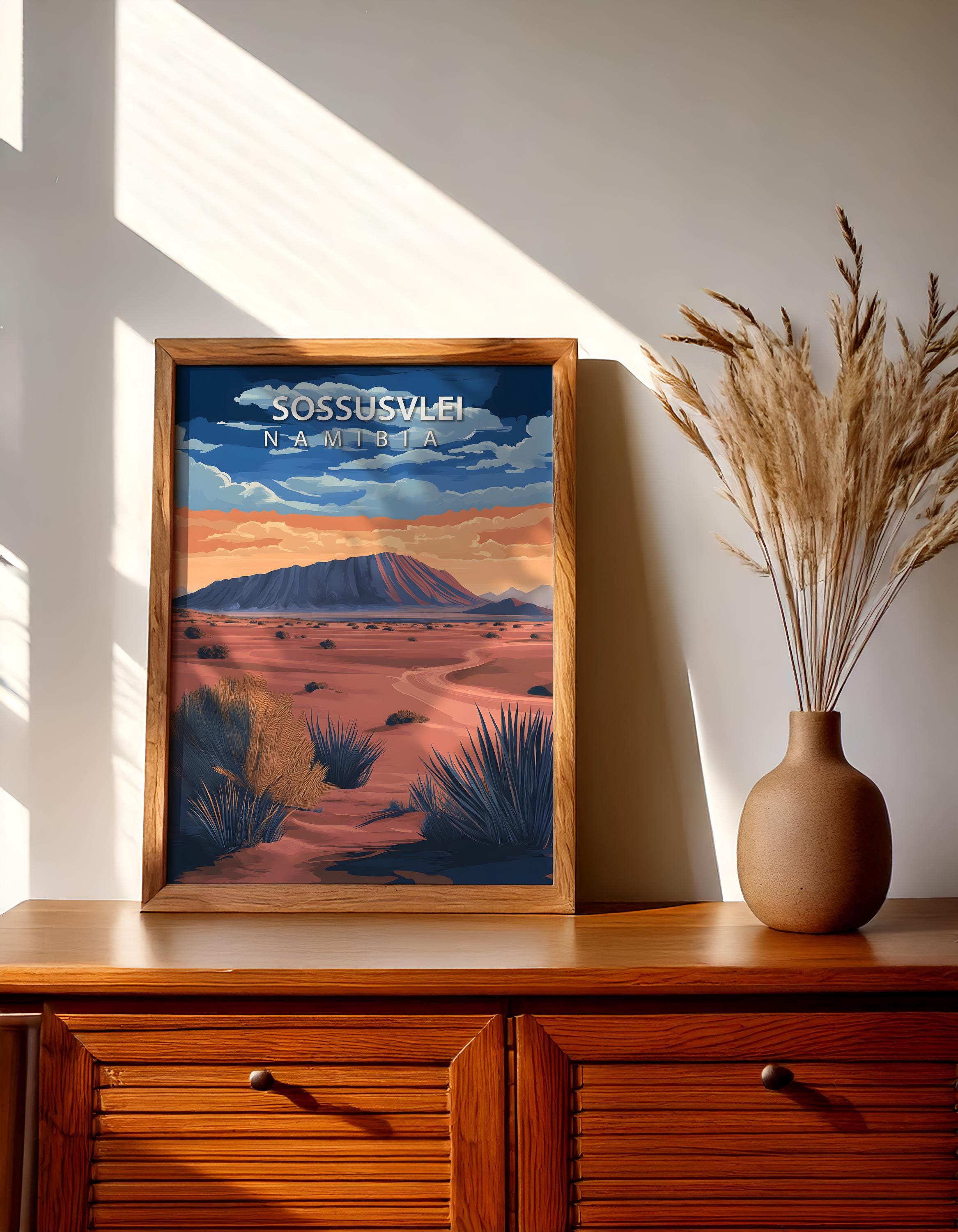 Sossusvlei travel poster in a retro vintage style, showcasing Namibia’s famous red dunes. Perfect as desert wall art and African landscape decor for gallery walls, living rooms, or offices. A wanderlust gift for adventurers and desert lovers.