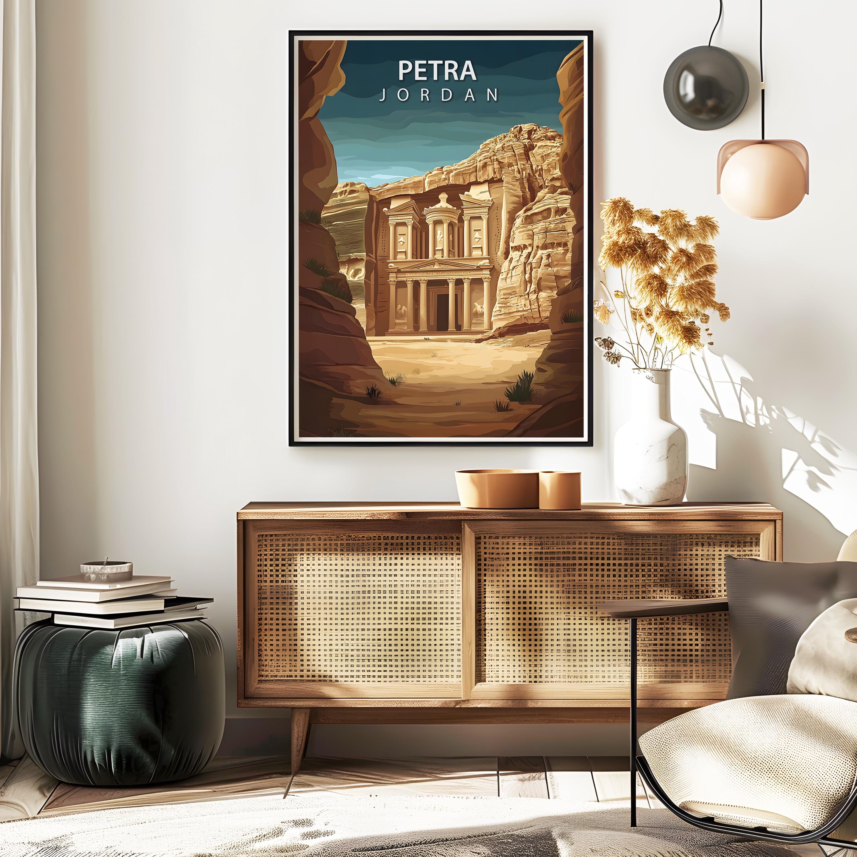 Petra travel poster in a retro vintage style, featuring Jordan’s iconic rock-carved city. Perfect as ruins wall art and heritage decor for gallery walls, living rooms, or offices. A meaningful wanderlust gift for history lovers.