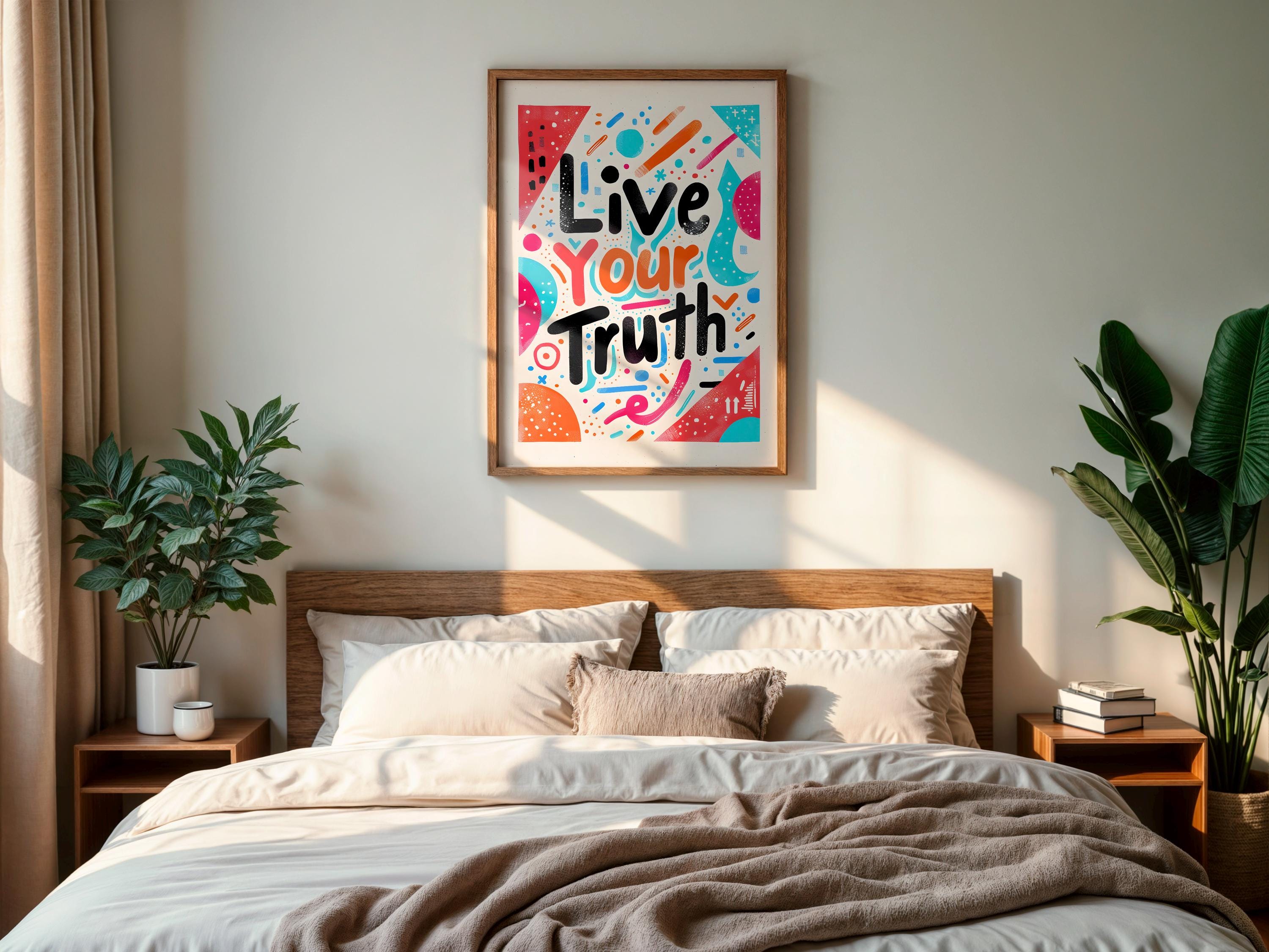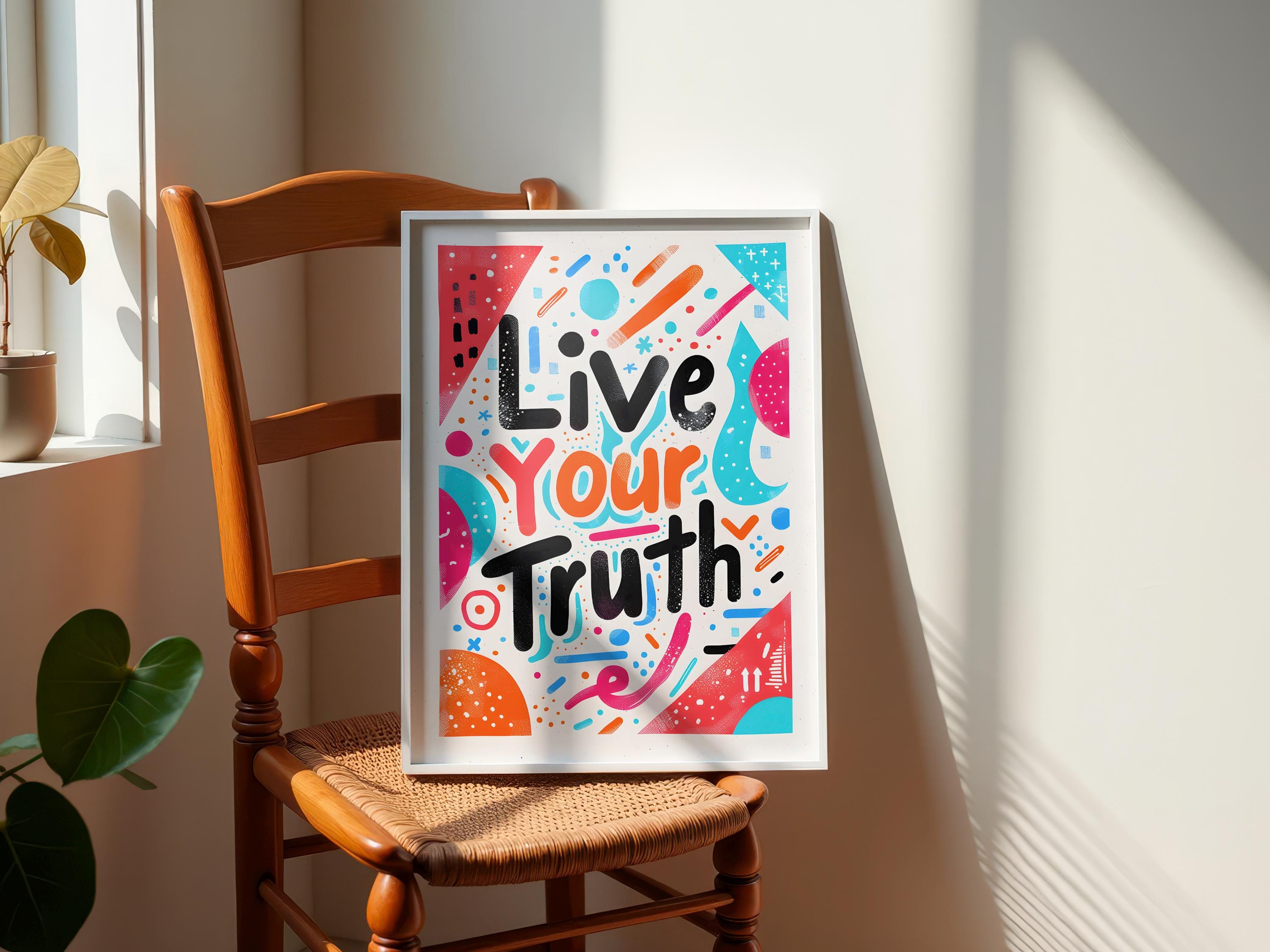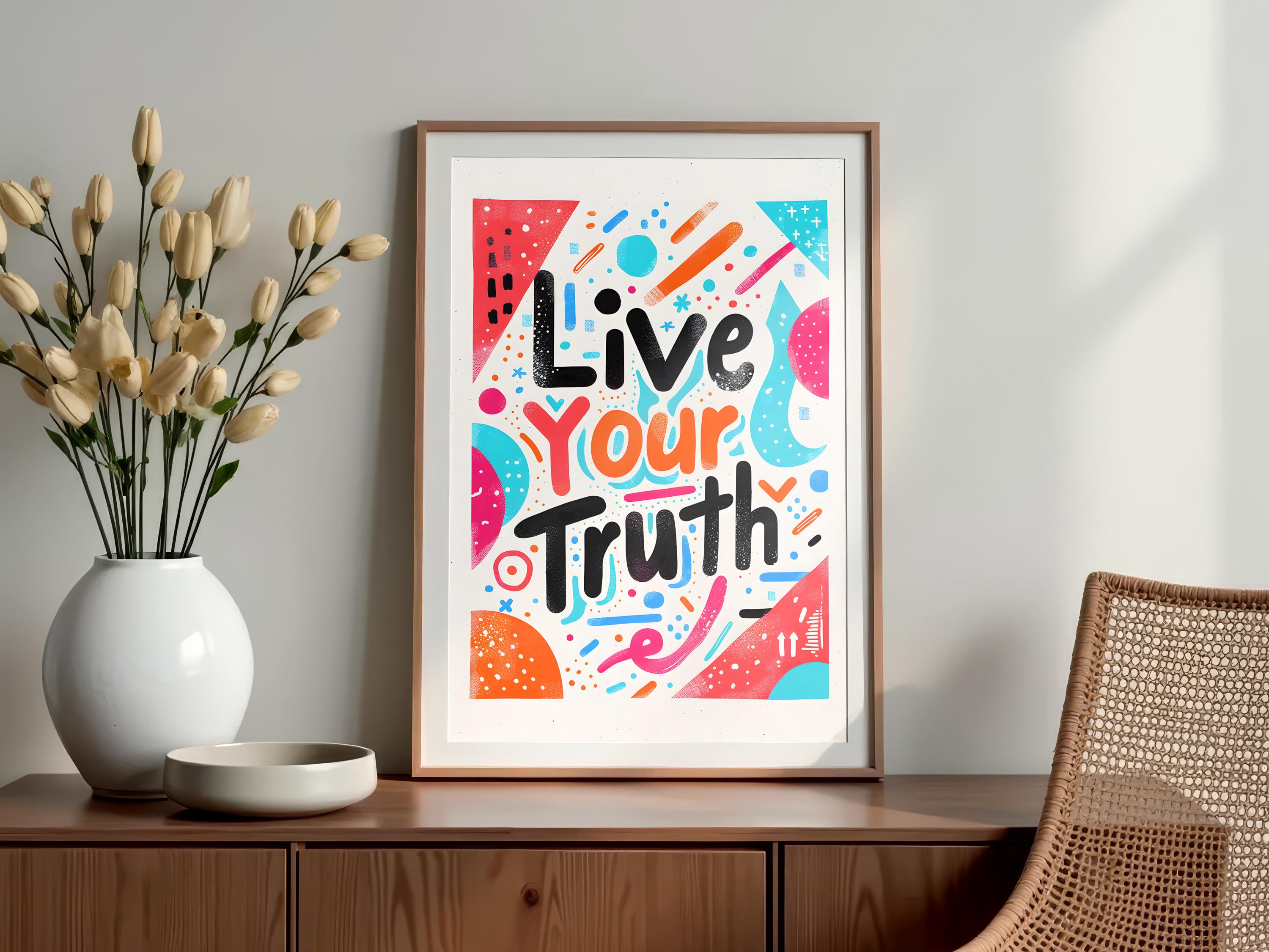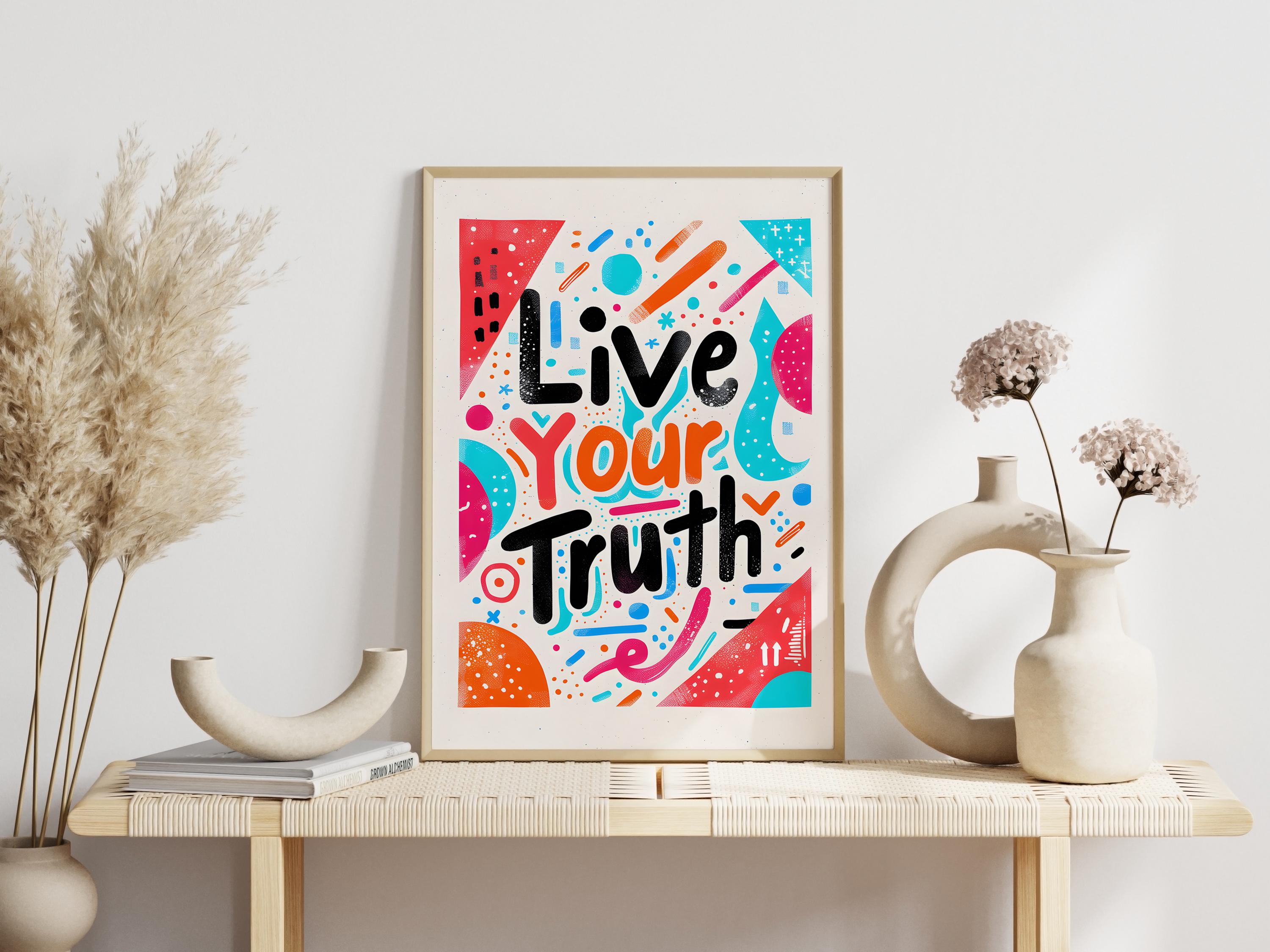 Live Your Truth Poster – motivational poster and inspirational wall art that celebrates authenticity and confidence. This positive quote print makes uplifting dorm decor, stylish apartment wall art, or a meaningful gift to encourage others to embrace their true selves.
