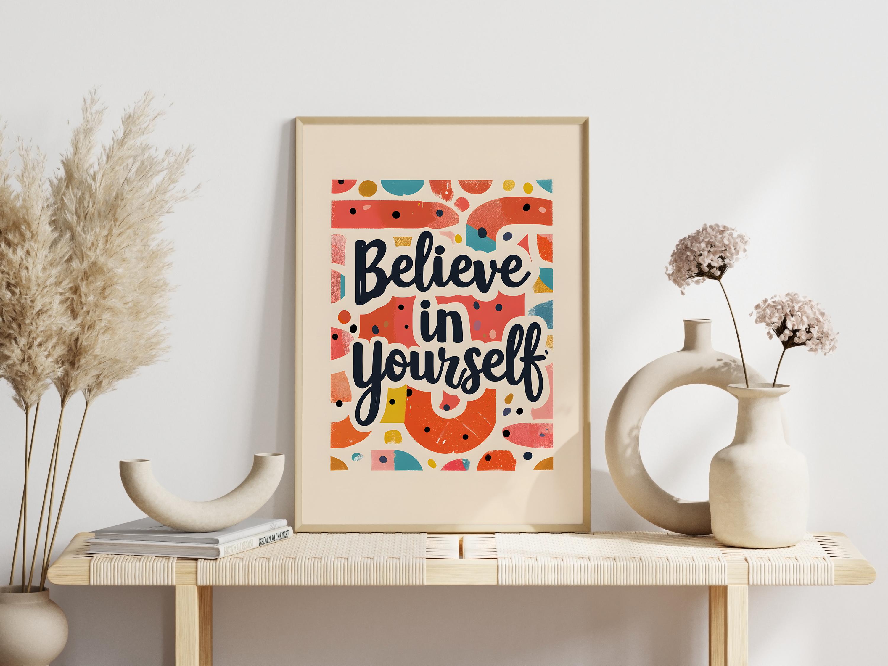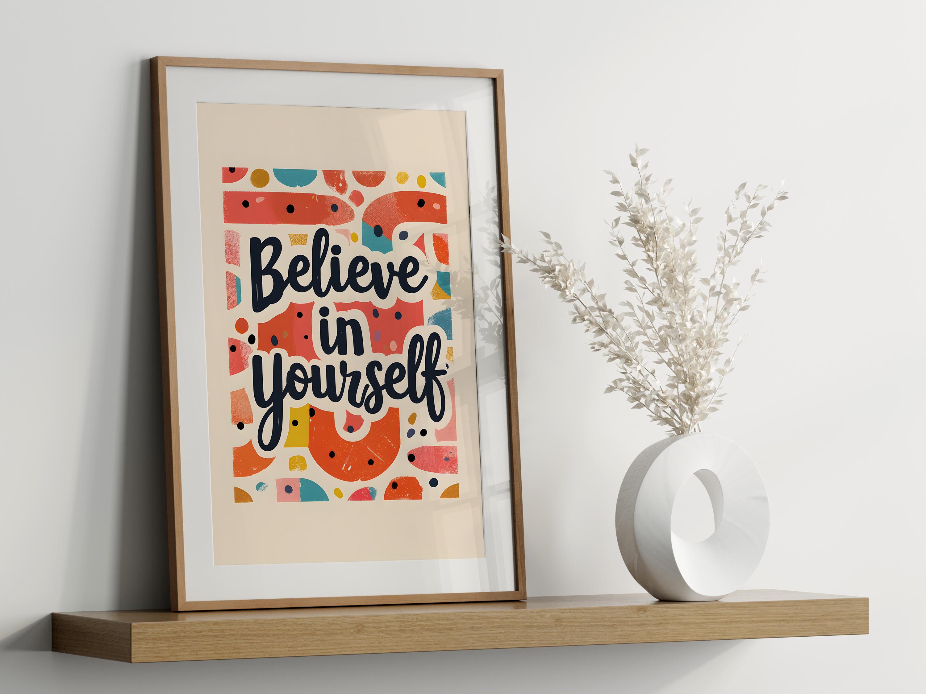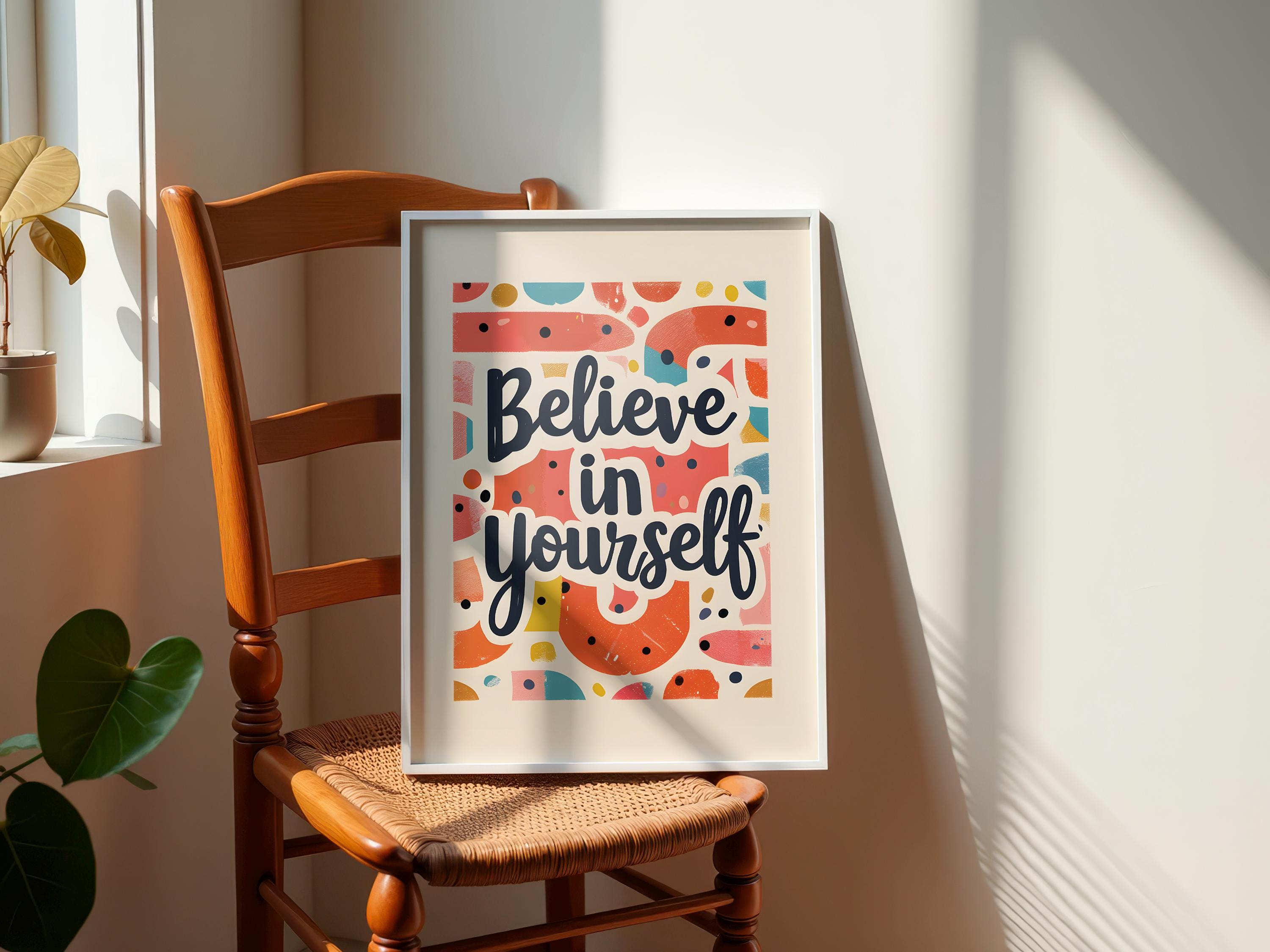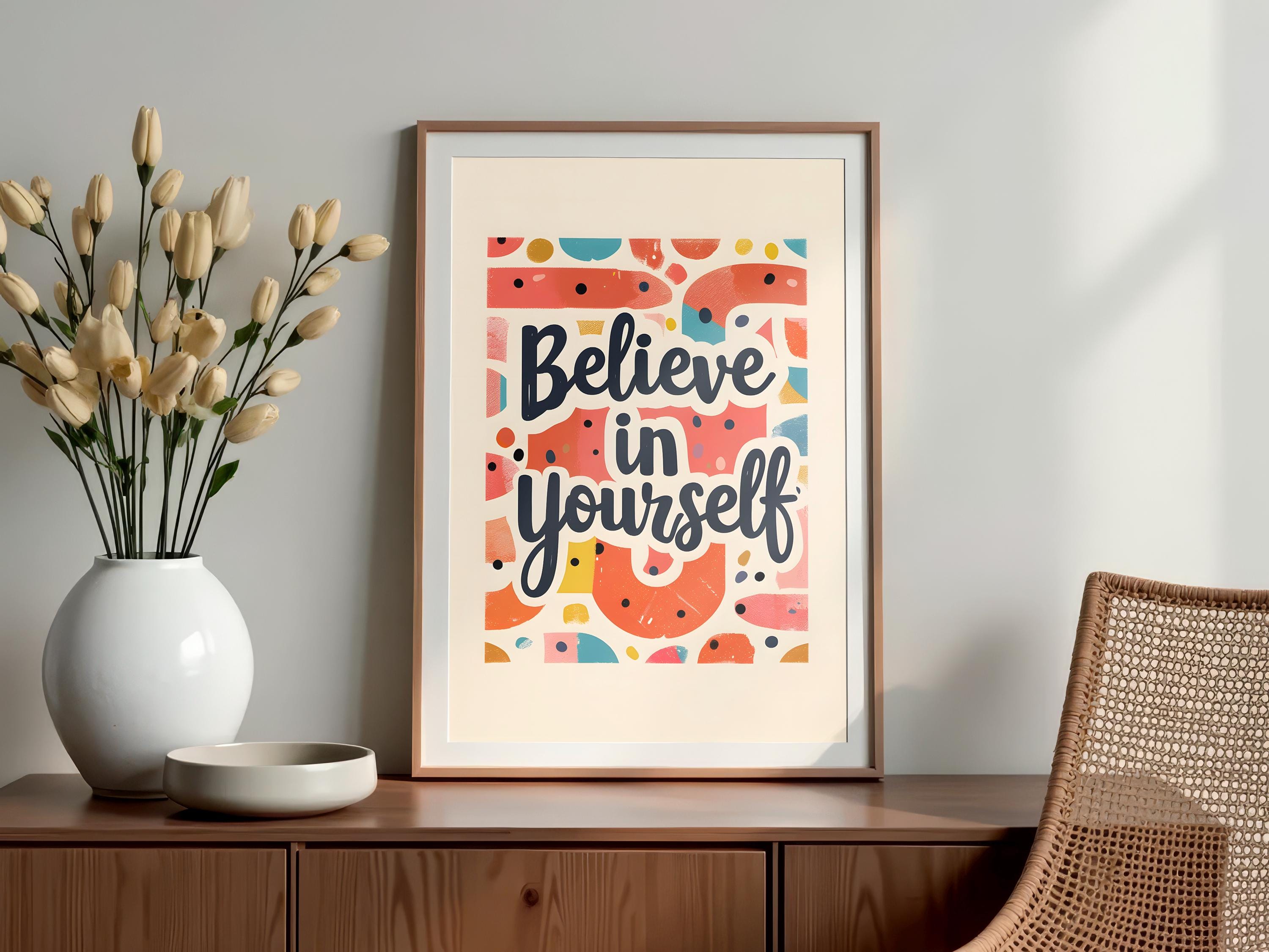 Boost confidence with this Believe in Yourself Poster – an inspirational wall art piece crafted to encourage your goals. This motivational poster is ideal for dorms, home offices, or bedrooms and makes a meaningful gift for students and dreamers.