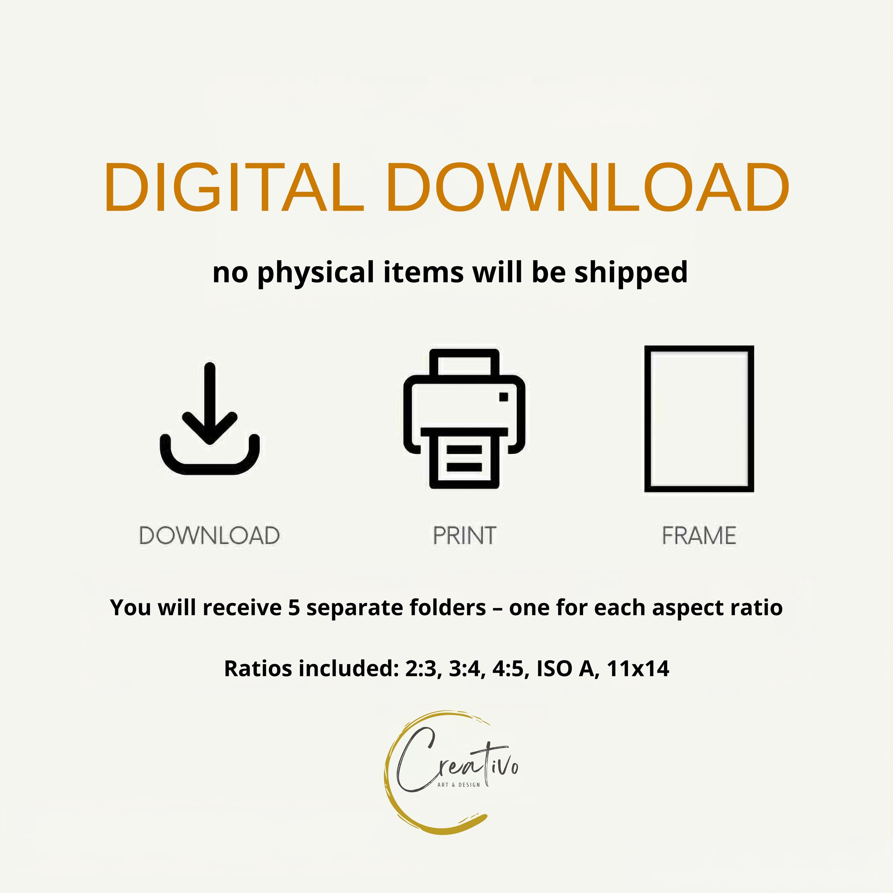 Each design comes in all popular aspect ratios - 2:3, 3:4, 4:5, A1–A4, and 11x14 - and every ratio is provided in its own folder for easy access. That way, you can quickly choose the right size and print at home, at a local print shop, or through an online printing service.