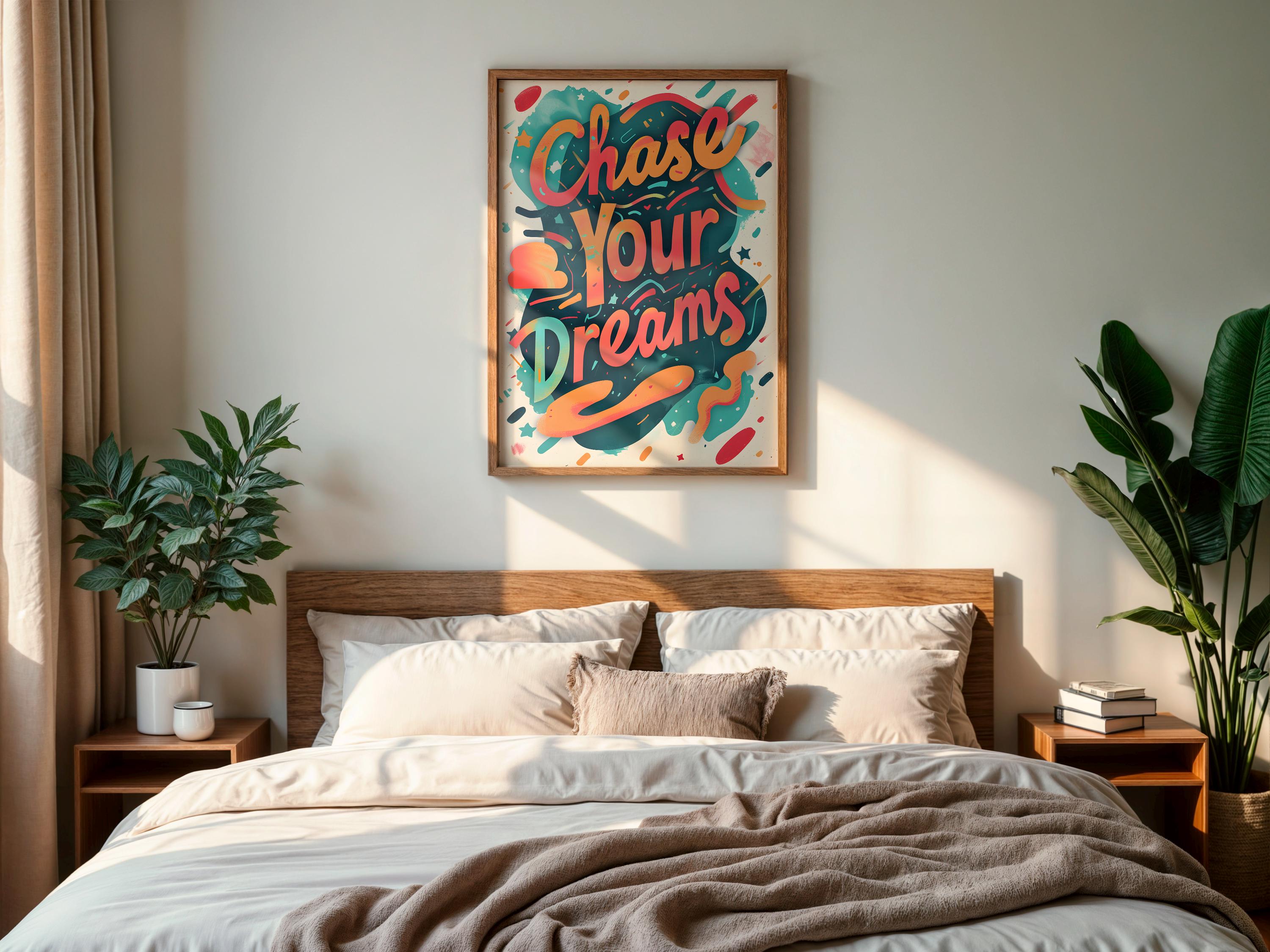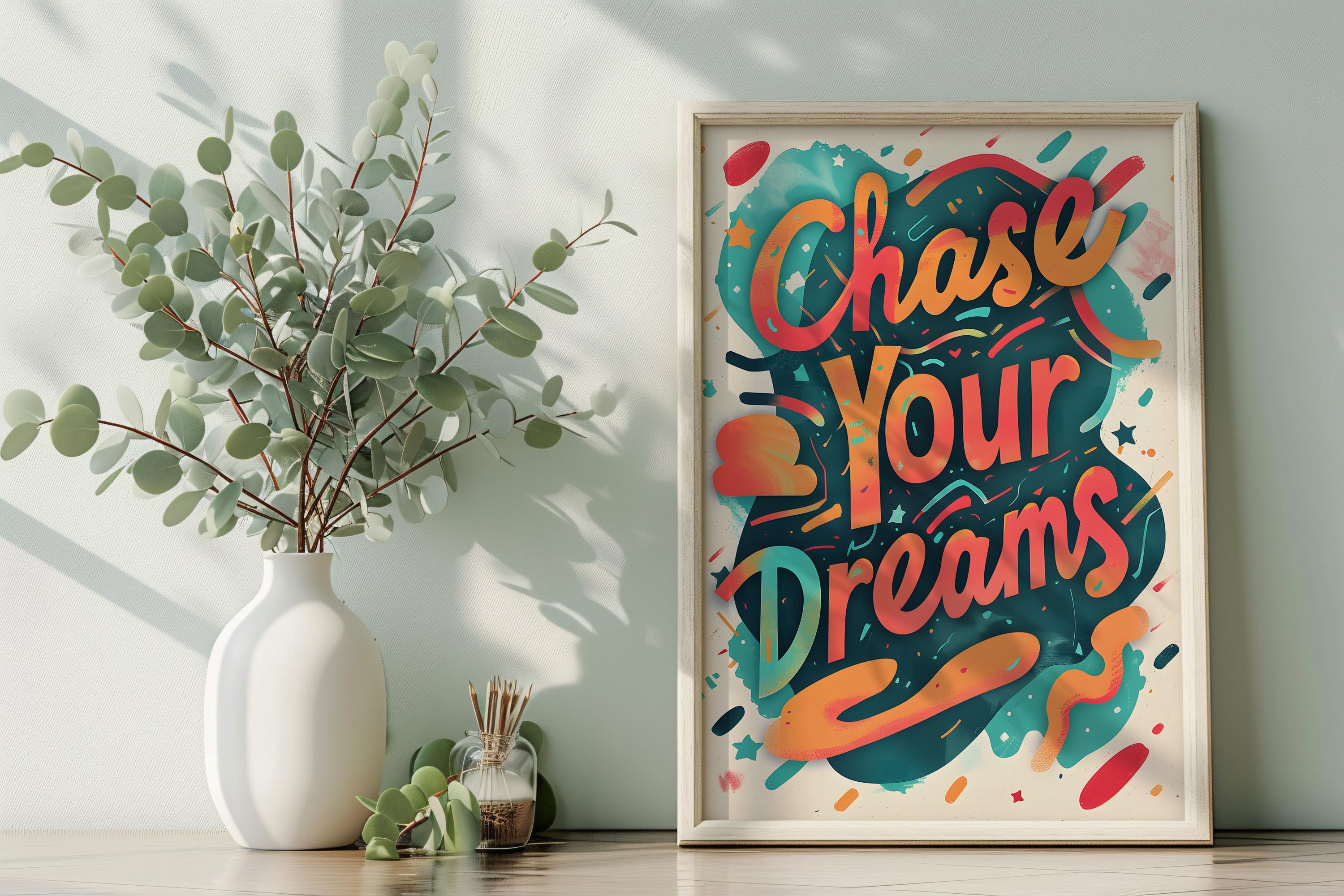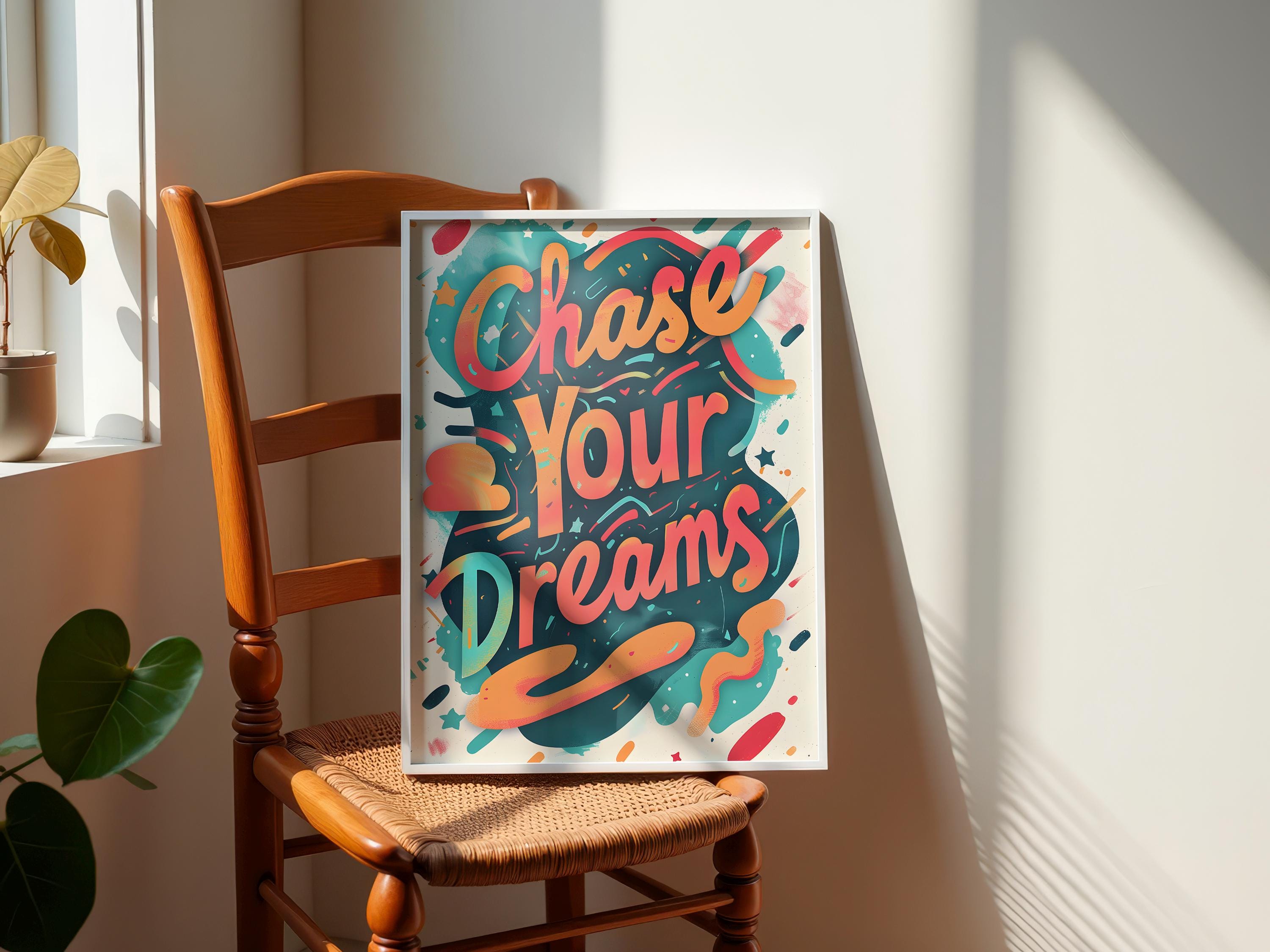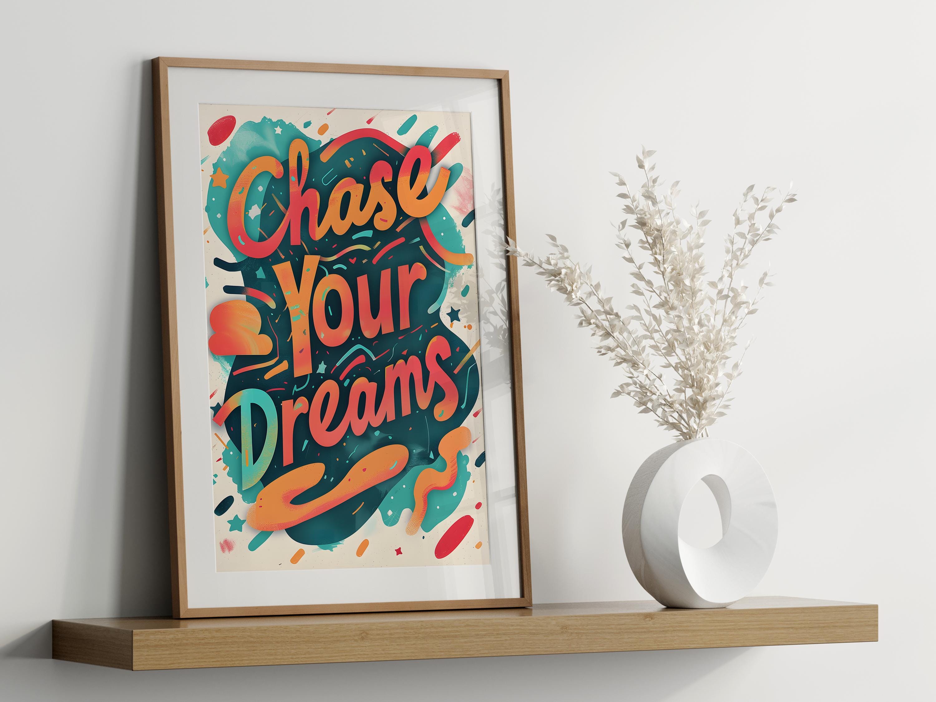 Chase Your Dreams Poster – motivational poster and inspirational wall art to pursue your ambitions. This dream big quote print makes uplifting dorm decor, stylish apartment wall art, or a thoughtful gift for anyone working towards their goals.