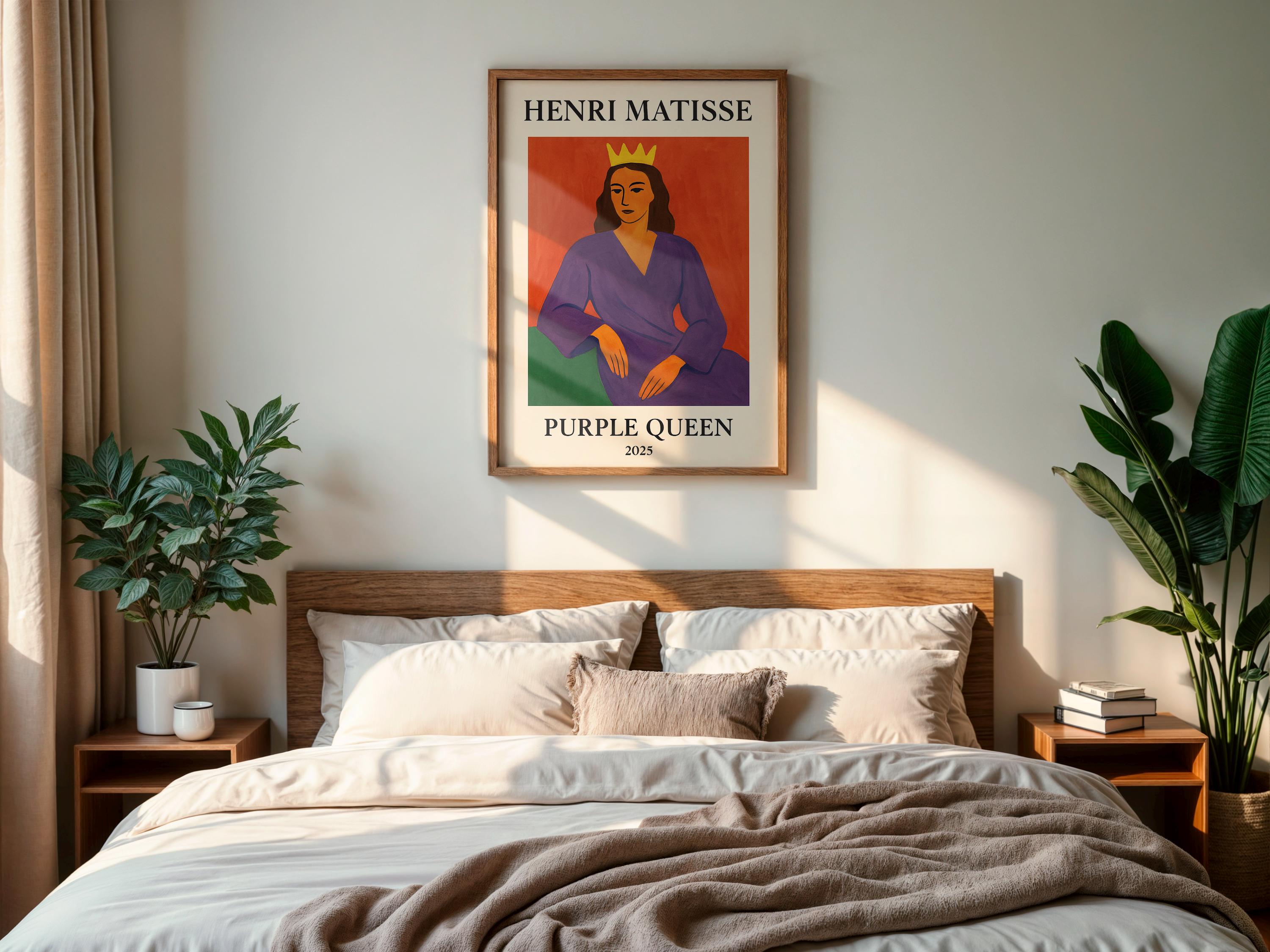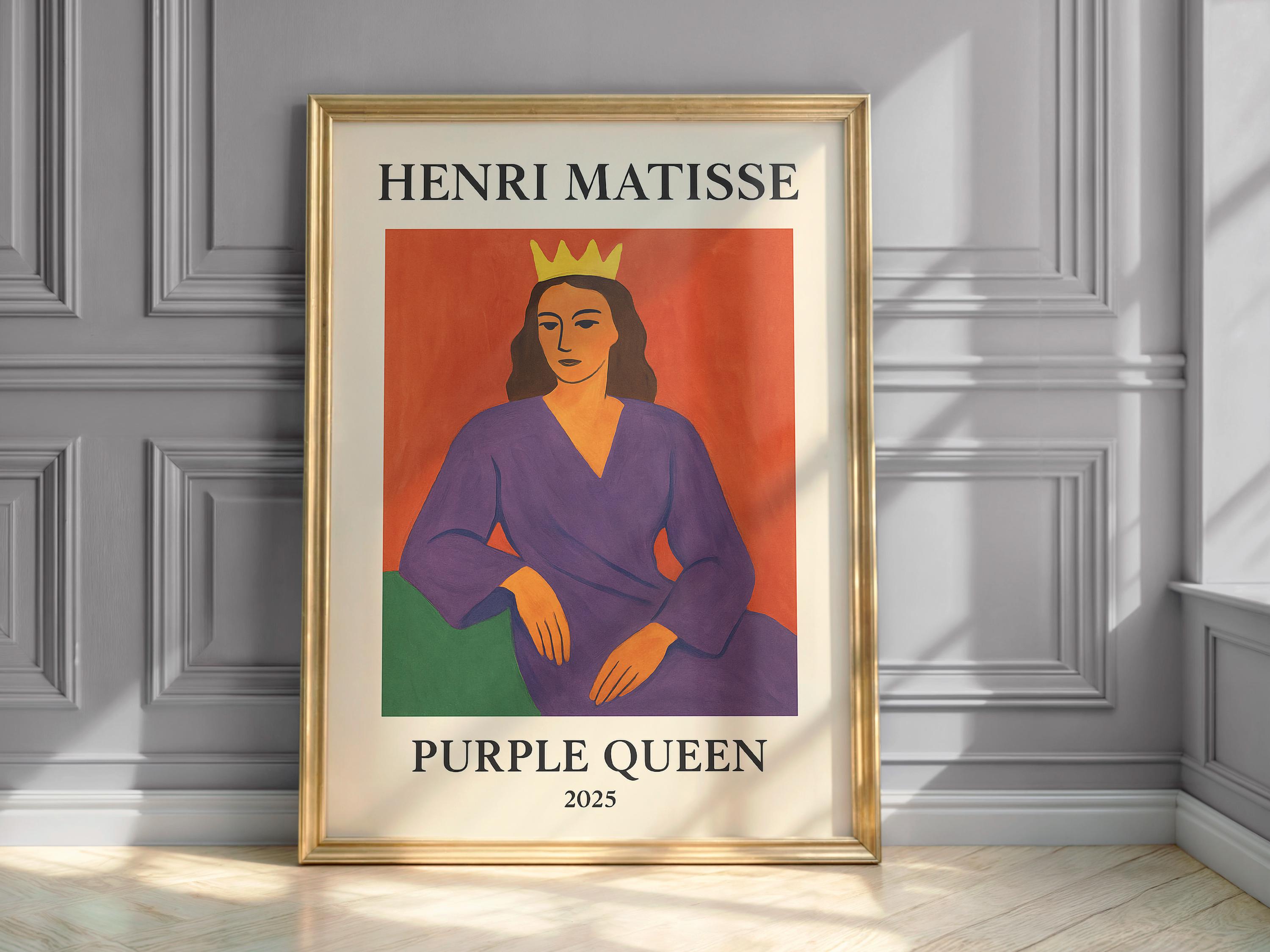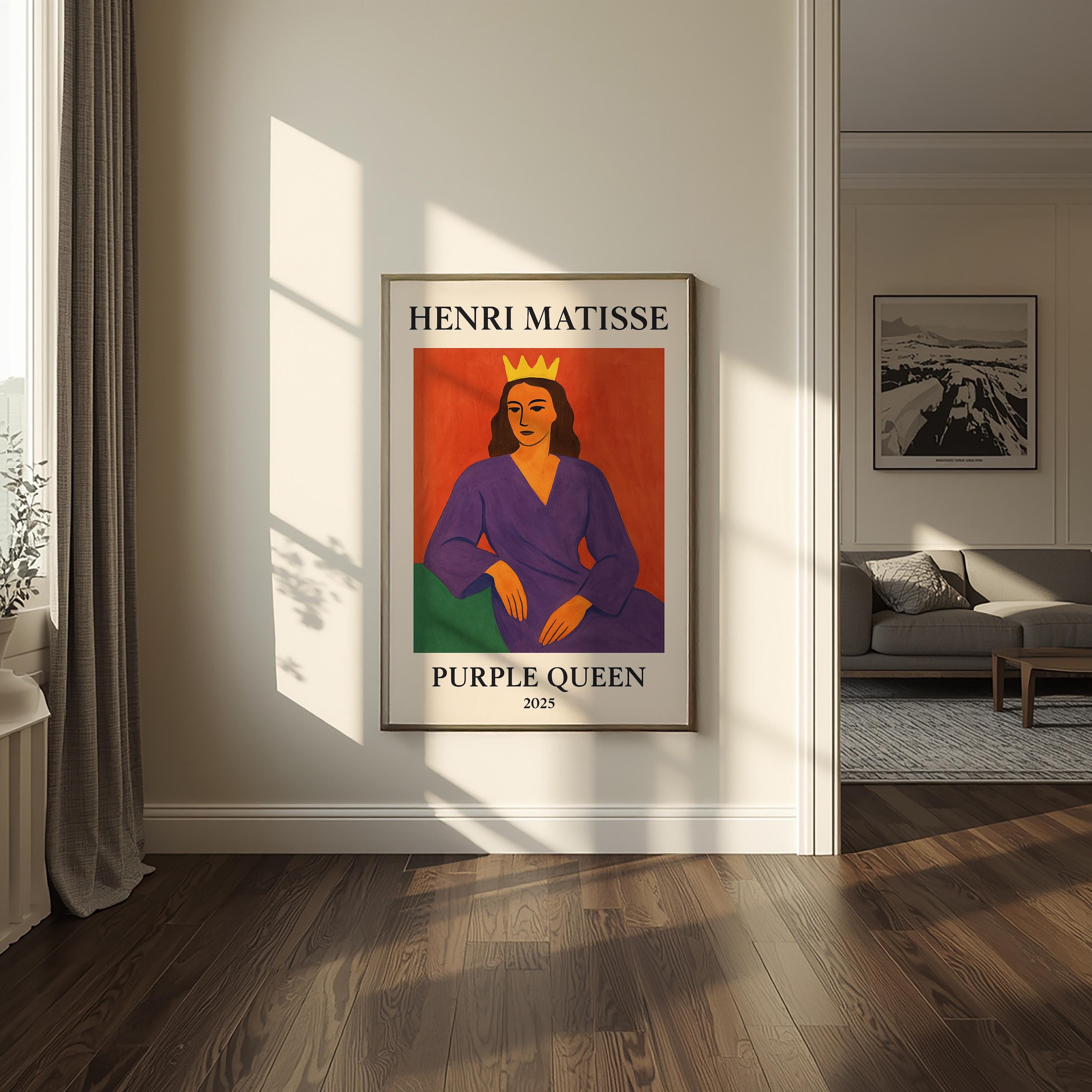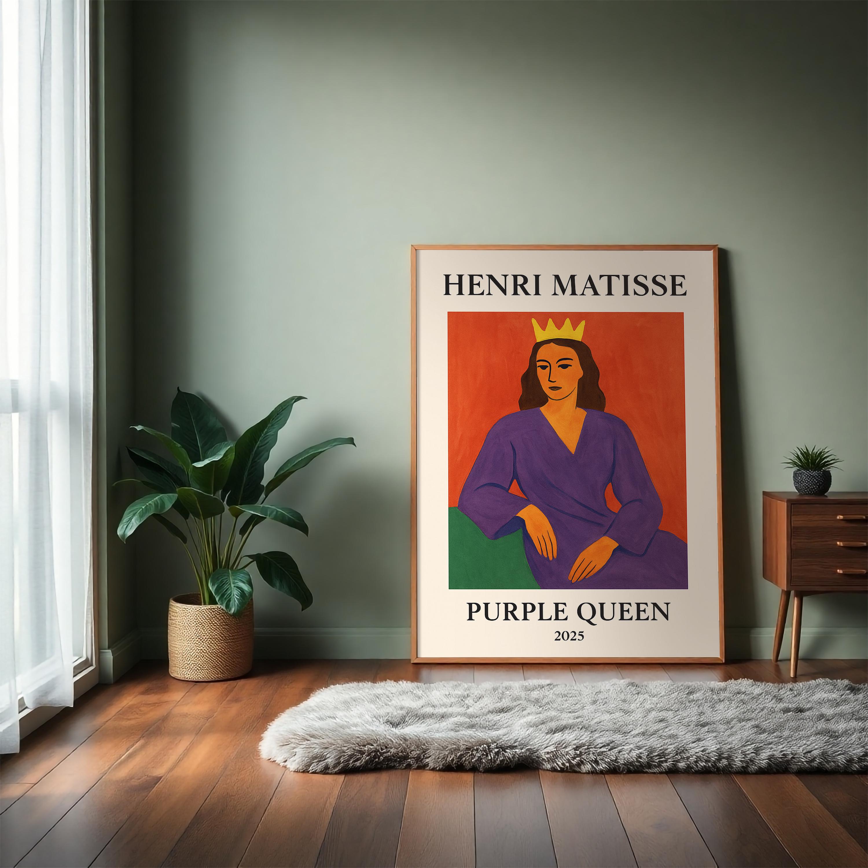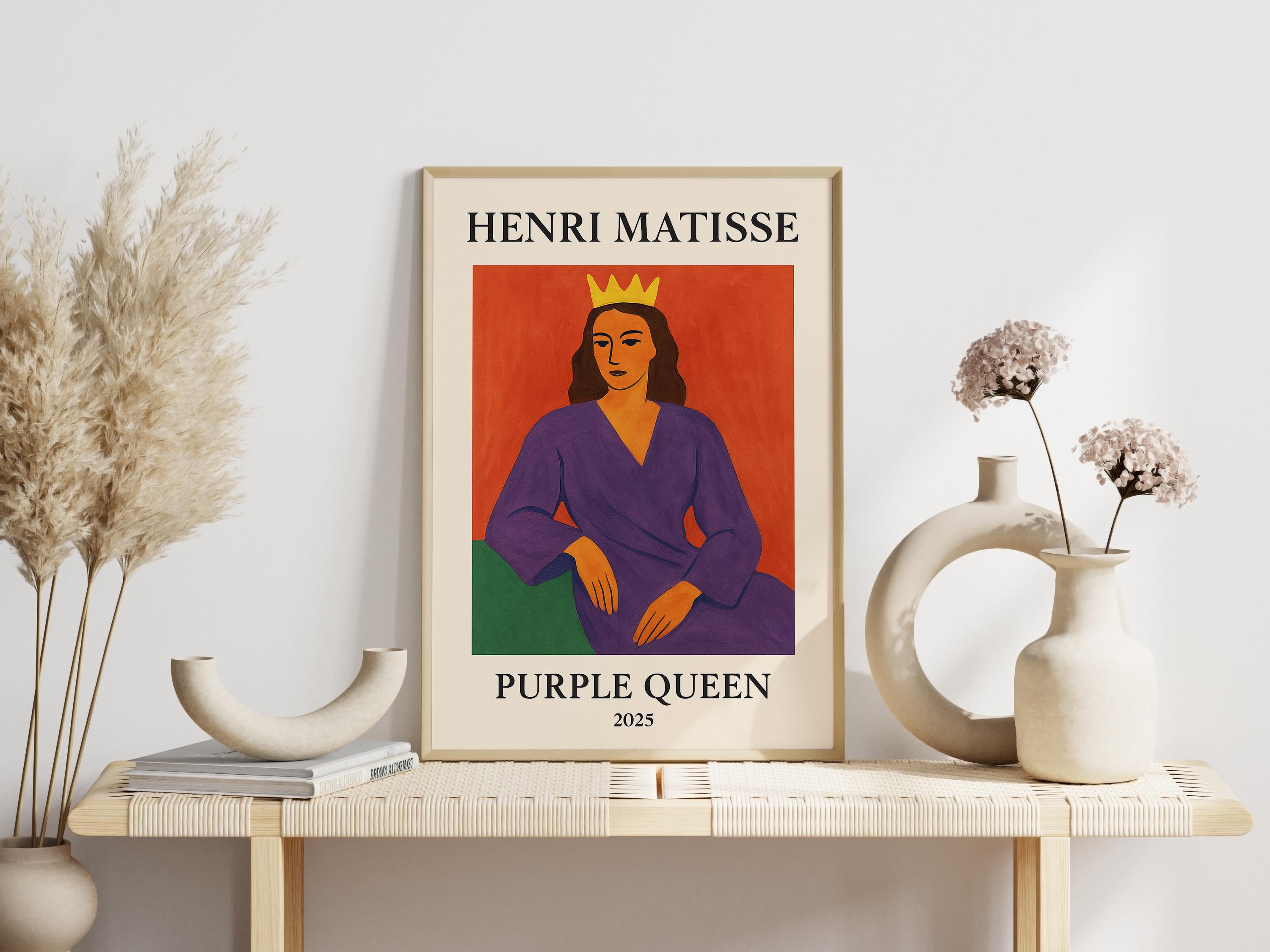 Purple Queen is an elegant Henri Matisse inspired poster print showcasing a regal female figure in rich purple hues. This abstract portrait exudes poise and sophistication, echoing the decorative beauty of Matisse's famous Odalisque paintings but with a chic contemporary twist. Deep violet tones and graceful lines bring mid-century modern elegance to your space, making this print a stunning focal point. It's a wonderful gift for fans of figurative art, fashionistas, or anyone who appreciates classic artistry with a modern edge. Display Purple Queen in a bedroom, dressing room, or living area to create an atmosphere of creativity and charm. For admirers of mid-century modern decor, this piece beautifully fuses timeless inspiration with contemporary style, enlivening your wall with artistic luxury.