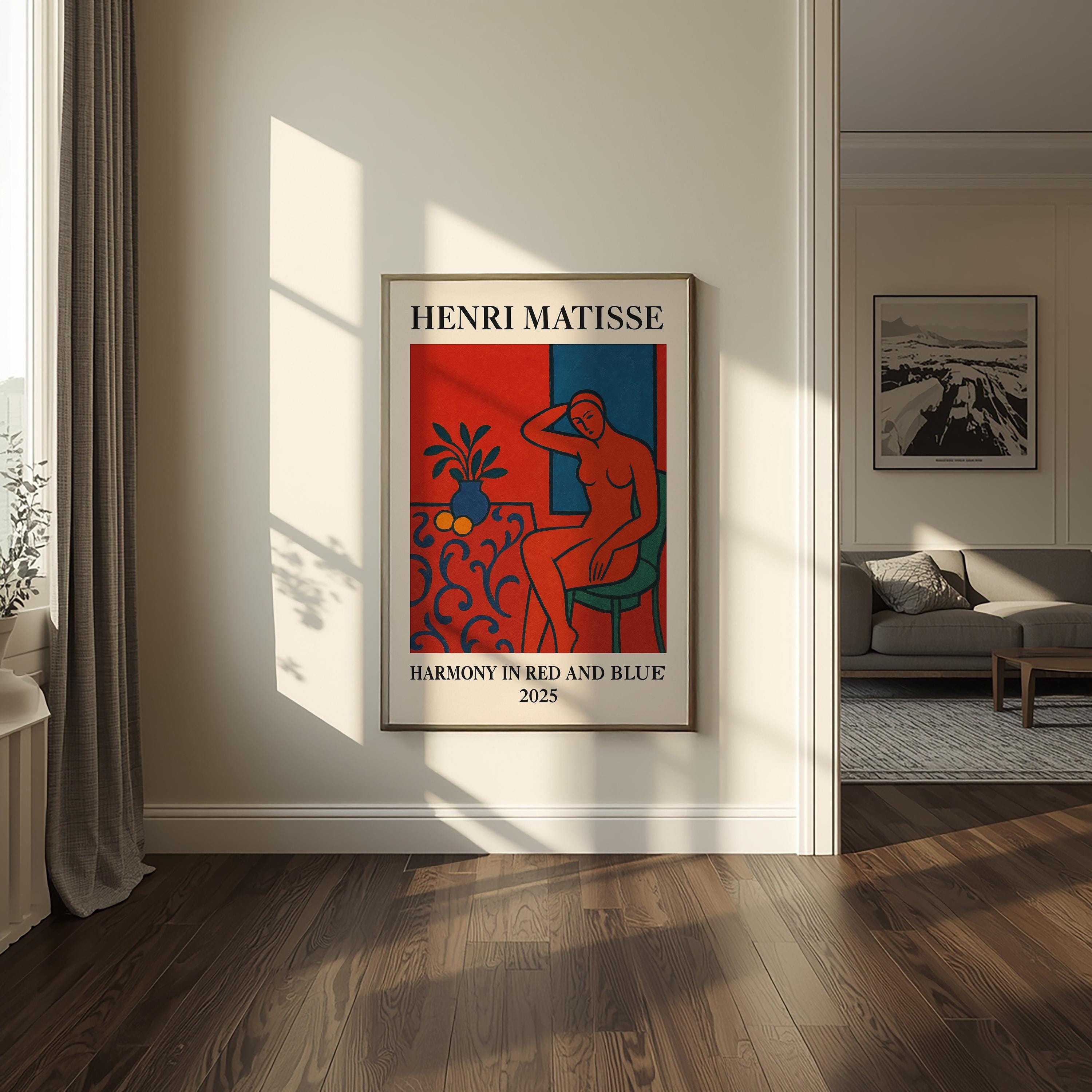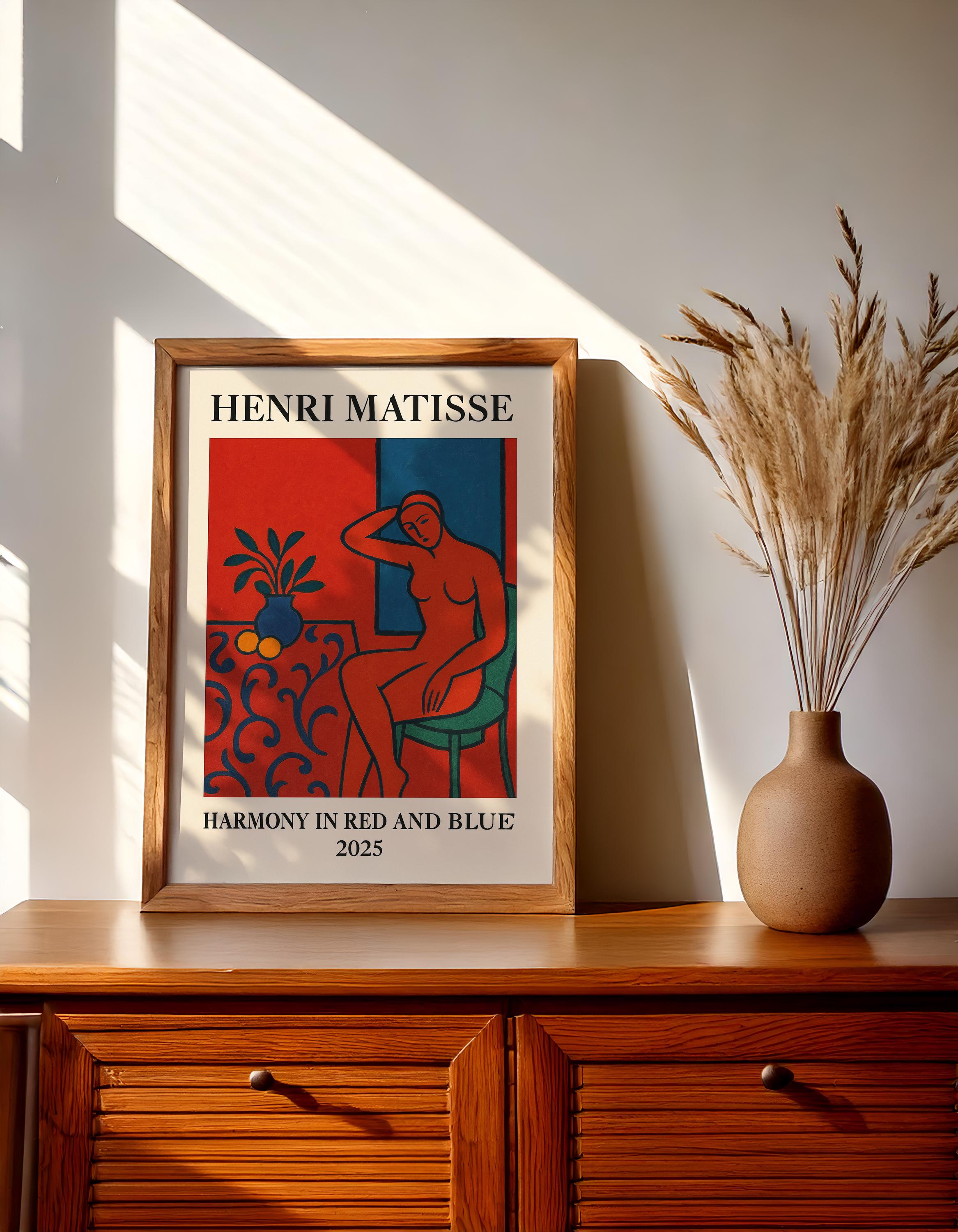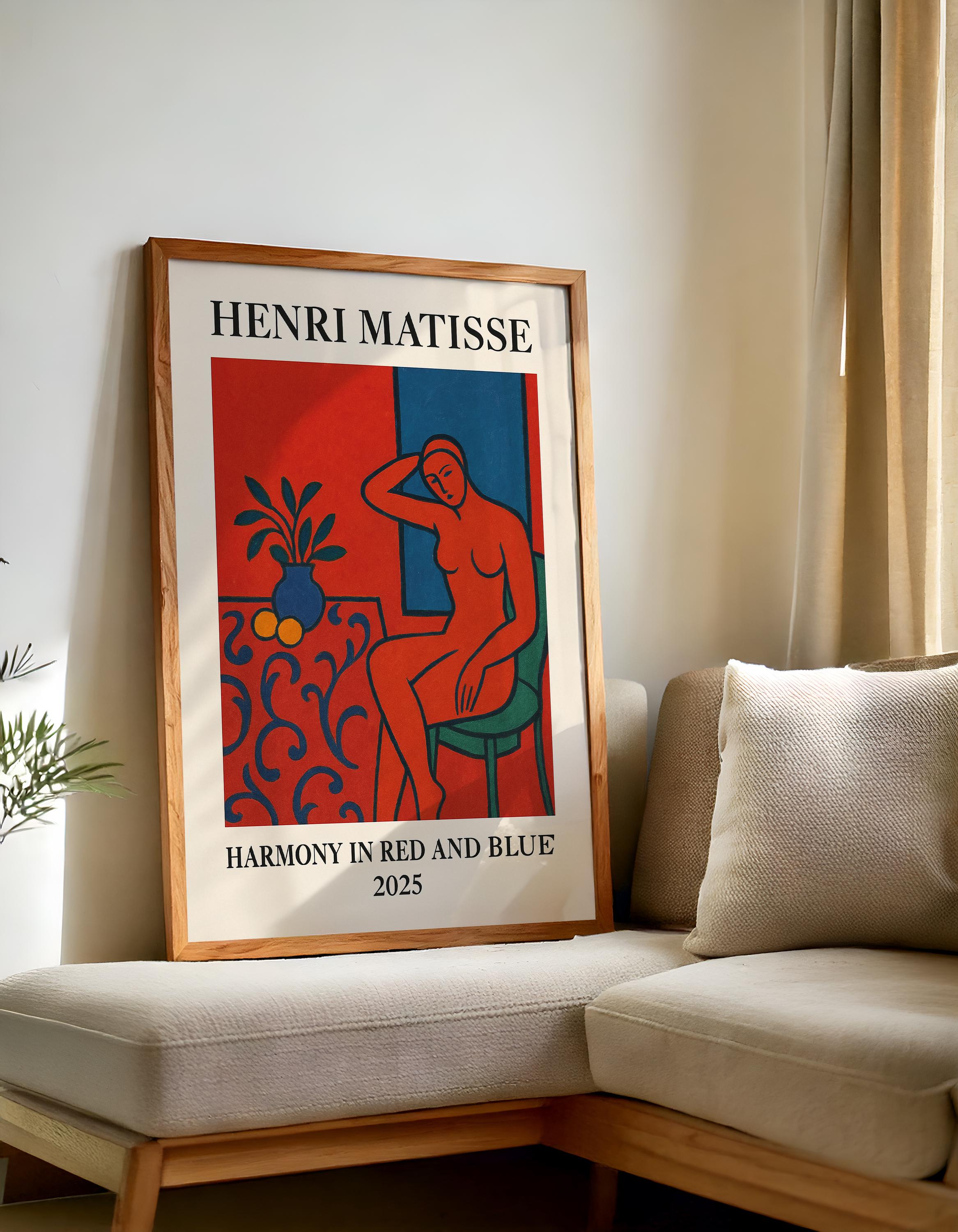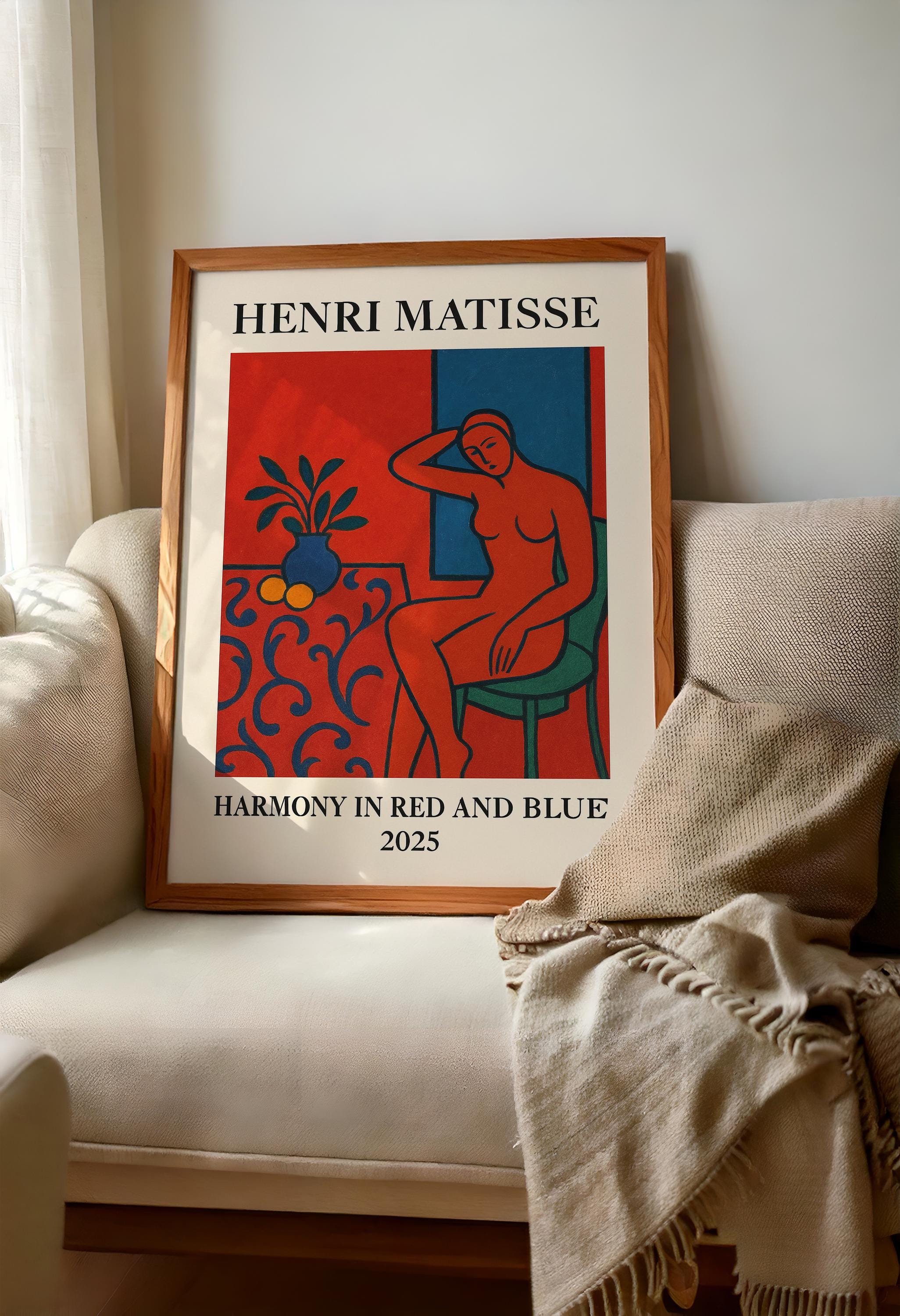 Harmony in Red and Blue is a striking Henri Matisse inspired poster print that reimagines the artist's love for bold interiors and color harmony. This design depicts a vibrant interior scene where rich reds and deep blues interplay, evoking the essence of Matisse's famous "Harmony in Red" painting but with a unique modern twist. The result is an eye-catching mid-century modern wall art piece that adds warmth and artistic flair to any decor. It's perfect for those who appreciate fauvist colors and abstract interiors – surprise an art-loving friend or new homeowner with this stylish statement piece. Hang Harmony in Red and Blue in a living room, dining area, or office to create a lively focal point that sparks conversation. Blending classic Matisse influence with contemporary design, this print will brighten your space with creative charm and timeless appeal.