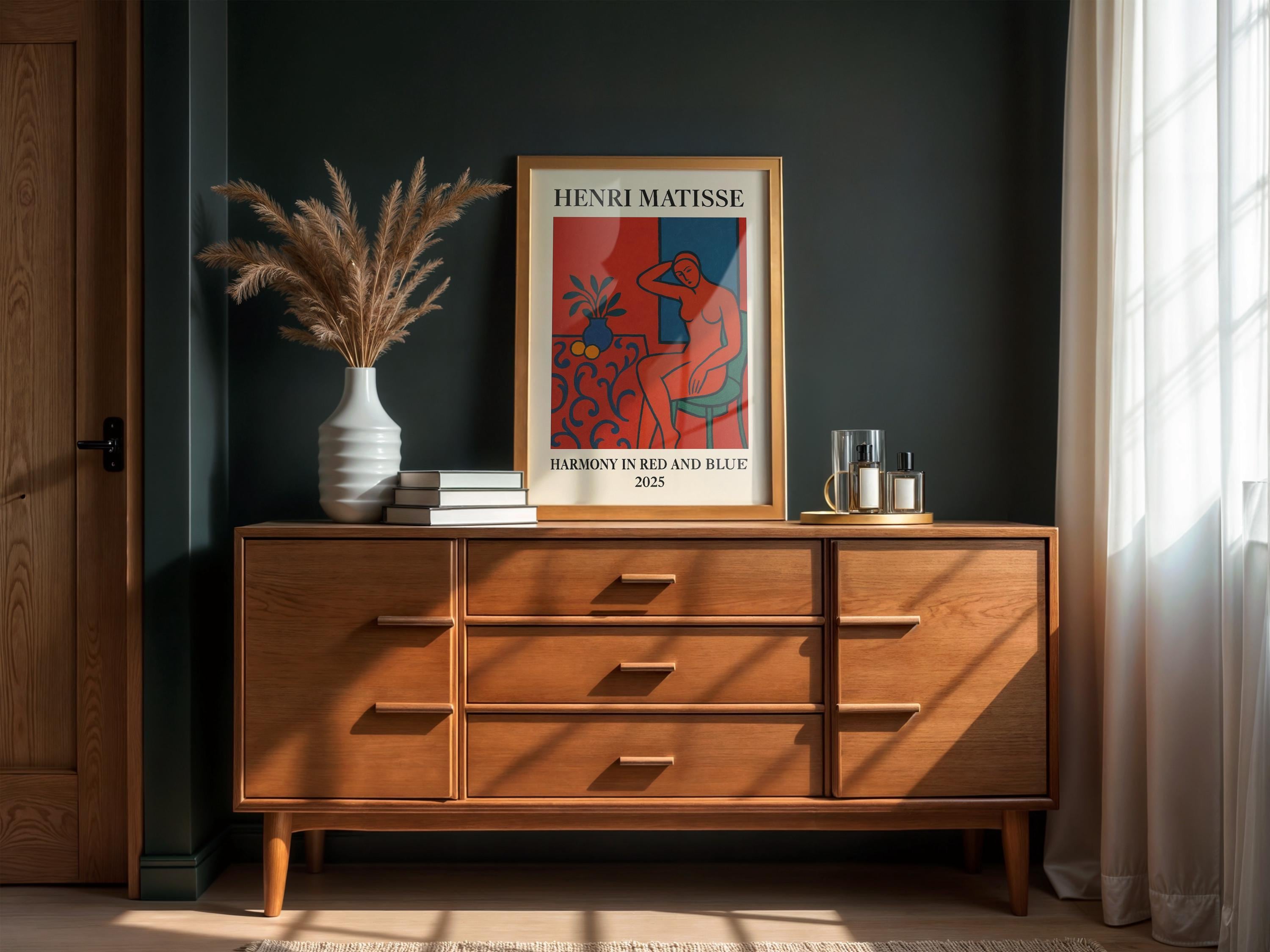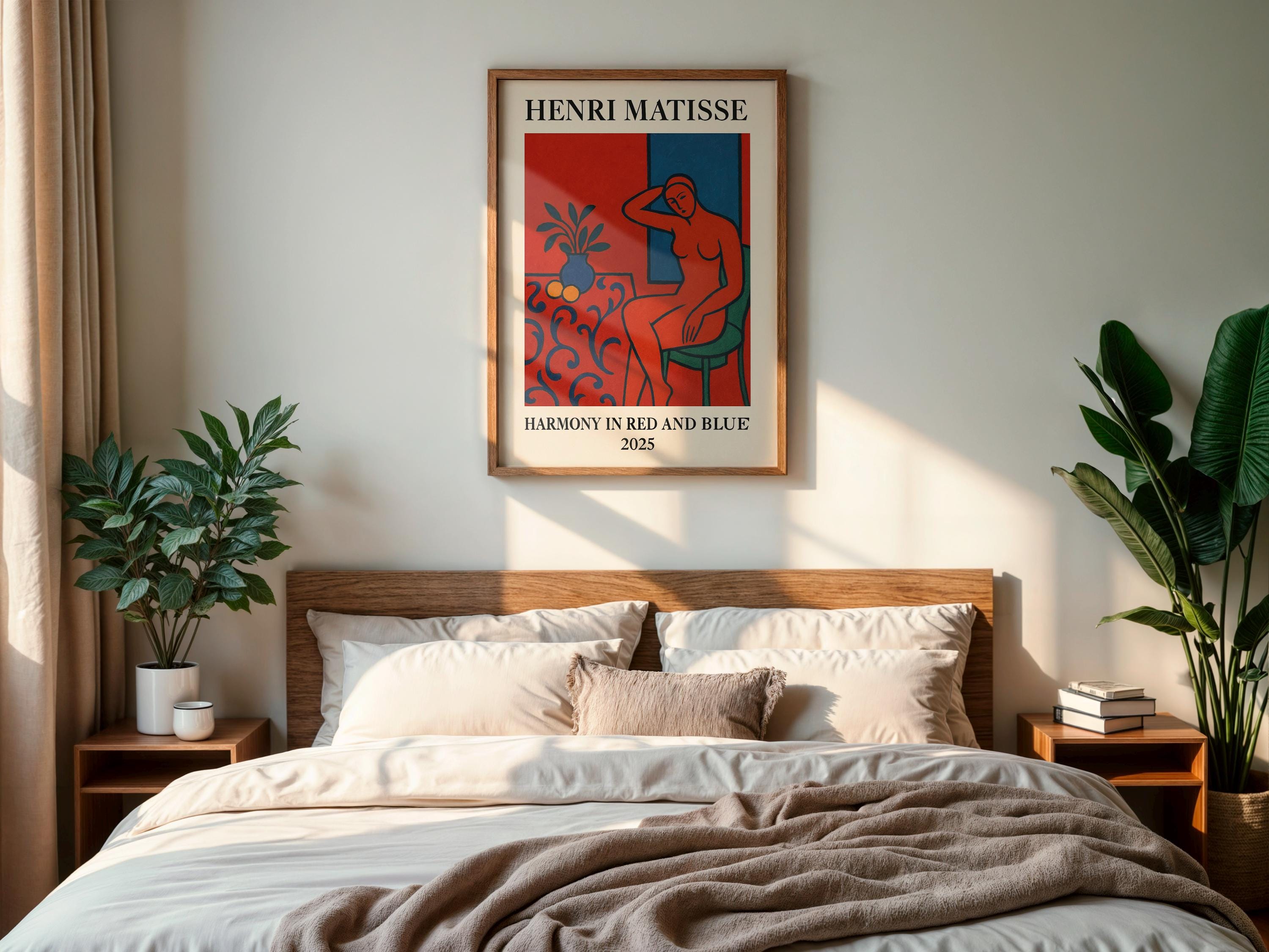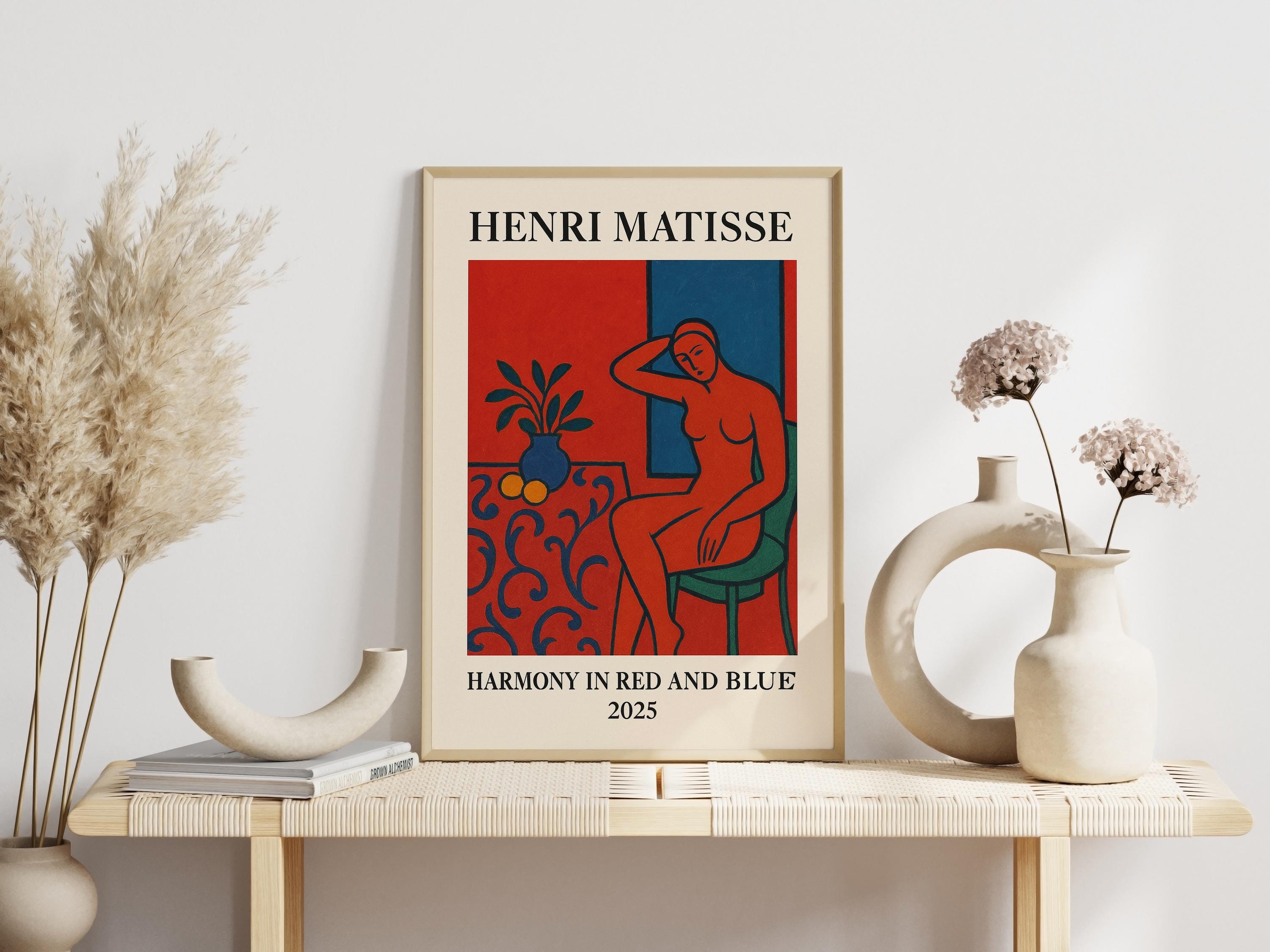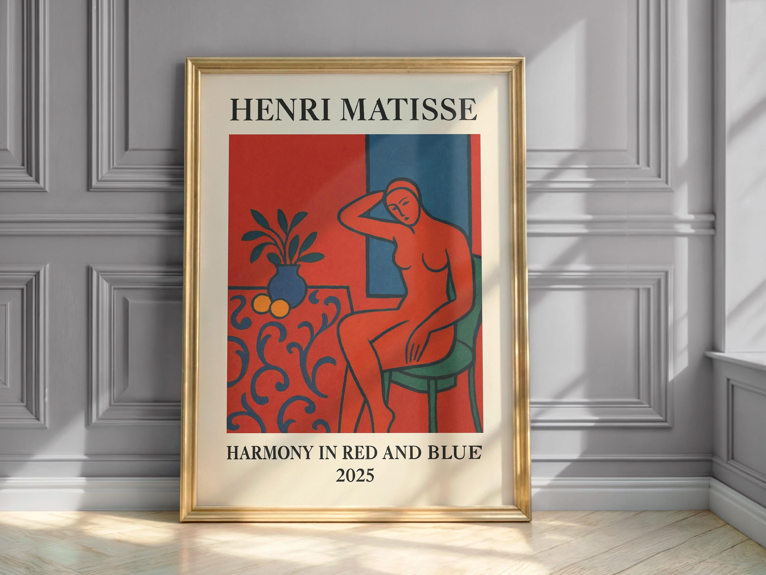 Harmony in Red and Blue is a striking Henri Matisse inspired poster print that reimagines the artist's love for bold interiors and color harmony. This design depicts a vibrant interior scene where rich reds and deep blues interplay, evoking the essence of Matisse's famous "Harmony in Red" painting but with a unique modern twist. The result is an eye-catching mid-century modern wall art piece that adds warmth and artistic flair to any decor. It's perfect for those who appreciate fauvist colors and abstract interiors – surprise an art-loving friend or new homeowner with this stylish statement piece. Hang Harmony in Red and Blue in a living room, dining area, or office to create a lively focal point that sparks conversation. Blending classic Matisse influence with contemporary design, this print will brighten your space with creative charm and timeless appeal.