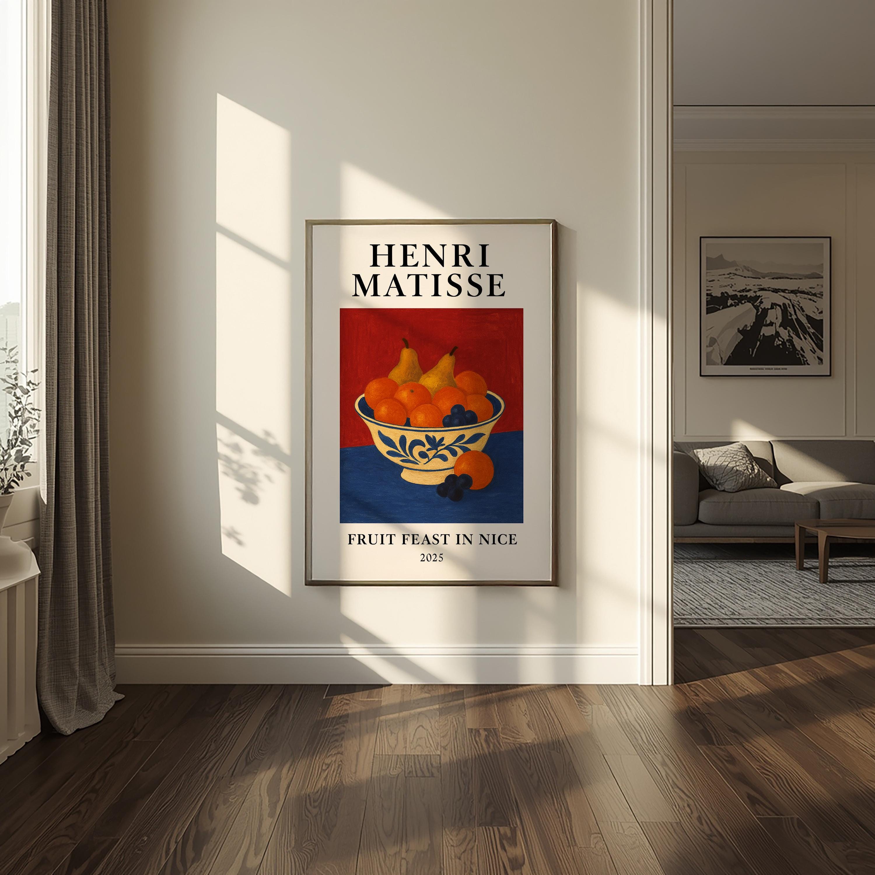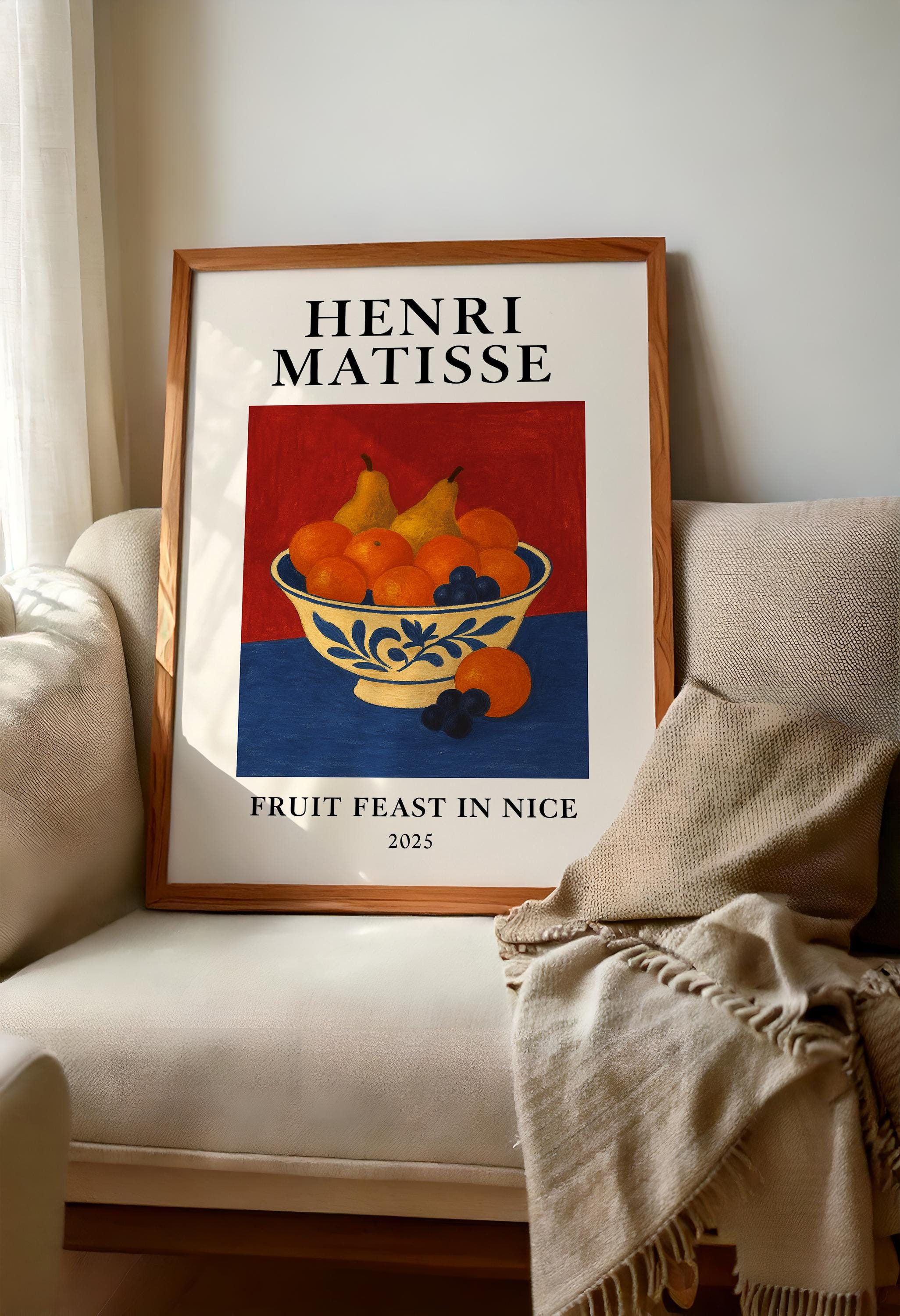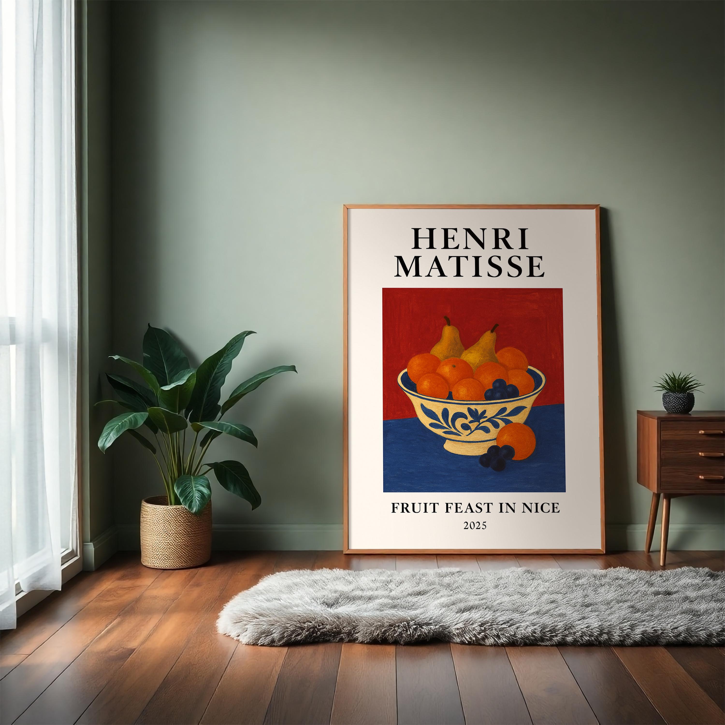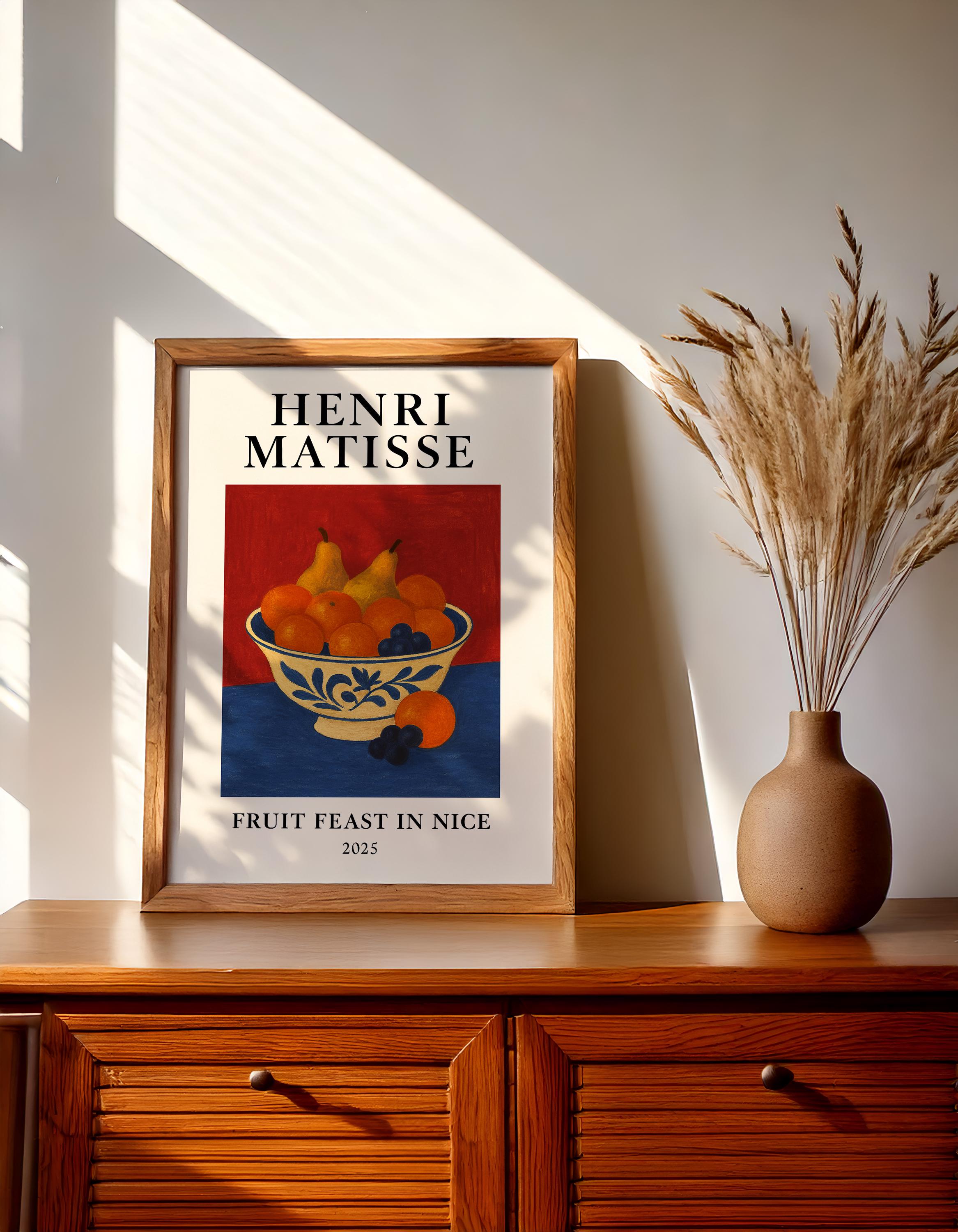 Fruit Feast in Nice is a delightful Henri Matisse inspired poster print portraying a vibrant still life scene. Overflowing with lush fruit and rich patterns, this artwork captures the sunny spirit of Matisse's Nice-period interiors in a fresh, mid-century modern way. The bold colors and playful composition add a cheerful touch to your decor, making it an ideal accent for a kitchen or dining space. Art enthusiasts and foodies alike will appreciate the charm of this piece – it’s a fantastic gift for housewarmings, chefs, or anyone who loves lively wall art. Hang Fruit Feast in Nice in your kitchen, dining room, or breakfast nook to infuse mealtime with a burst of color and creativity. Combining classic French art inspiration with modern flair, this print will brighten your home and spark joyful conversations around the table.