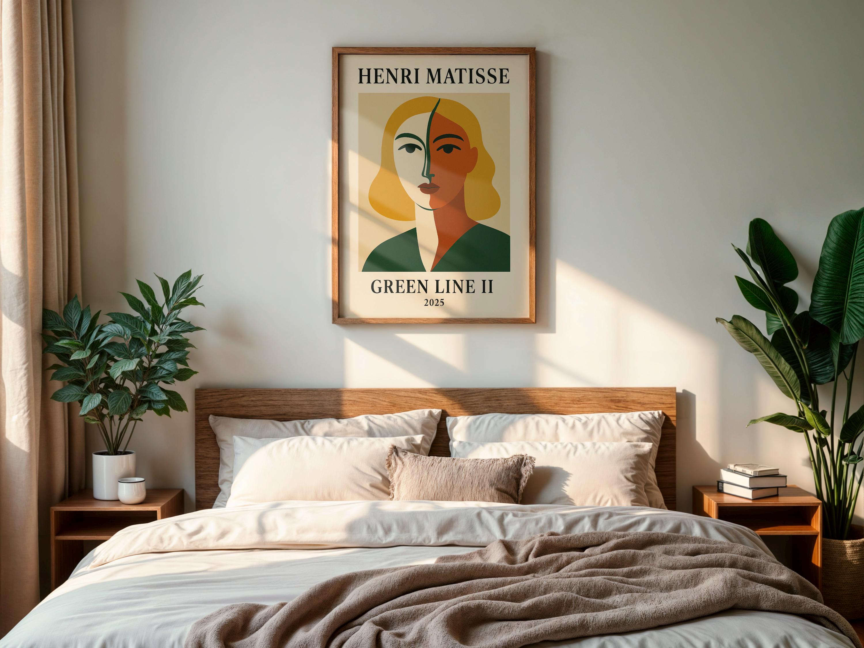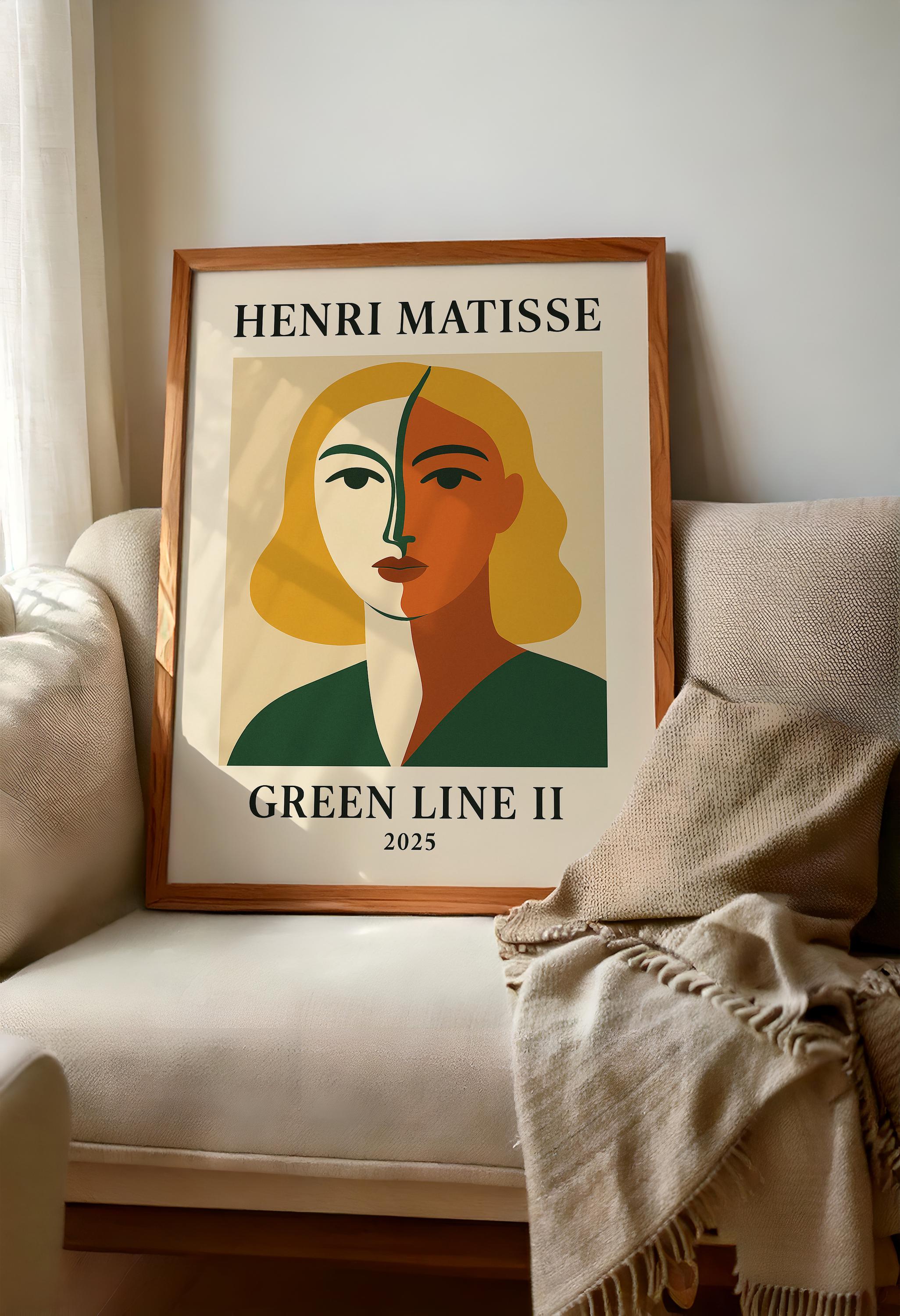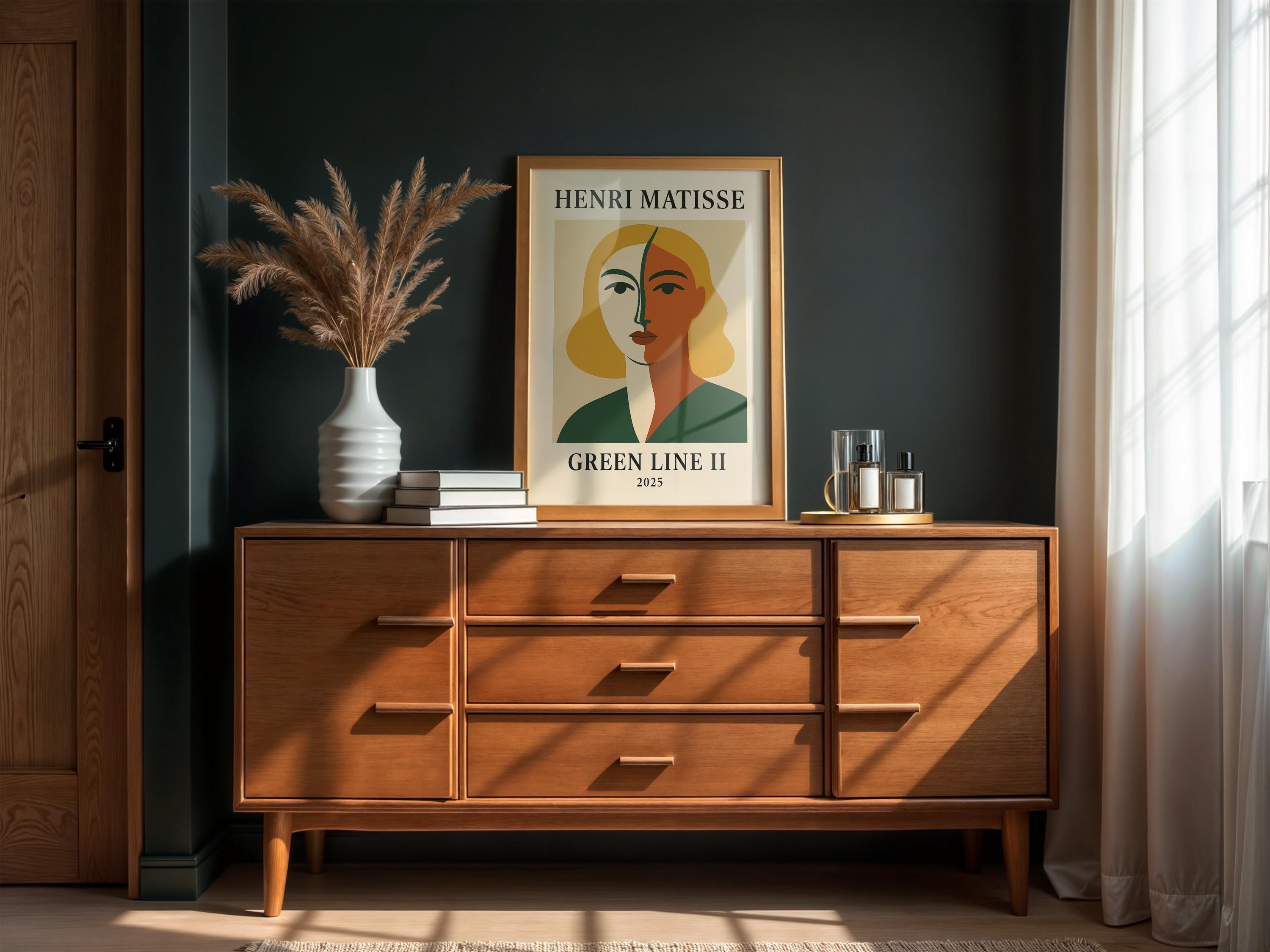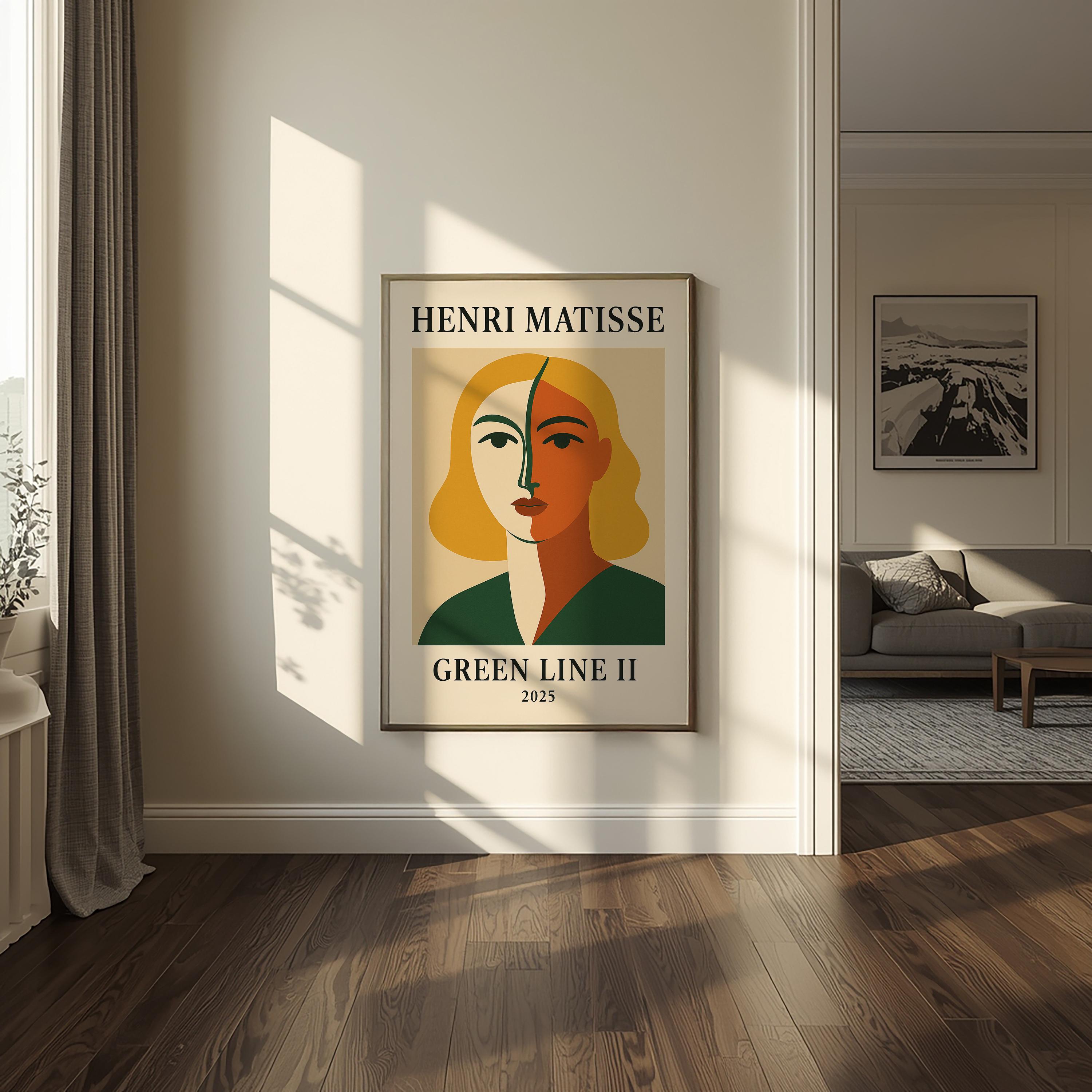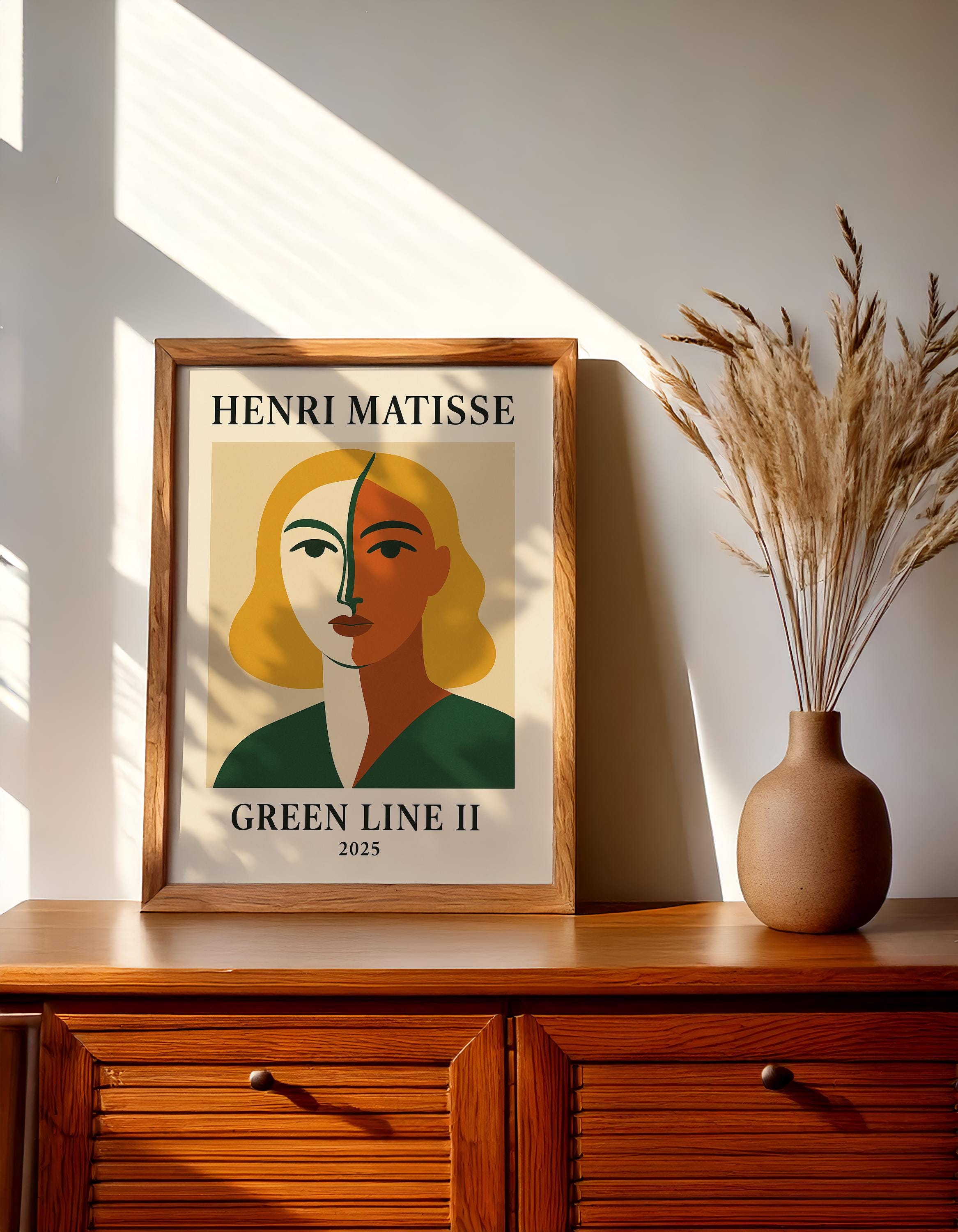 Green Line II is a bold Henri Matisse inspired poster print paying homage to the artist's iconic "Green Stripe" portrait of Madame Matisse. This modern reinterpretation features a striking face divided by a vivid green line, surrounded by vibrant complementary colors that capture the daring spirit of Fauvism. It's a dynamic mid-century modern wall art piece that brings character and artistic pedigree to any space. Art history enthusiasts and lovers of abstract portraits will appreciate the nod to a classic – it makes a thoughtful gift for modern art fans and anyone looking to brighten their decor with a touch of heritage. Hang Green Line II in a living room, office, or studio to instantly enliven the atmosphere. The distinctive design and rich palette are sure to spark conversations, showcasing your appreciation for Henri Matisse's art in a contemporary form.