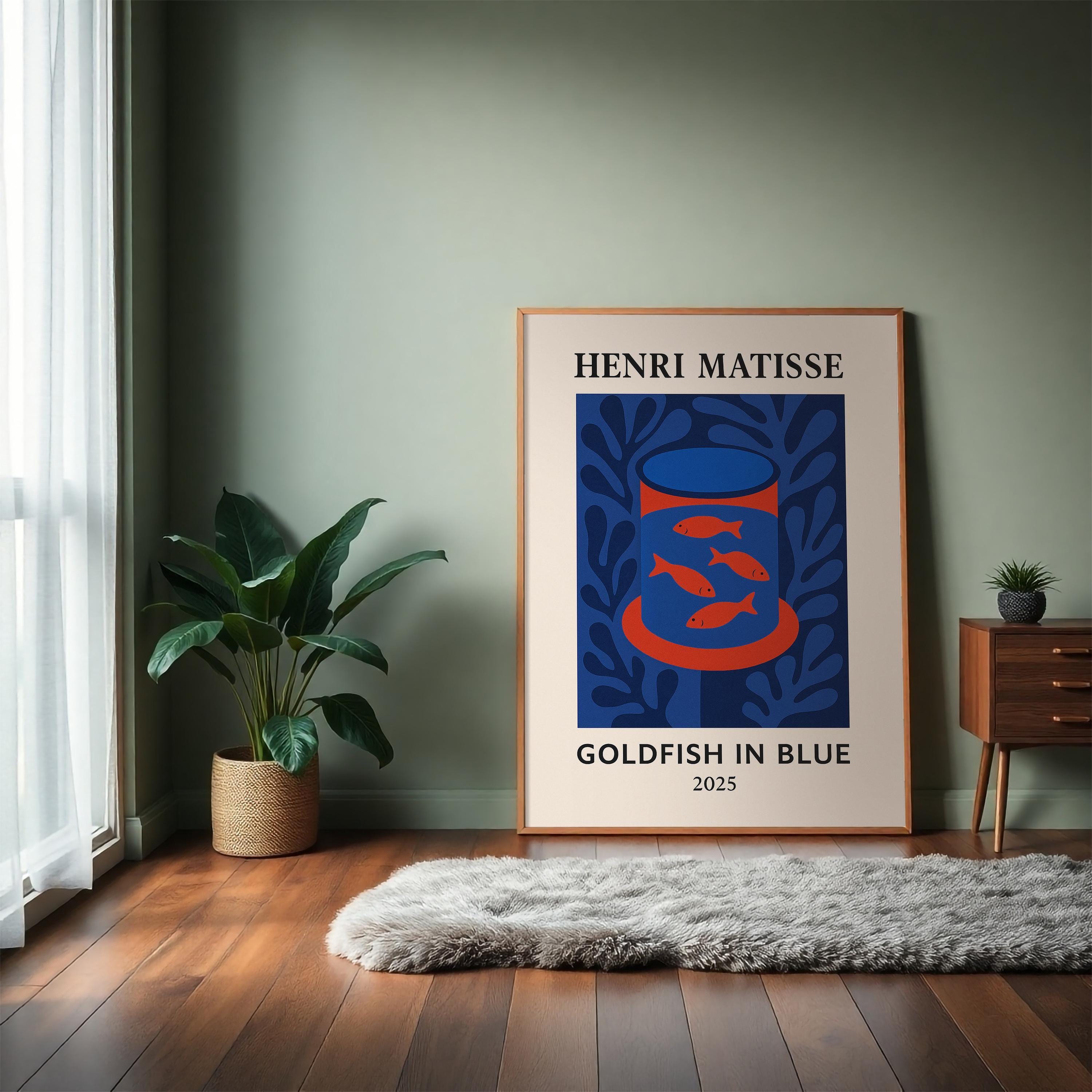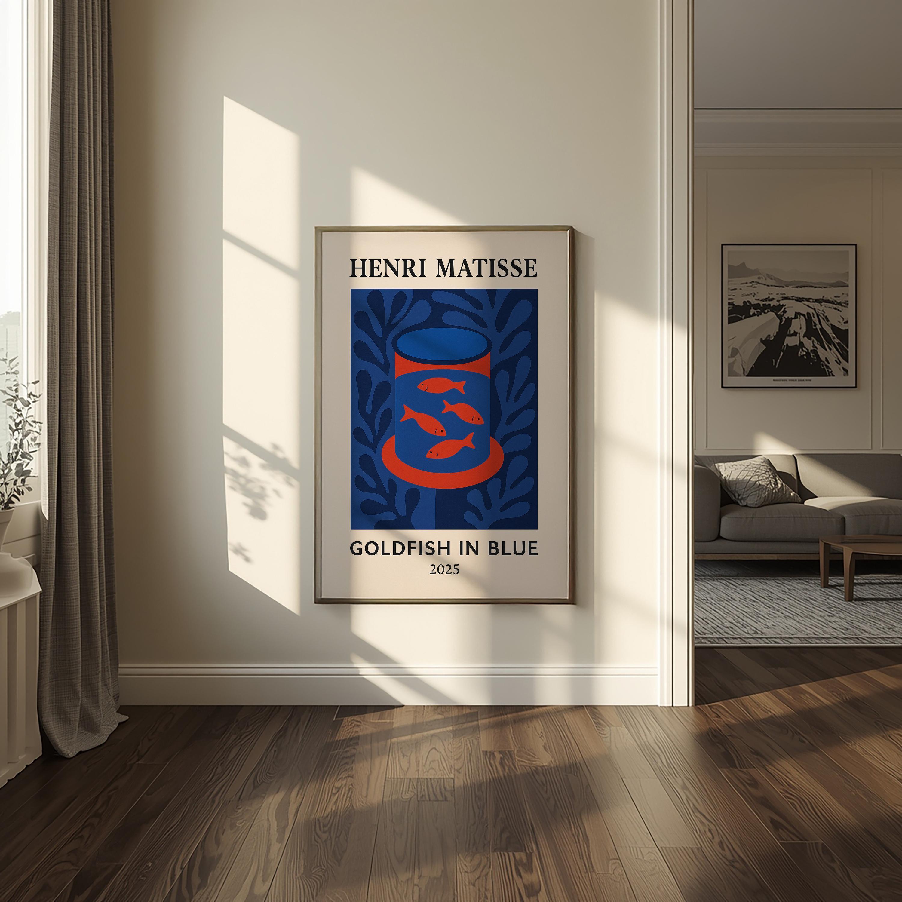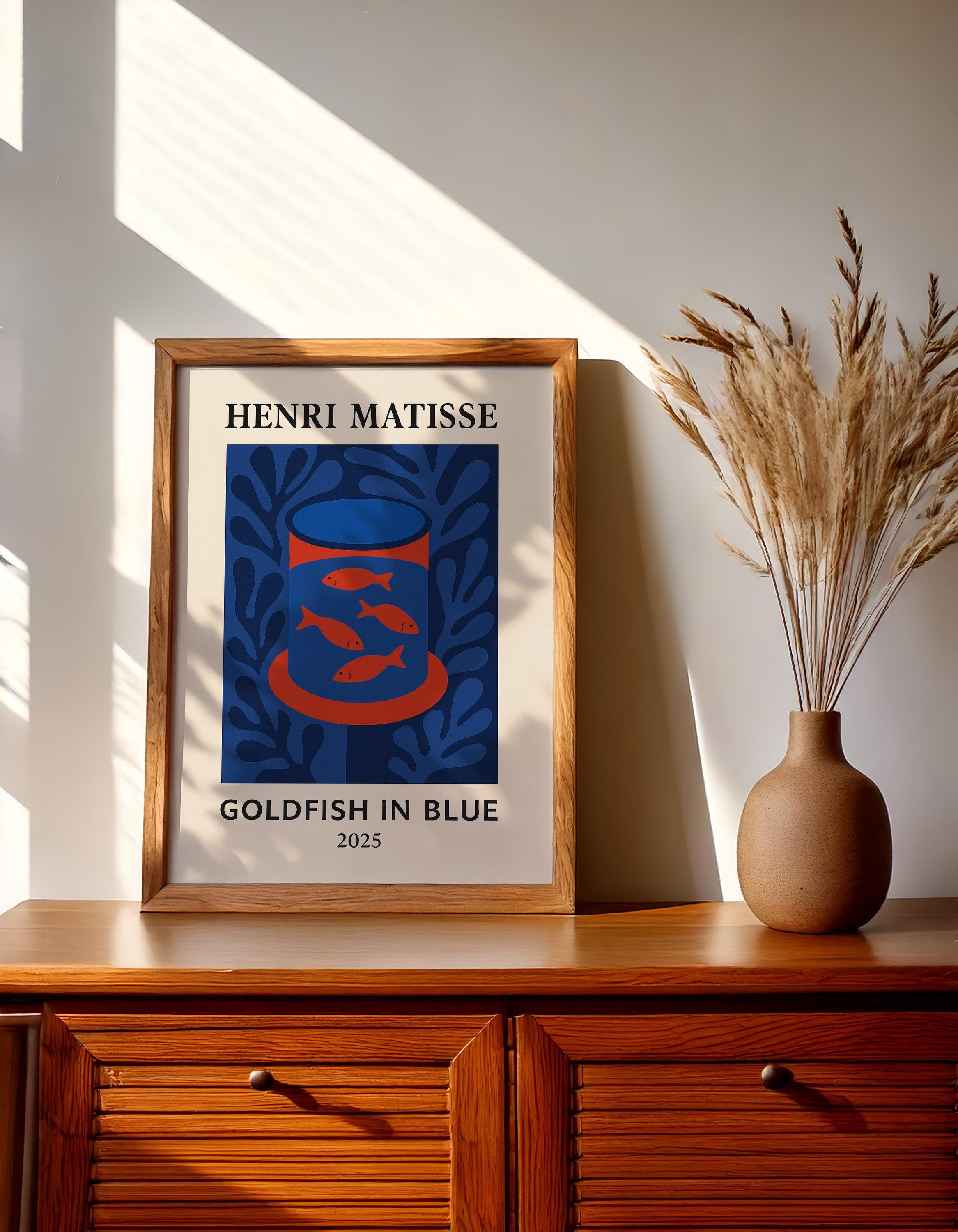 Goldfish in Blue is a serene Henri Matisse inspired poster print featuring a bowl of golden fish against cool blue tones. Reimagining Matisse's beloved goldfish paintings with a modern abstract twist, it uses bold shapes and vibrant contrasts to create a calming yet eye-catching mid-century modern art piece. The tranquil blues and pops of orange bring a sense of peace and balance, making it perfect for a living room, office, or study. Art lovers and even aquarium enthusiasts will appreciate this charming print – it makes a unique gift to brighten someone's day or celebrate a new space. Hang Goldfish in Blue in an office or reading nook to inspire calm creativity, or in a kitchen or bathroom for a splash of color. Its Matisse-inspired whimsy and soothing palette will enrich your decor with a touch of artistic relaxation.