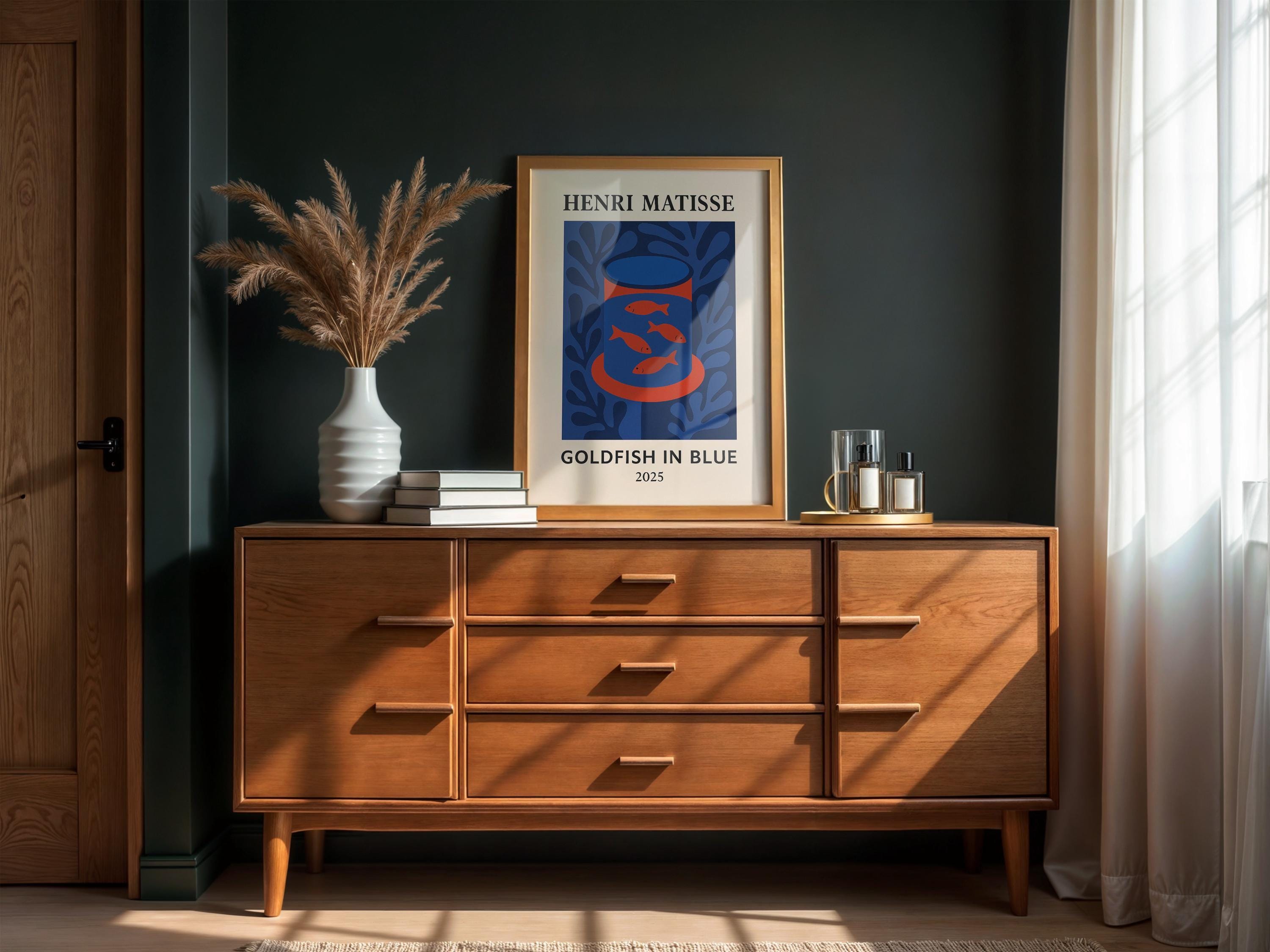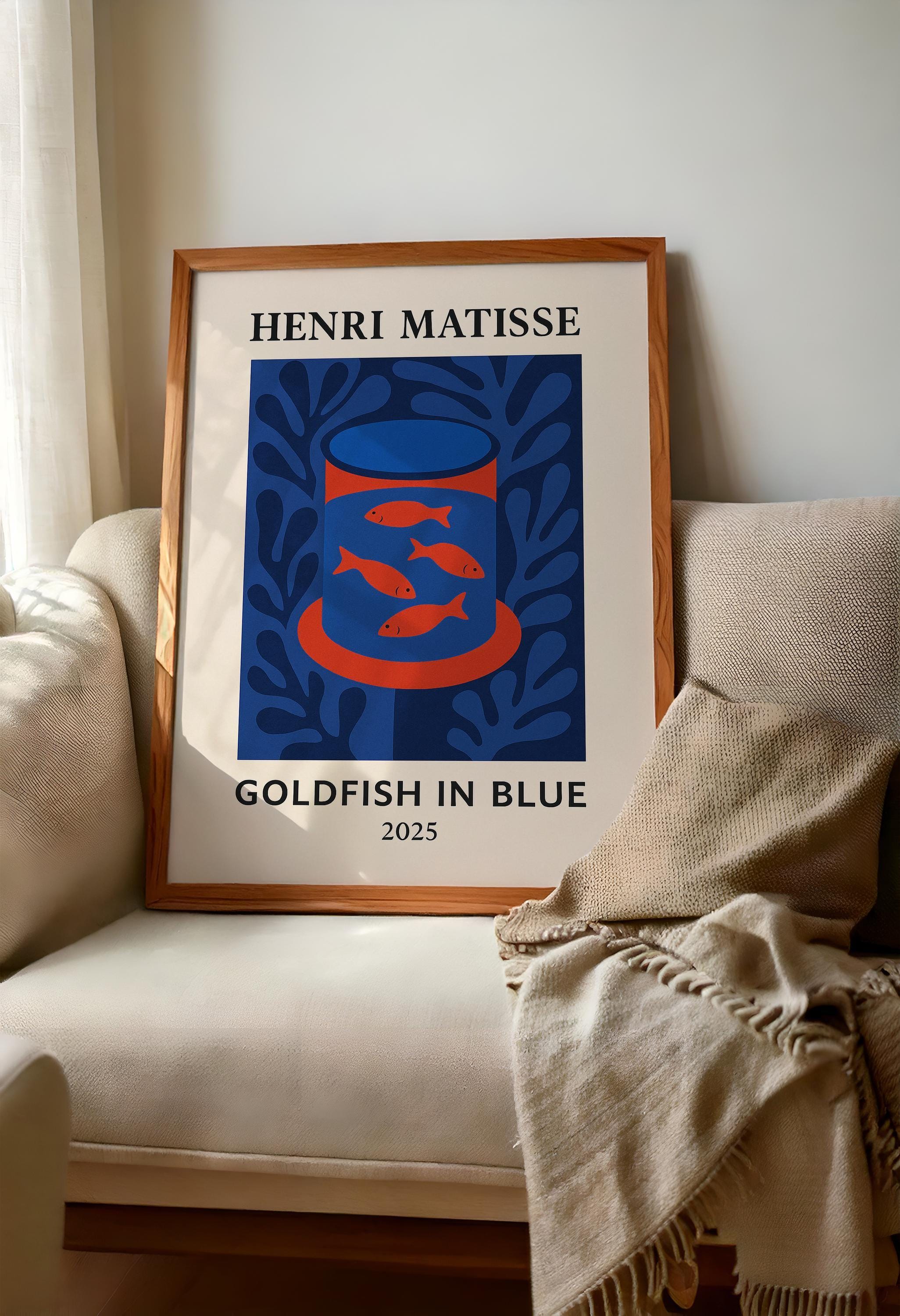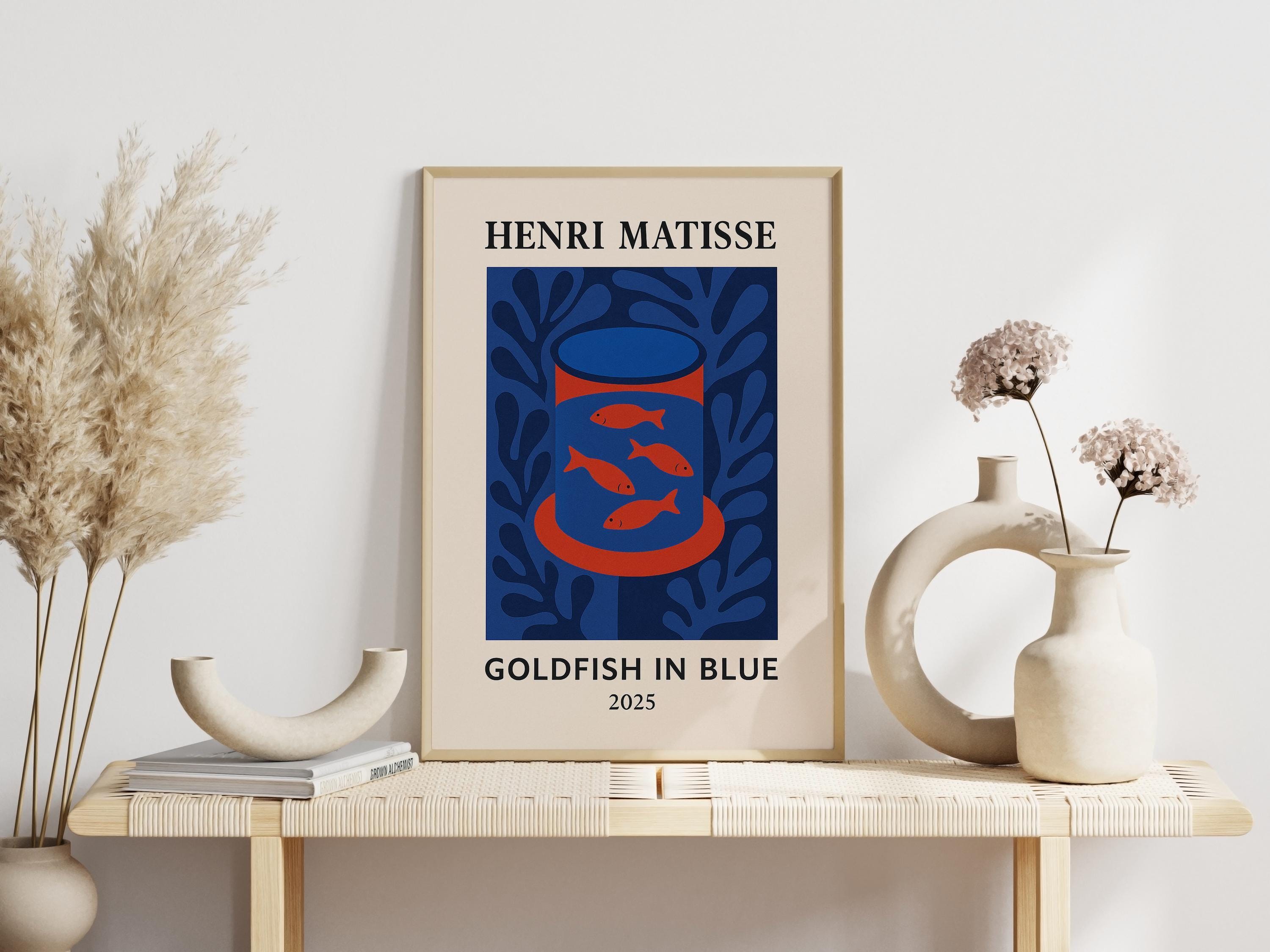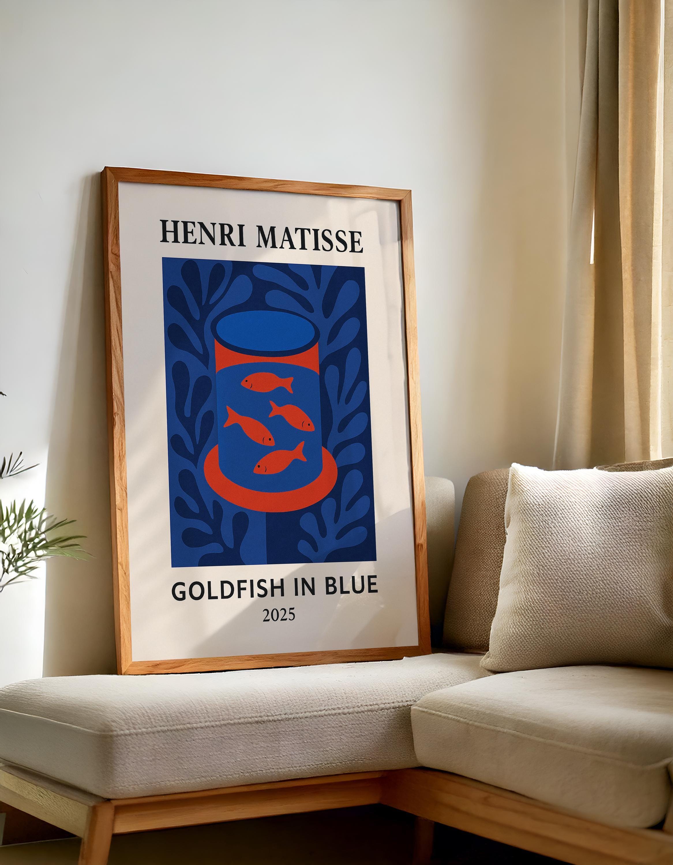 Goldfish in Blue is a serene Henri Matisse inspired poster print featuring a bowl of golden fish against cool blue tones. Reimagining Matisse's beloved goldfish paintings with a modern abstract twist, it uses bold shapes and vibrant contrasts to create a calming yet eye-catching mid-century modern art piece. The tranquil blues and pops of orange bring a sense of peace and balance, making it perfect for a living room, office, or study. Art lovers and even aquarium enthusiasts will appreciate this charming print – it makes a unique gift to brighten someone's day or celebrate a new space. Hang Goldfish in Blue in an office or reading nook to inspire calm creativity, or in a kitchen or bathroom for a splash of color. Its Matisse-inspired whimsy and soothing palette will enrich your decor with a touch of artistic relaxation.