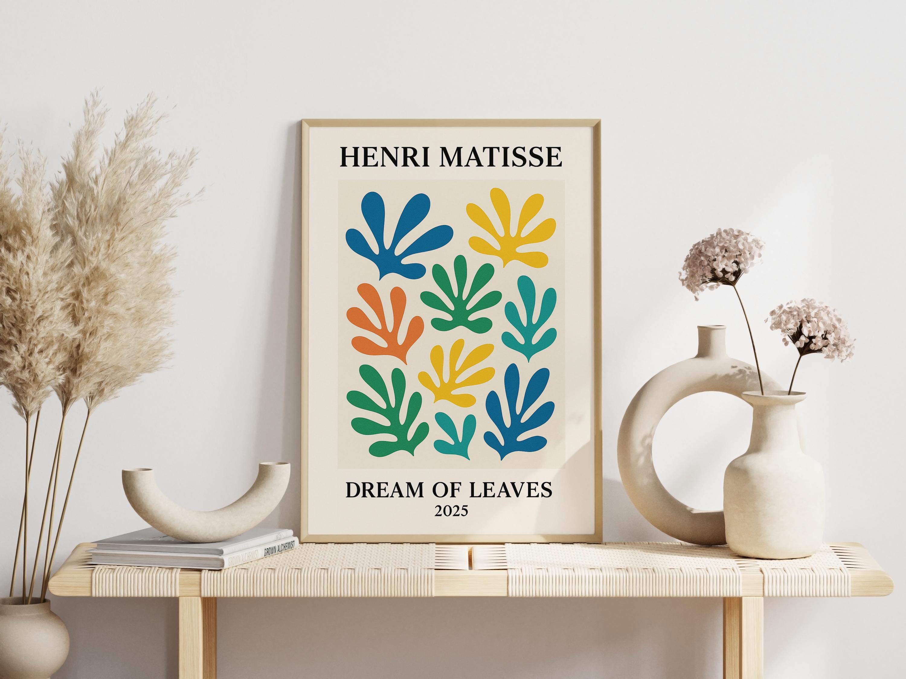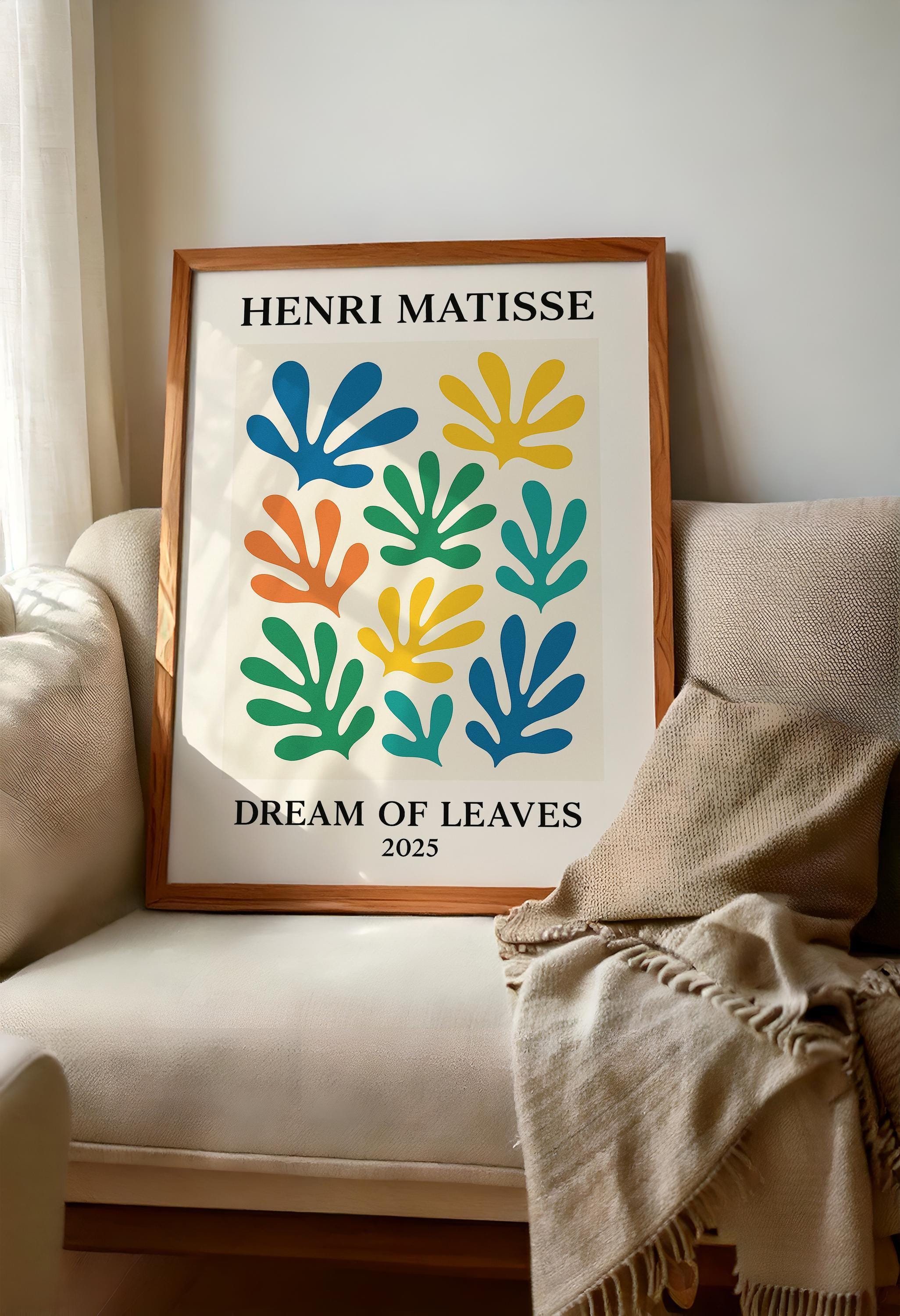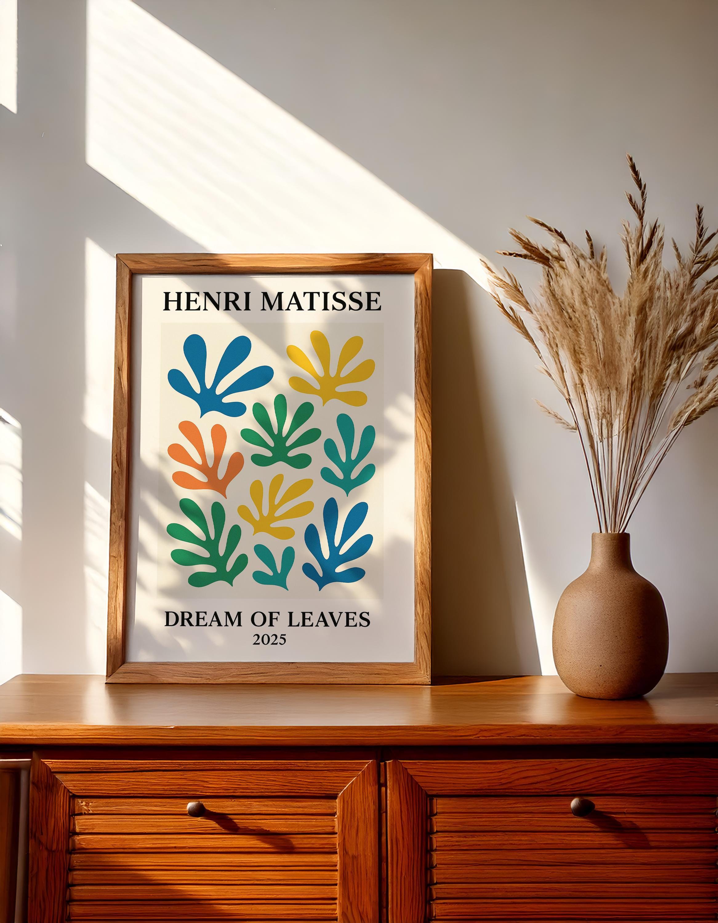 Dream of Leaves is a soothing Henri Matisse inspired poster print featuring an array of floating abstract leaves in soft, dreamy colors. Drawing from Matisse's iconic leaf cut-outs (like "La Gerbe"), it arranges organic shapes into a harmonious composition that brings nature's calm into a mid-century modern art form. The gentle greens, blues, and earthy tones of this print create a relaxing vibe, perfect for cultivating a tranquil corner in your home. It's a lovely gift for botanical art fans, yoga or meditation spaces, or anyone who wants to add a touch of nature-inspired serenity to their decor. Place Dream of Leaves in a bedroom, reading nook, or home office to enjoy its calming effect. The Matisse-inspired foliage motif and balanced design will breathe life and style into your space while soothing the senses.