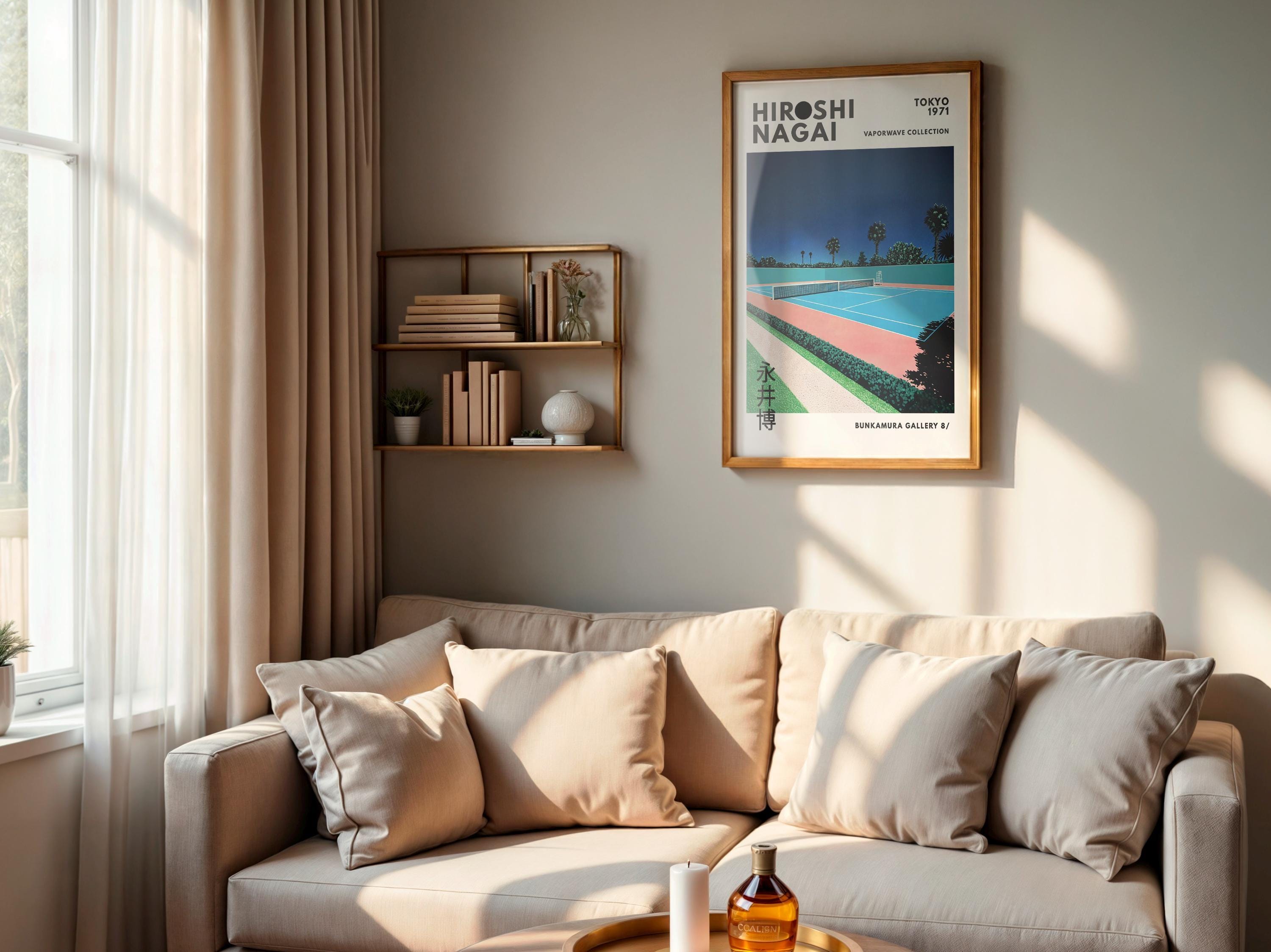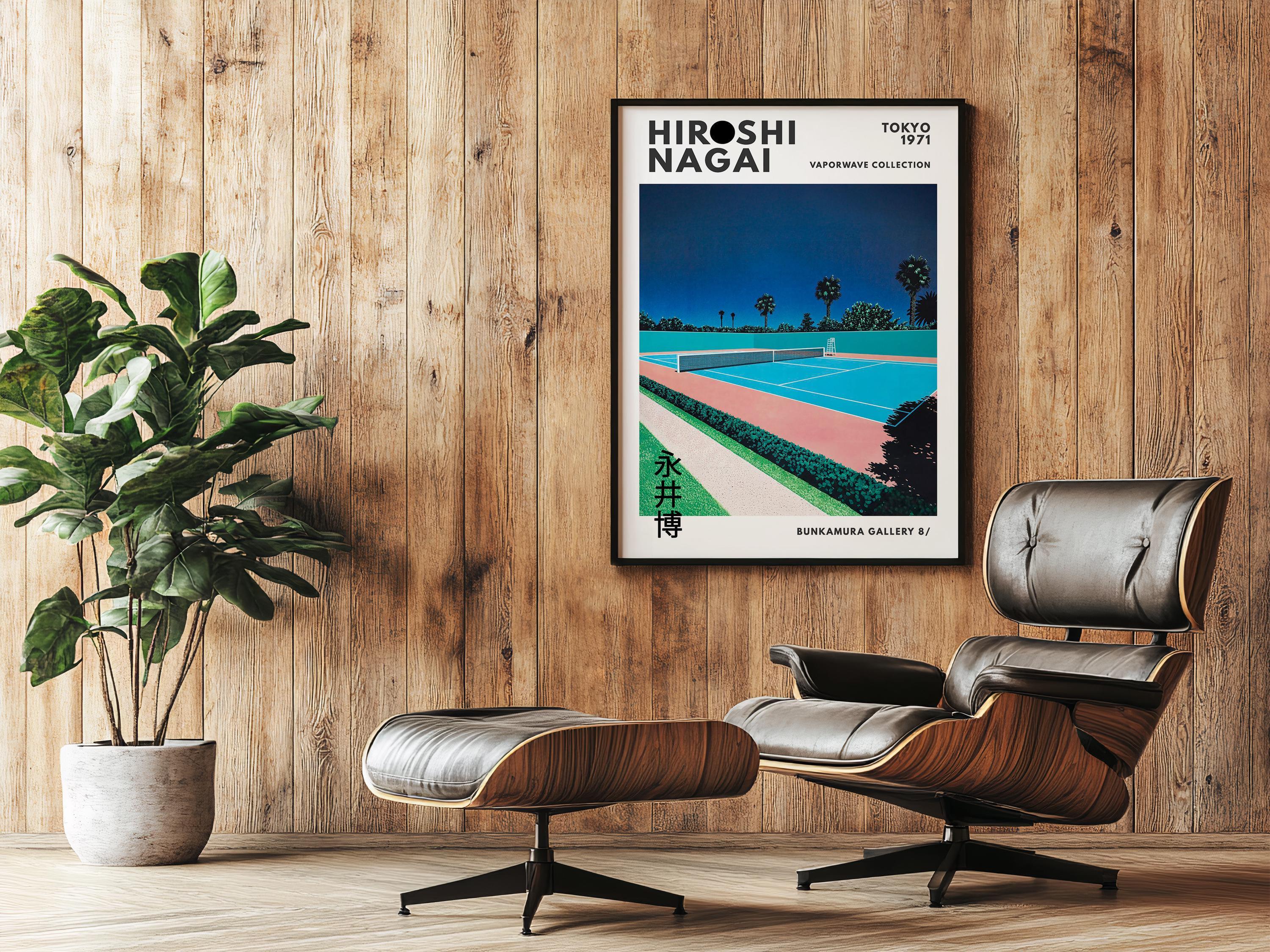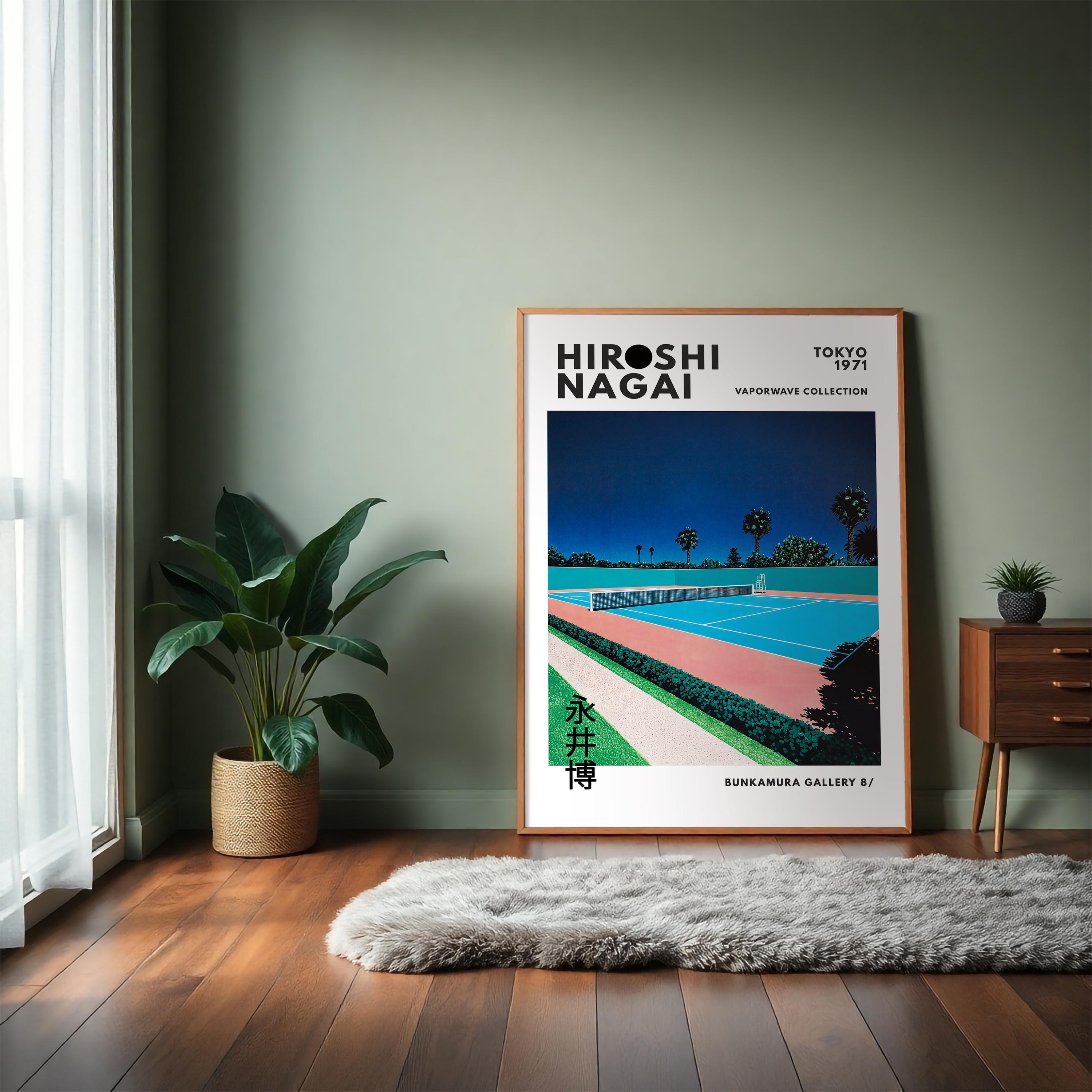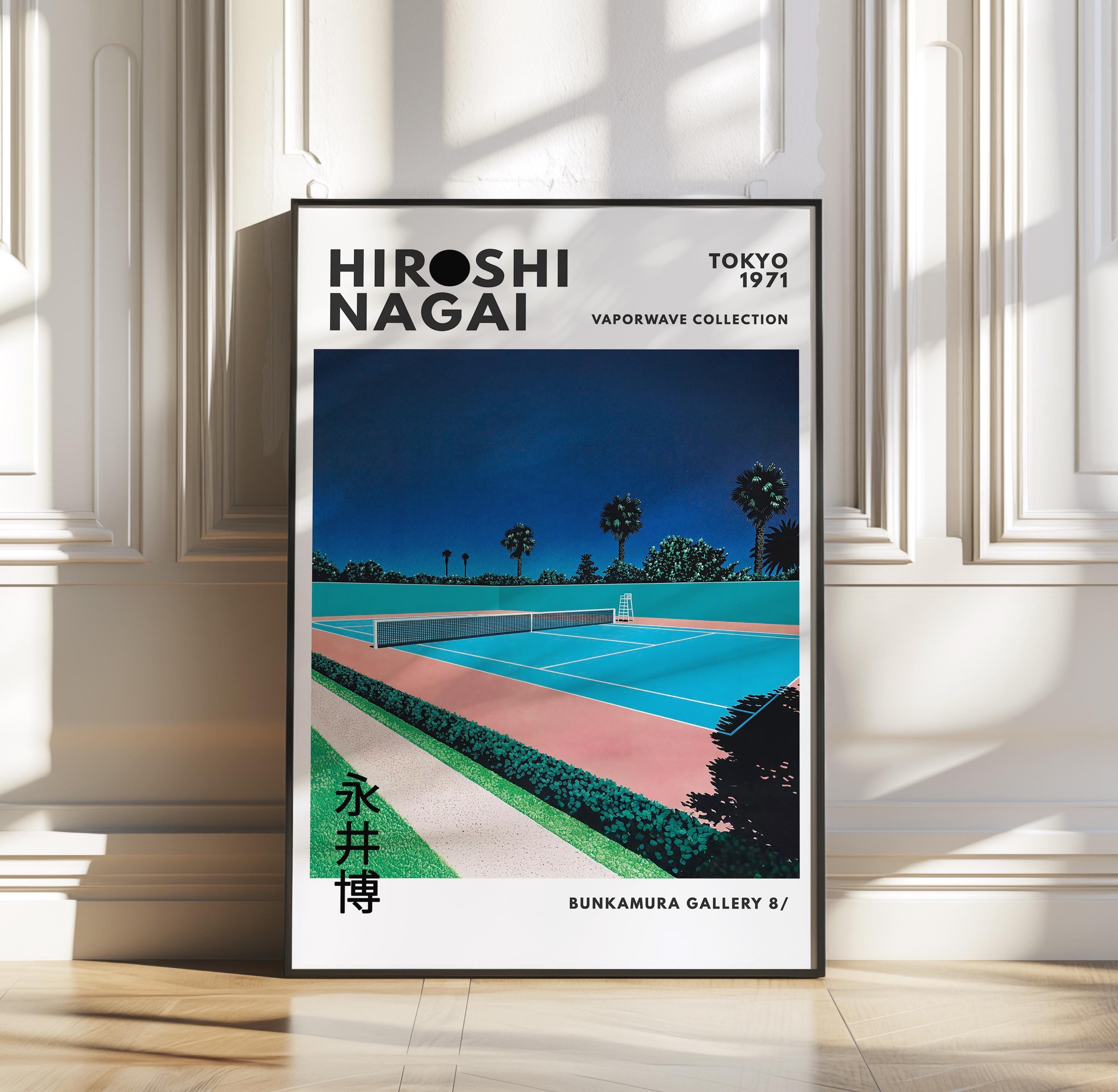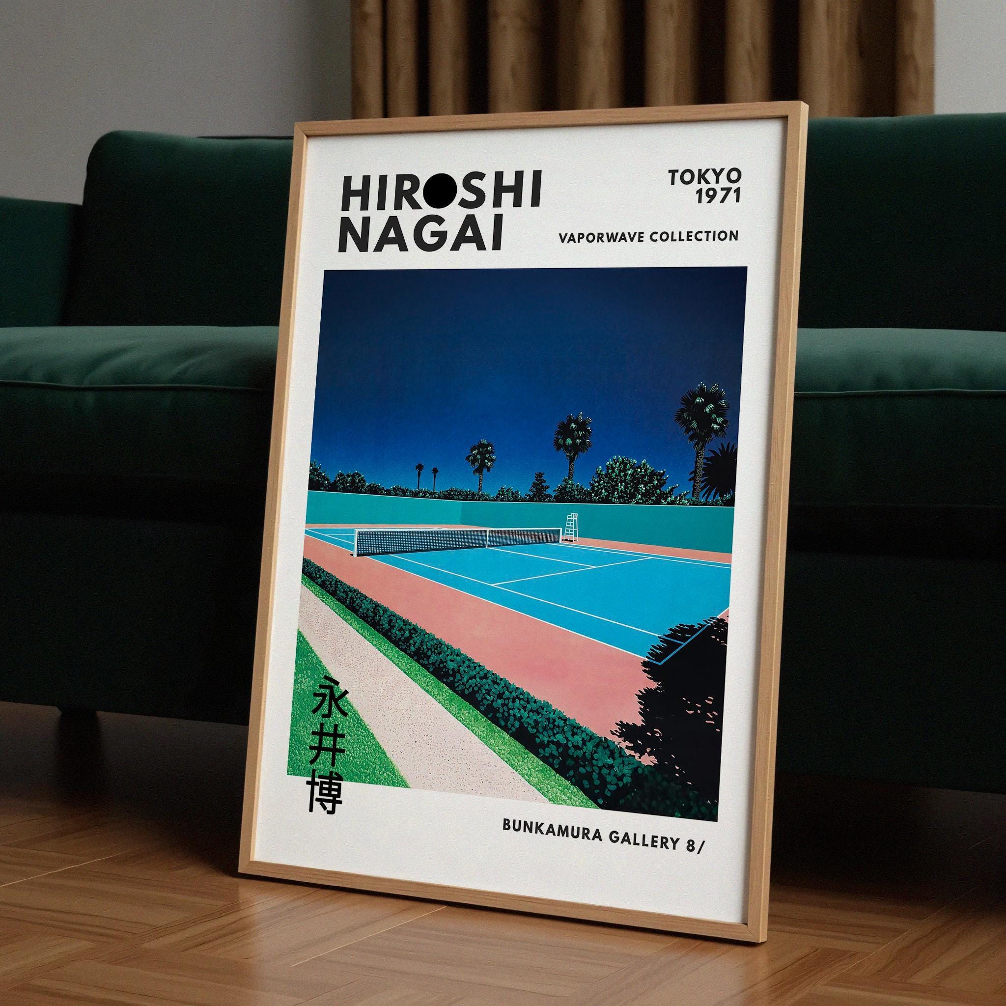 Minimalist Japanese art print with retro wall art energy, city pop vibe and vaporwave palette—tennis court symmetry, crisp lines and vintage poster calm in a sunlit 80s mood; an original Hiroshi Nagai piece from his iconic era.
