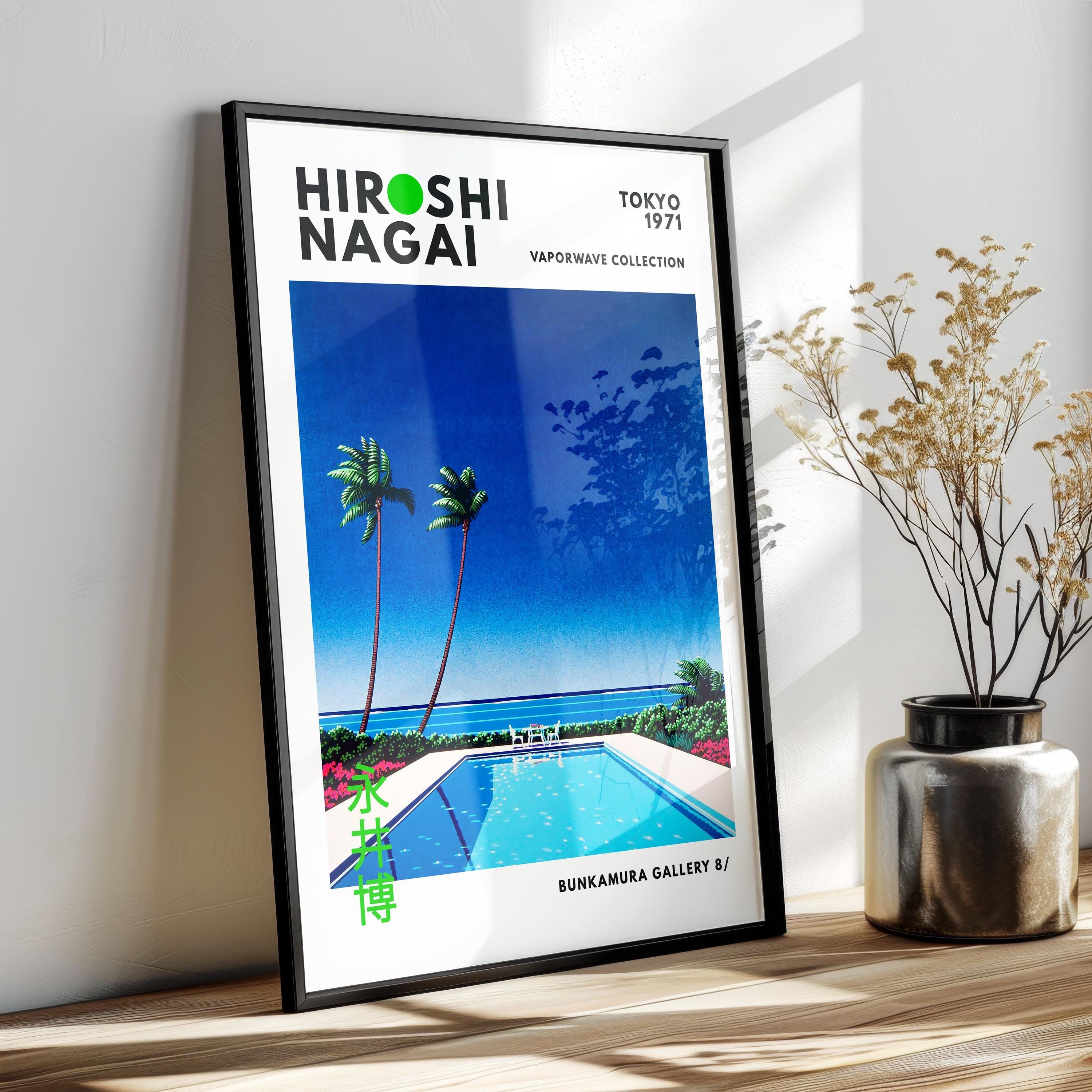Minimalist Japanese art print with retro wall art flair, city pop vibe and vaporwave palette—watermelon-red accents, turquoise pool planes and crisp palm silhouettes in a refined 80s resort mood. Clean geometry, saturated sky and precise shadows shape a playful yet elegant coastal scene; an original Hiroshi Nagai work from his iconic era.