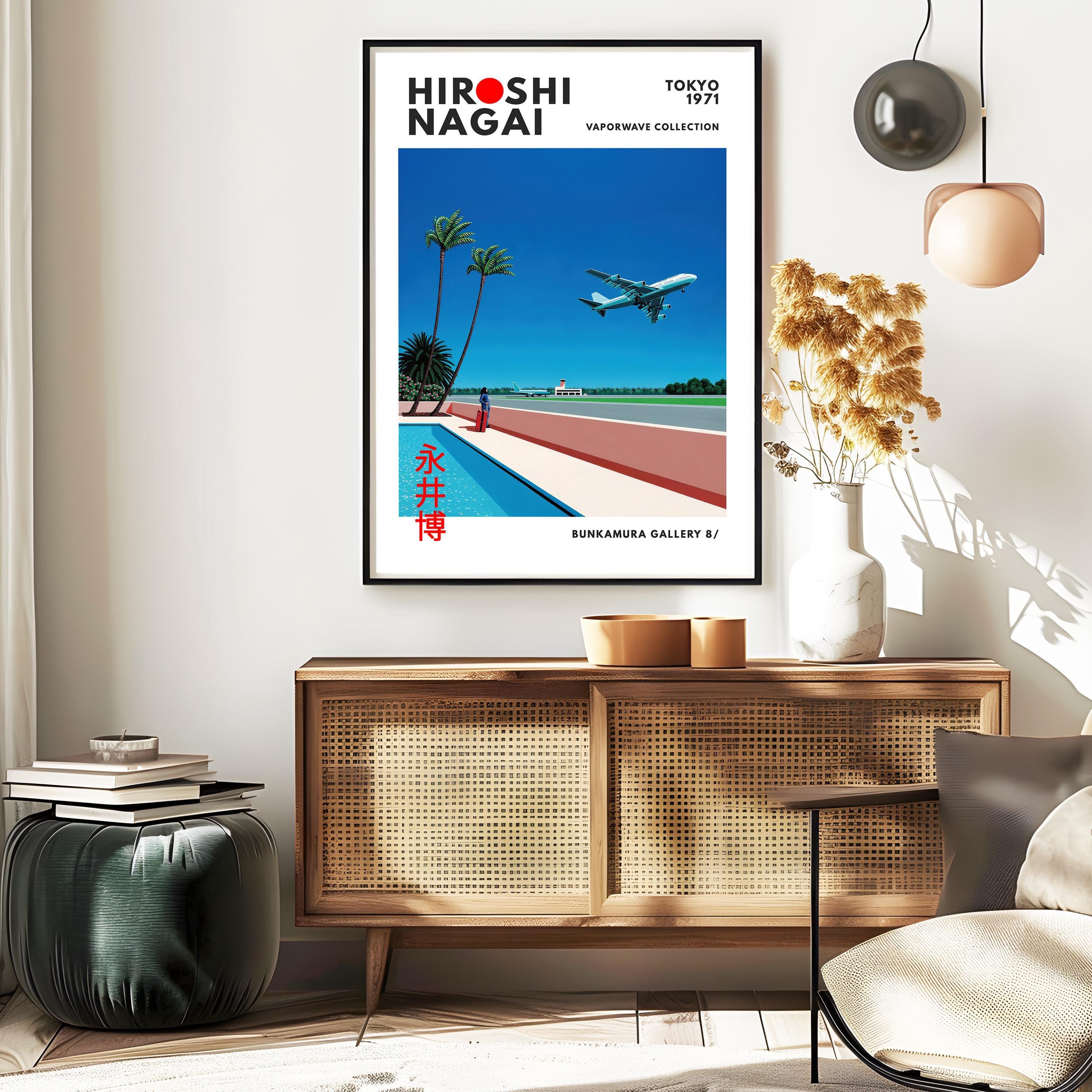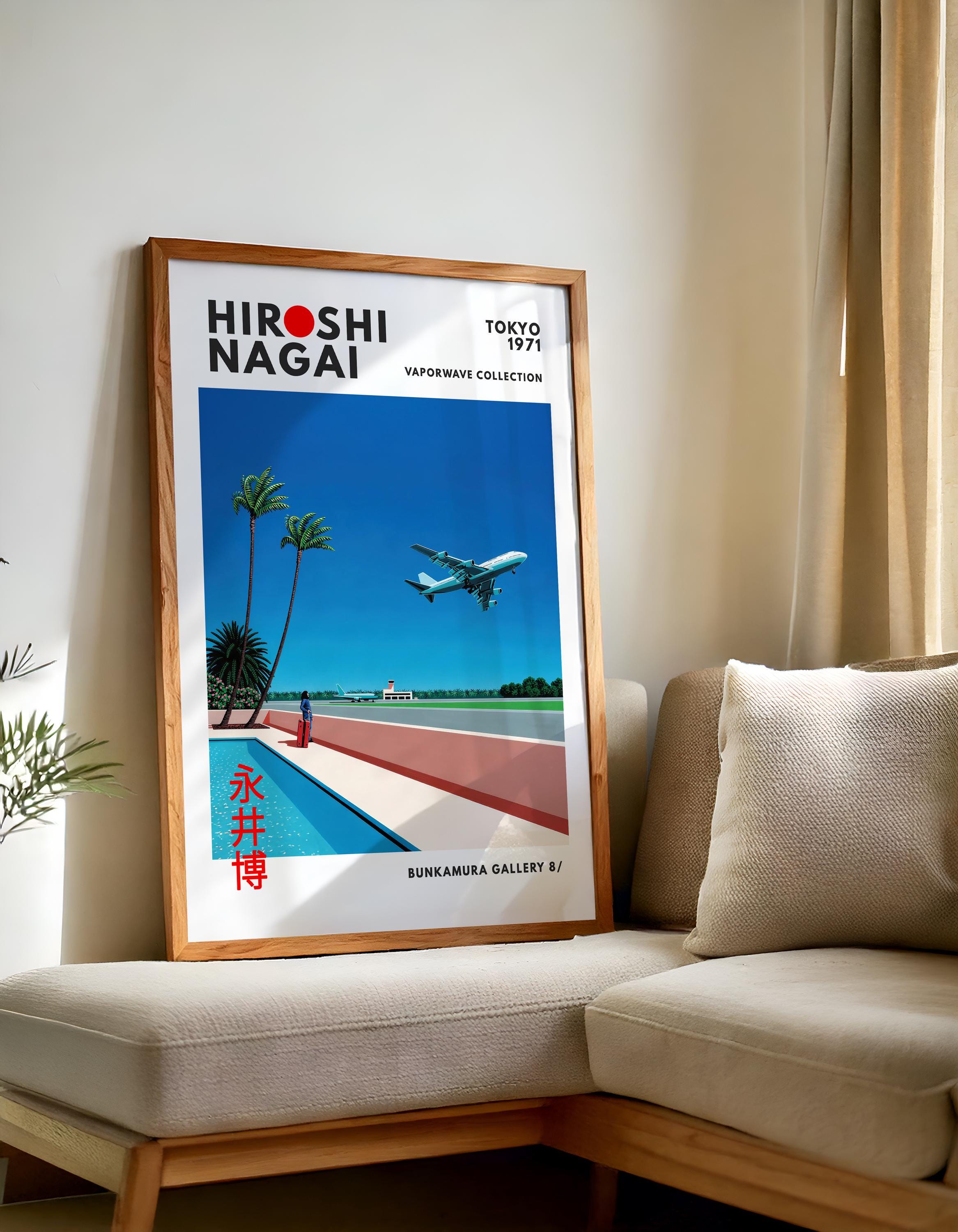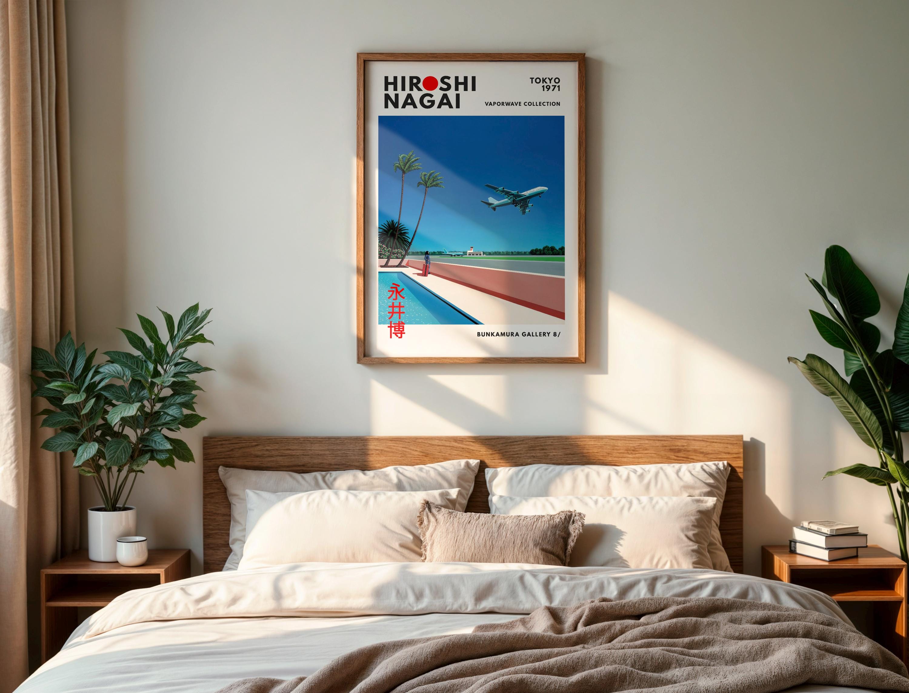 City pop skyline with vaporwave gradient—minimalist Japanese art print of palms and dusk glow, retro wall art sparkle and vintage poster optimism. Sleek contours suggest musical lift-off; an original Hiroshi Nagai work echoing Japan’s breezy pop-culture renaissance.
