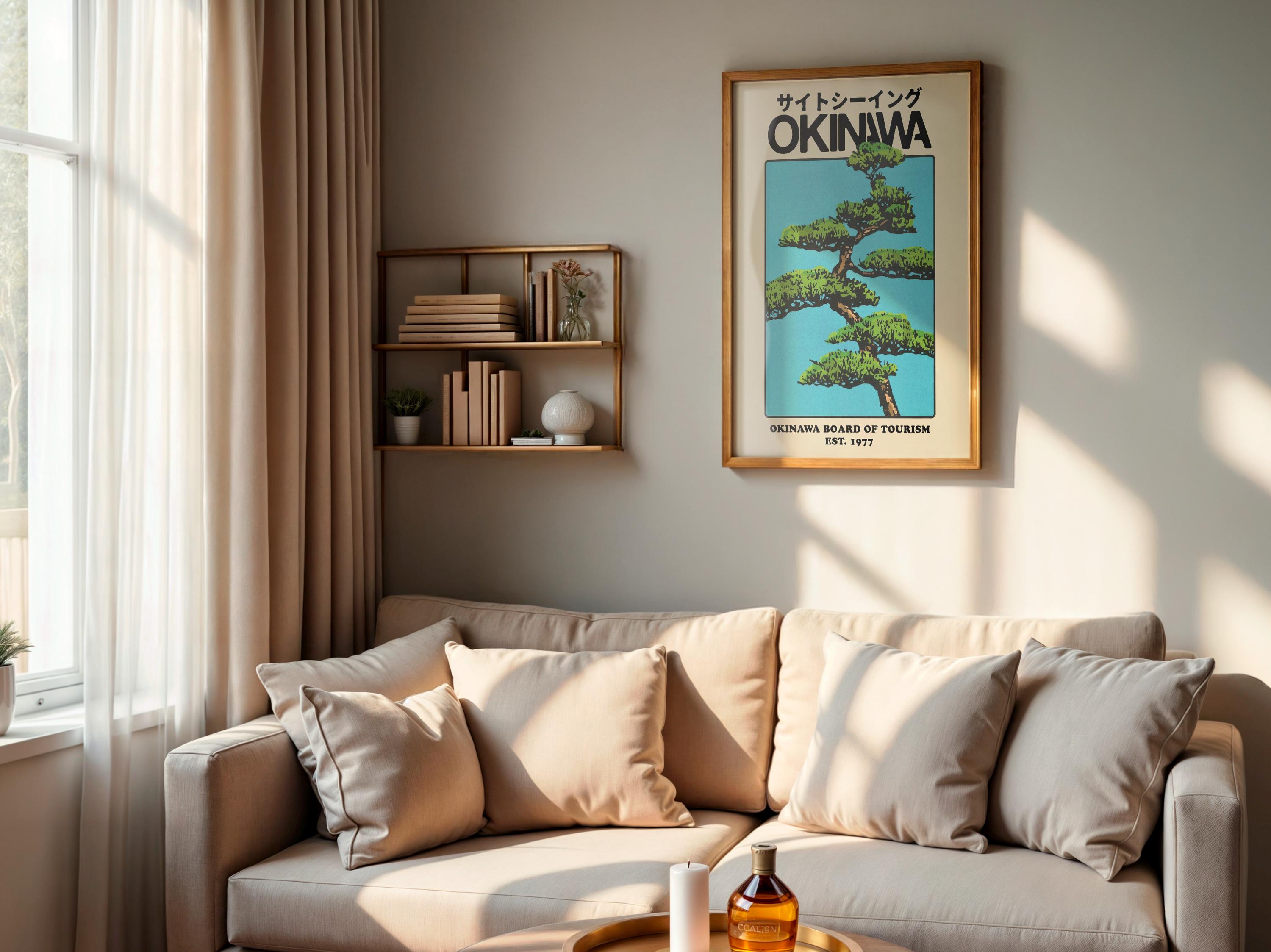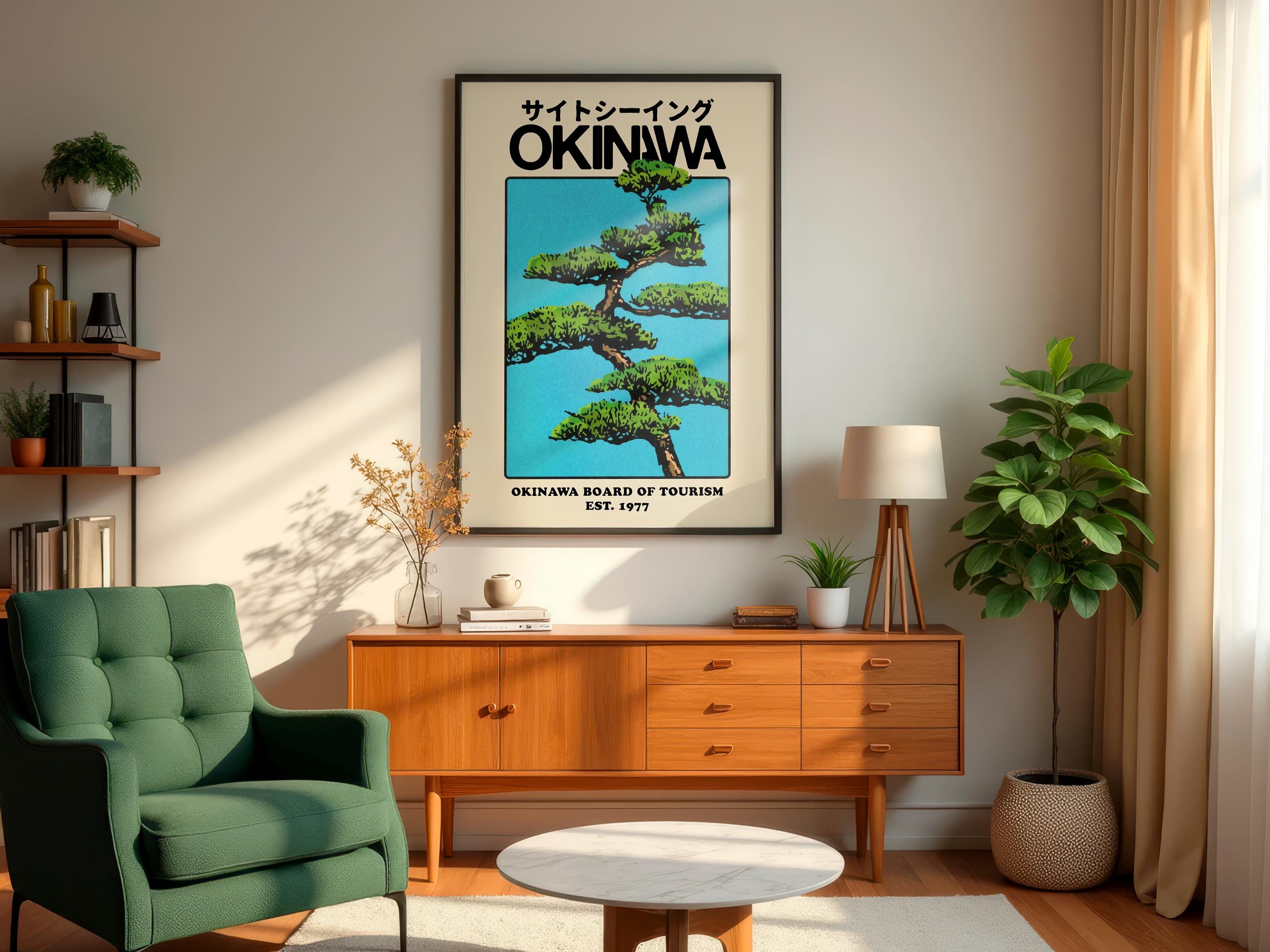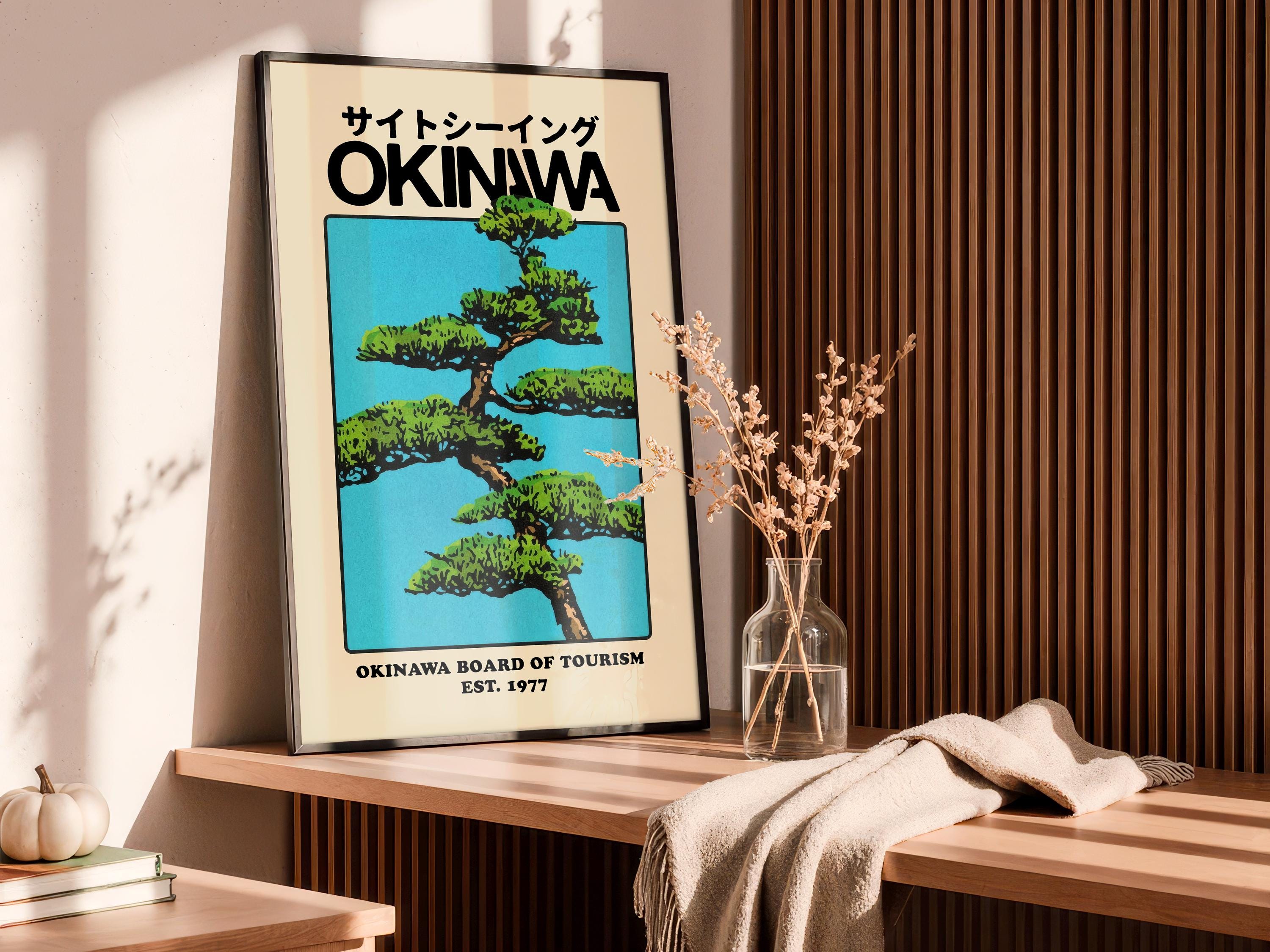 This Okinawa Japan poster features a print of a bonsai tree, giving a peaceful and serene vibe to any space. Perfect for nature lovers and those who appreciate Japanese culture. Ideal for decorating homes, offices, or as a gift for someone who loves travel and Asian aesthetics. Relevant for occasions such as housewarming, birthdays, and as a souvenir from a trip to Japan.