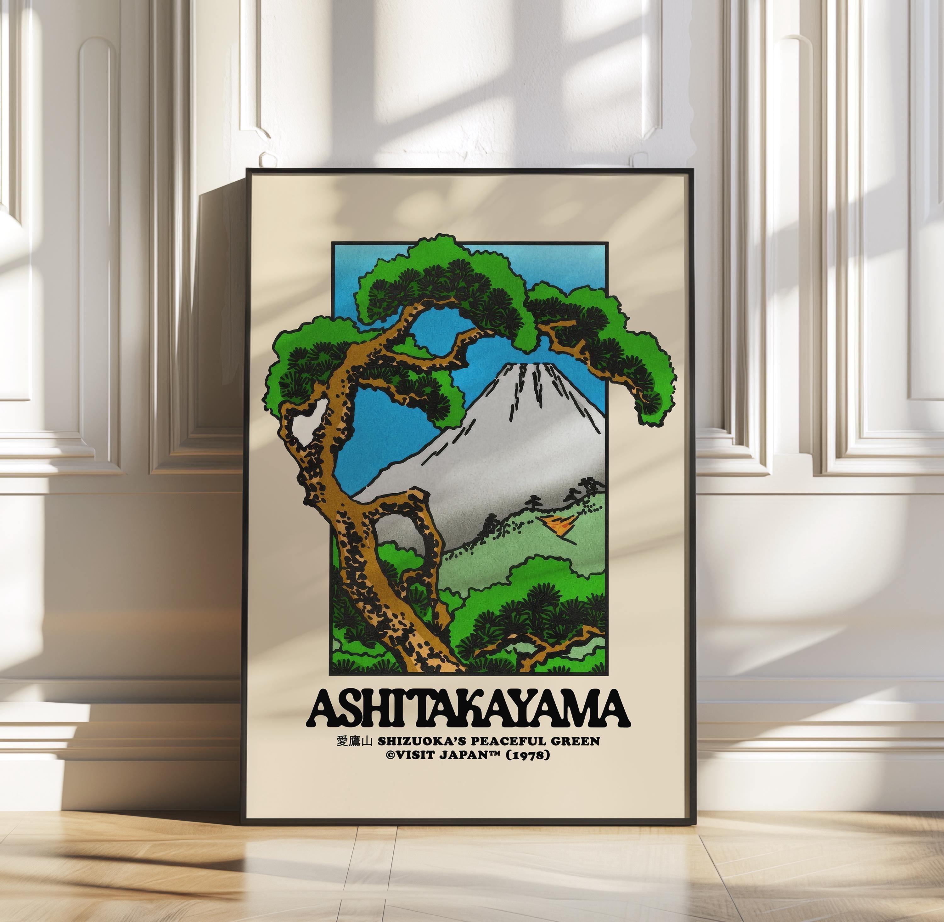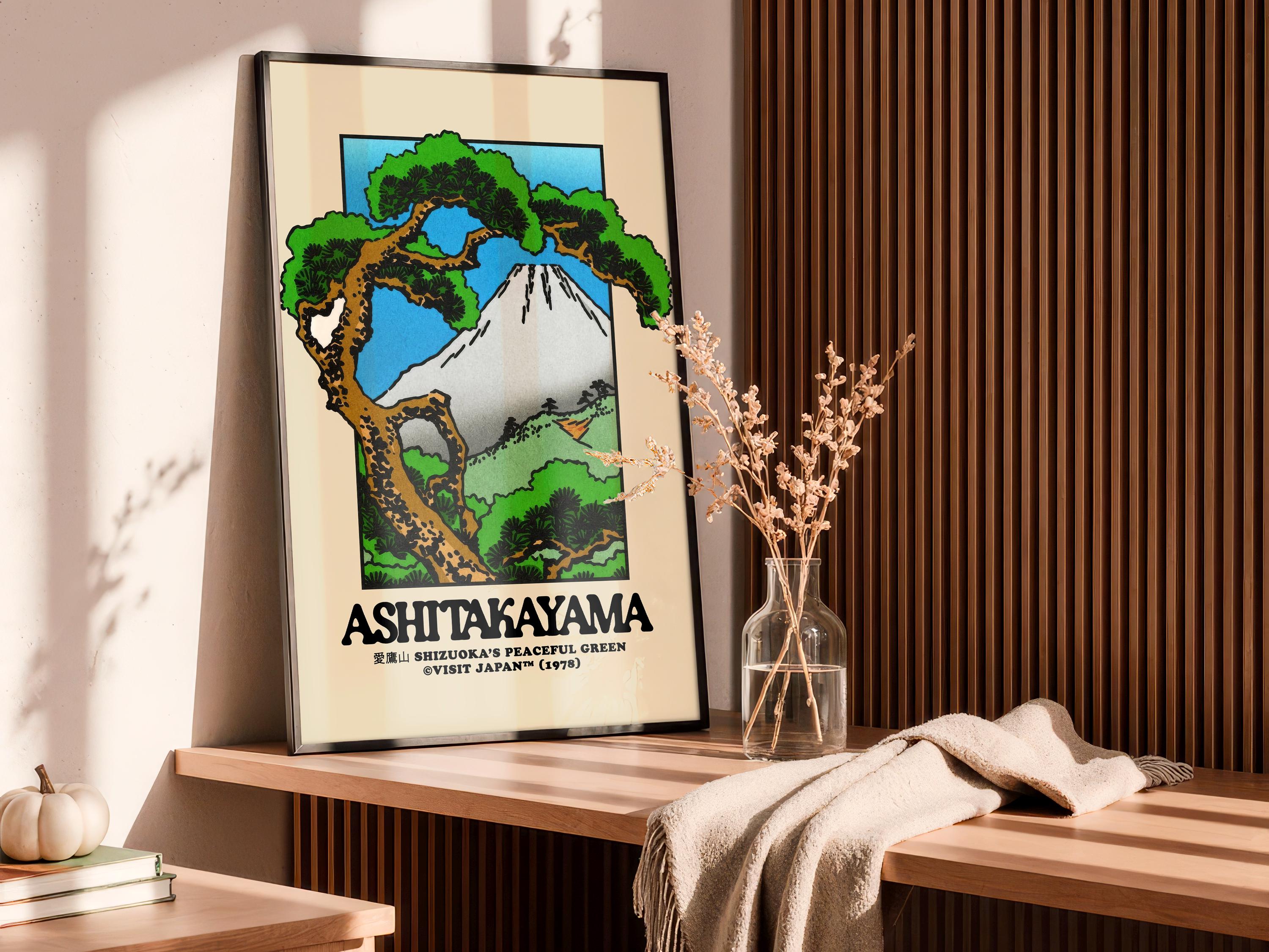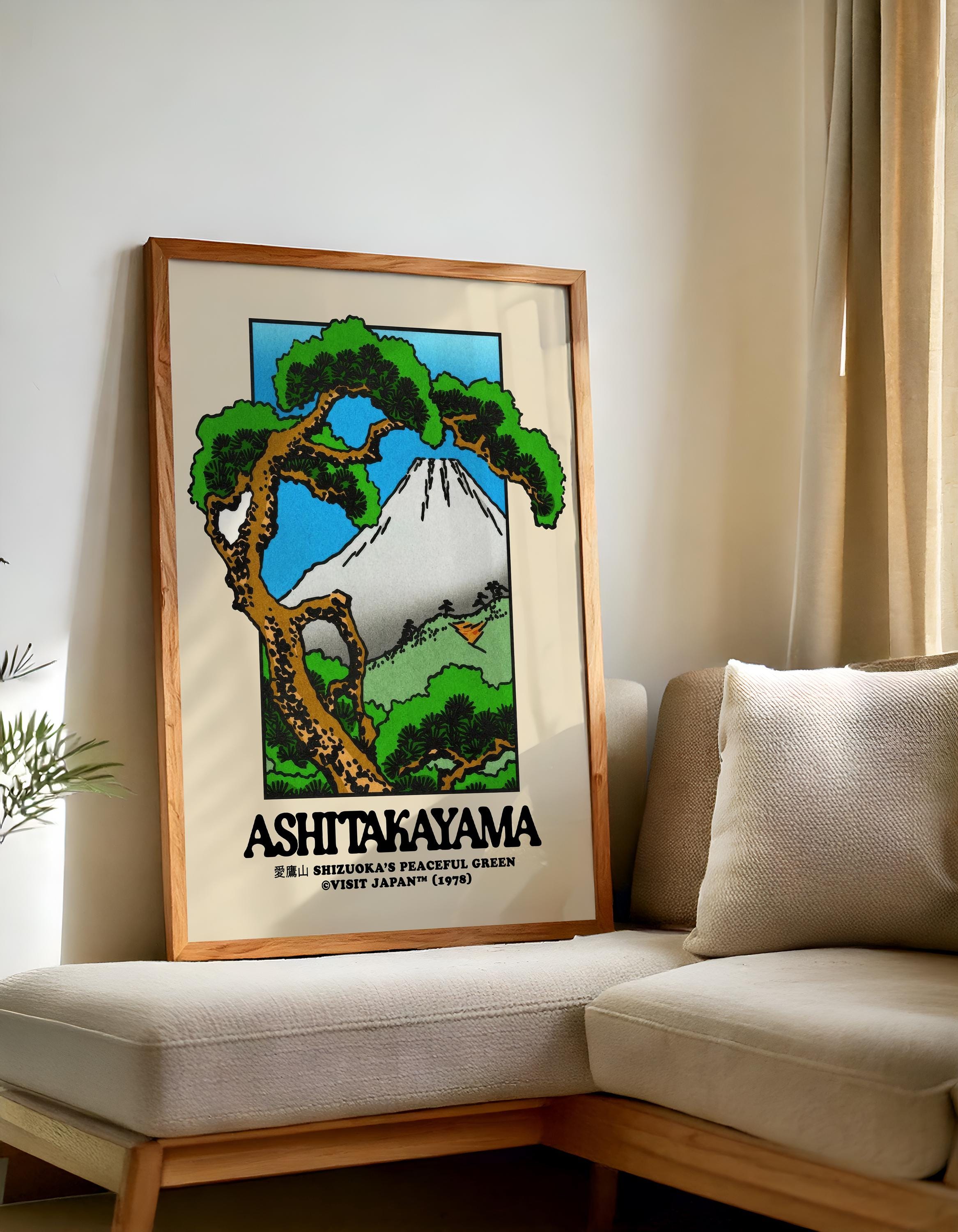 This Ashitakayama Japan poster features a print of Mount Fuji and a bonsai tree, creating a serene and peaceful atmosphere. Perfect for those who love Japanese culture and nature, this poster can be a great addition to a living room or office. Ideal for decorating during Japanese-themed parties and cultural celebrations.