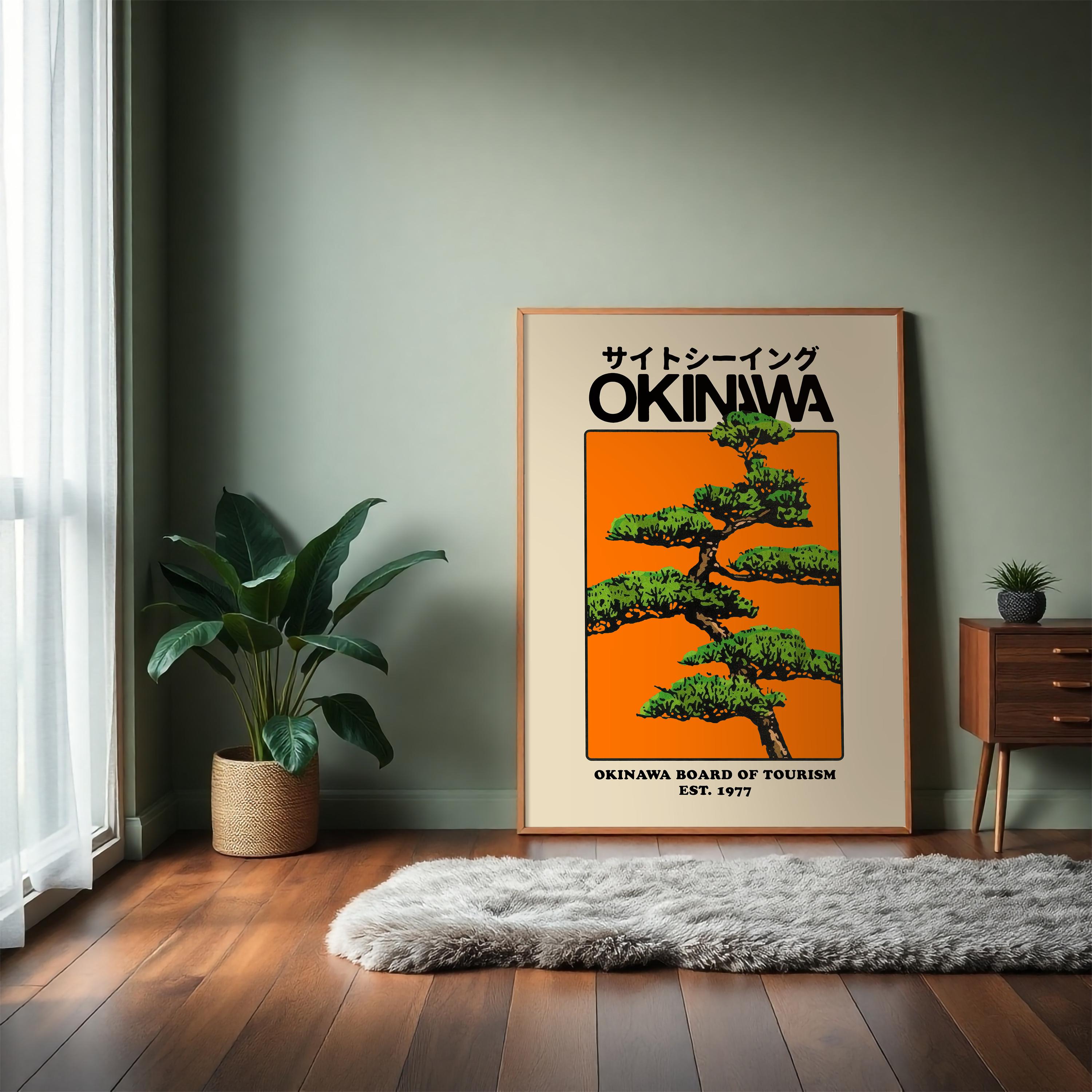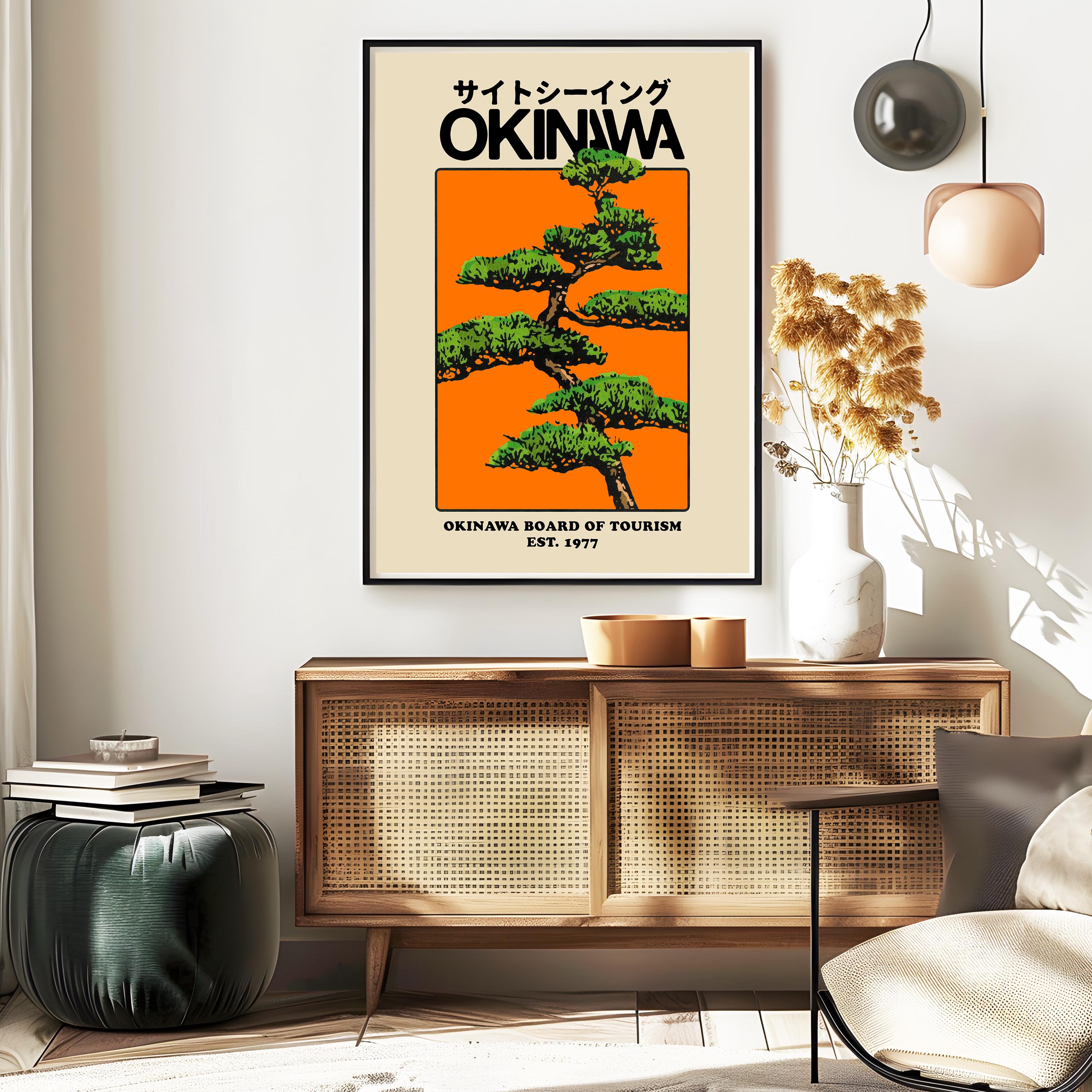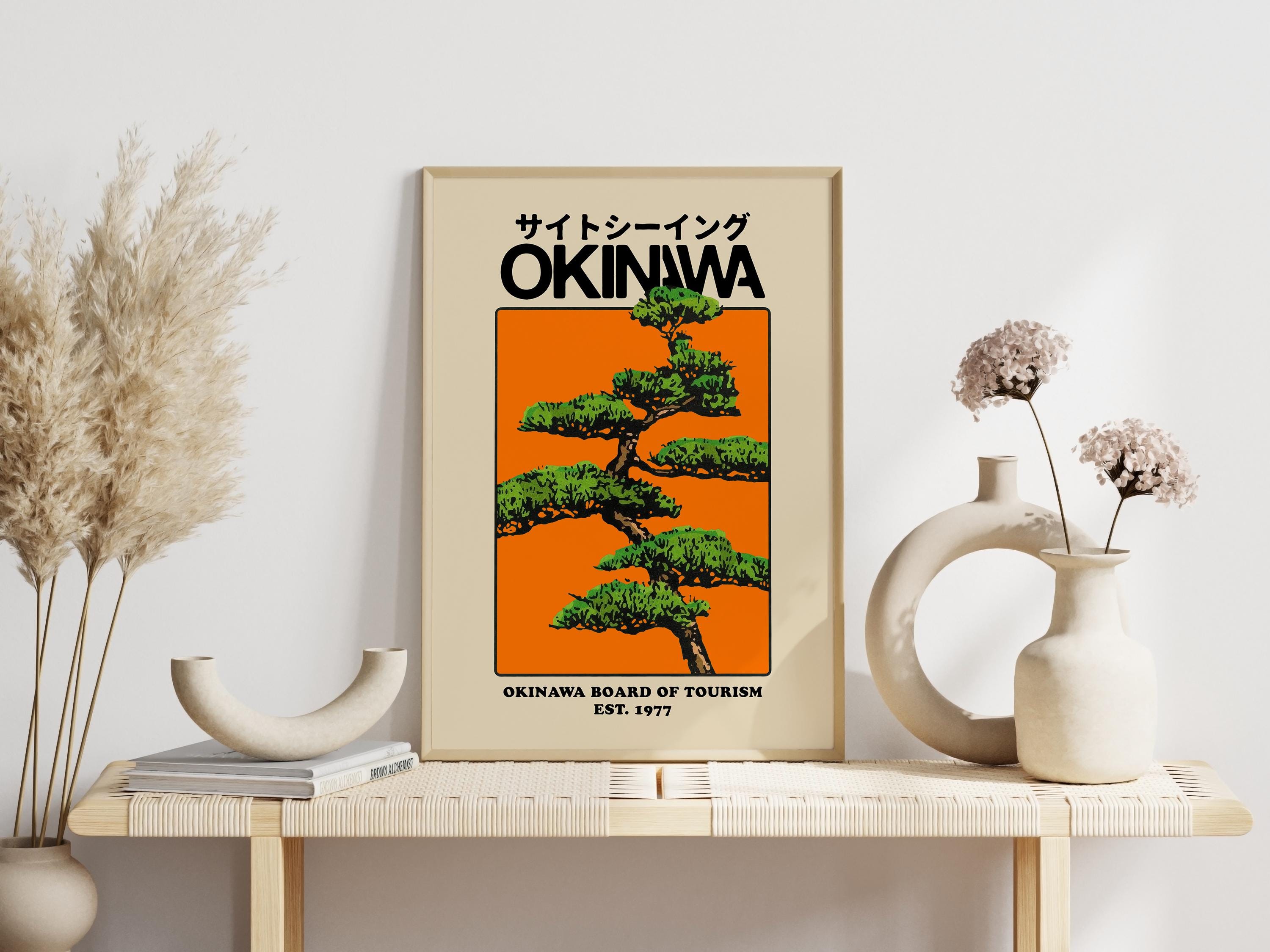 This Okinawa Japan poster features a print of a bonsai tree, giving a peaceful and serene vibe to any space. Perfect for nature lovers and those who appreciate Japanese culture. Ideal for decorating homes, offices, or as a gift for someone who loves travel and Asian aesthetics. Relevant for occasions such as housewarming, birthdays, and as a souvenir from a trip to Japan.