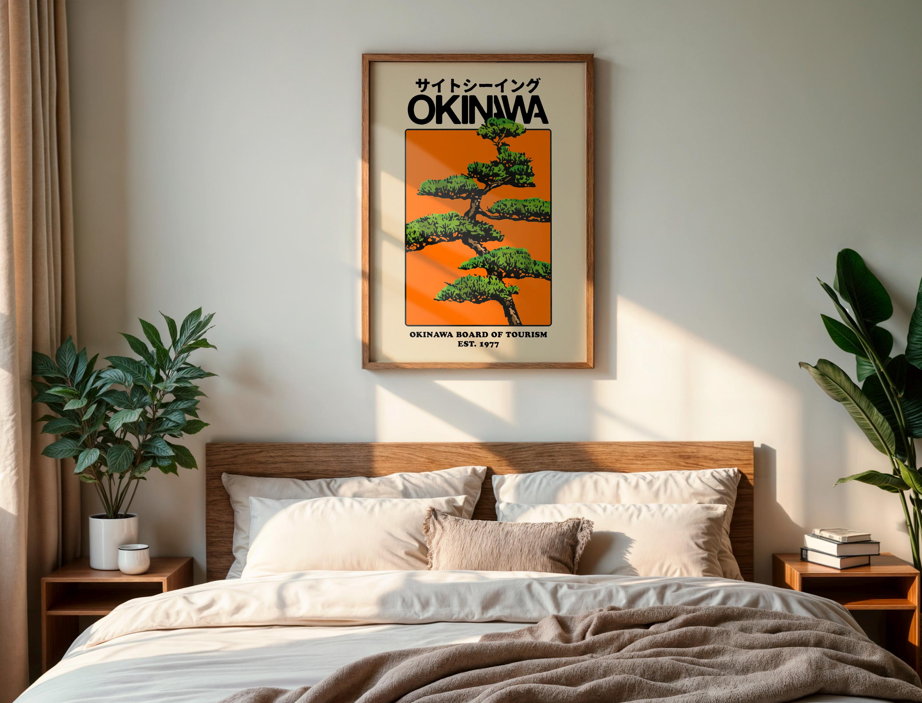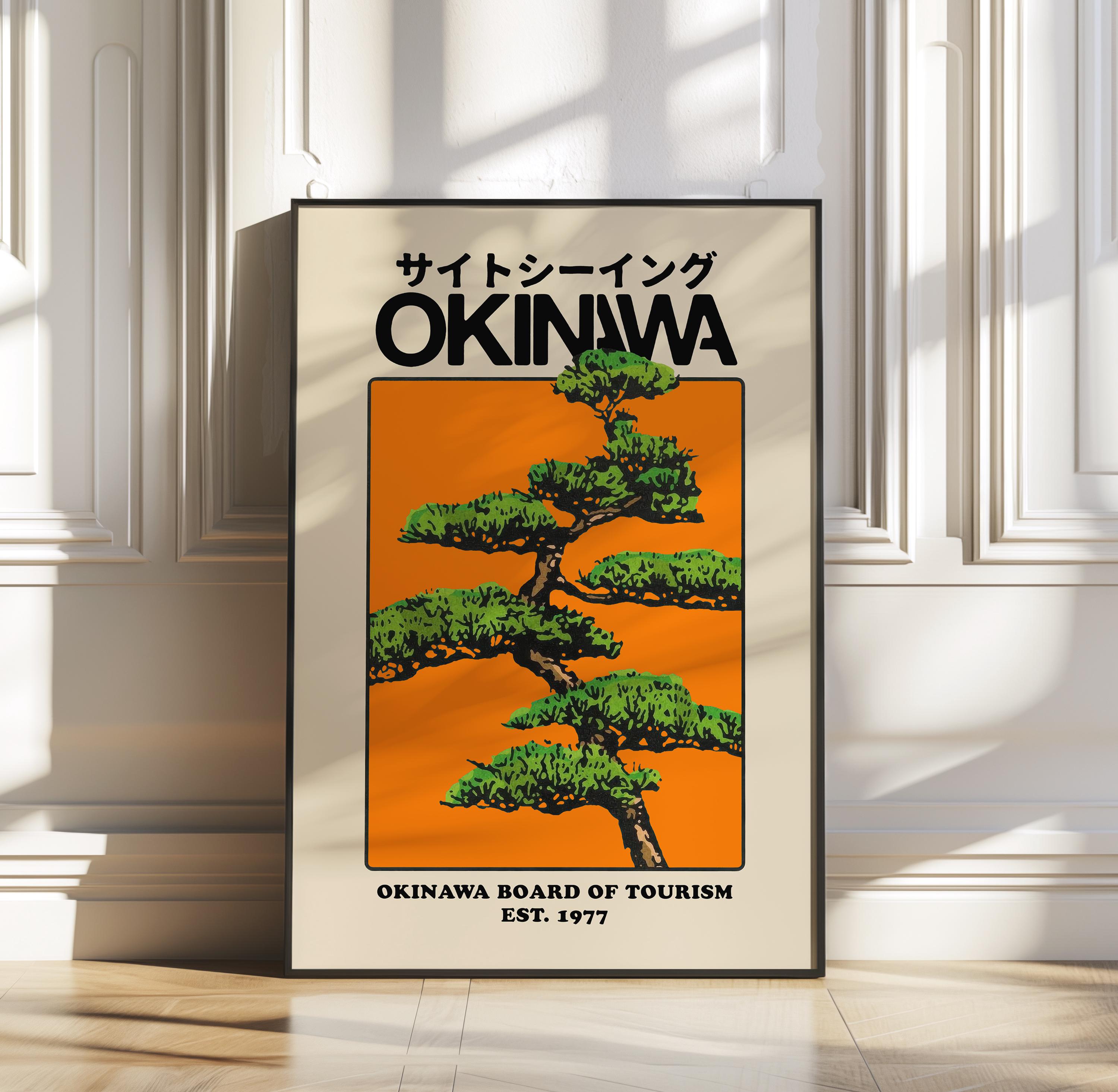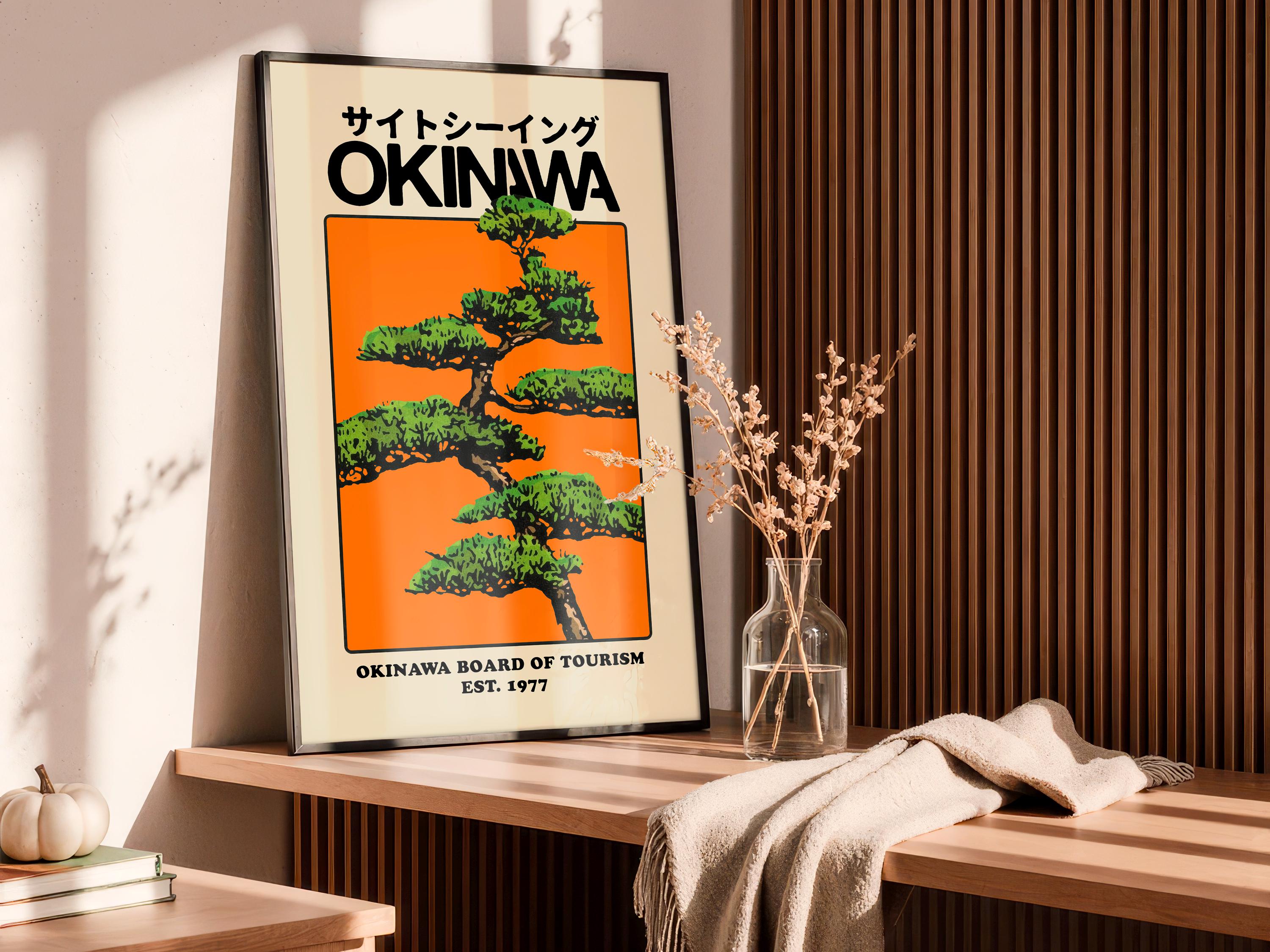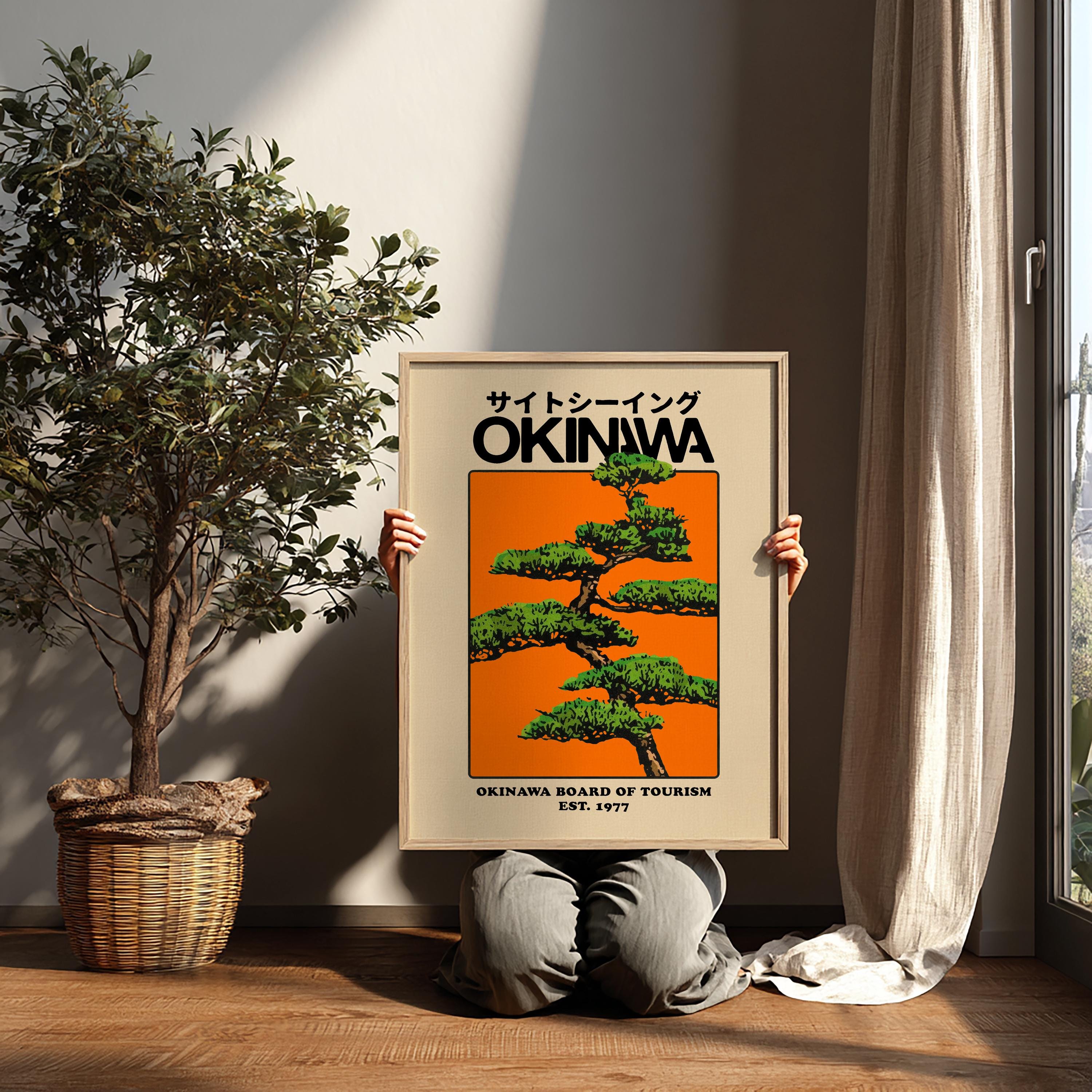 This Okinawa Japan poster features a print of a bonsai tree, giving a peaceful and serene vibe to any space. Perfect for nature lovers and those who appreciate Japanese culture. Ideal for decorating homes, offices, or as a gift for someone who loves travel and Asian aesthetics. Relevant for occasions such as housewarming, birthdays, and as a souvenir from a trip to Japan.