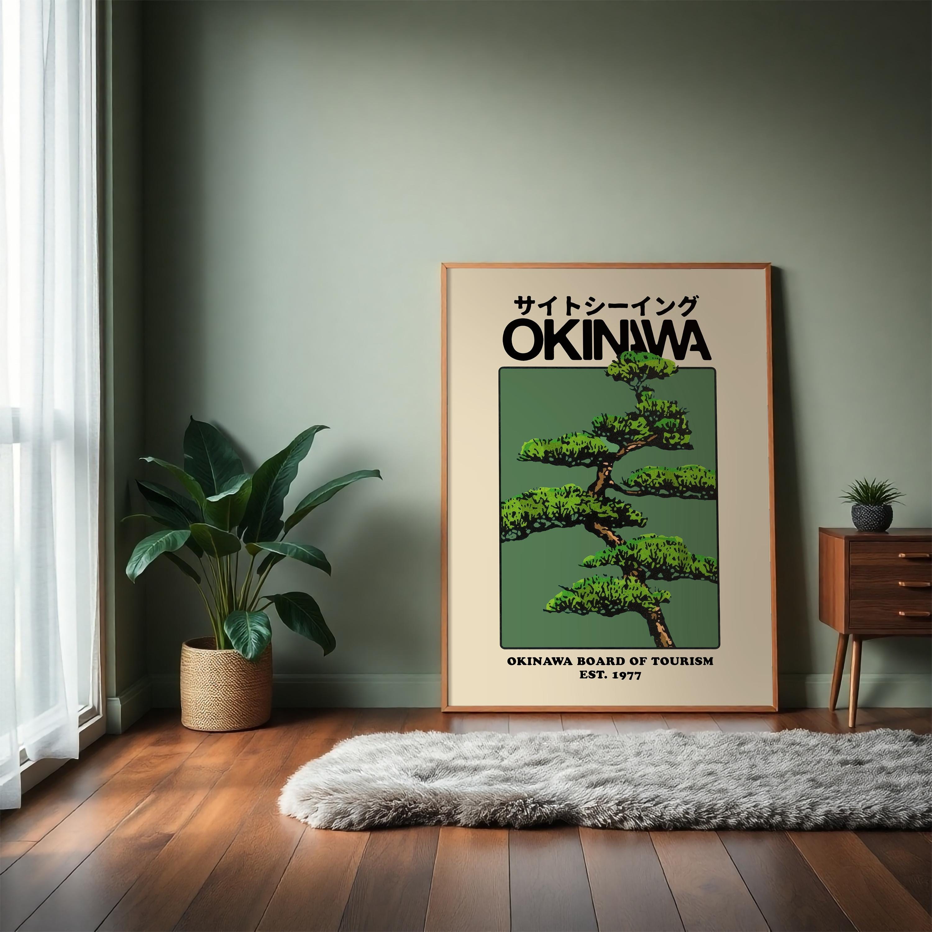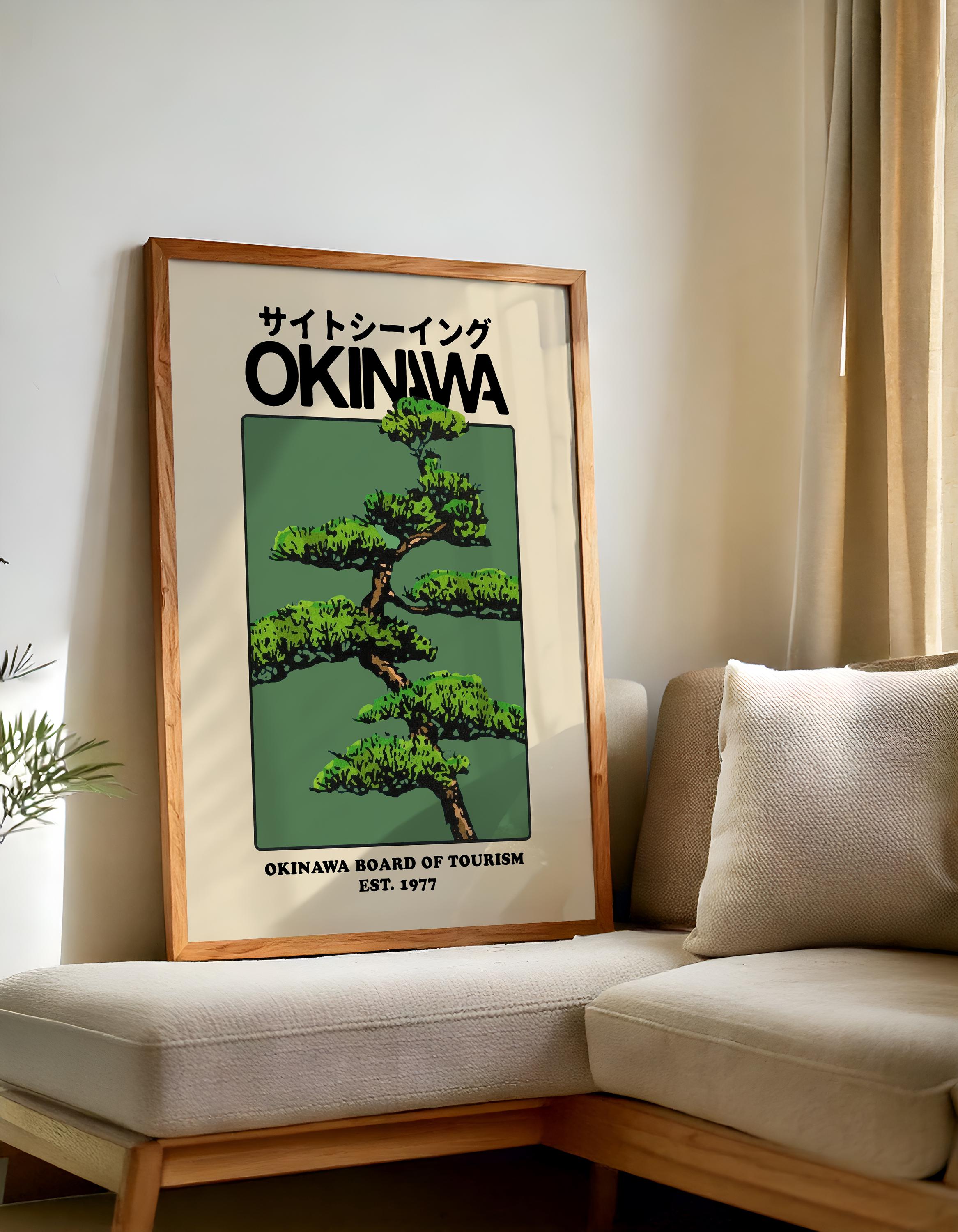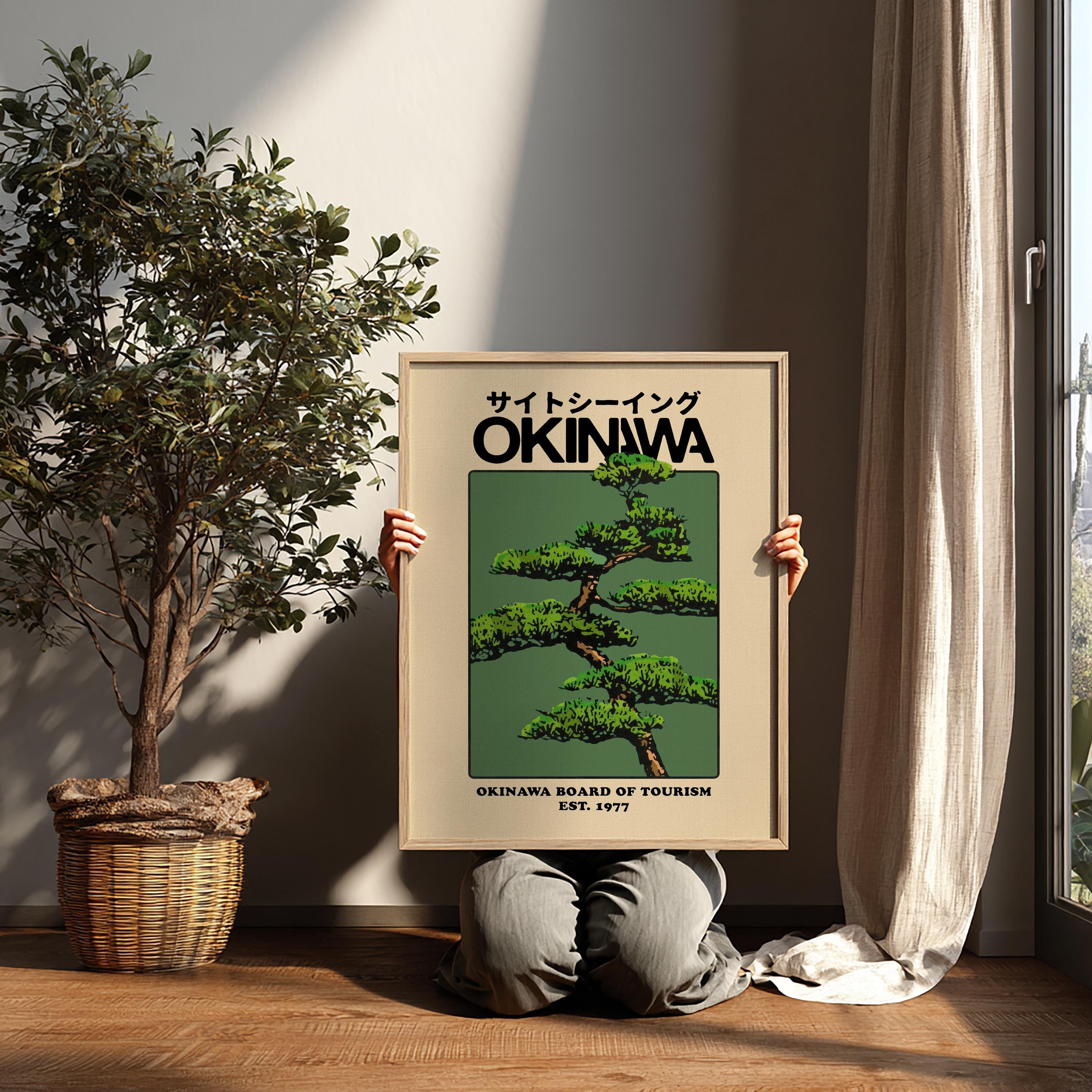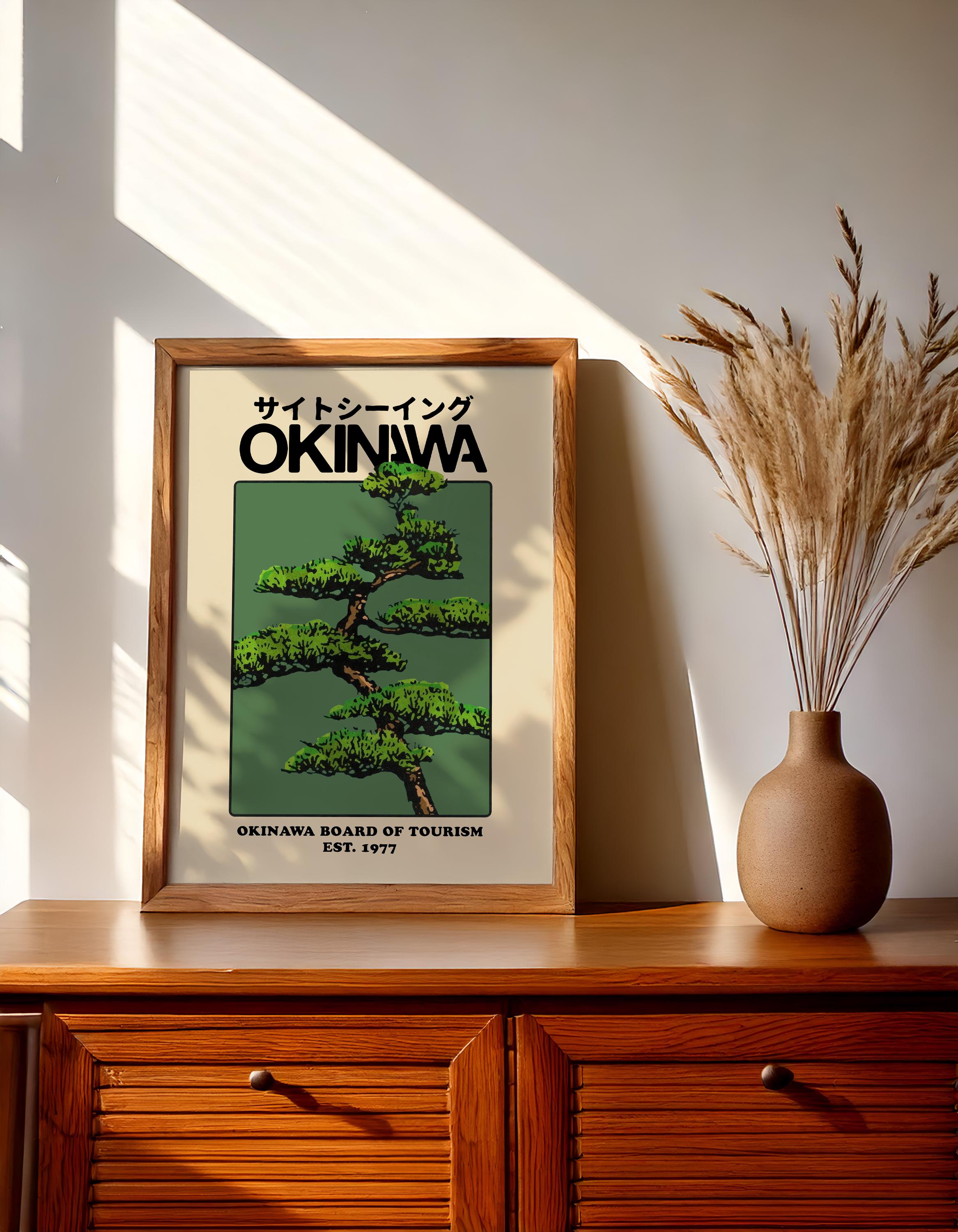 This Okinawa Japan poster features a print of a bonsai tree, giving a peaceful and serene vibe to any space. Perfect for nature lovers and those who appreciate Japanese culture. Ideal for decorating homes, offices, or as a gift for someone who loves travel and Asian aesthetics. Relevant for occasions such as housewarming, birthdays, and as a souvenir from a trip to Japan.