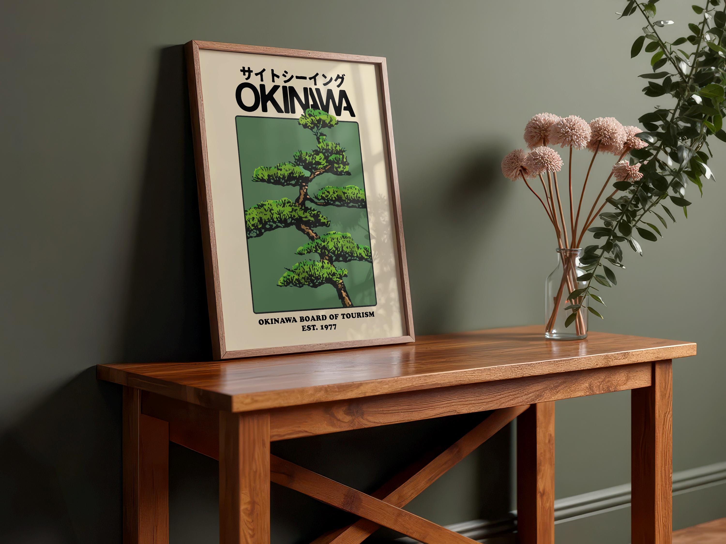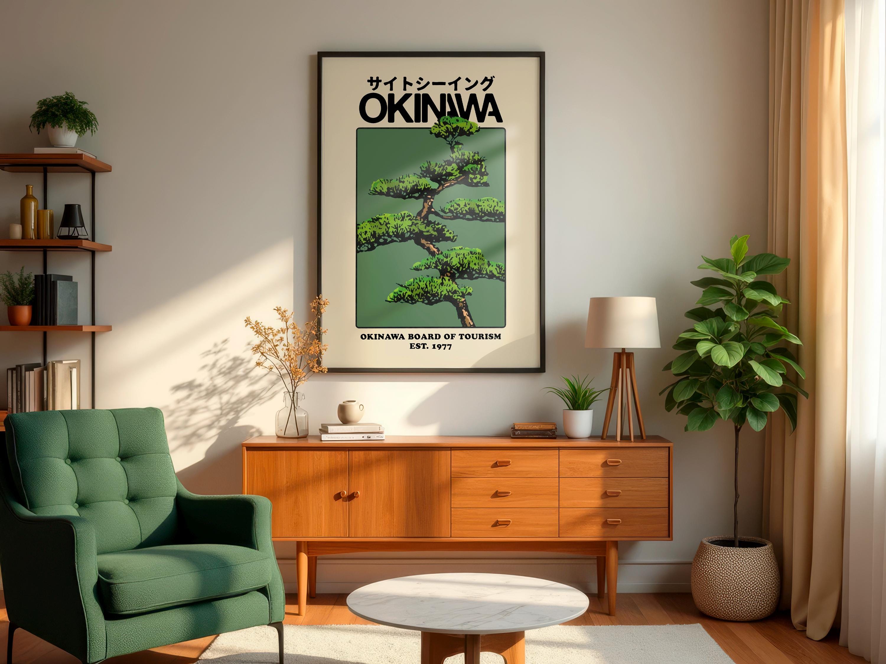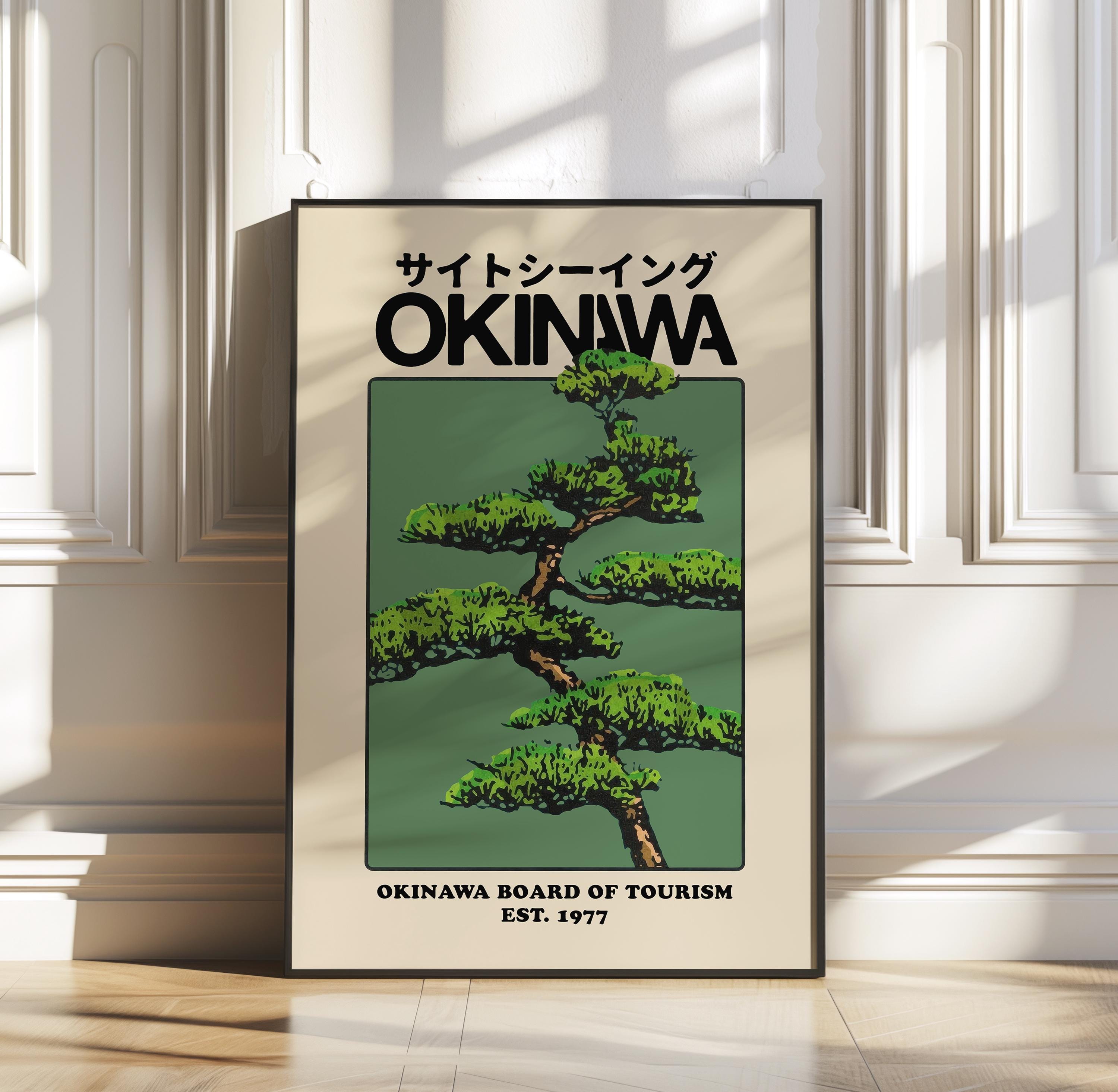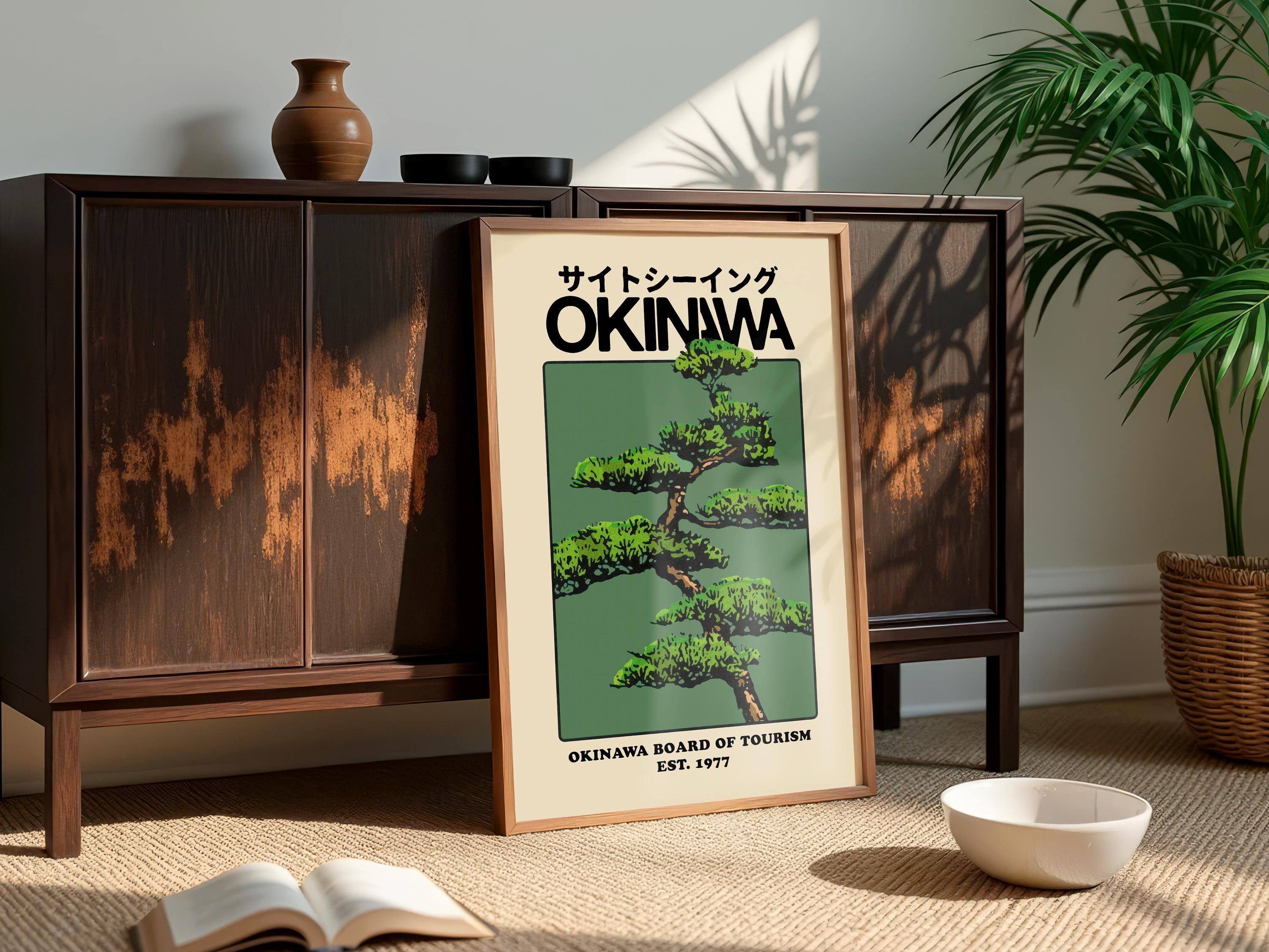 This Okinawa Japan poster features a print of a bonsai tree, giving a peaceful and serene vibe to any space. Perfect for nature lovers and those who appreciate Japanese culture. Ideal for decorating homes, offices, or as a gift for someone who loves travel and Asian aesthetics. Relevant for occasions such as housewarming, birthdays, and as a souvenir from a trip to Japan.