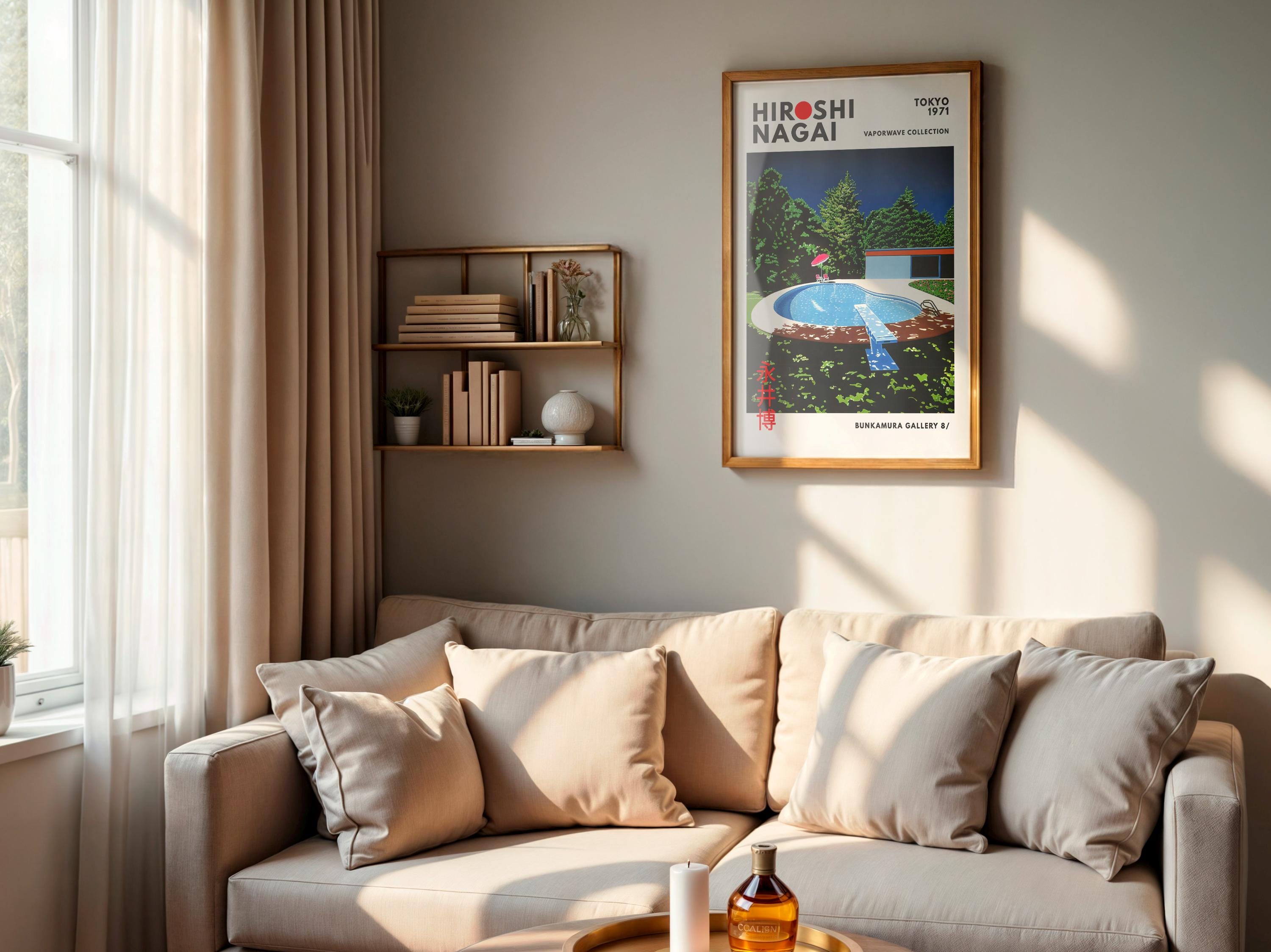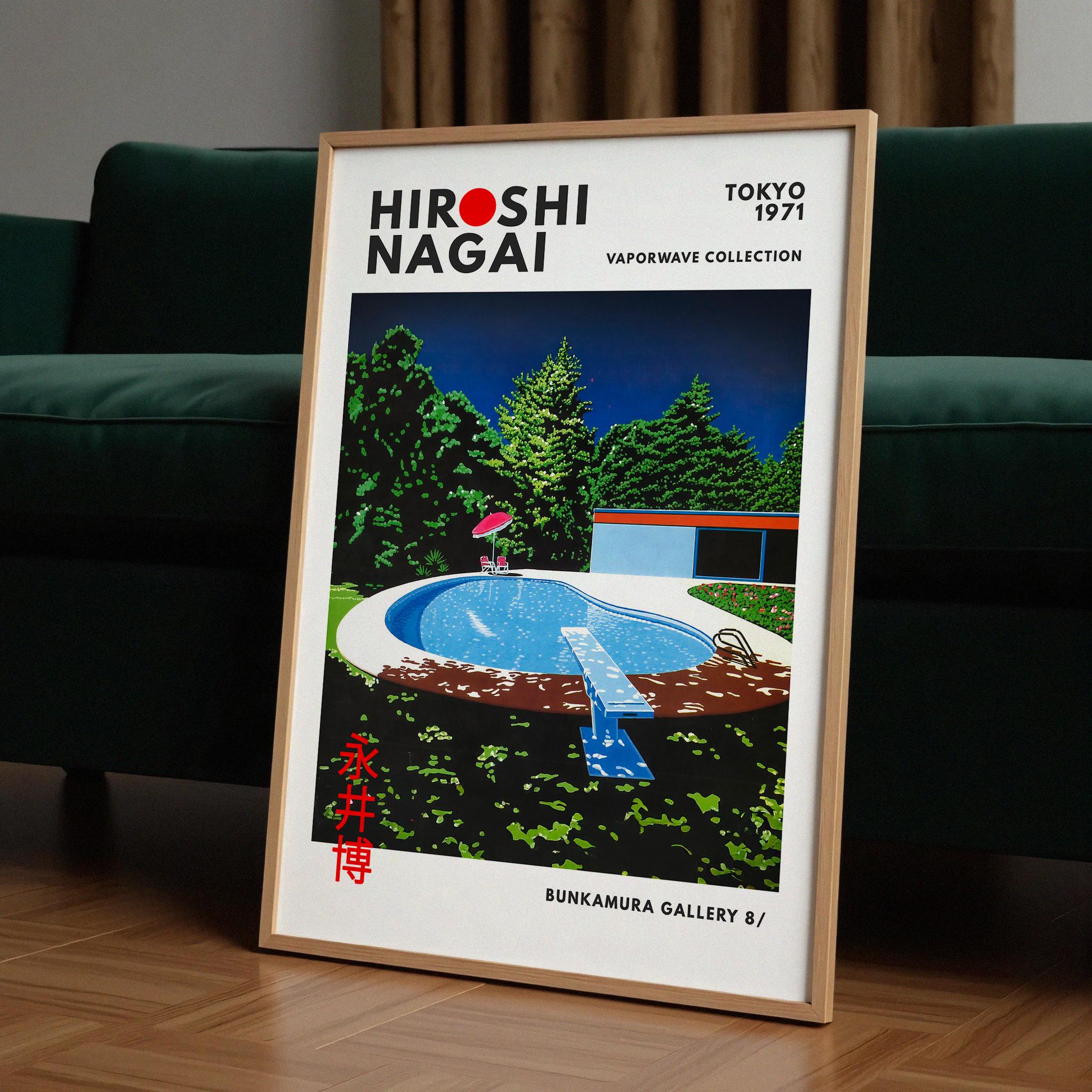 Minimalist Japanese art print with retro wall art flair, city pop aura and vaporwave palette—bold geometry, saturated sky and crisp palm accents evoke a polished 80s mood. Clean color blocking and poised negative space frame a timeless pop aesthetic; an original Hiroshi Nagai artwork tied to Eiichi Ohtaki’s city-pop era.