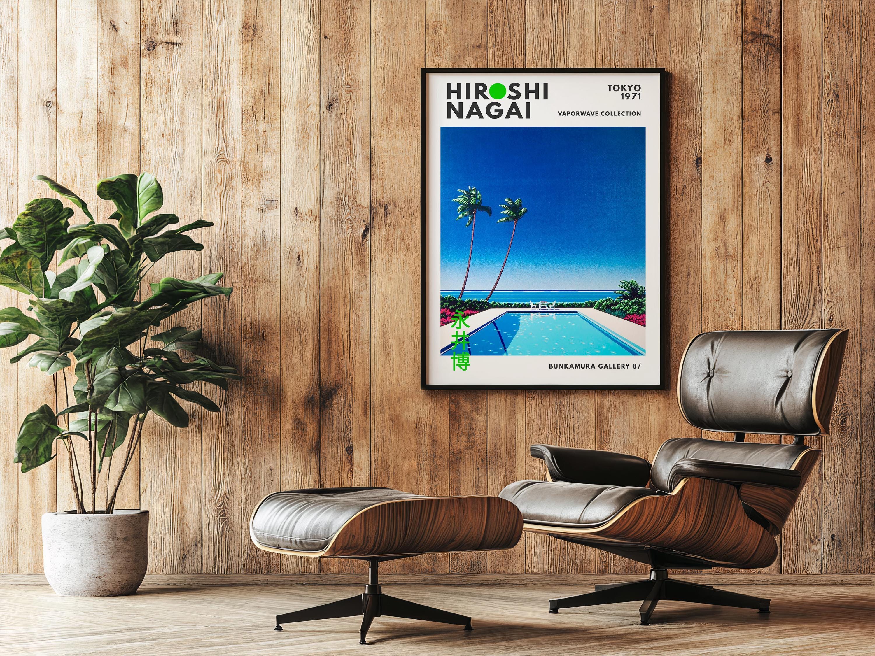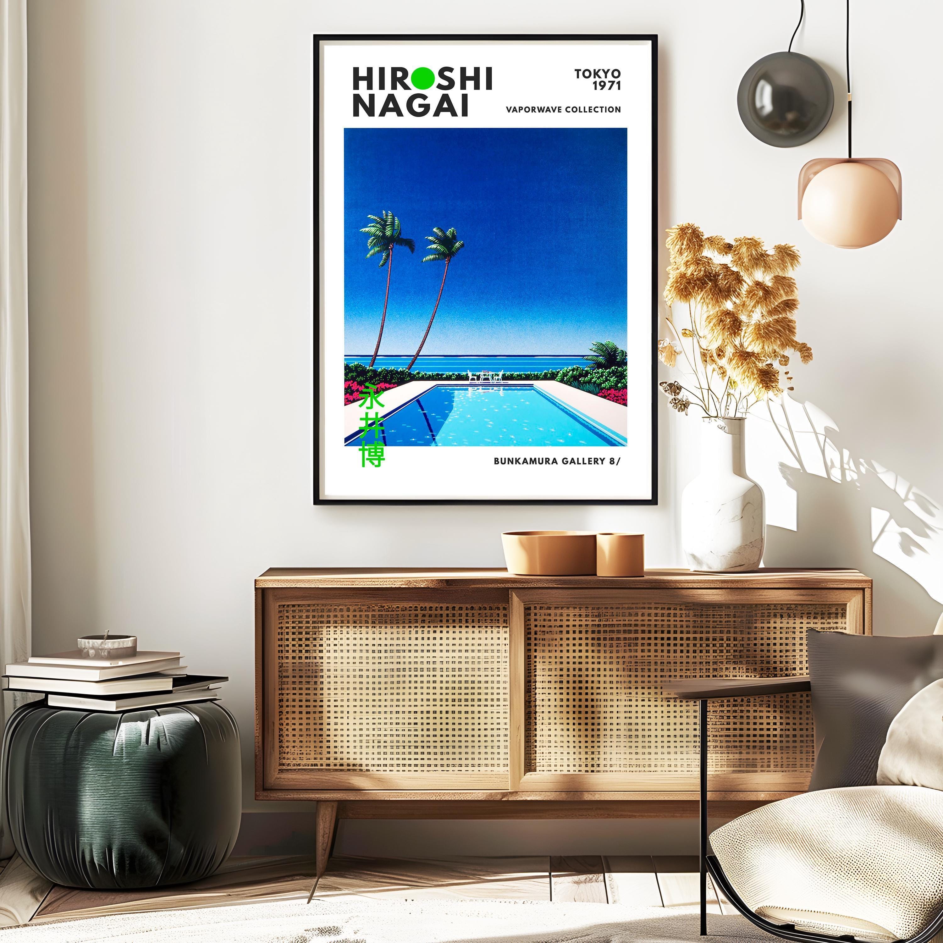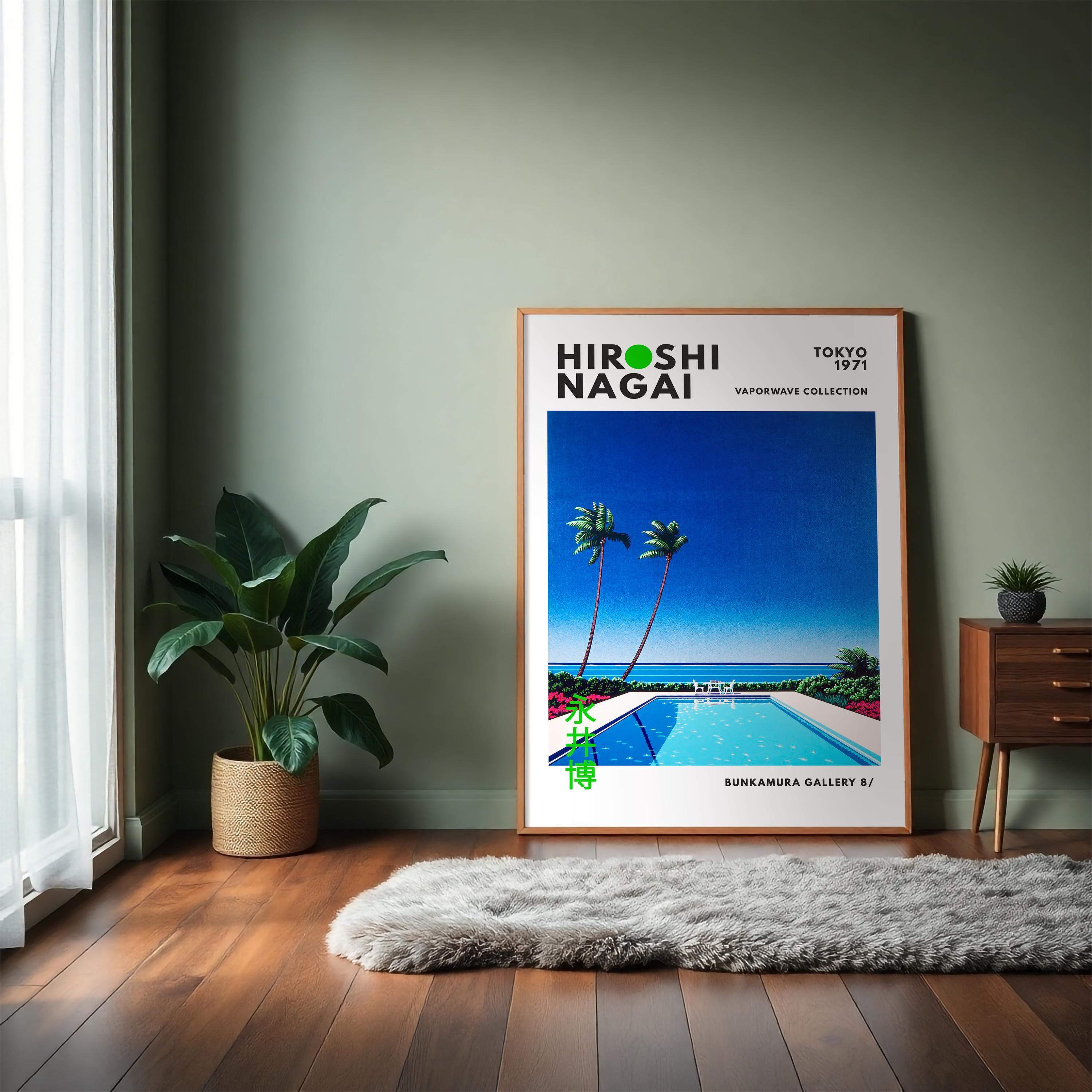 Minimalist Japanese art print with retro wall art flair, city pop vibe and vaporwave palette—watermelon-red accents, turquoise pool planes and crisp palm silhouettes in a refined 80s resort mood. Clean geometry, saturated sky and precise shadows shape a playful yet elegant coastal scene; an original Hiroshi Nagai work from his iconic era.