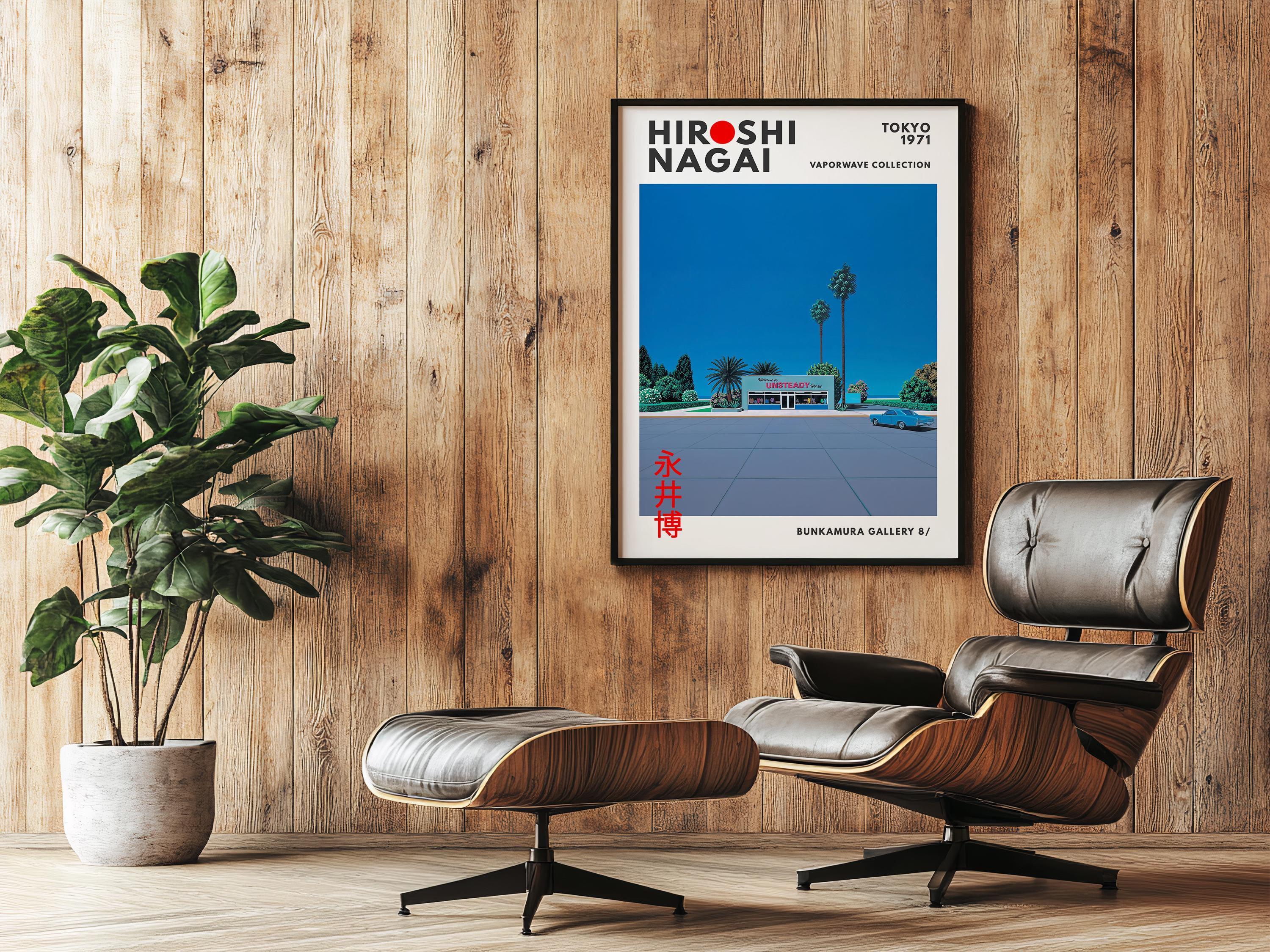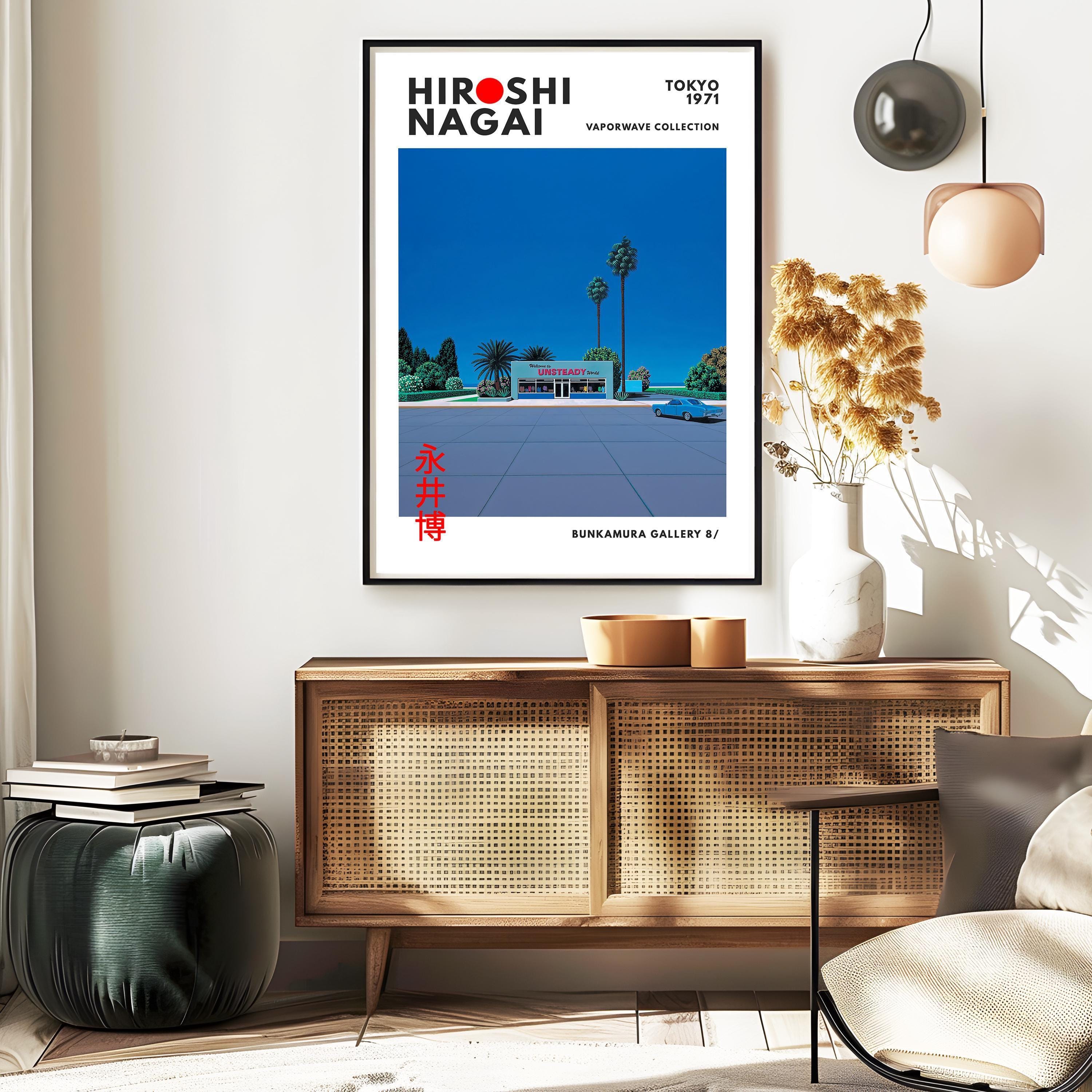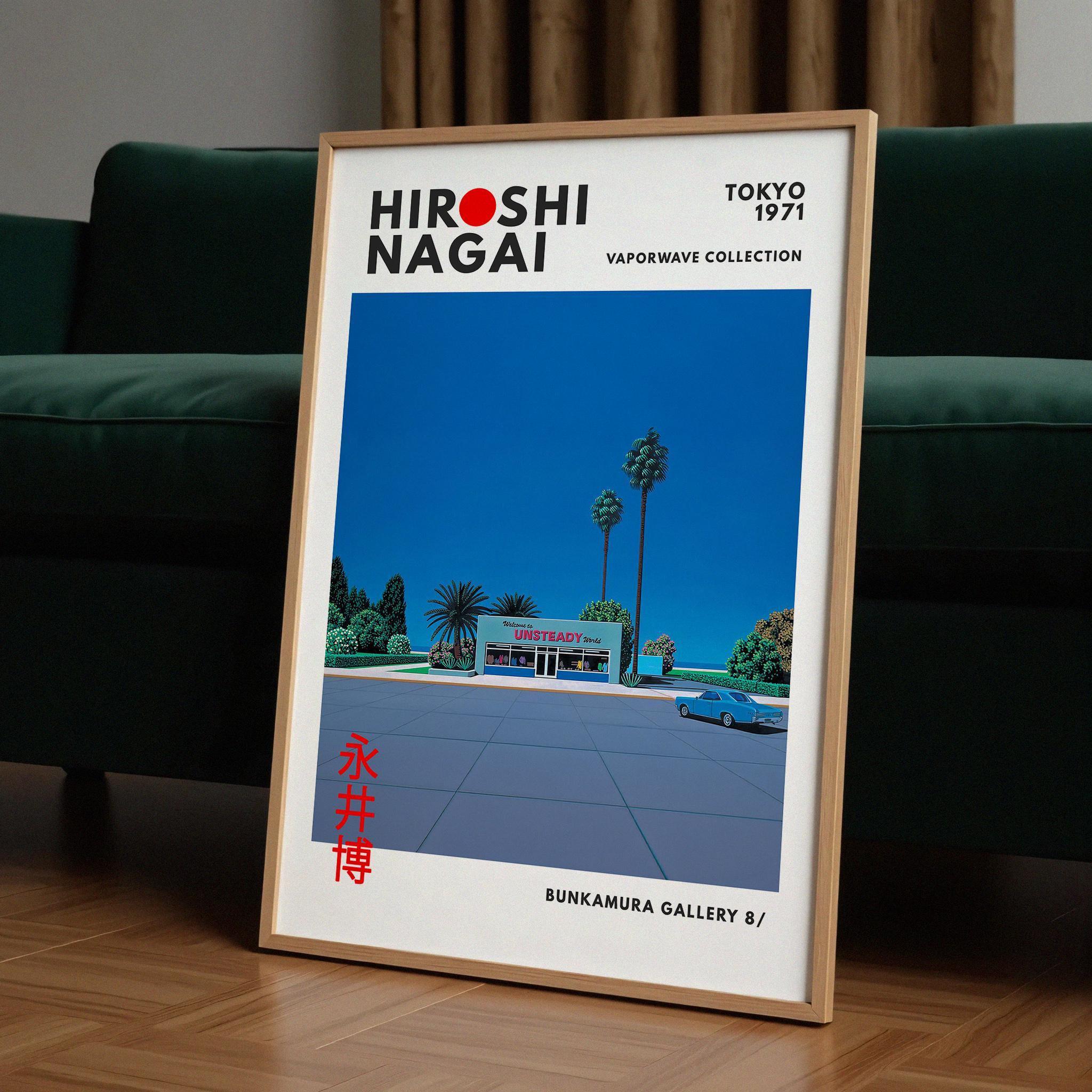 Minimalist Japanese art print with retro wall art energy, city pop vibe and vaporwave palette—geometric planes, saturated sky and crisp, 80s-style serenity. Clean color blocks and poised negative space define a calm yet “unsteady” horizon; an original Hiroshi Nagai piece from his iconic era.