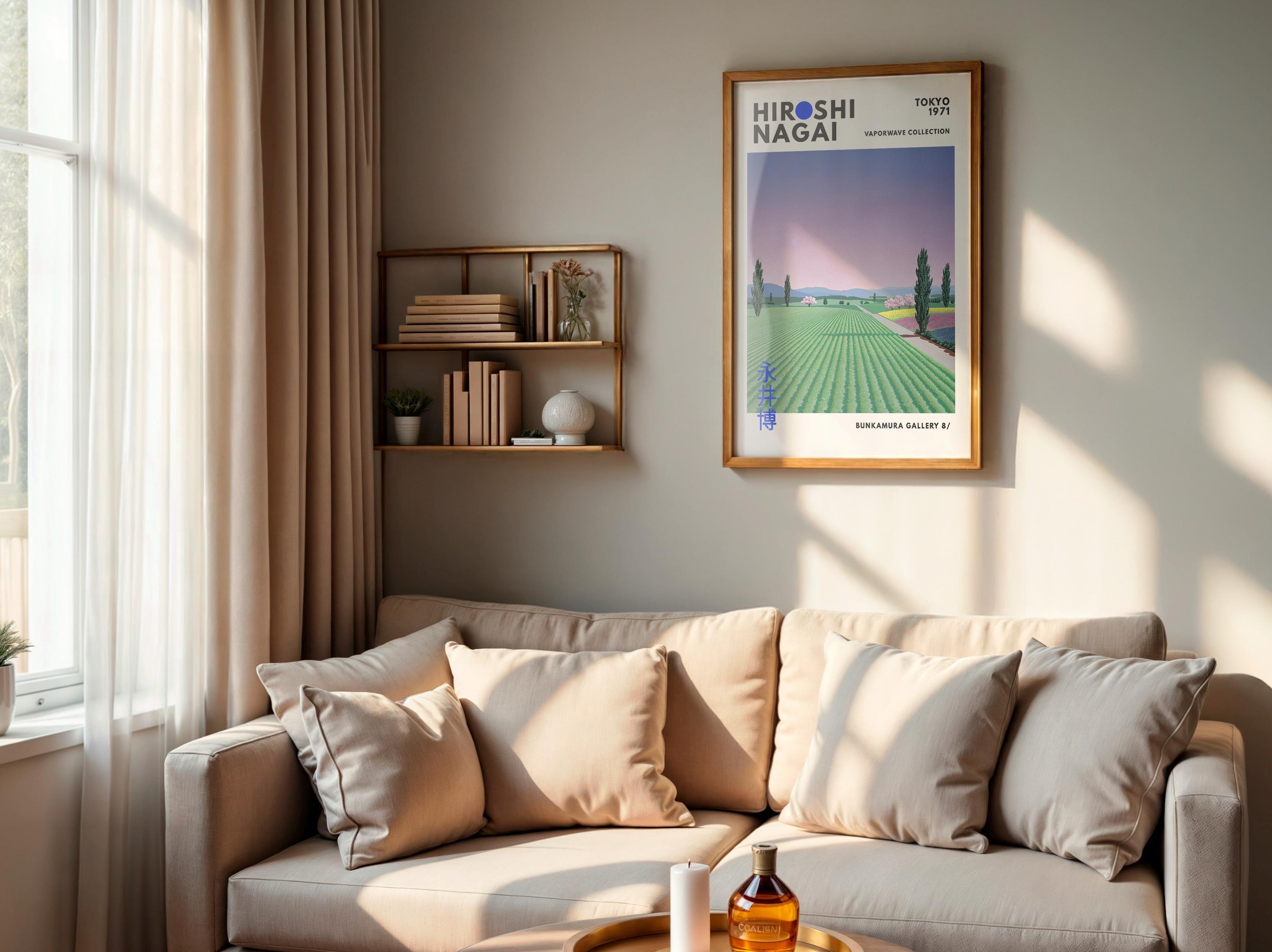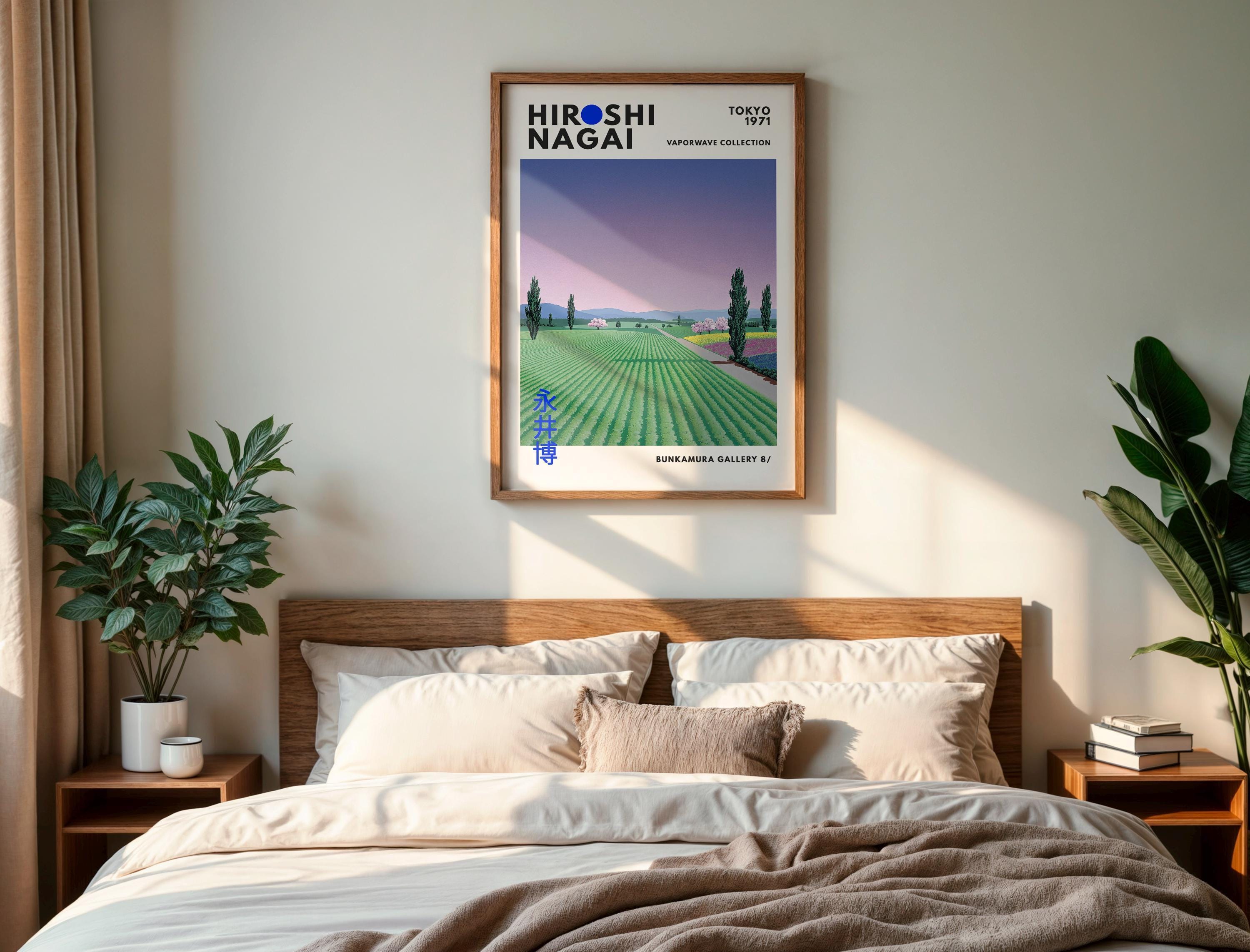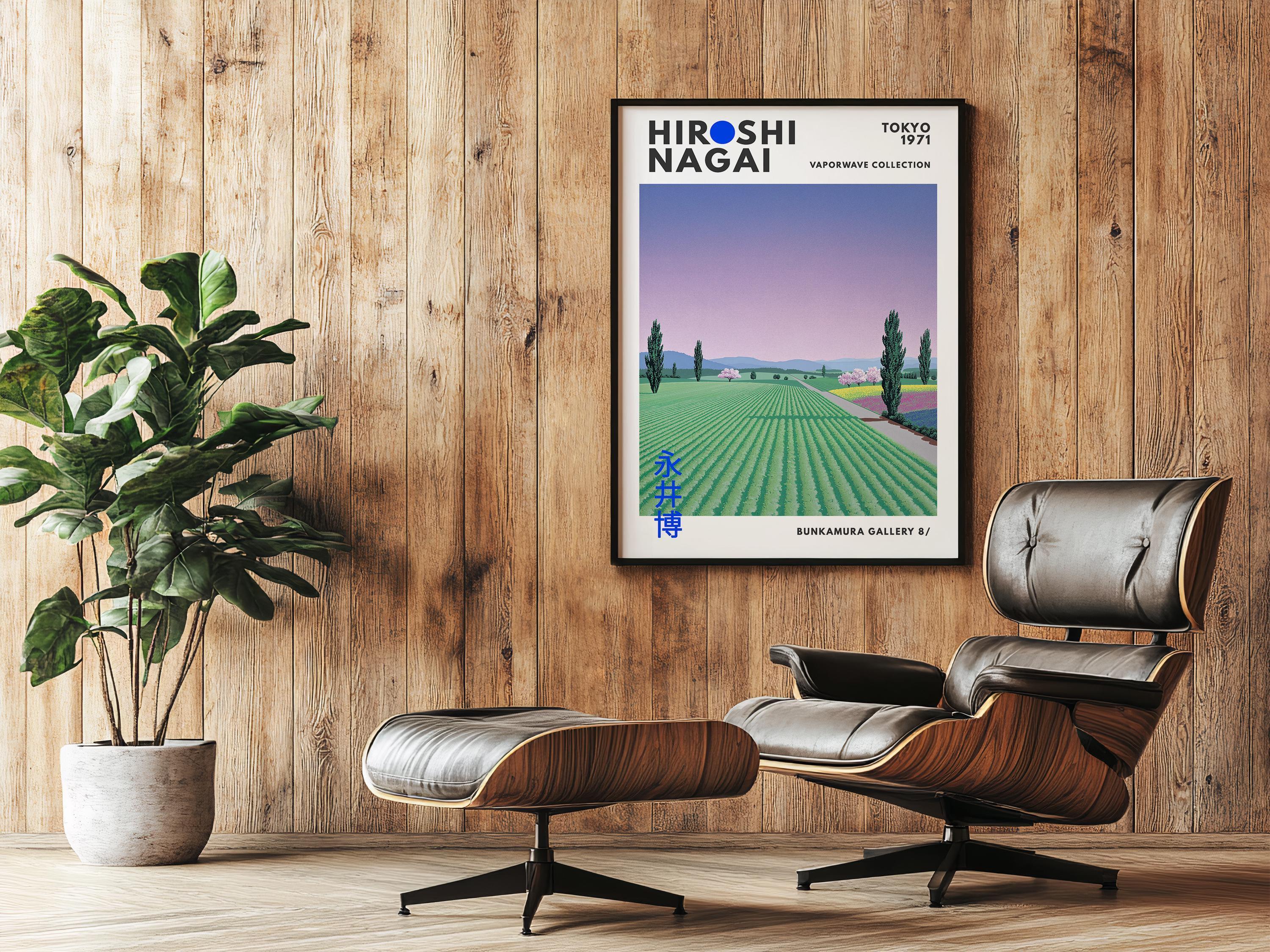 Minimalist Japanese art print with retro wall art warmth—long horizons, simplified structures and Japandi quiet give a refined vintage poster presence. Flattened fields invite contemplative balance; an original Hiroshi Nagai work exploring rural modernism in reduced color.