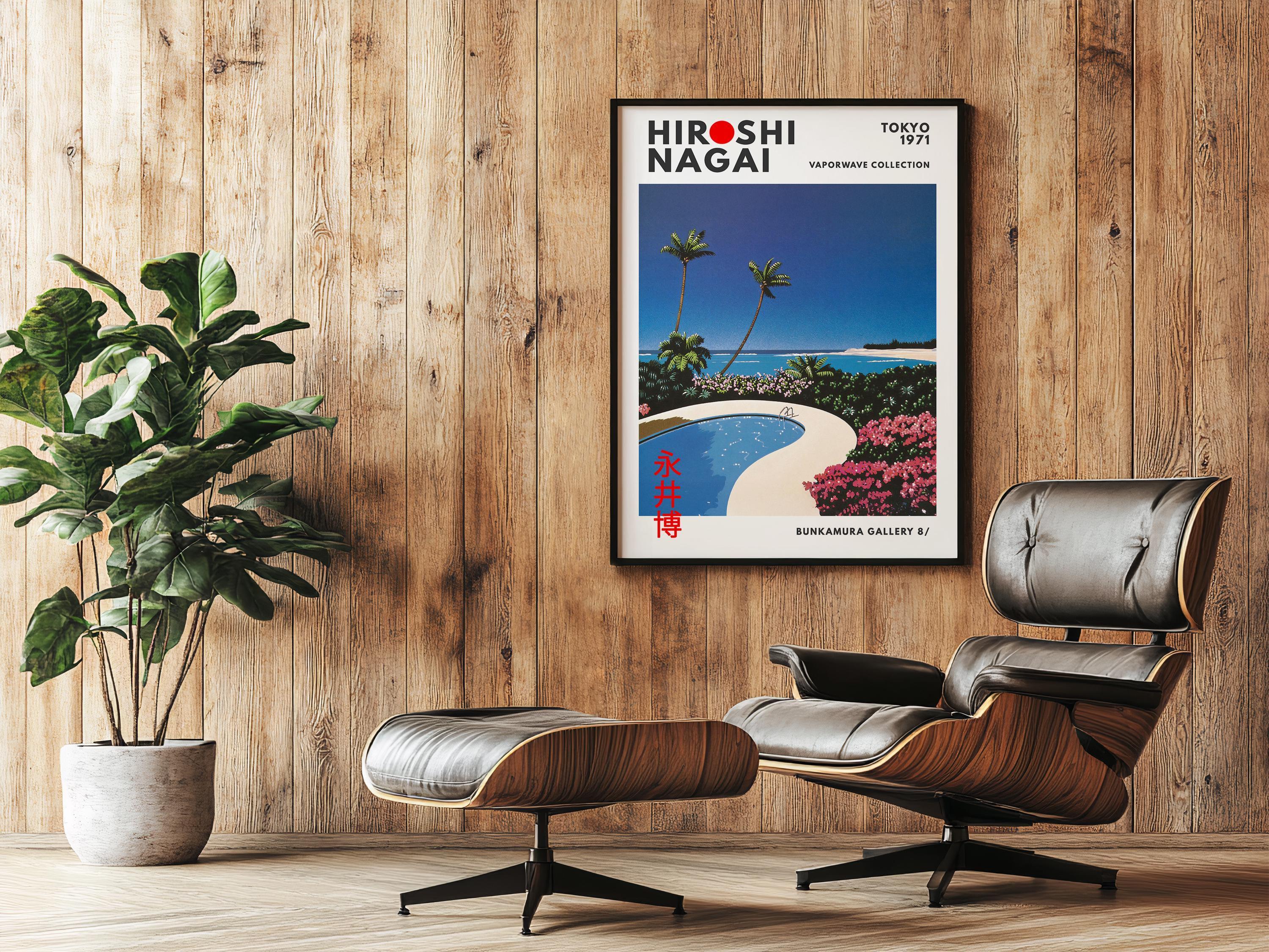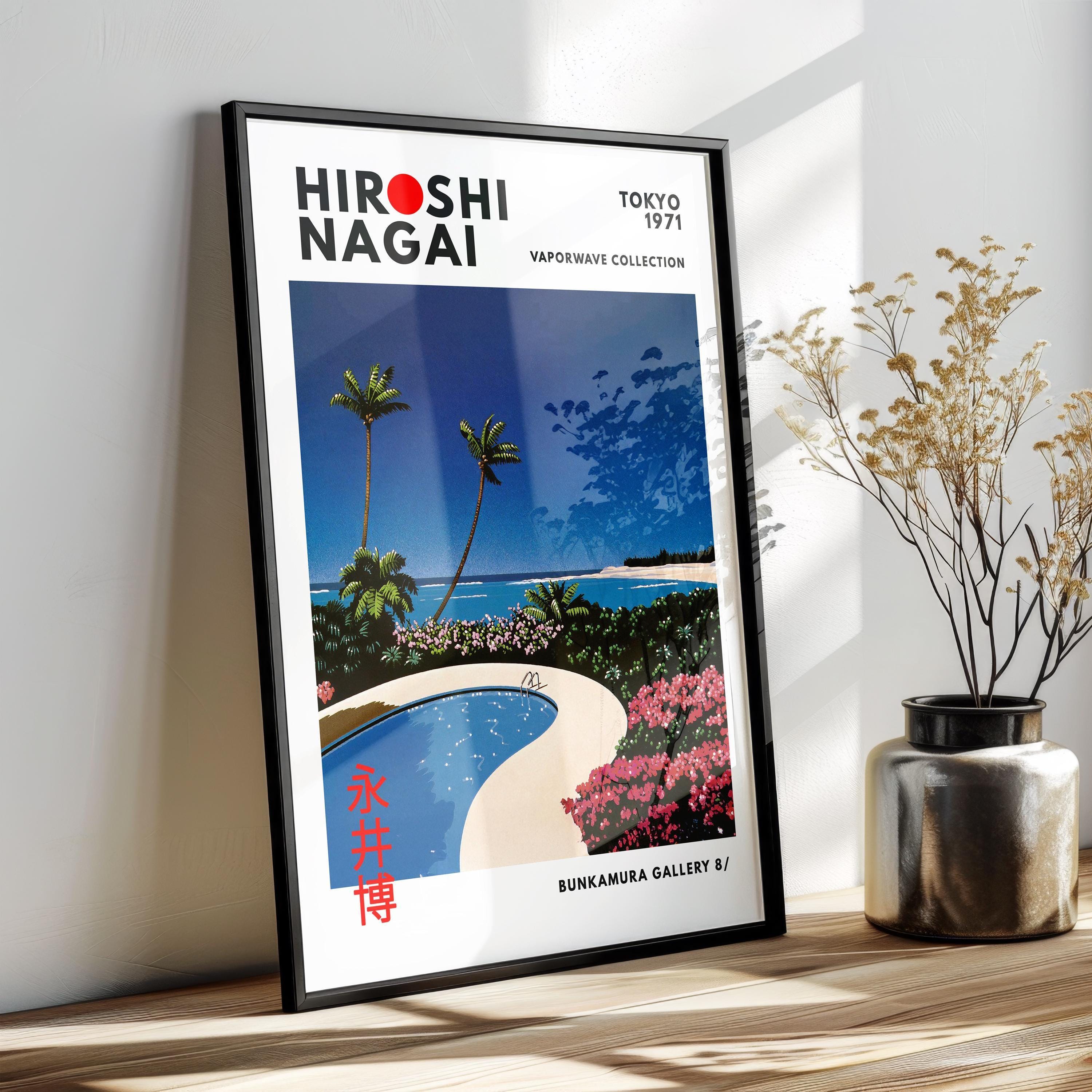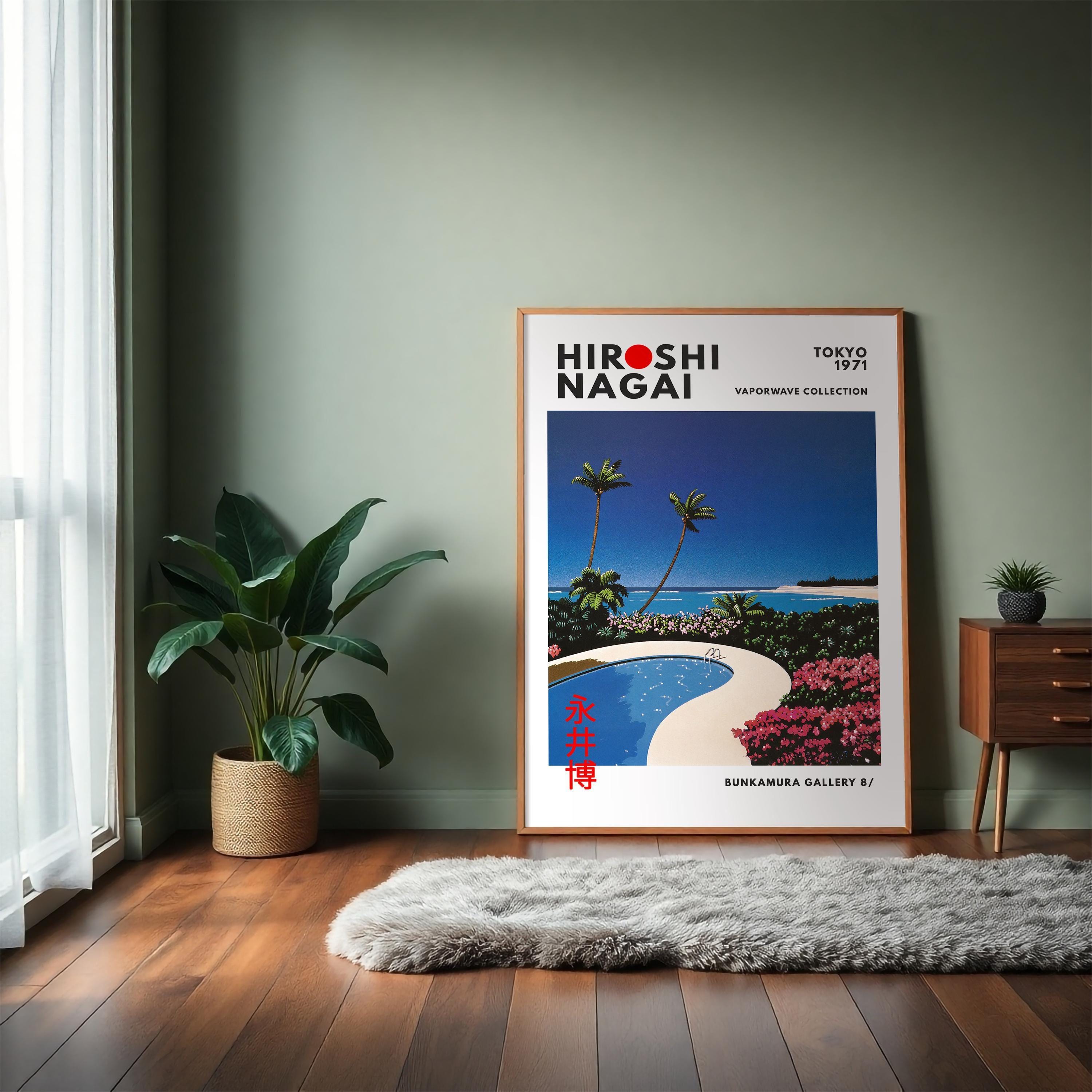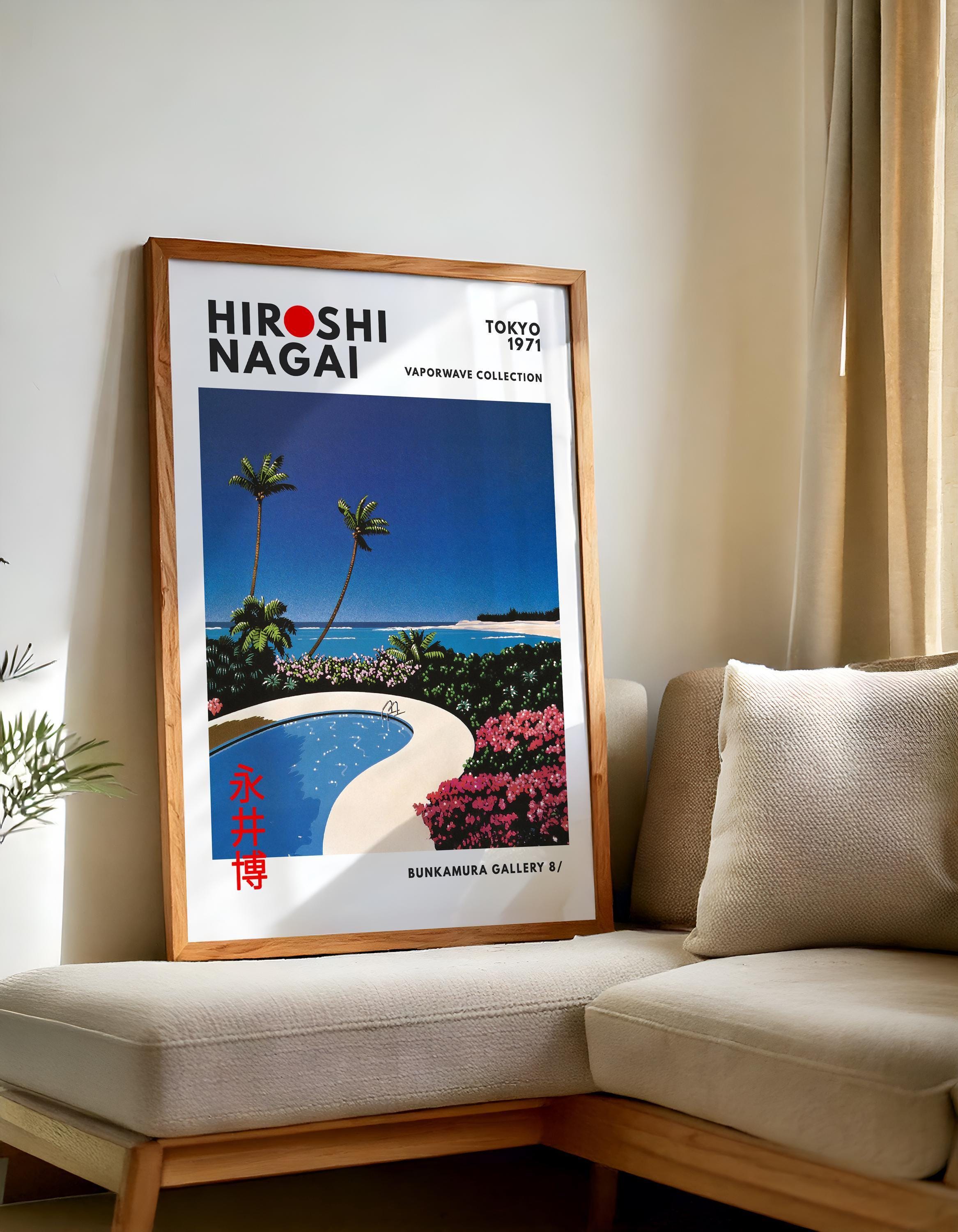 Japanese art print with album-art aura—retro wall art, city pop lineage and vaporwave gradients in a collectible vintage poster vibe. Palm silhouettes and luminous horizons echo timeless pop melodies; an original Hiroshi Nagai artwork rooted in Japan’s golden city-pop era.