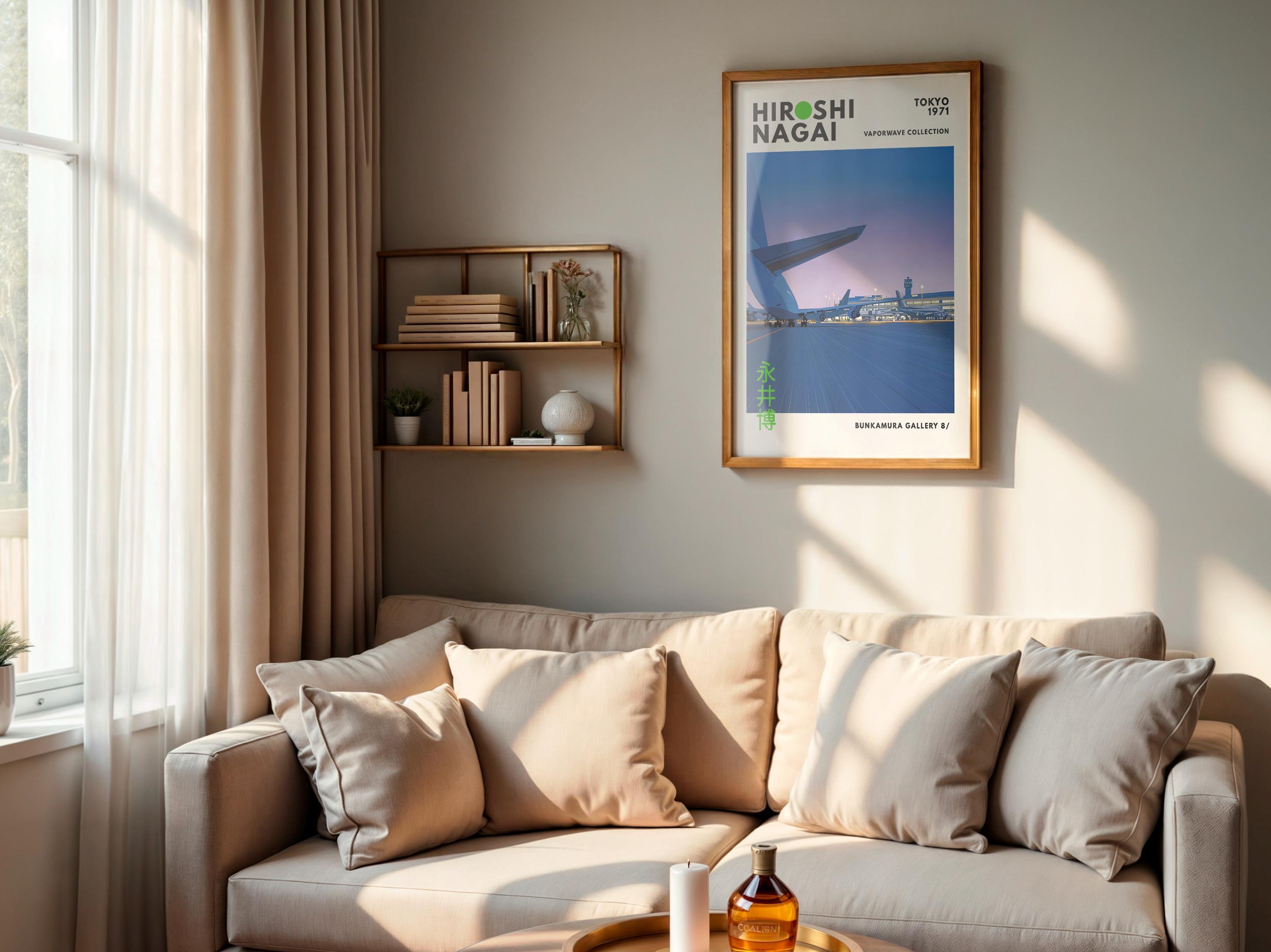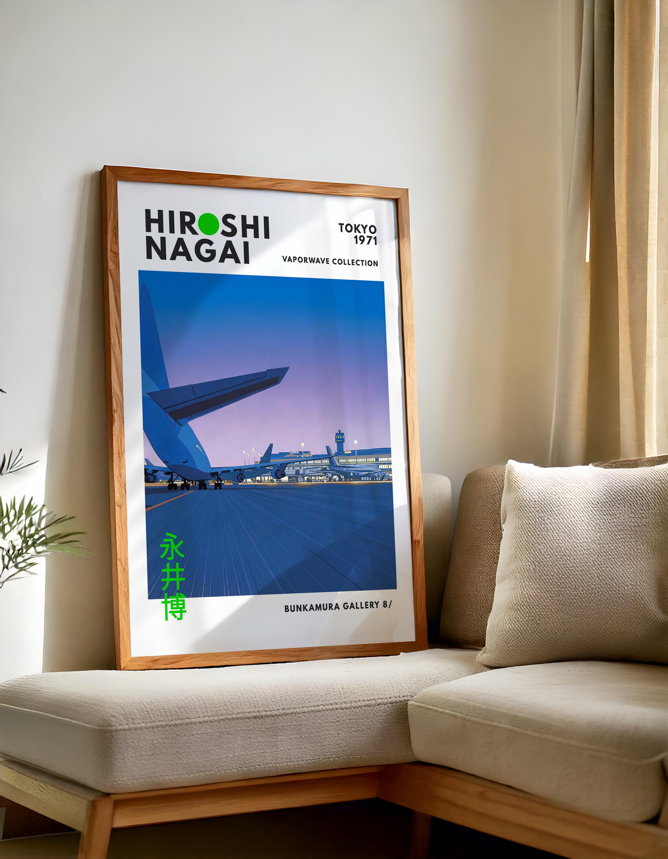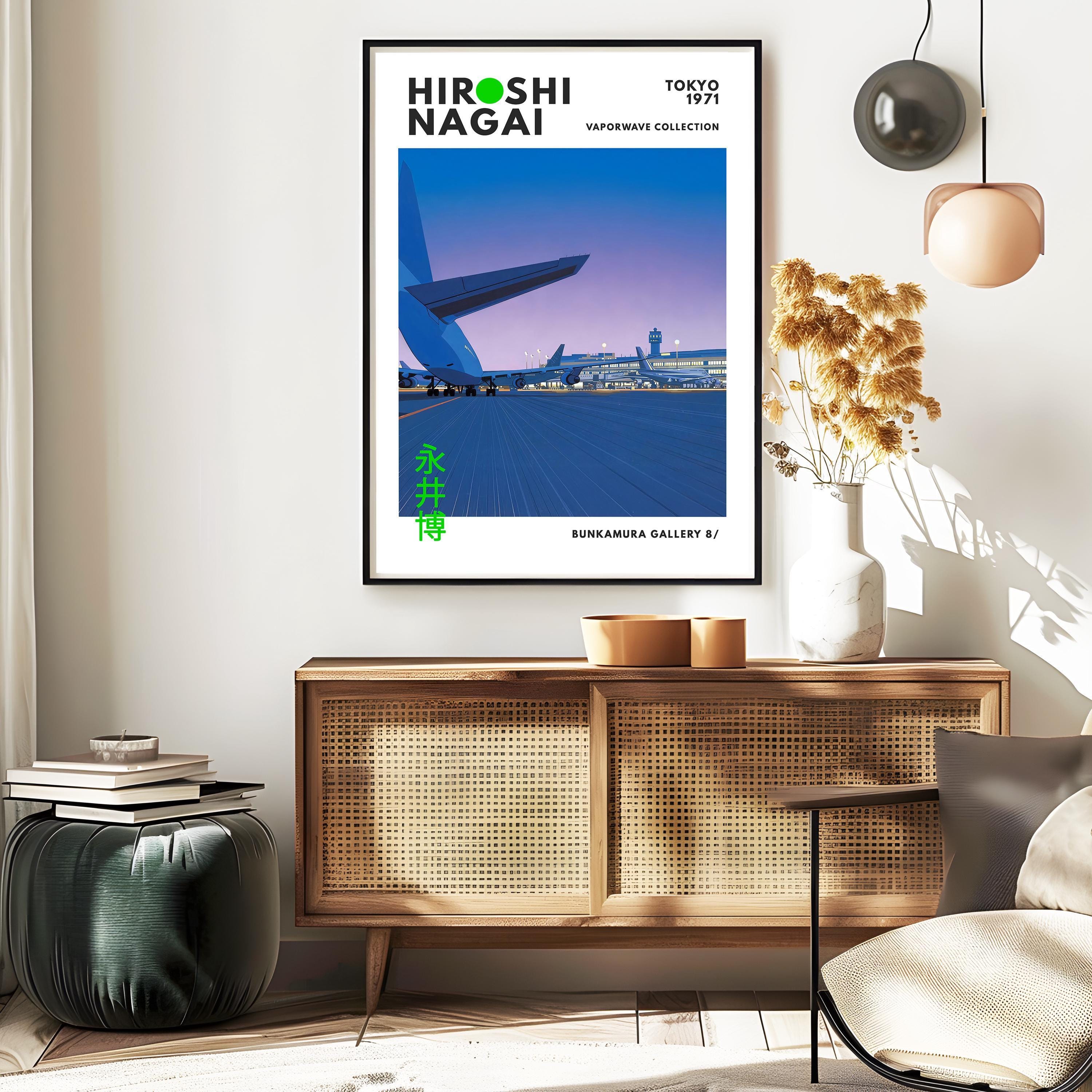 Minimalist Japanese art print with retro wall art poise, city pop vibe and vaporwave palette—runway lines, tarmac geometry and clear horizons deliver vintage poster calm in a polished 80s mood. Clean color blocks and measured negative space shape an elegant aviation ambiance; an original Hiroshi Nagai piece from his iconic era.