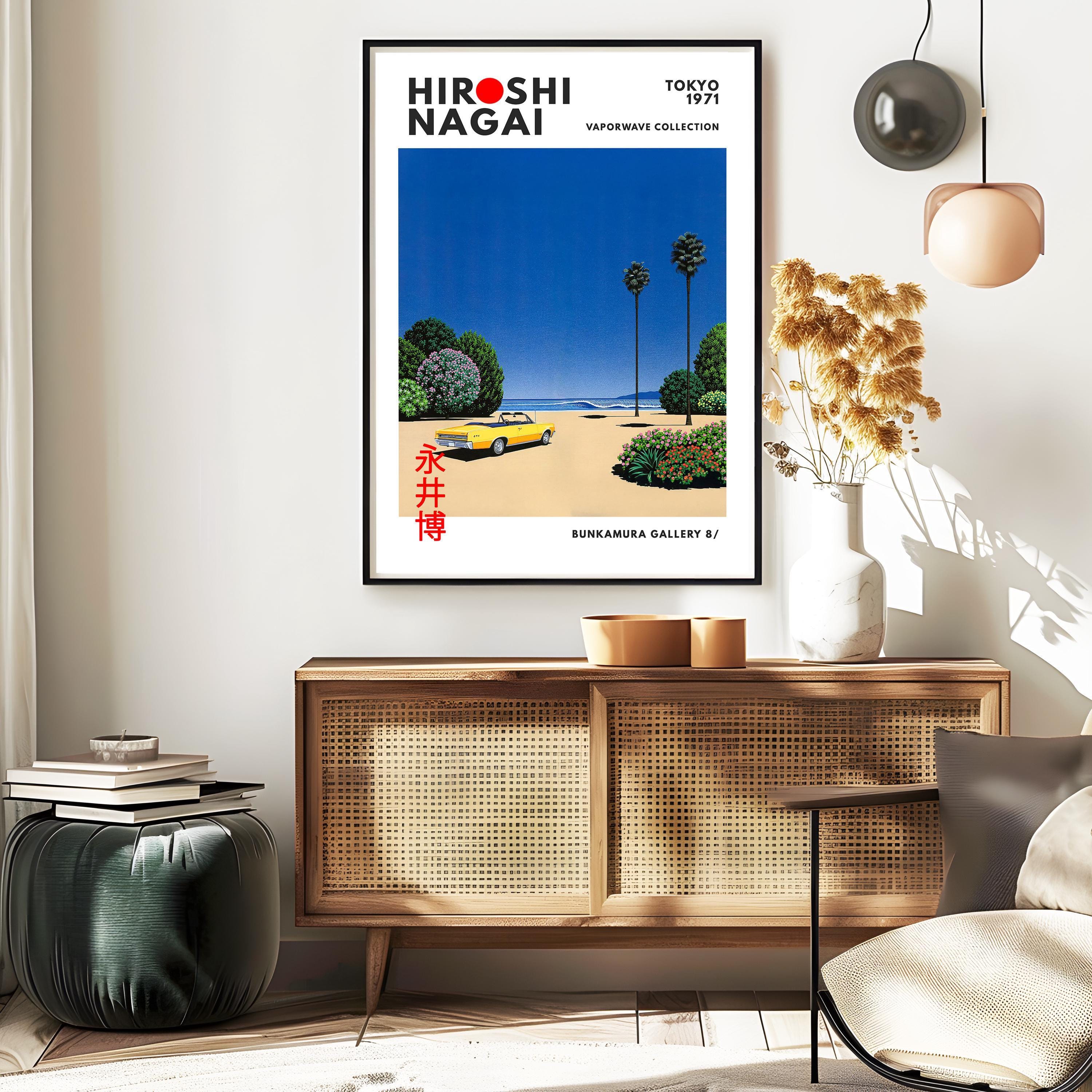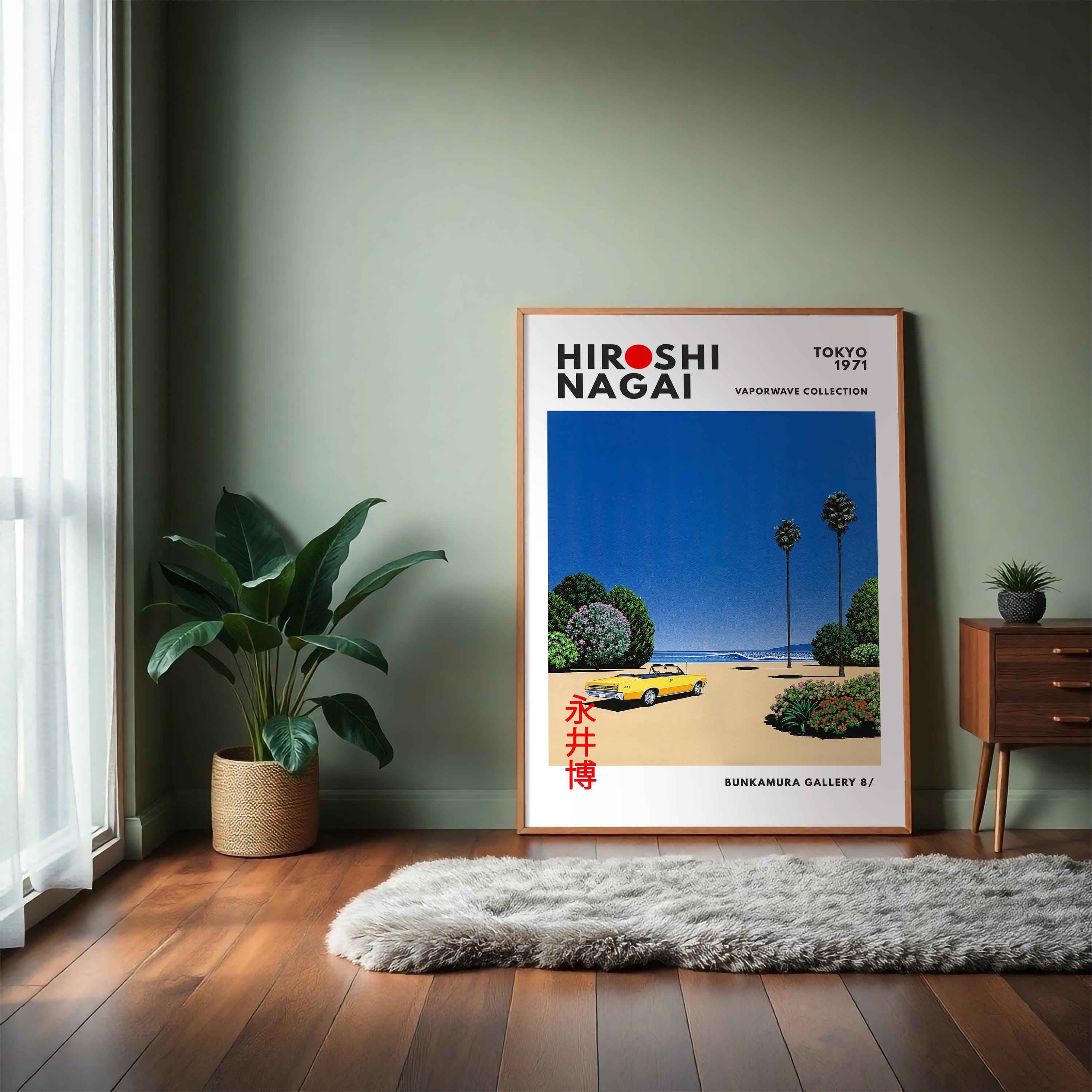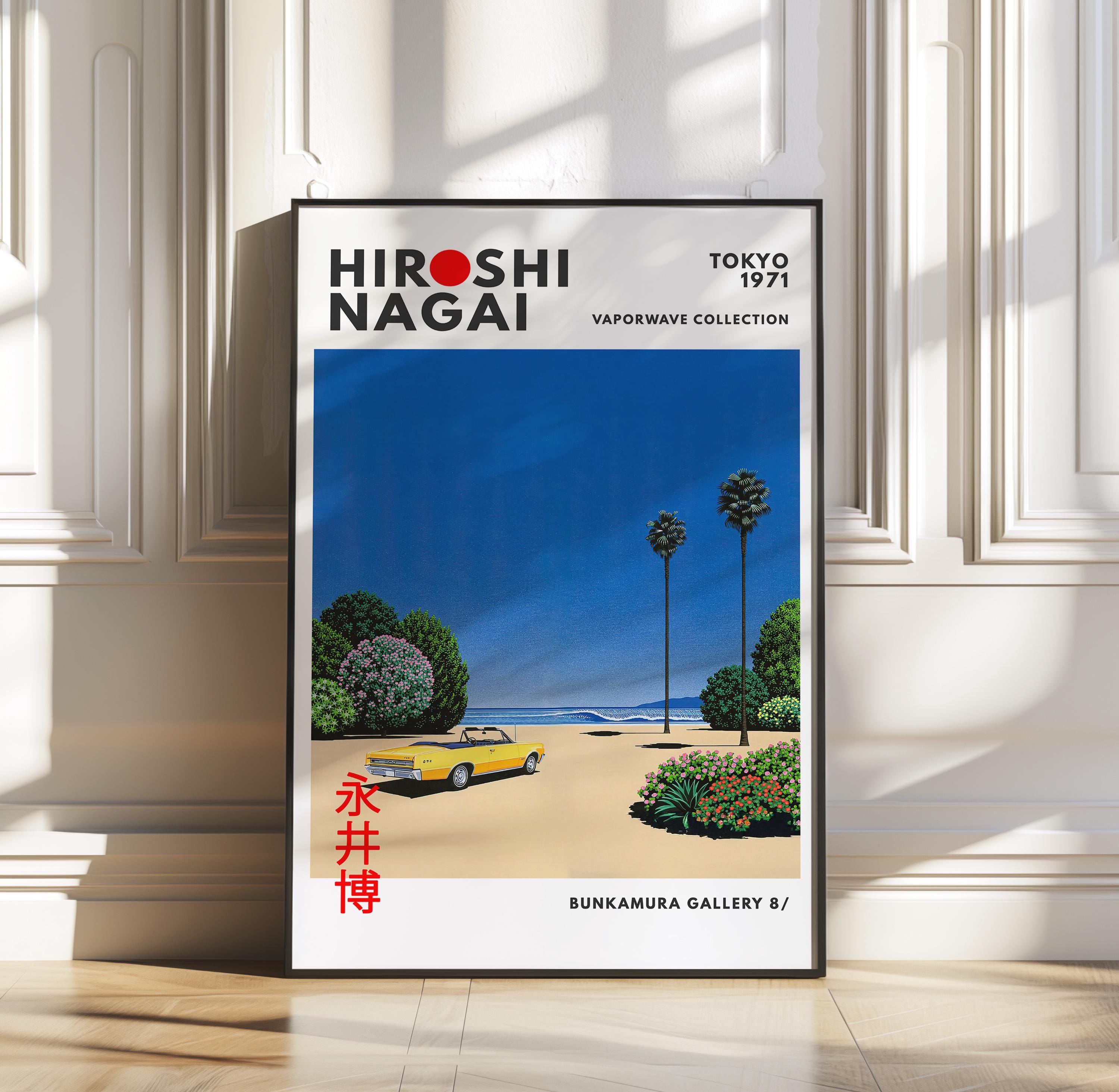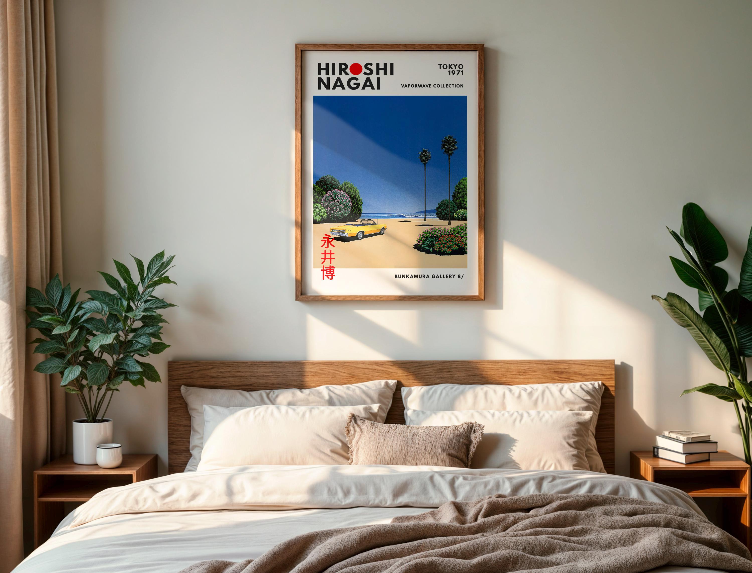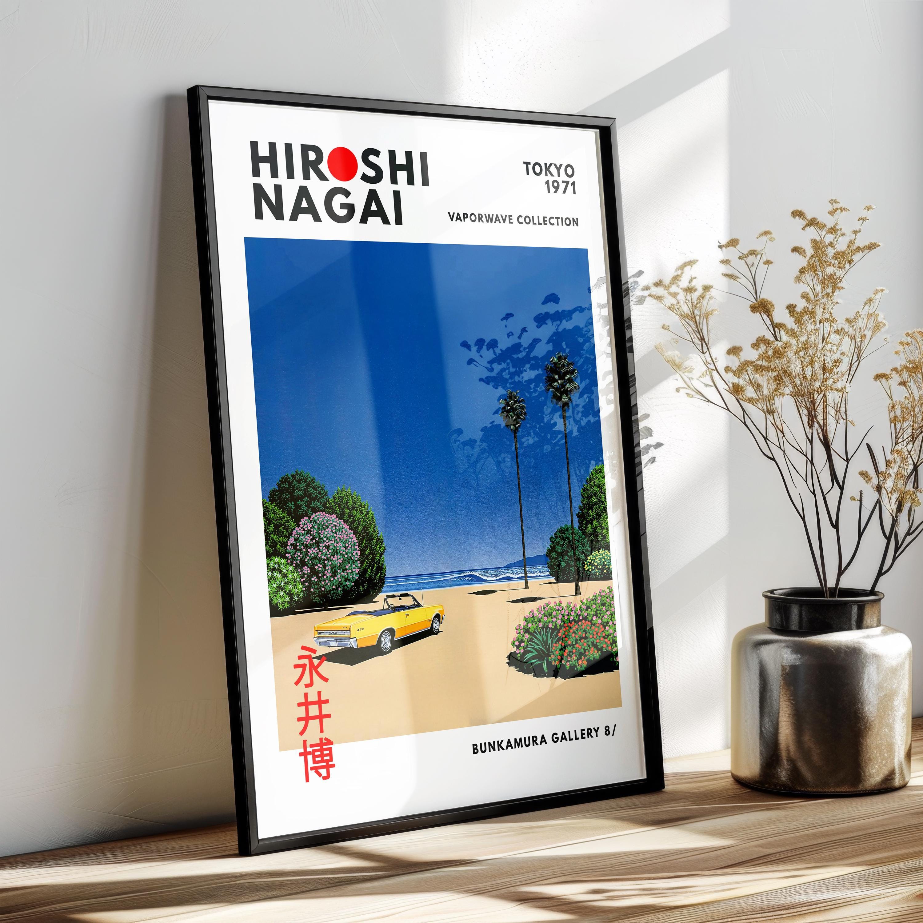 Minimalist Japanese art print with retro wall art energy, vaporwave gradients and city pop atmosphere—coastal cliffs, glassy ocean planes and crisp 80s serenity. Clean color blocking, saturated skies and poised negative space shape a calm shoreline vista; an original Hiroshi Nagai work from his iconic era.